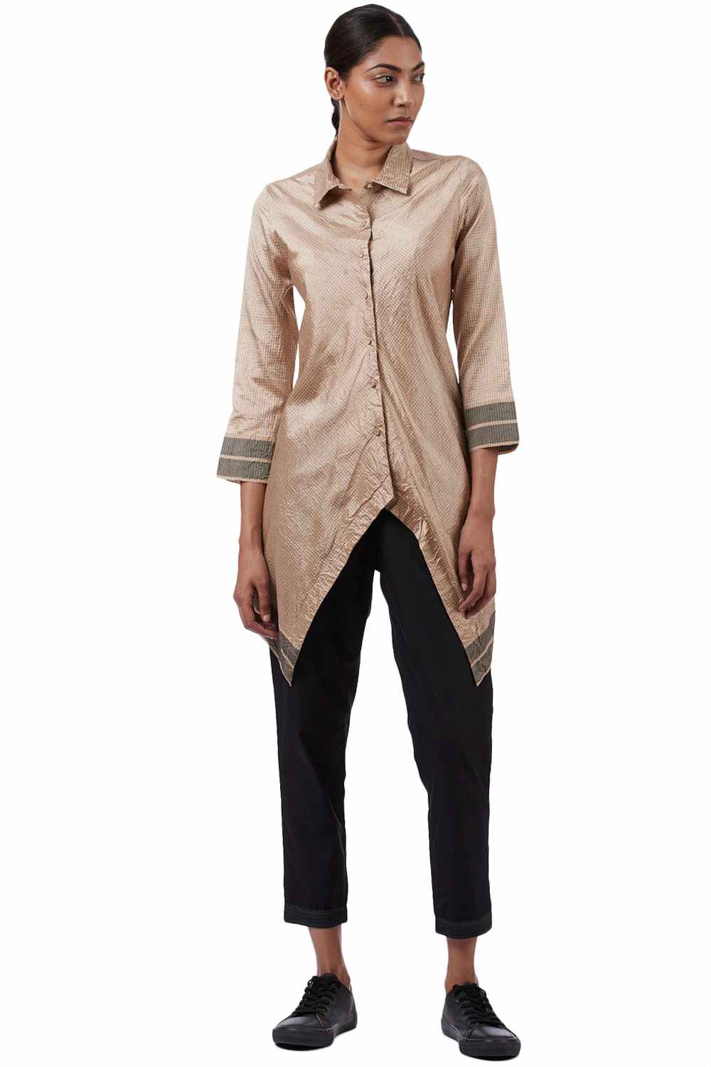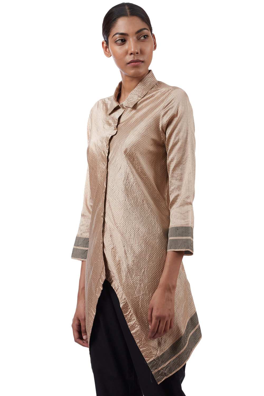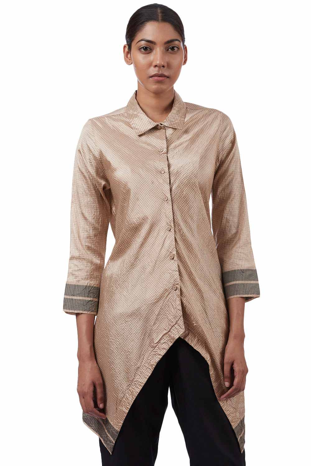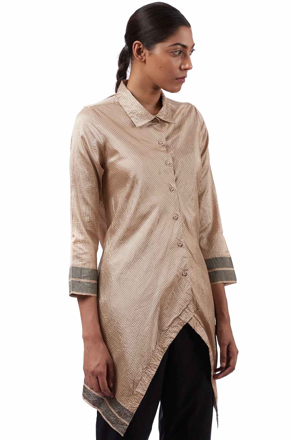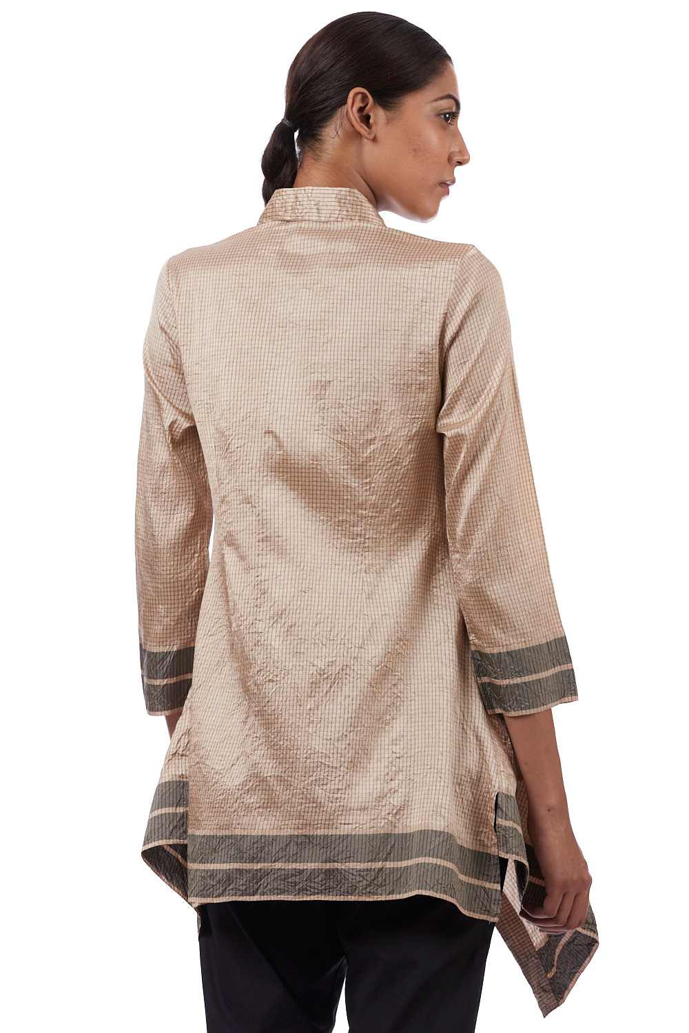 Asymmetric Tunic. Handwoven Mangalagiri Pure Silk With Checks With Eclusively Handwoven Border Hand Crushed Specially Made Self Cover Fabric Buttons.