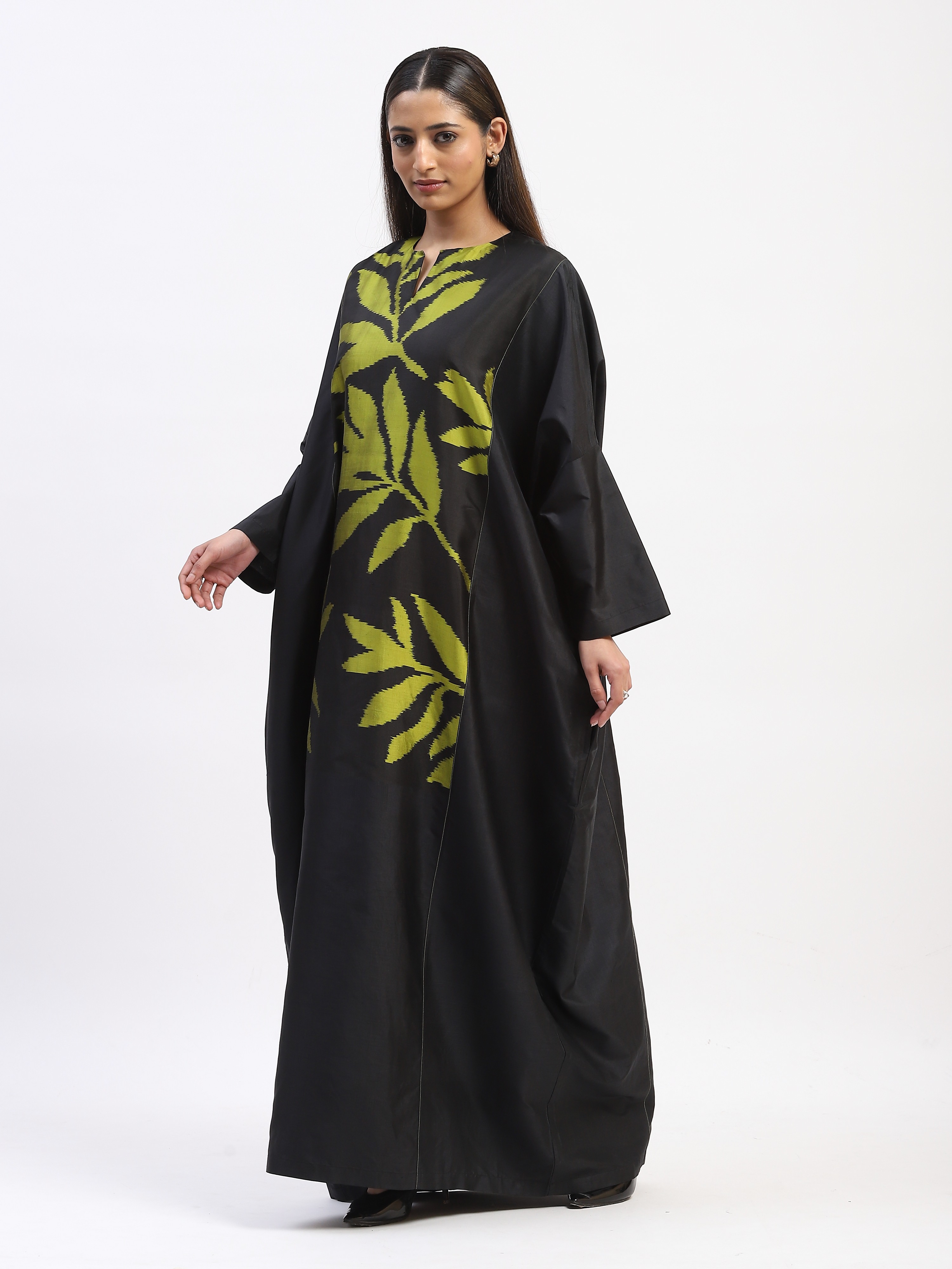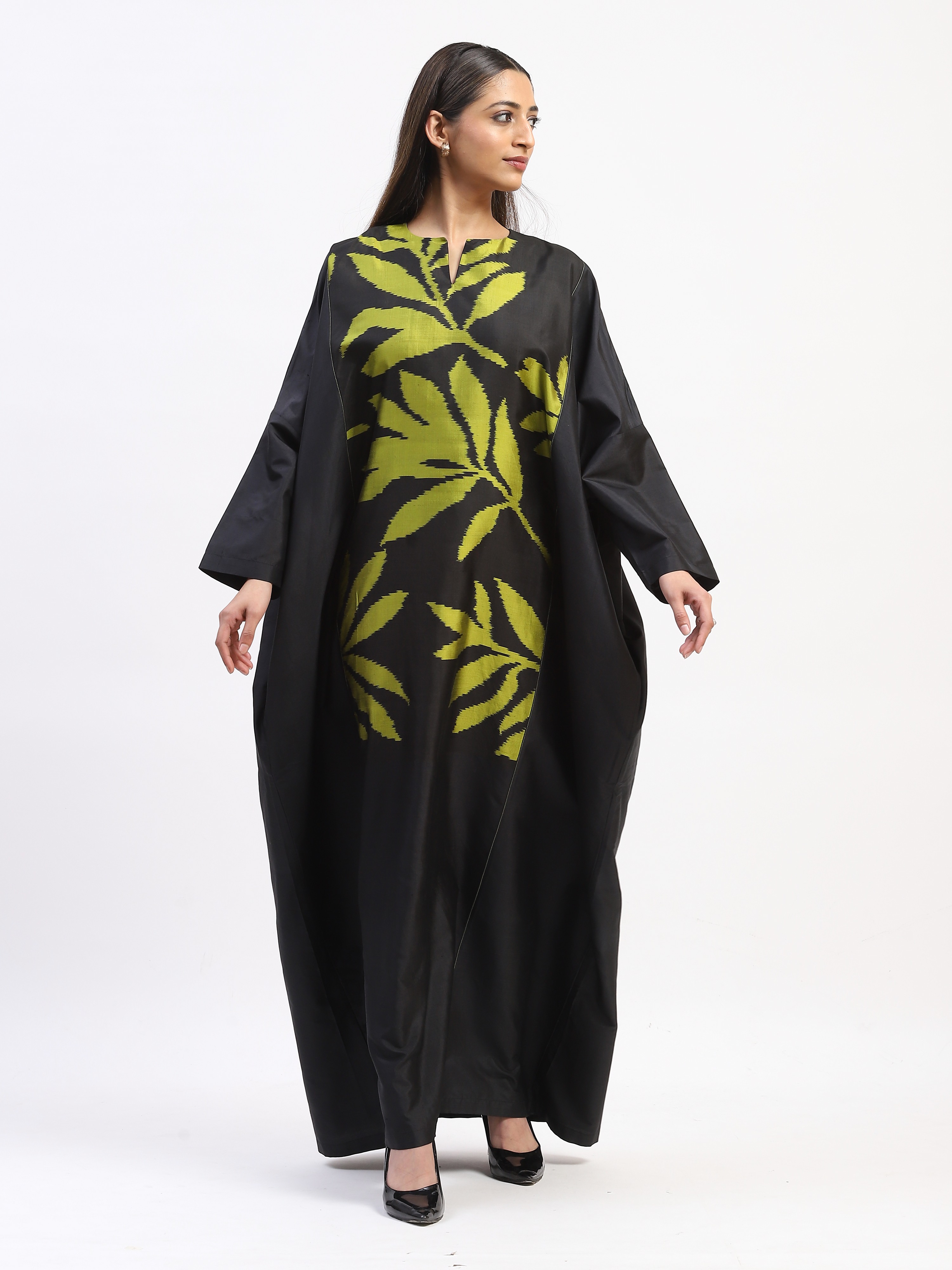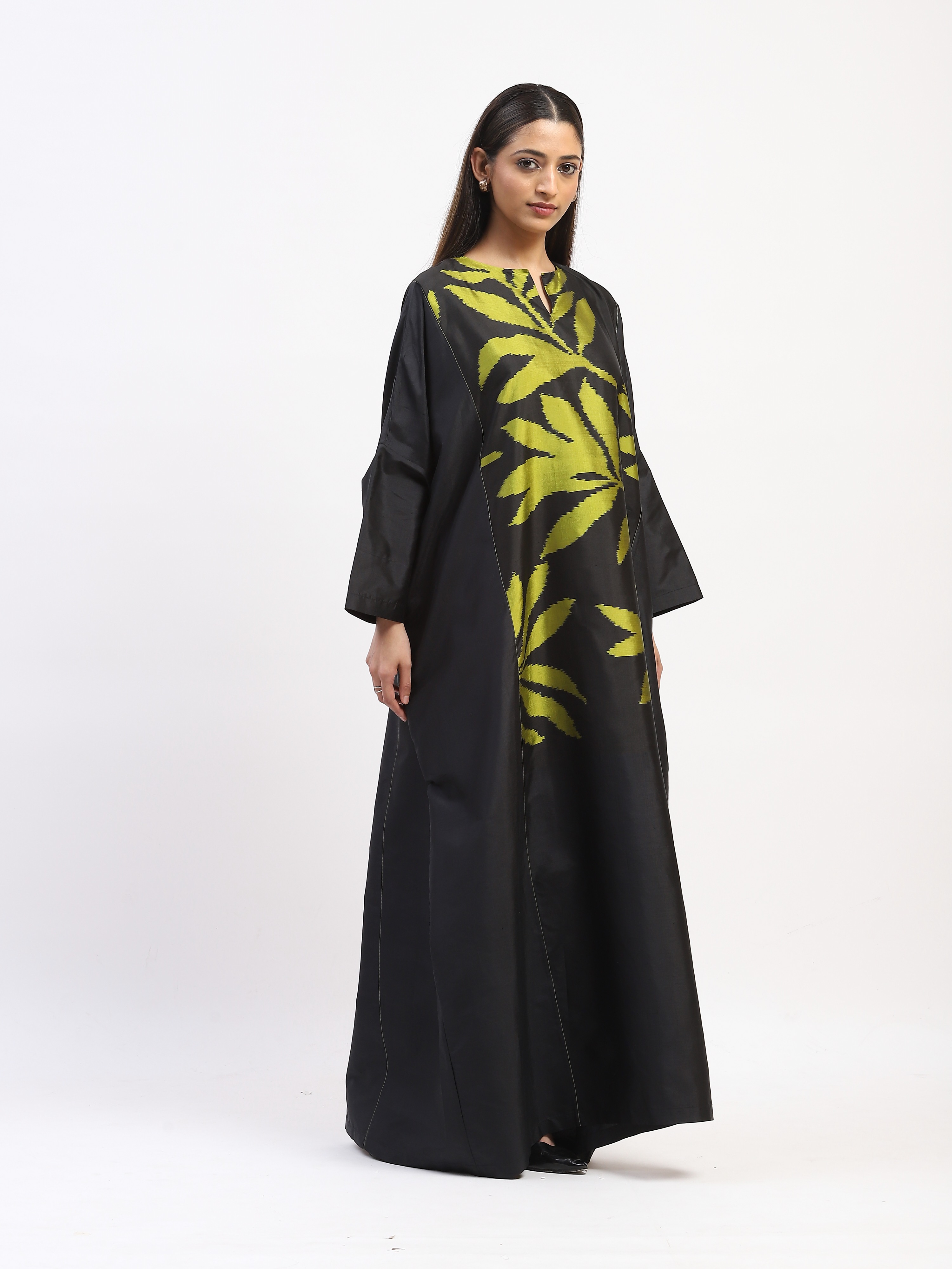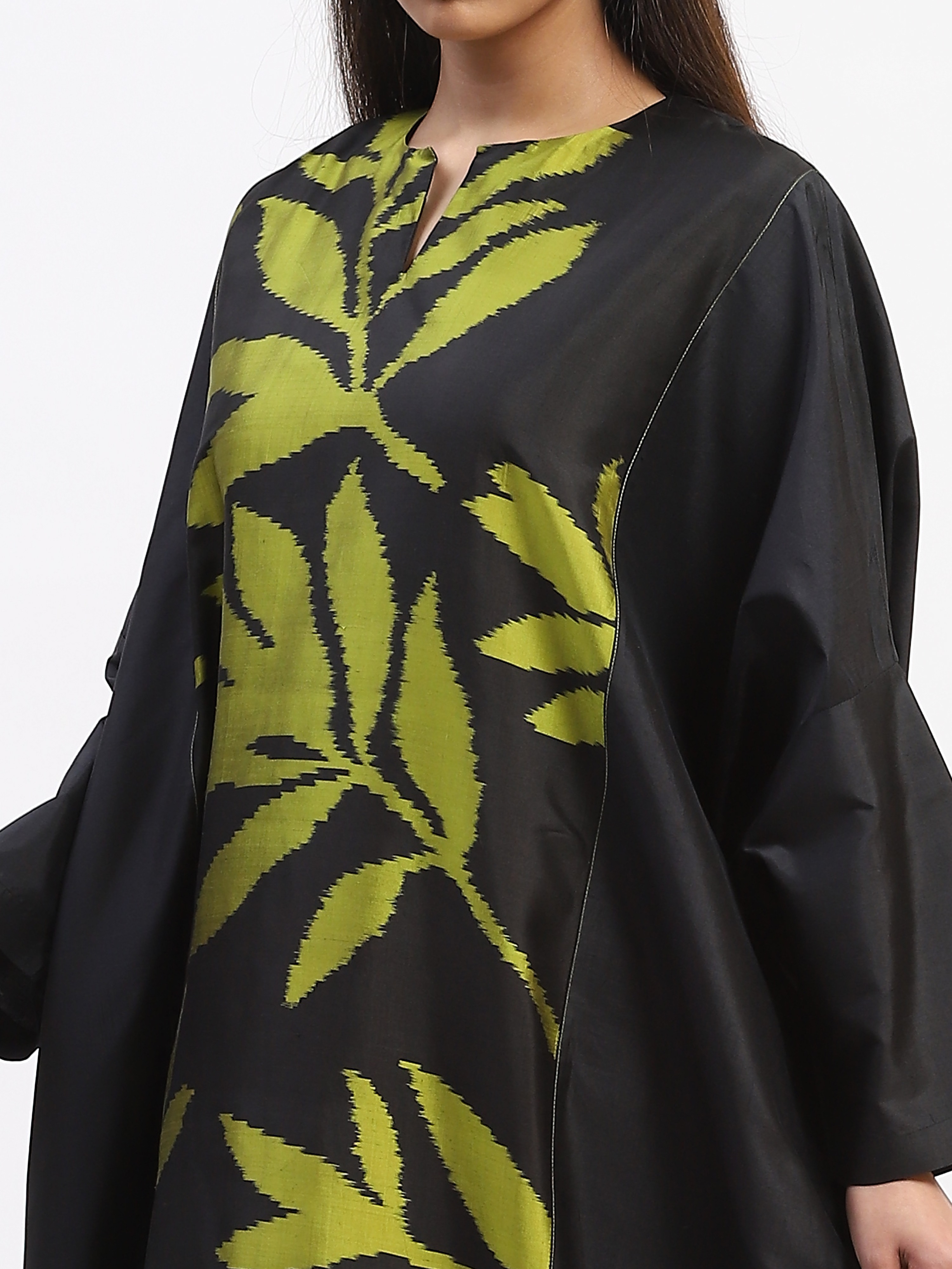 This limited edition piece has been made using a specially designed handwoven ikat fabric in pure silk. A larger than life scale of mo repeat leaves make a dramatic statement.
