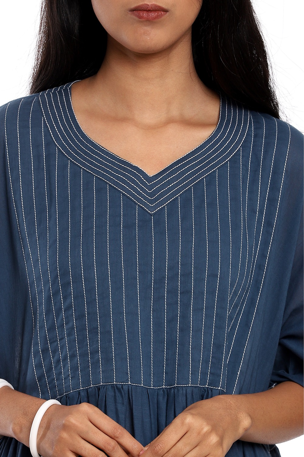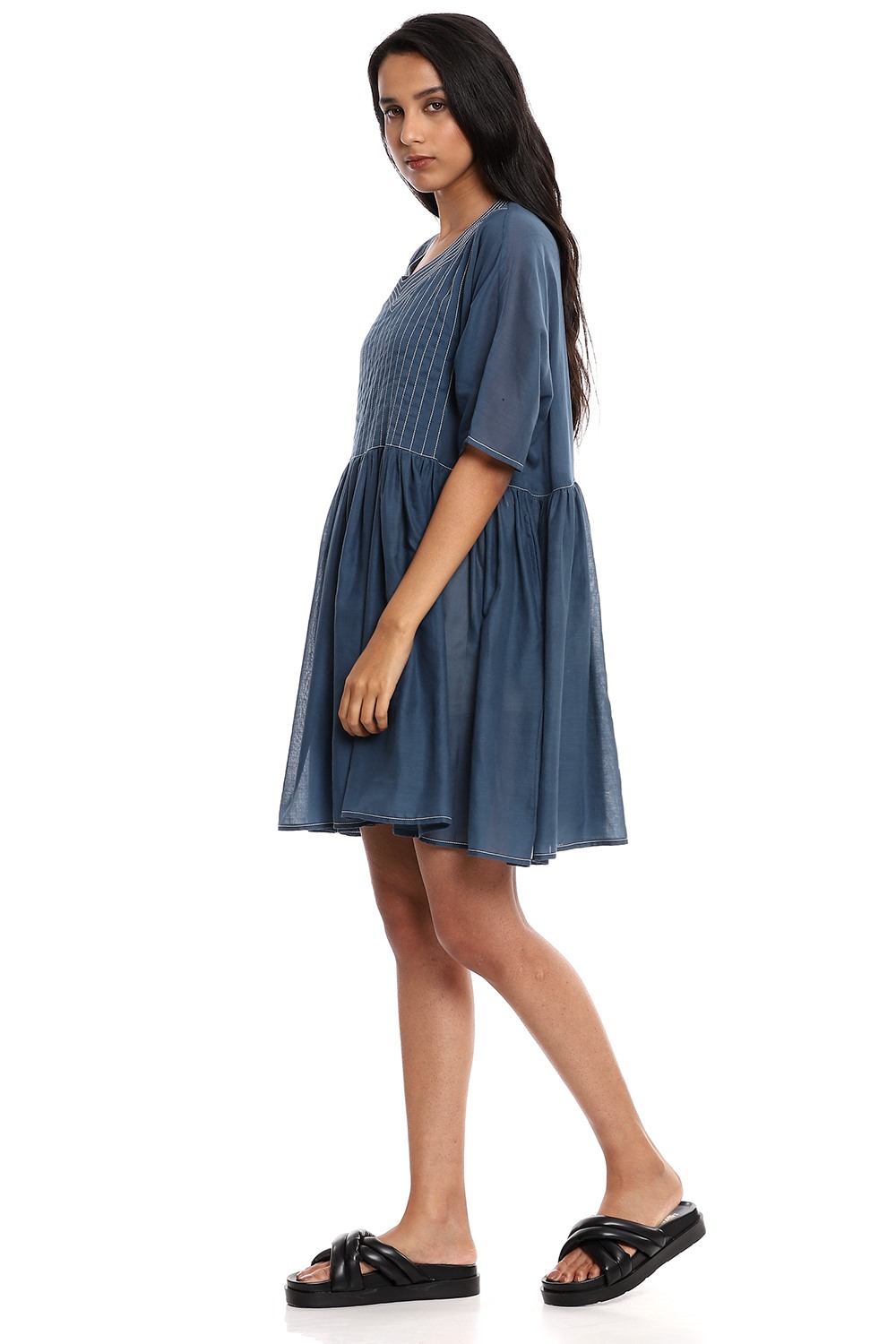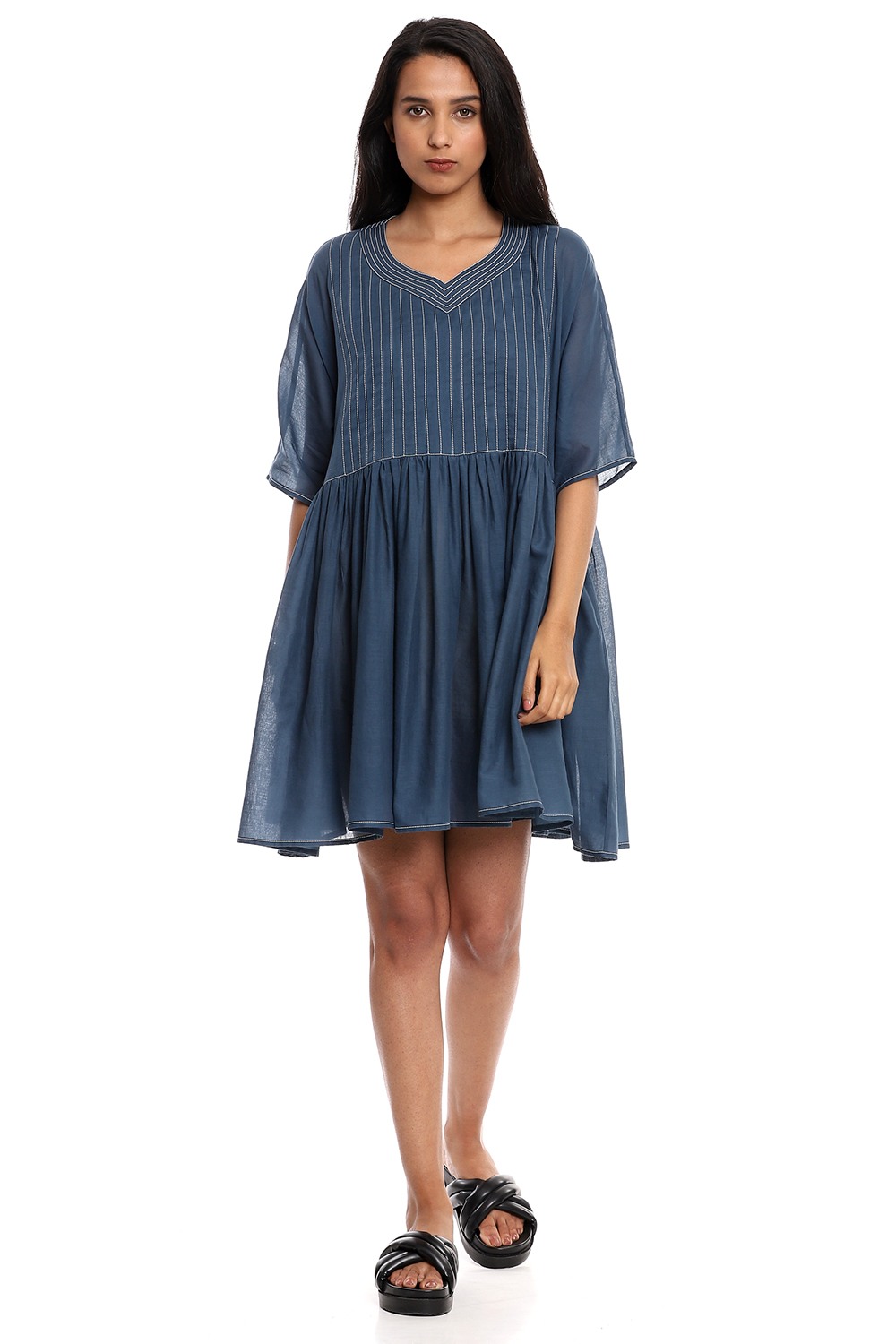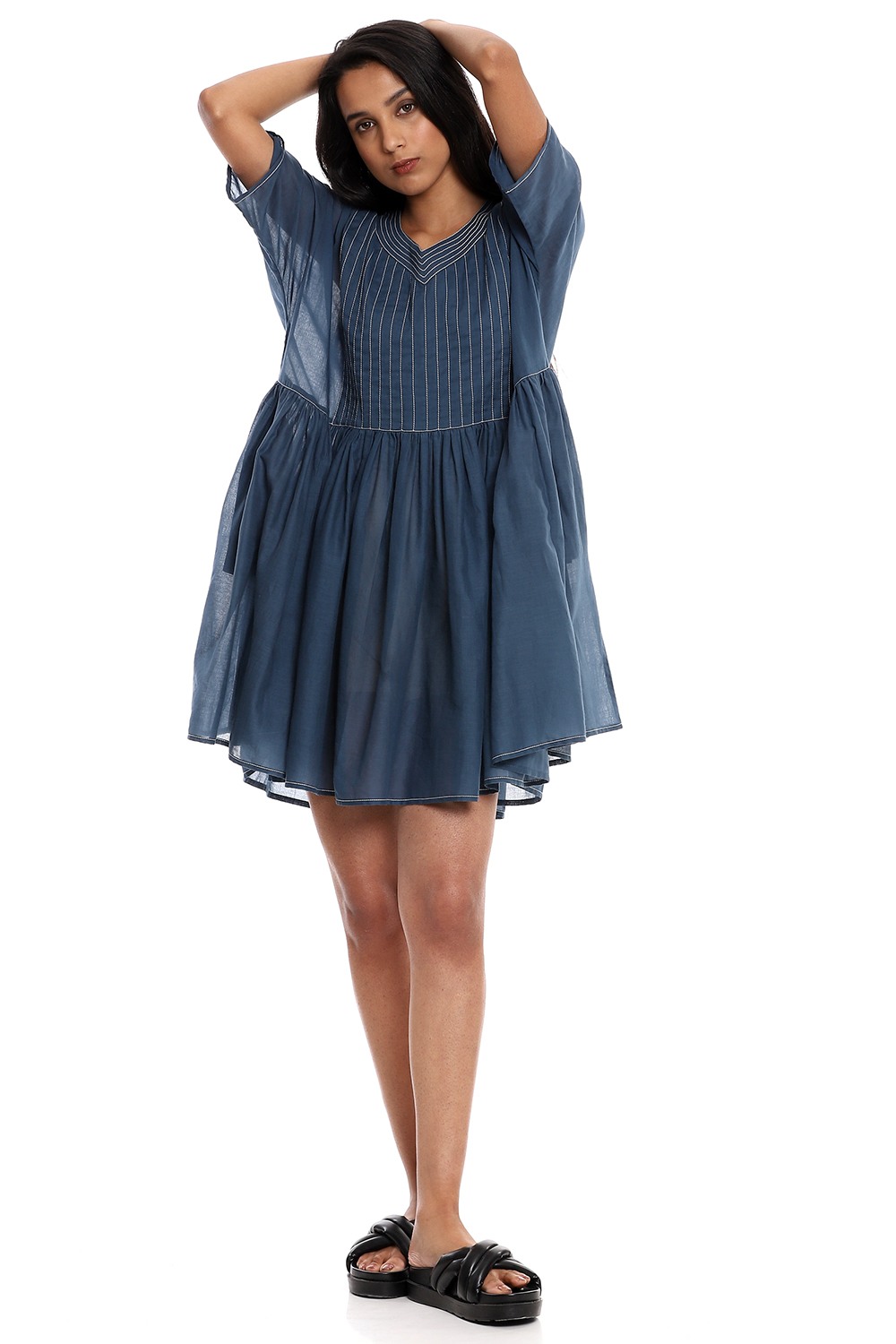 A favourite long flared dress, cut from soft to touch cotton voile in indigo, detailed with quilted dori stitching in ivory.