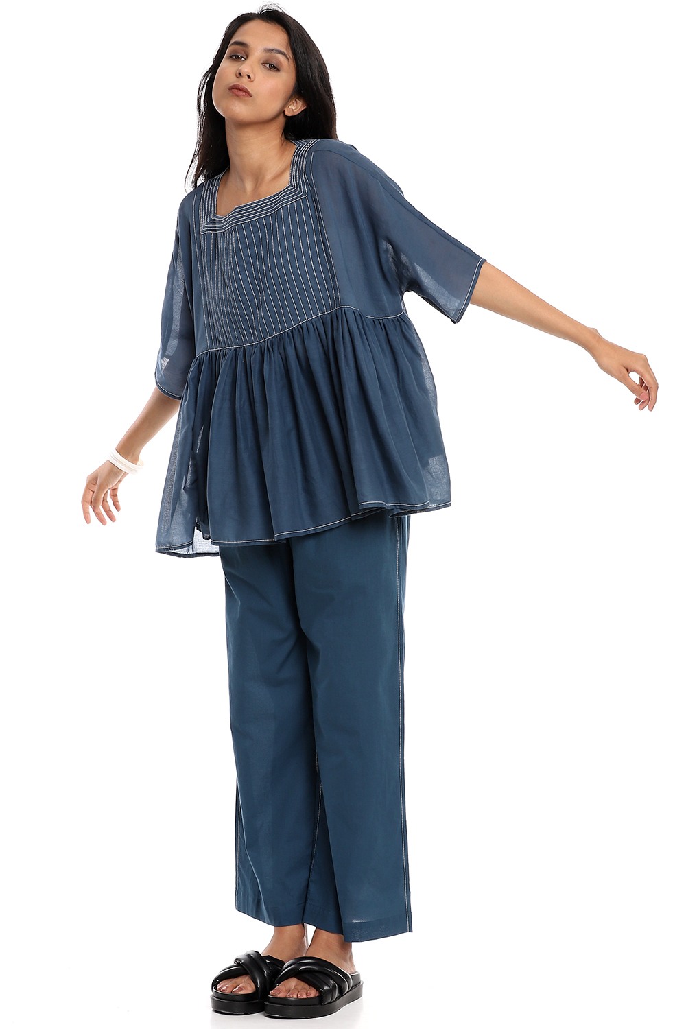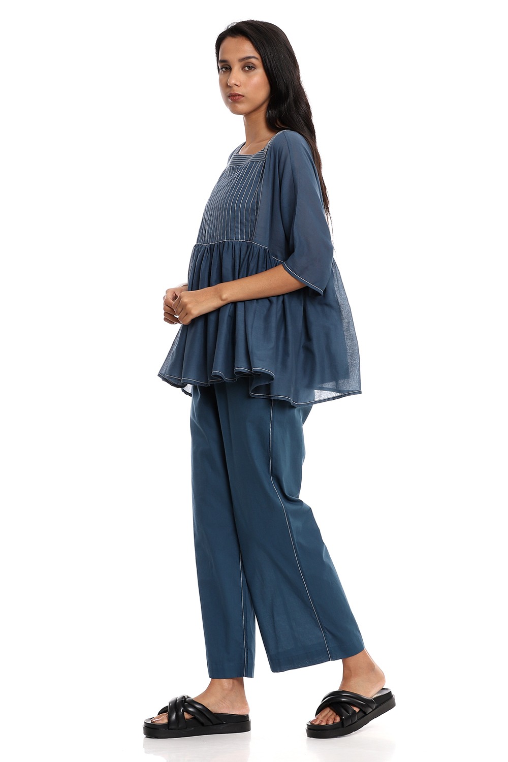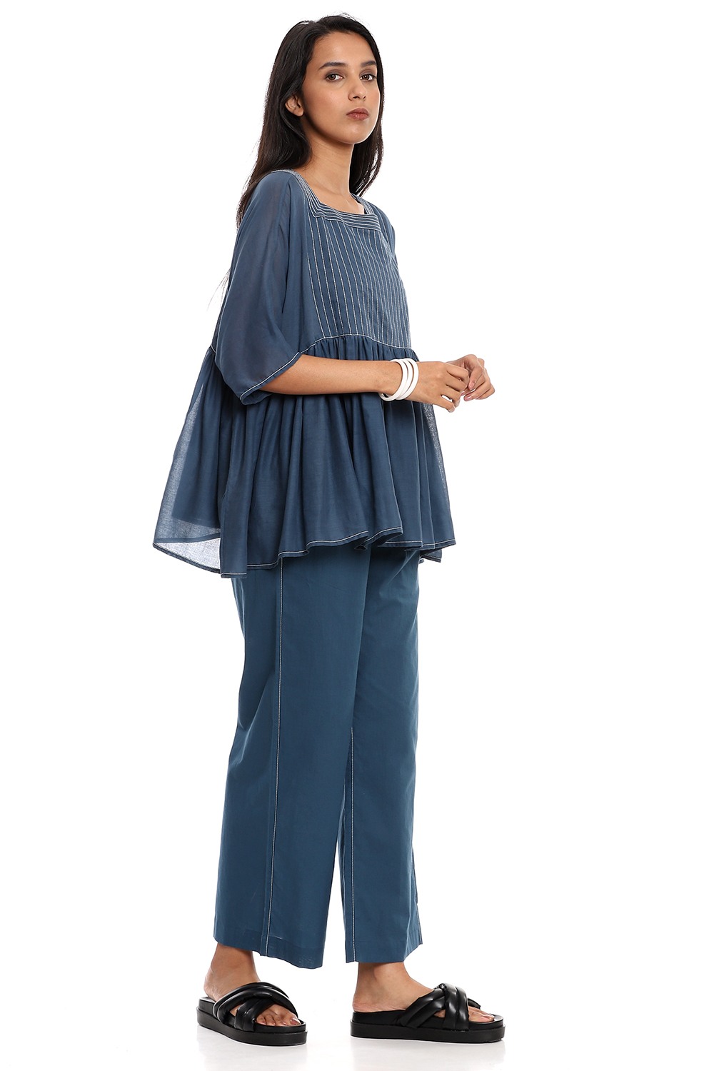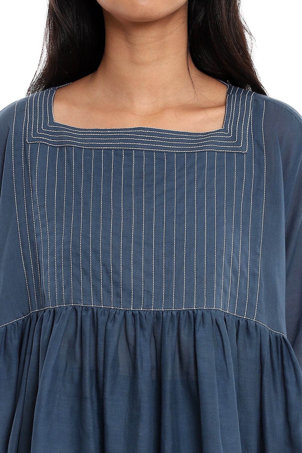 Effortless and feminine indigo short flared top, cut from soft-to-touch cotton voile, detailed with quilted dori stitching in ivory. Is a definite summer must-have. Team your style with straight cropped pants cut from the same fabric.
