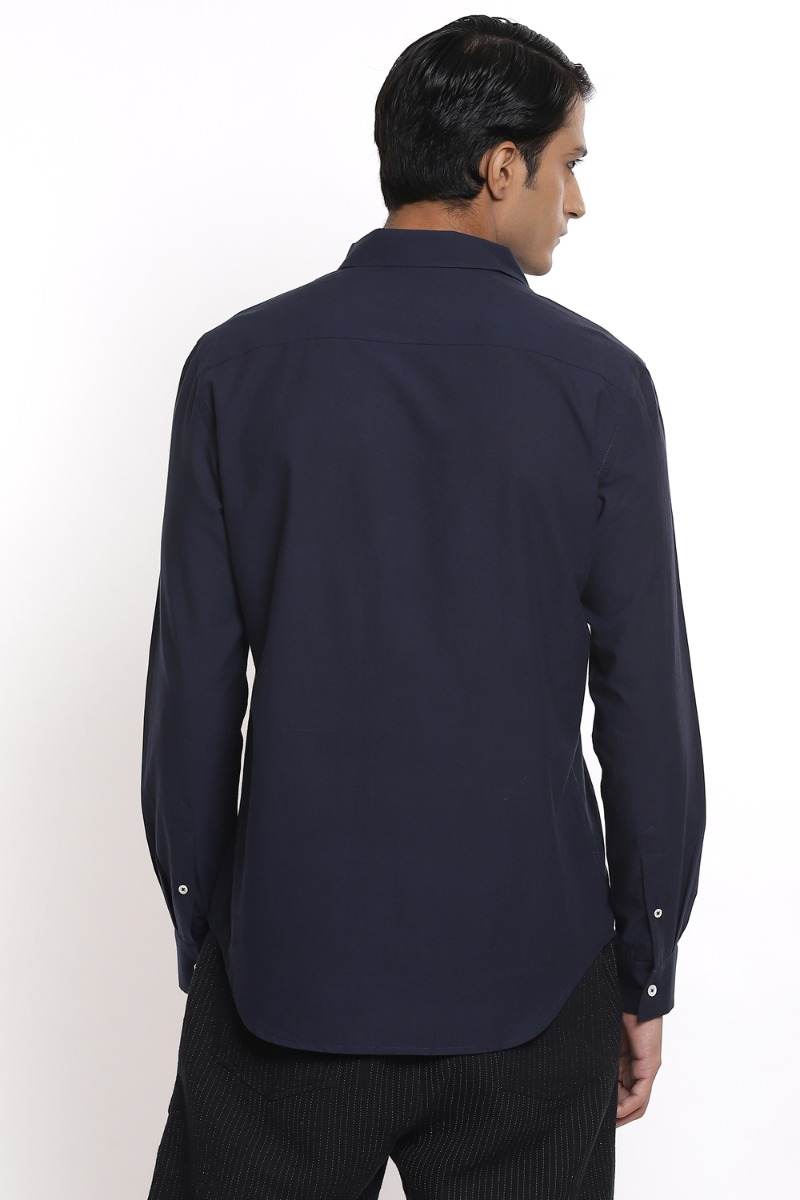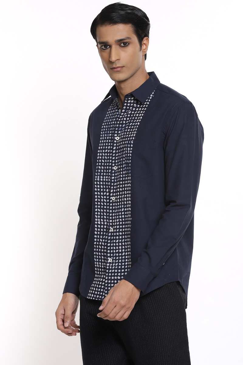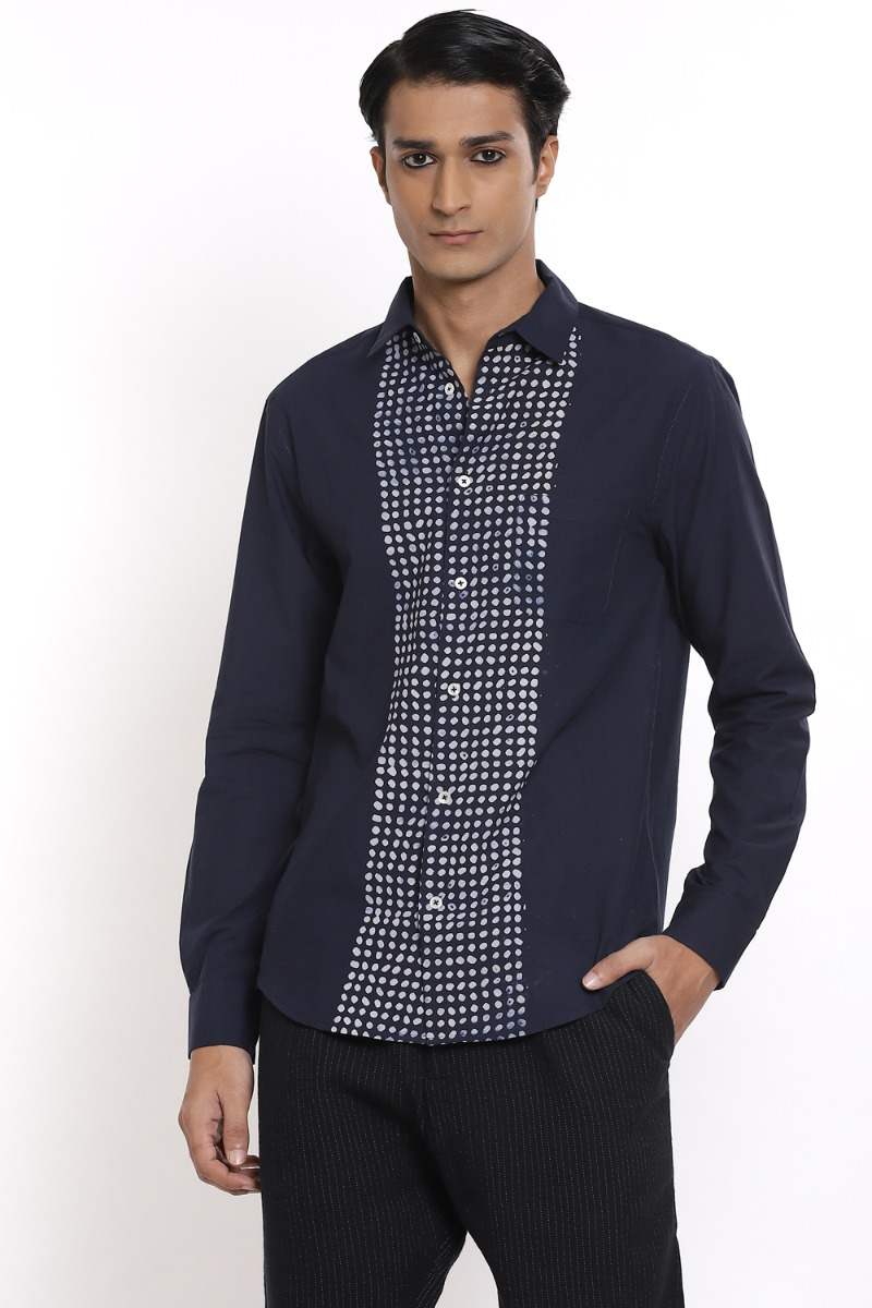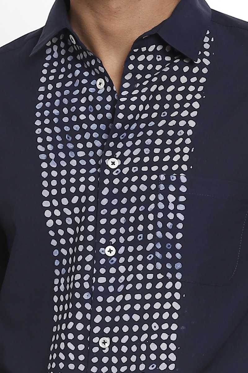 Indigo With Ivory Dot Print Bib Front. Abraham & Thakore Shirts For Men Have Been Crafted In Lightweight Natural Textiles In Regular And Slim Fits, Employing Various Traditional Textiles Techniques.