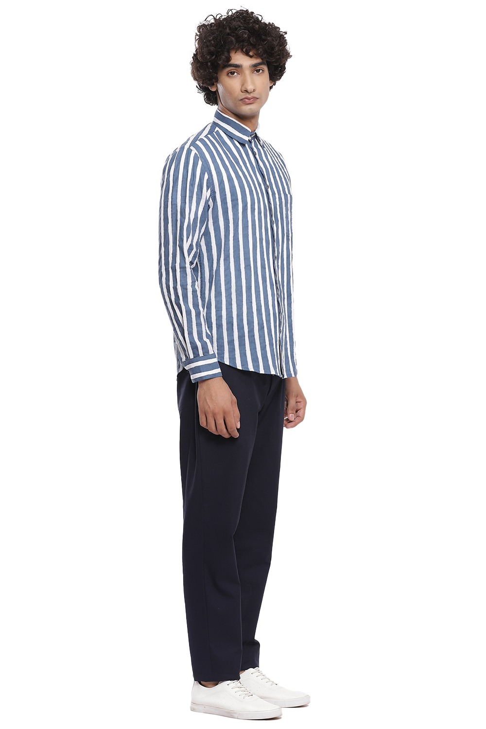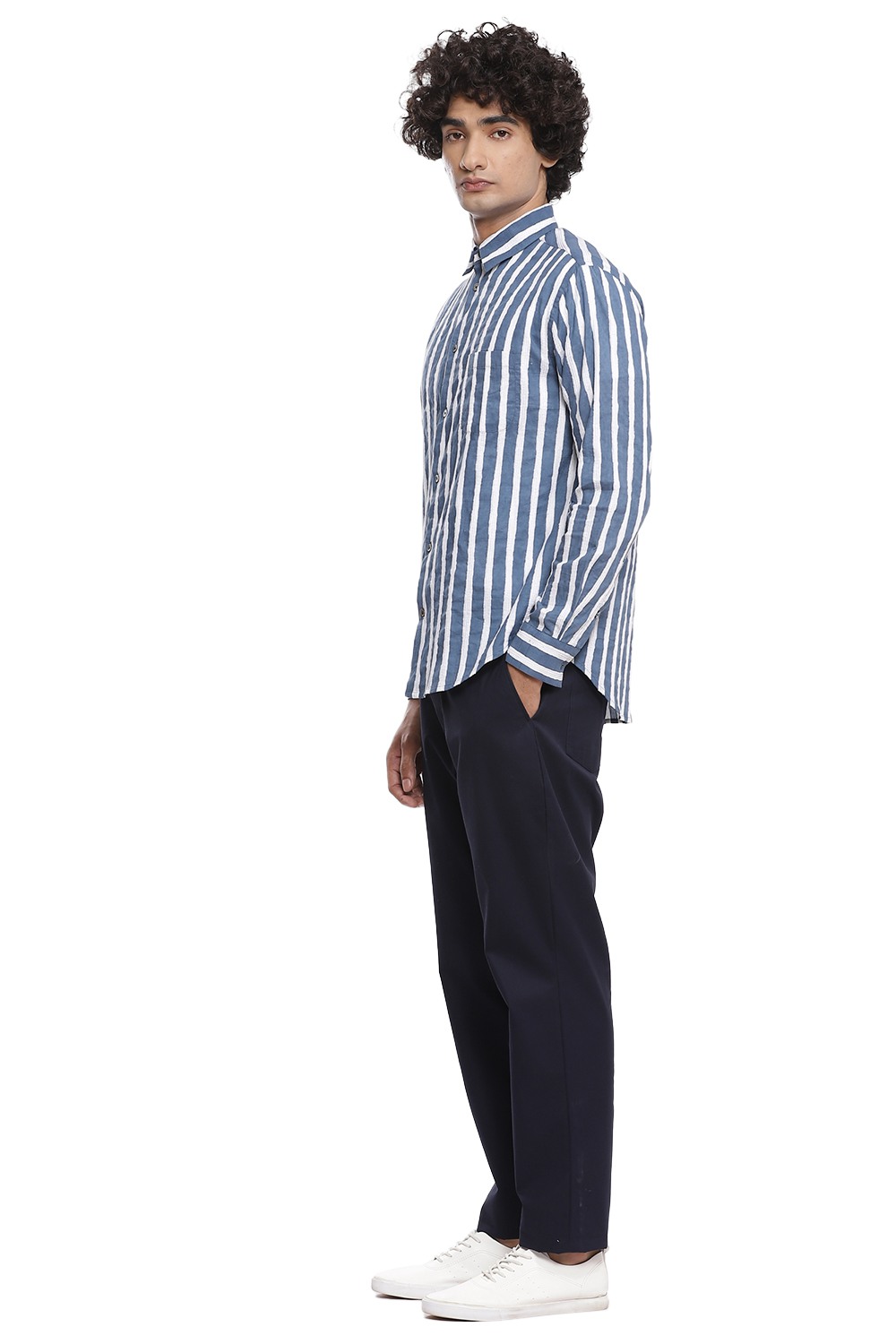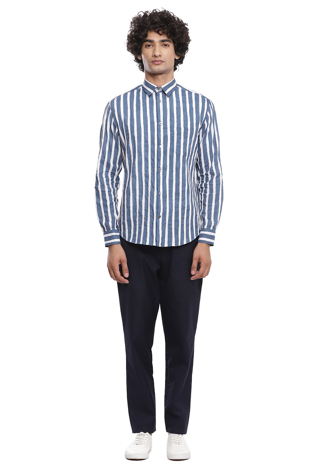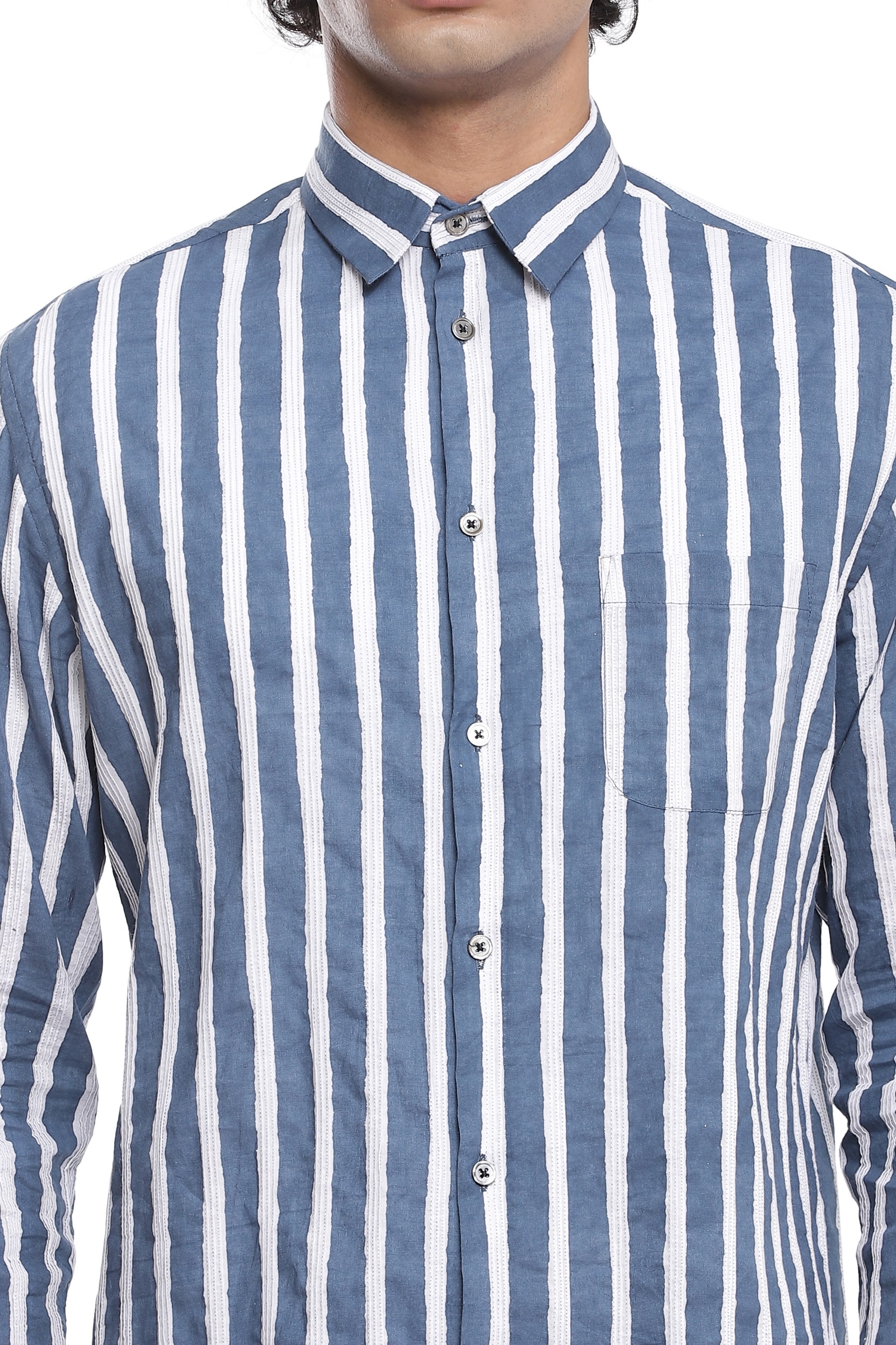 Bands of vertical block print stripes with pintucks, crafted from cotton cambric in indigo and white. This shirt is cut for an easy and relaxed fit.