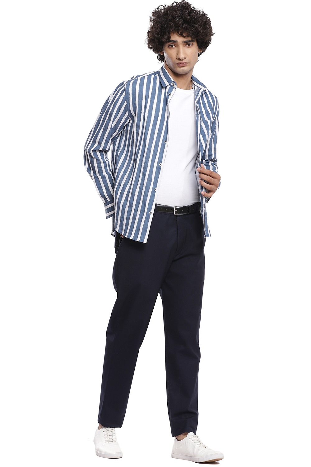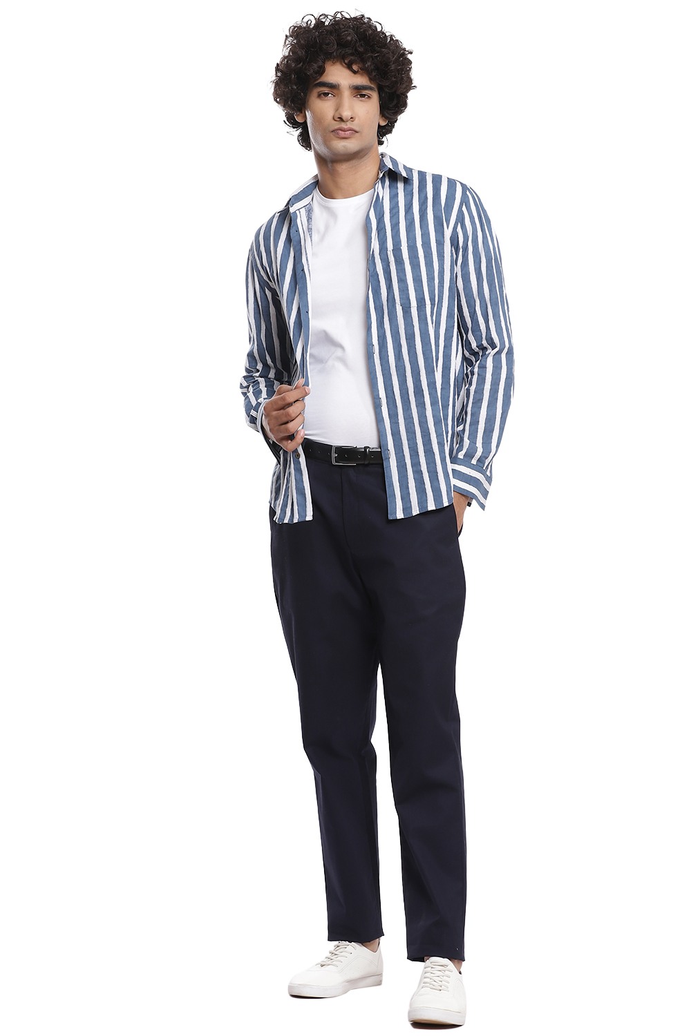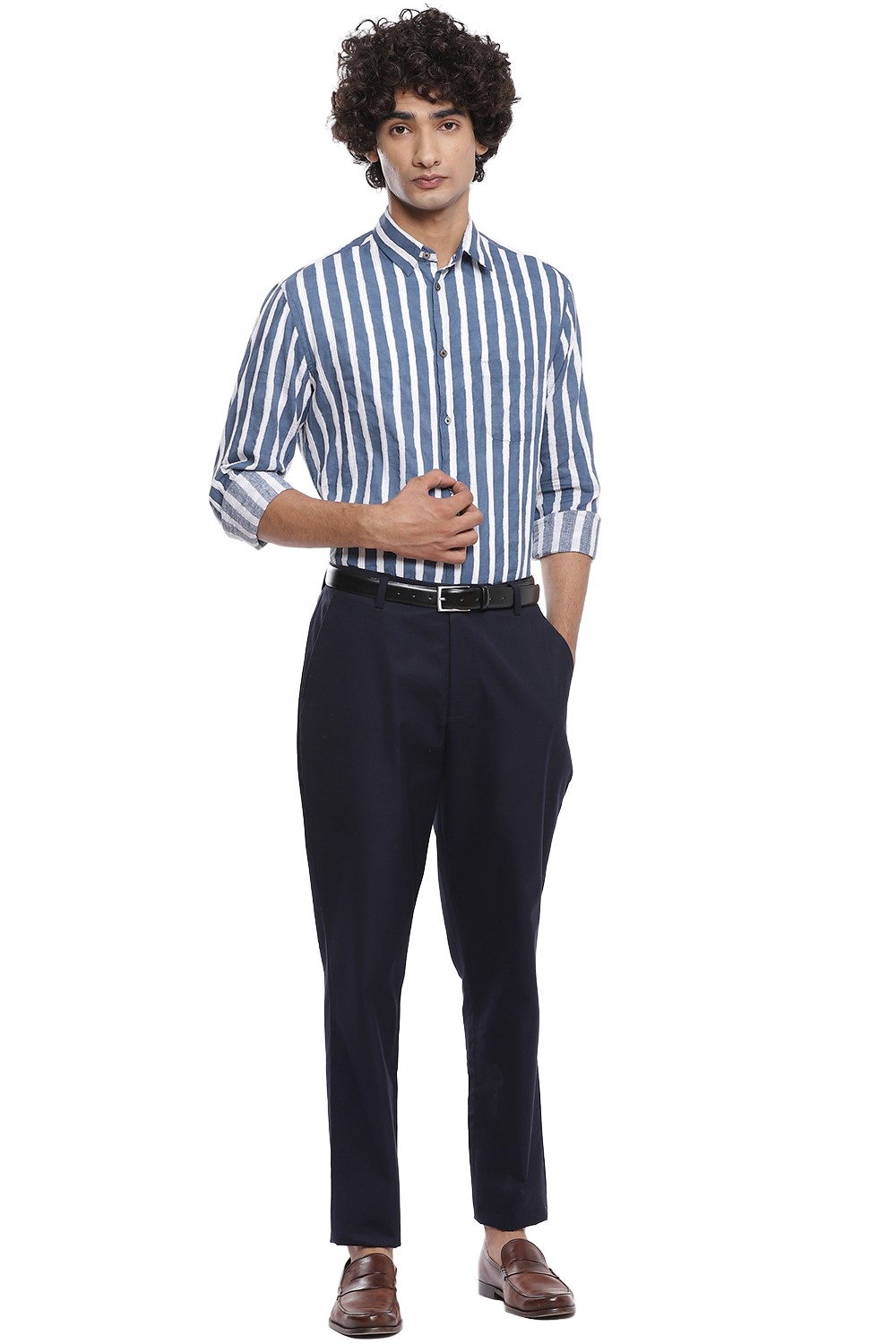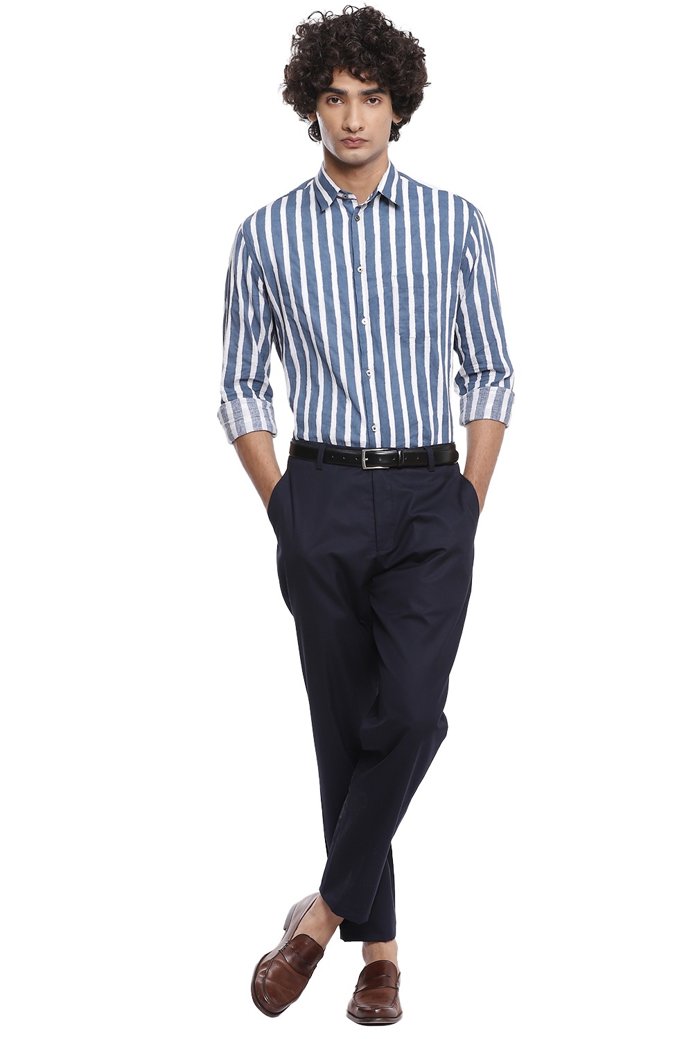 Bands of vertical block print stripes with pintucks, crafted from cotton cambric in indigo and white. This shirt is cut for an easy and relaxed fit.