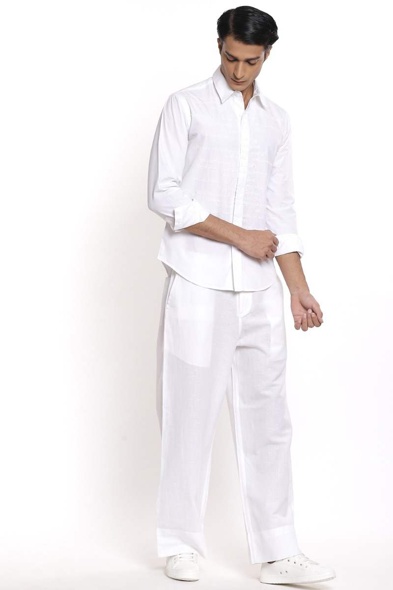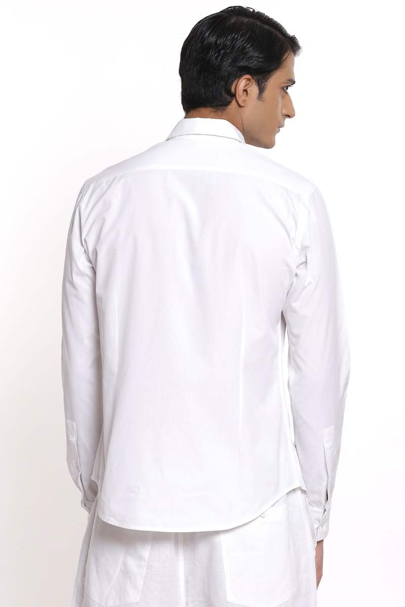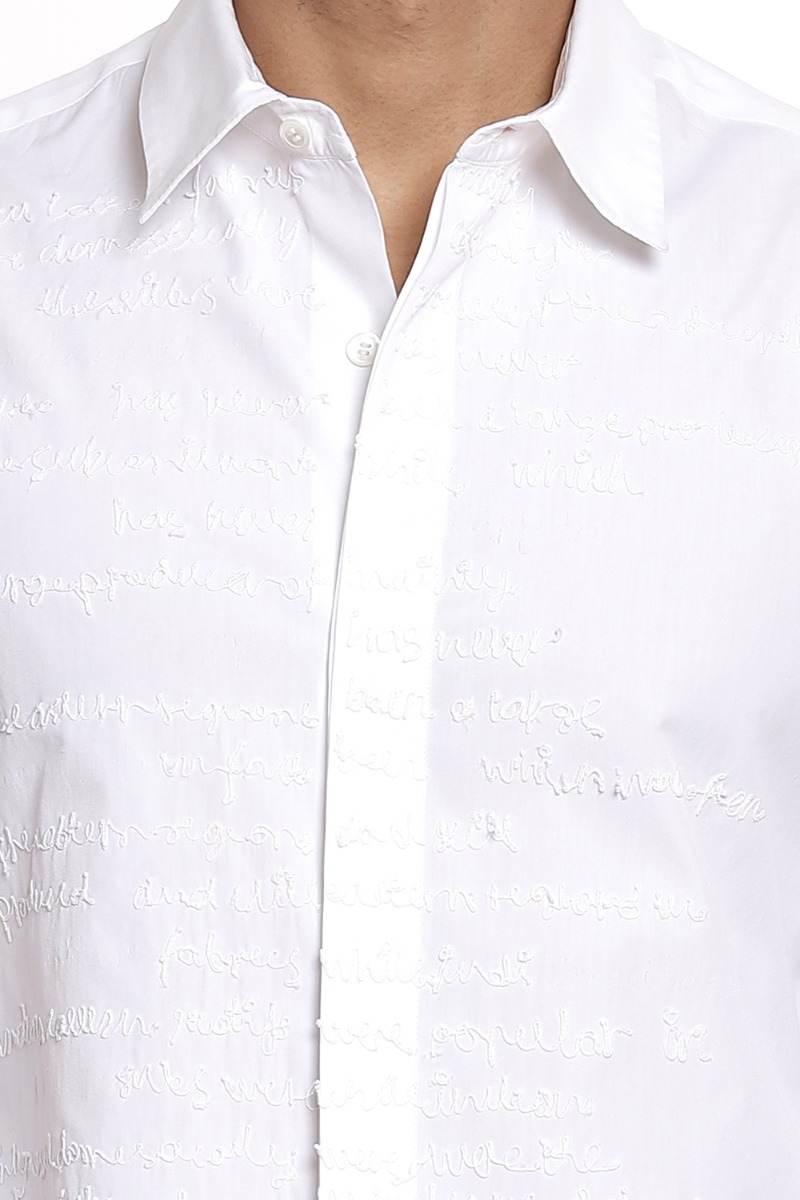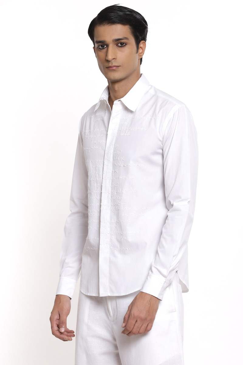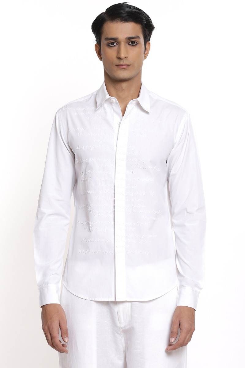 Ivory With Ivory Dori Calligraphy Embroidery. Abraham & Thakore Shirts For Men Have Been Crafted In Lightweight Natural Textiles In Regular And Slim Fits, Employing Various Traditional Textiles Techniques