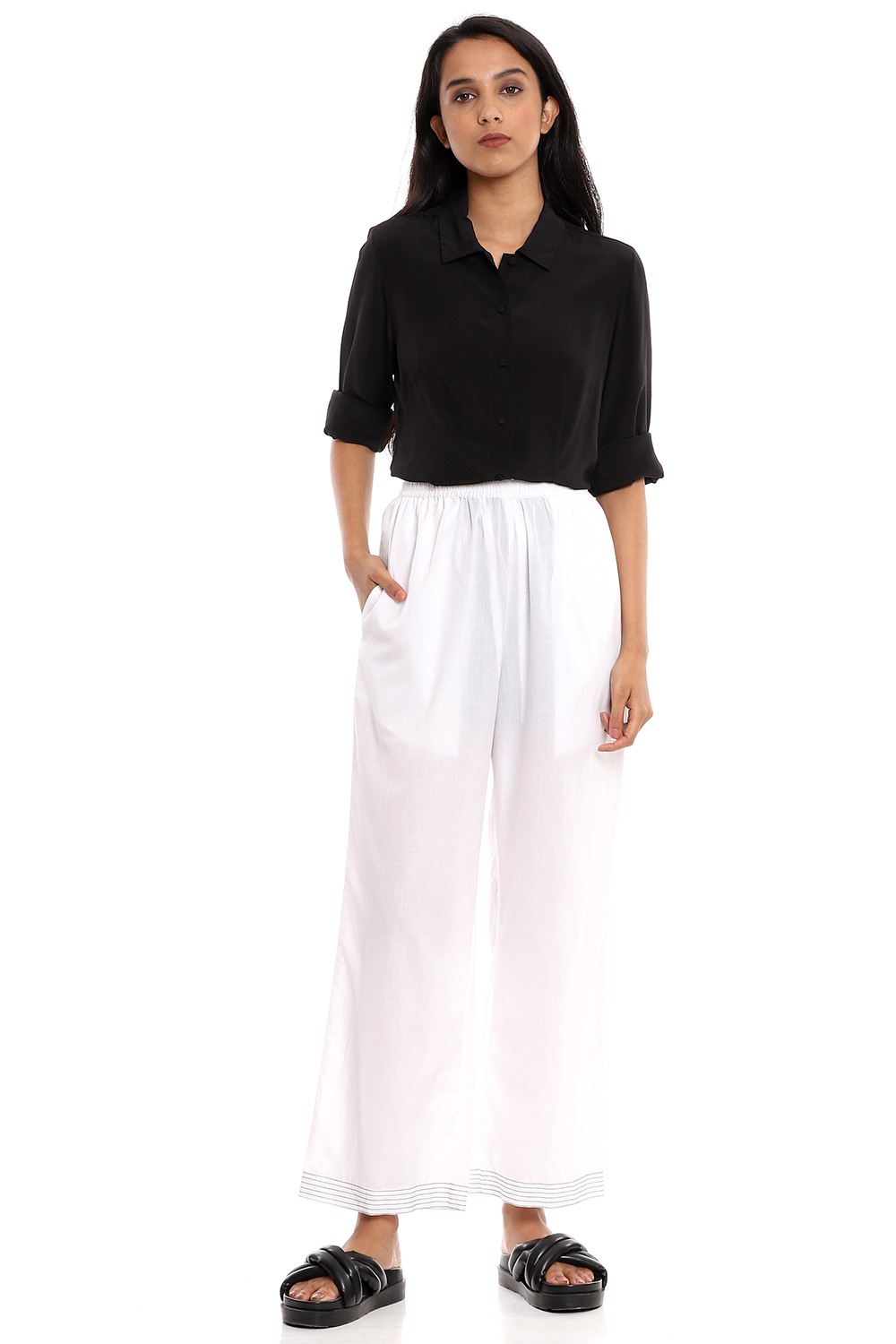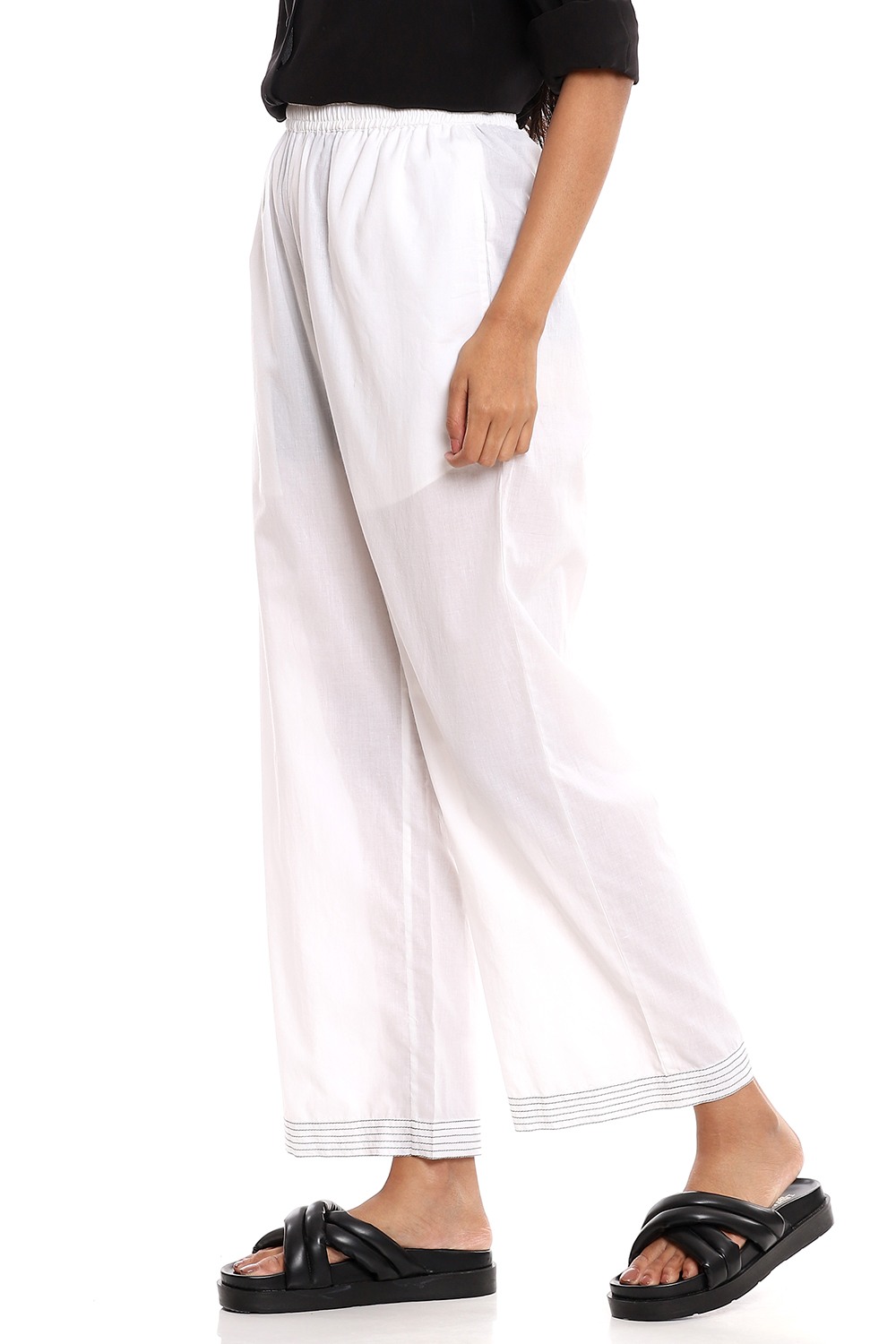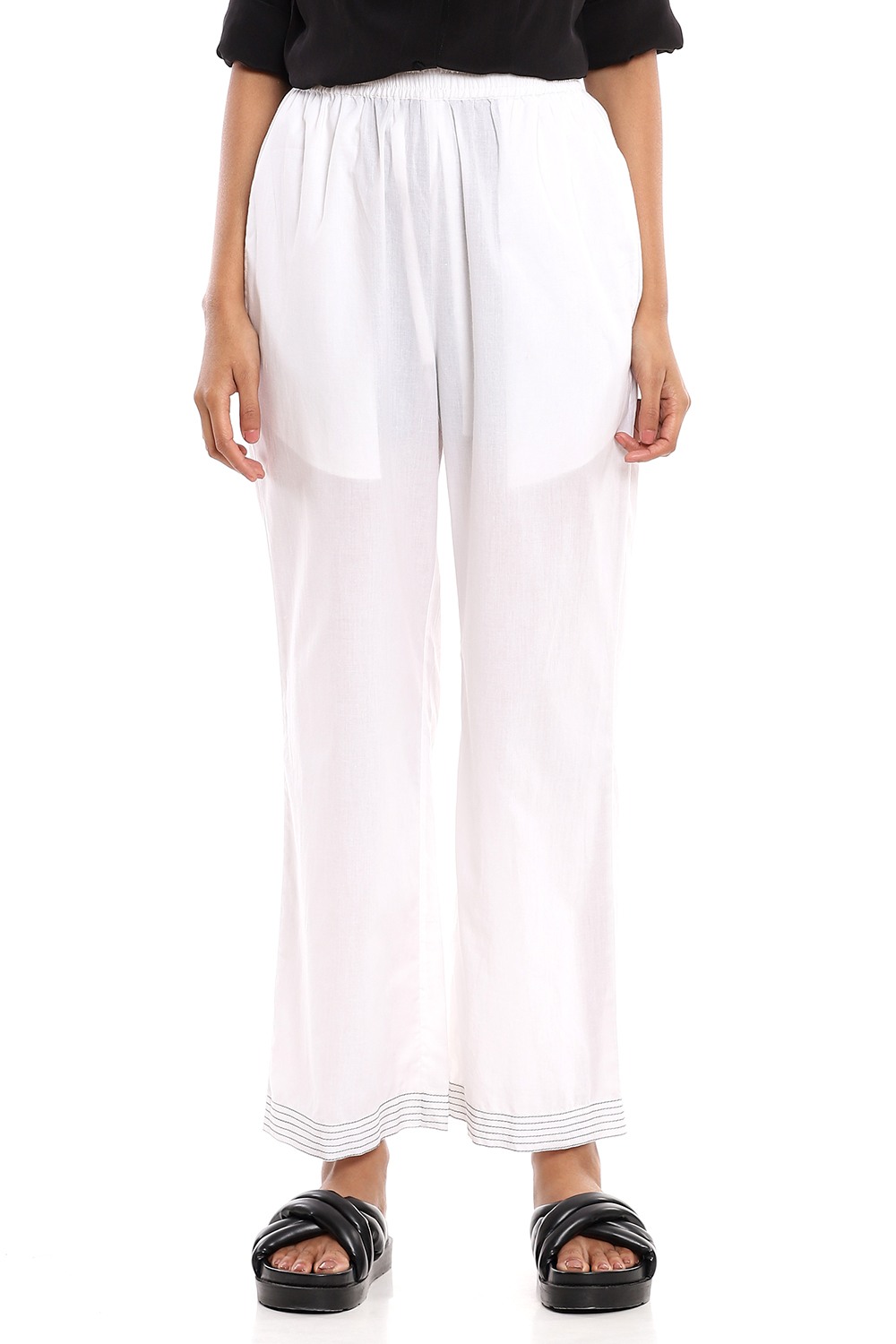 Perfect for every day, crafted from ivory soft cotton cambric pants, detailed with multiple black embroidered stripes on the hems.