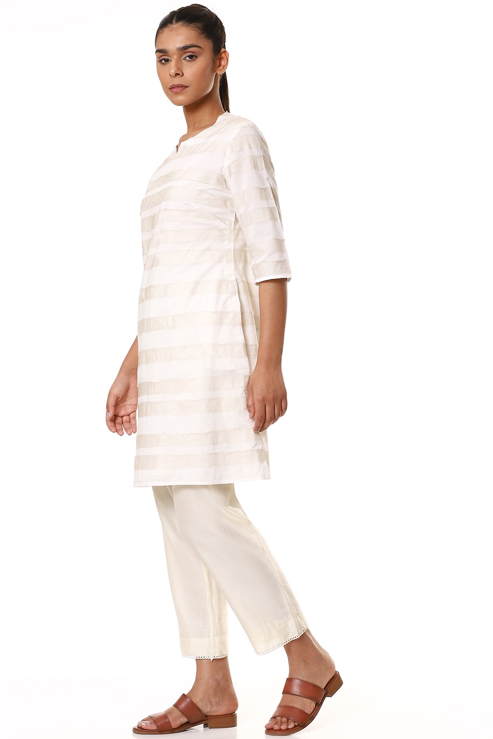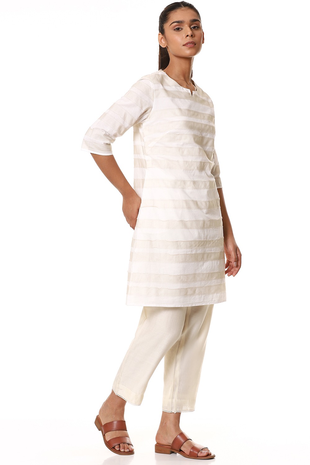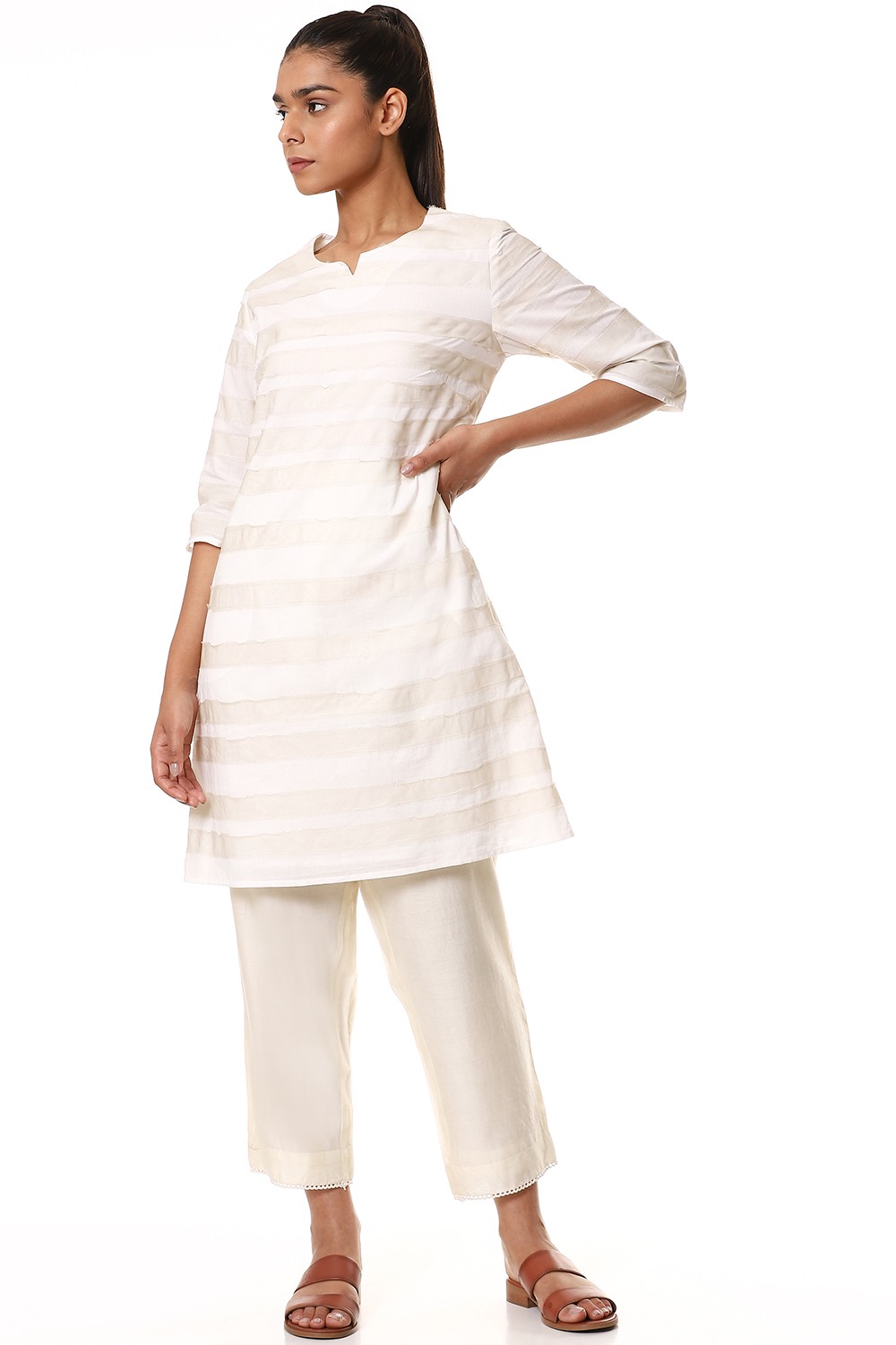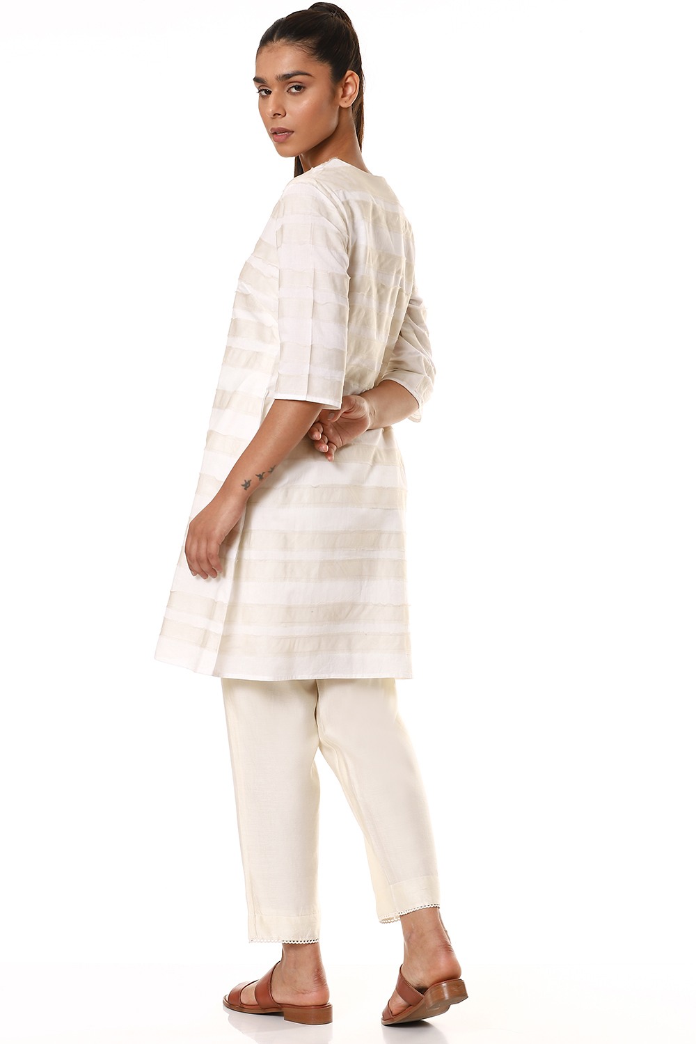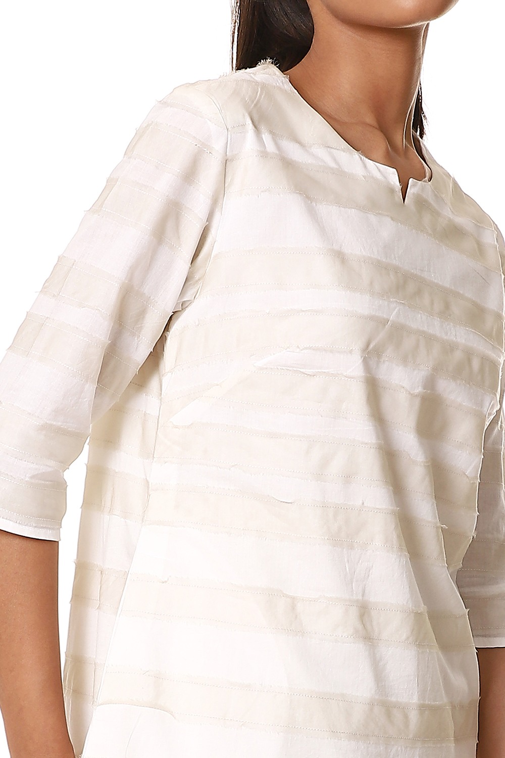Look super cool and sharp in this absolute must have horizantal stripe dress, crafted from cotton cambric with soft tone of ivory/ beige stripes in silk organza, detailed with raw edges. Handcrafted with love and specially created for your everyday clothing needs.