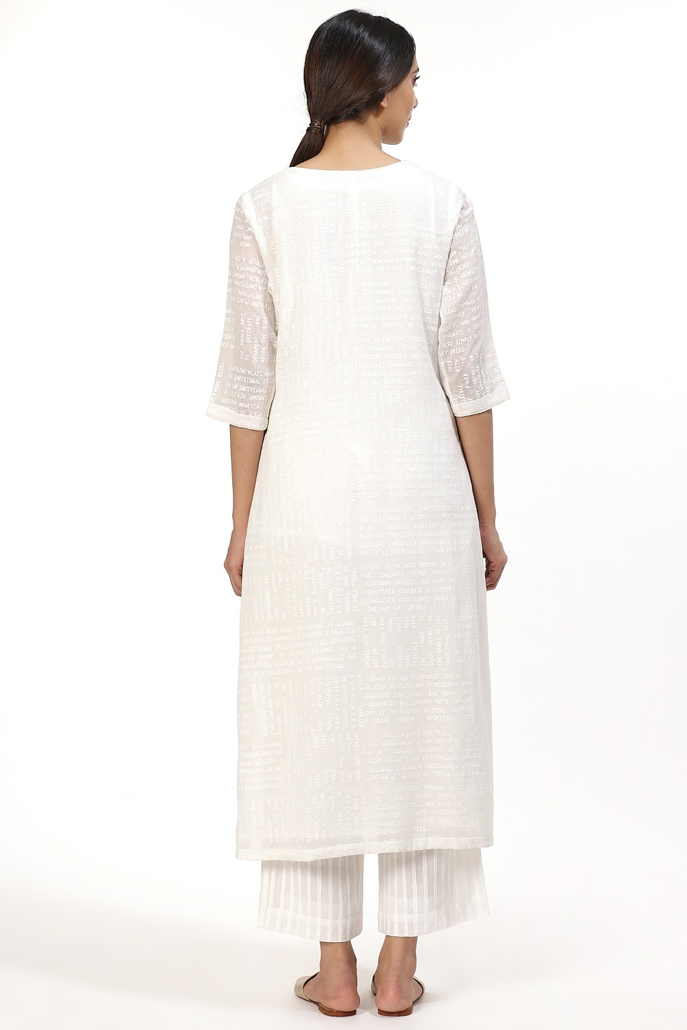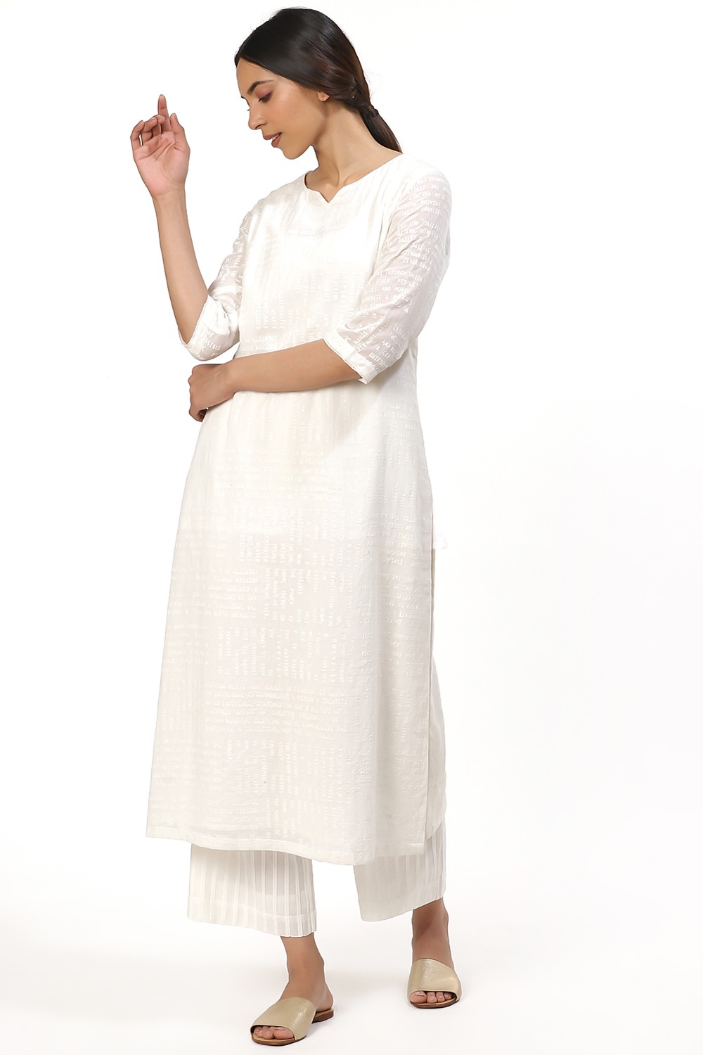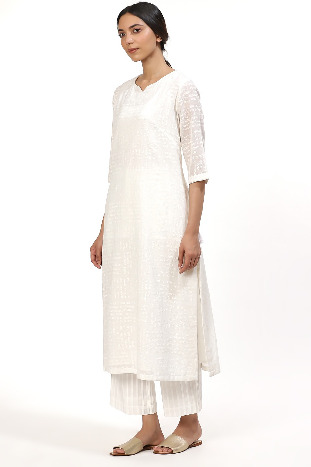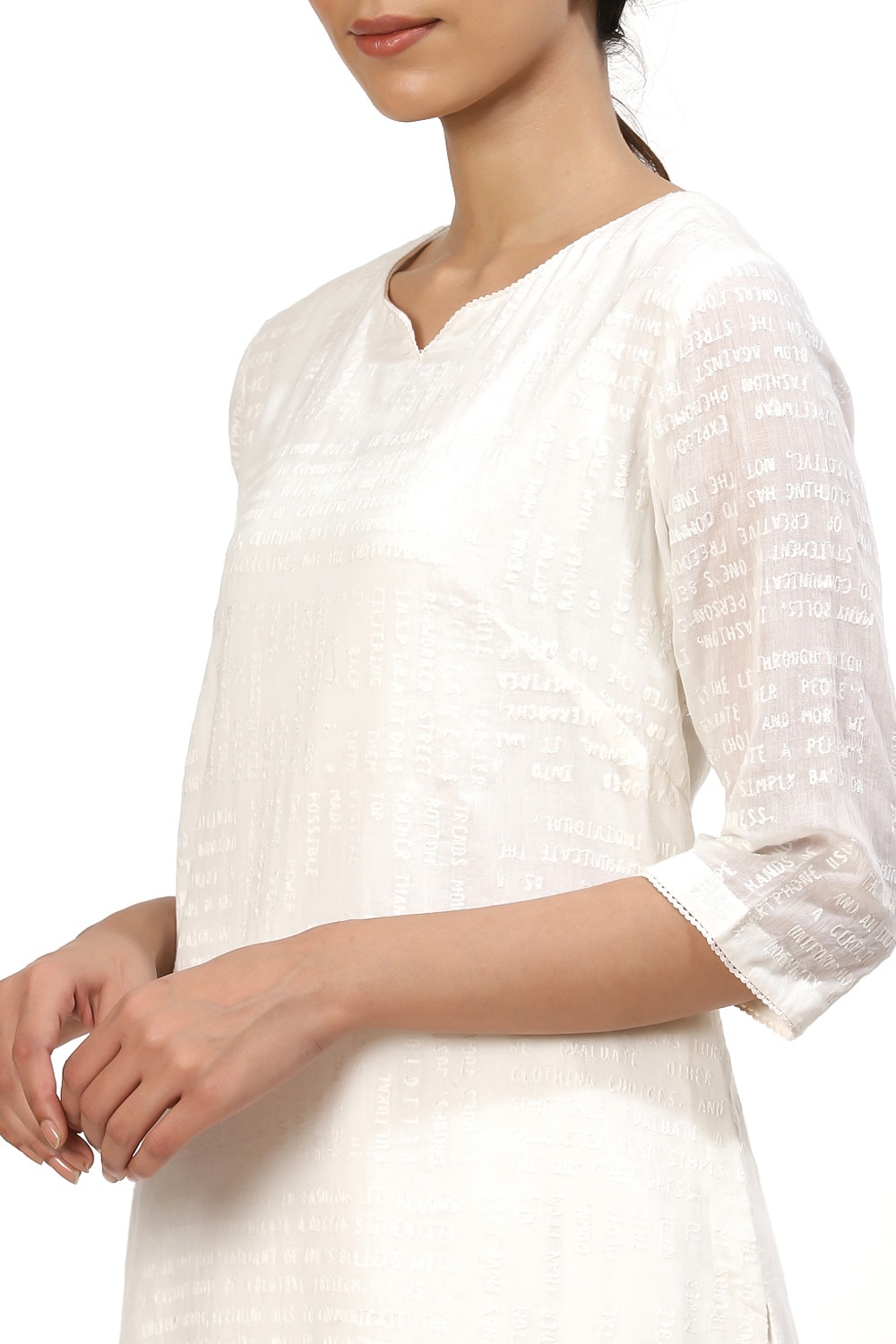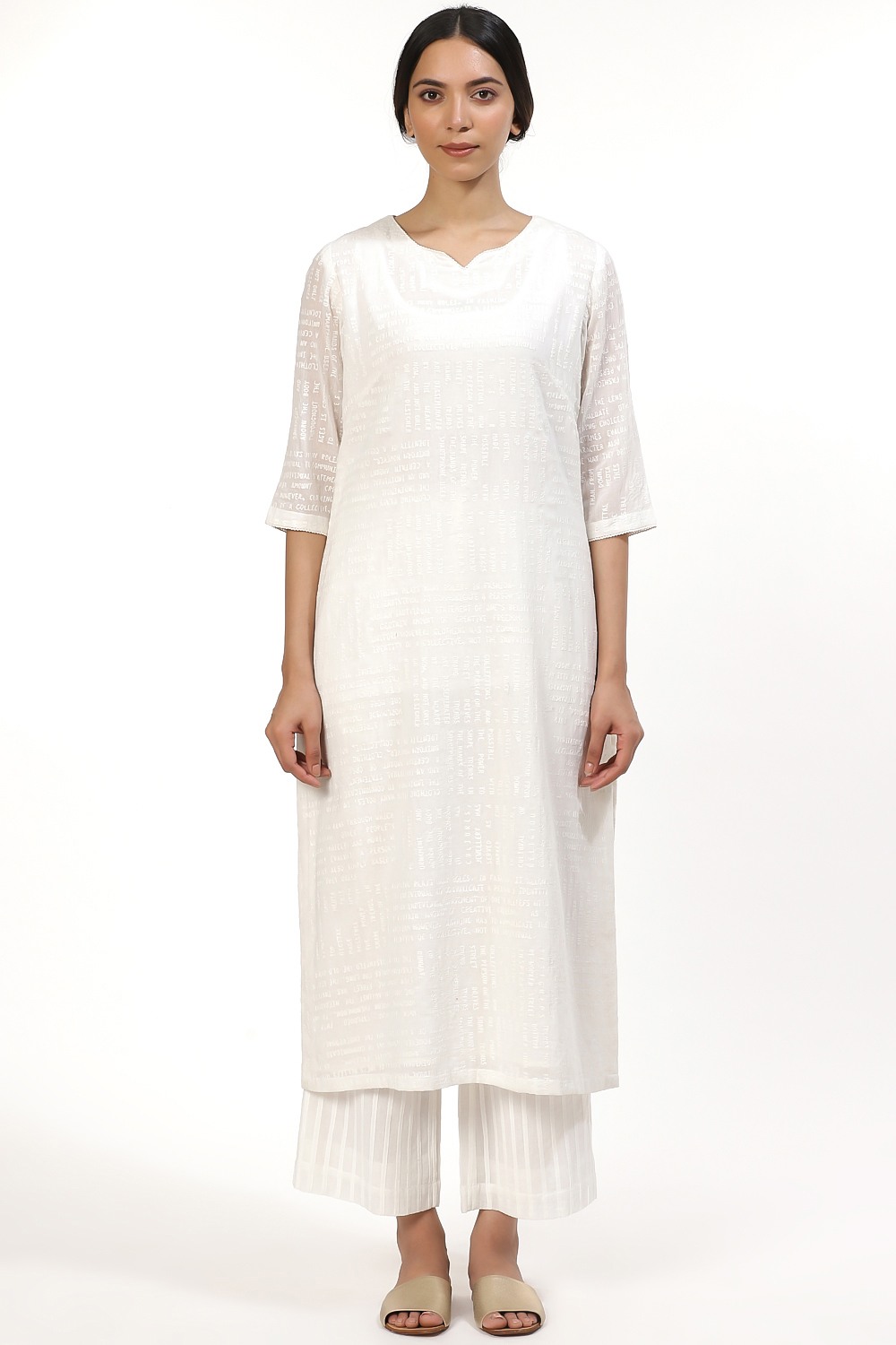 Ivory Typography Embroidered Kurta, Crafted On Cotton Voile, A Slim And Elegant Silhouette. Coordinate Your Style With An Allover Pleated Pair Of Wide Leg Cropped Pants In Ivory Cut From Cotton Voile.