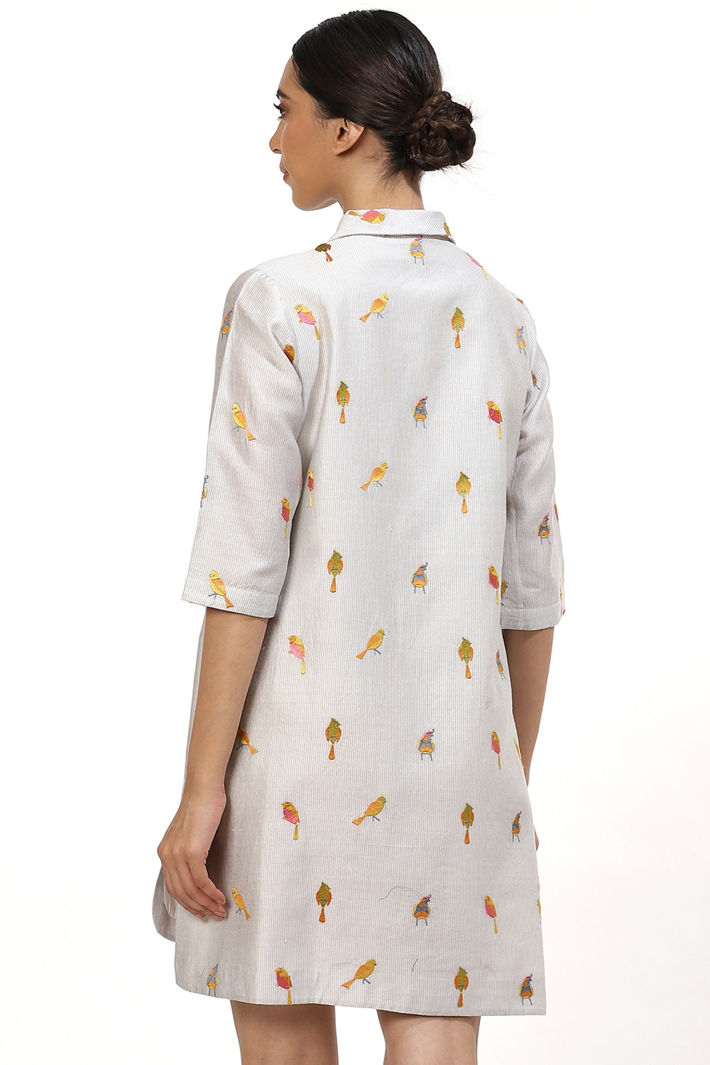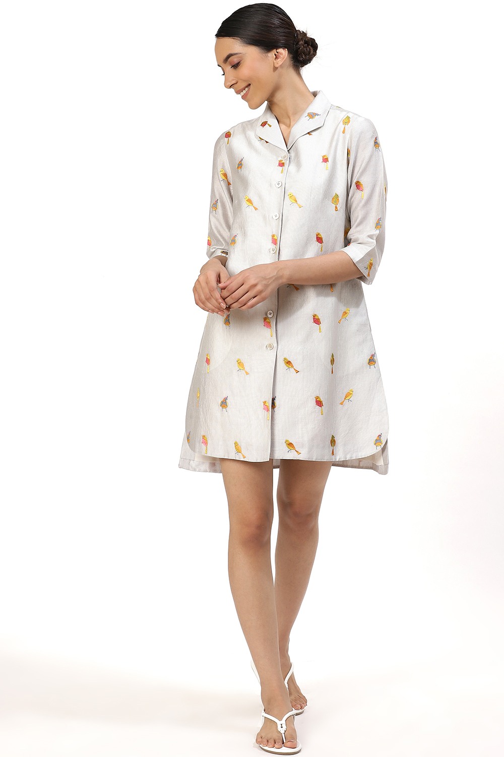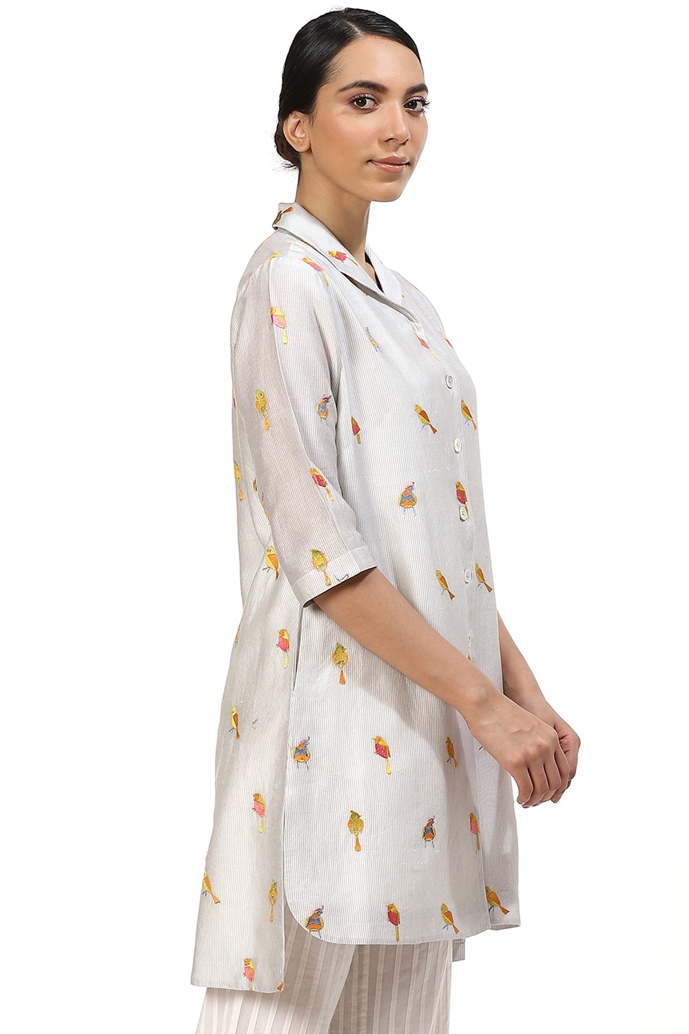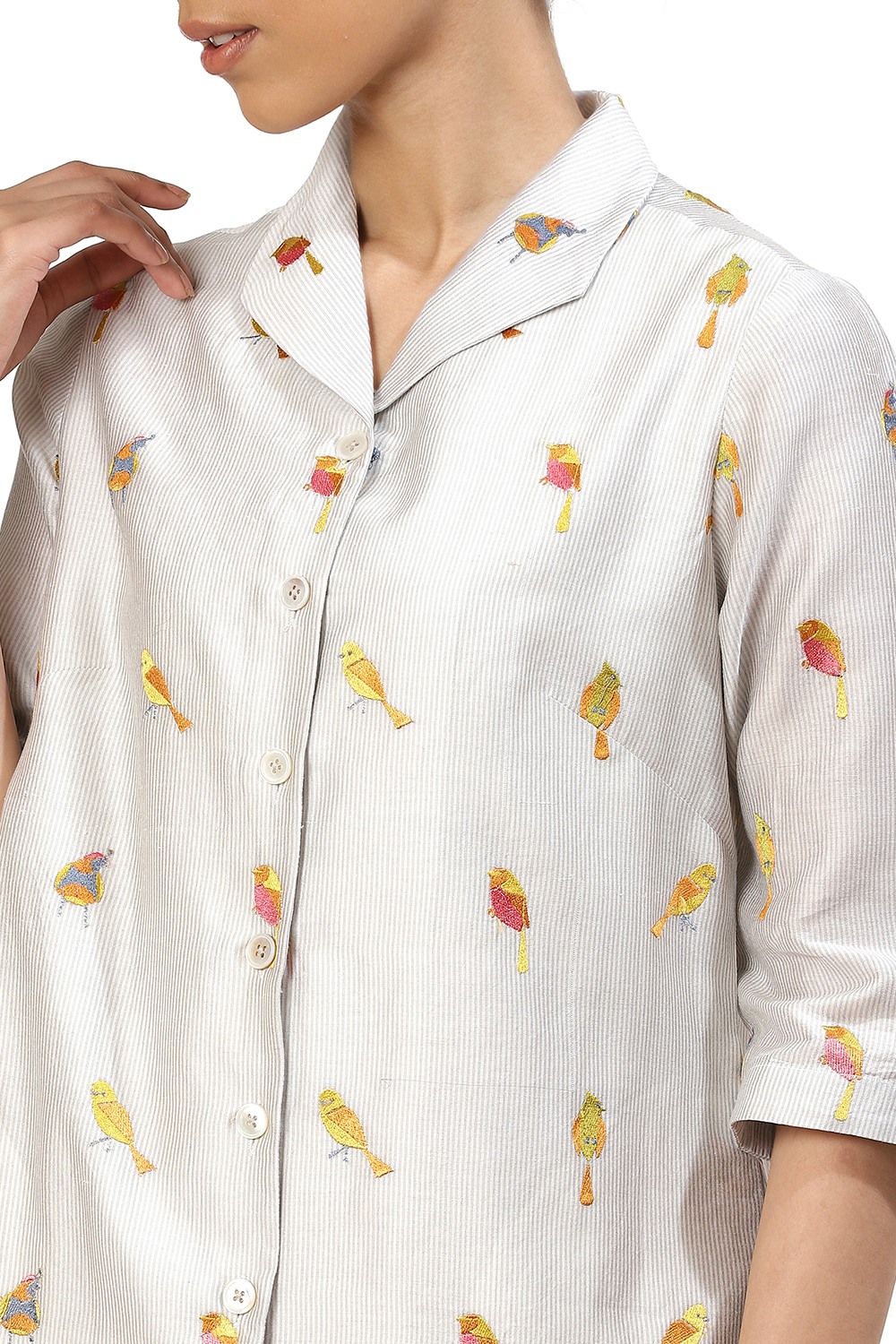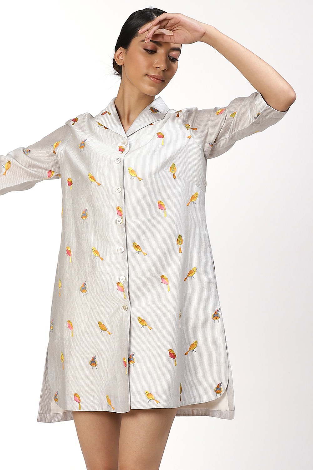 Add this shirt to your wadrobe, crafted from silk cotton fabric, with colourful embroidered birds on ivory. Pair yours with narrow cropped pants and flat sandals to work or wear it as a dress to a first date.