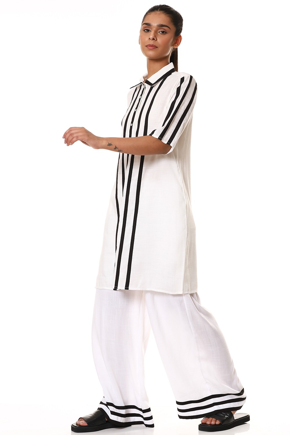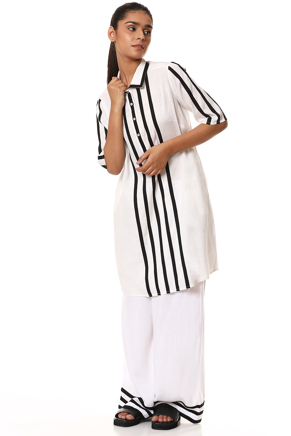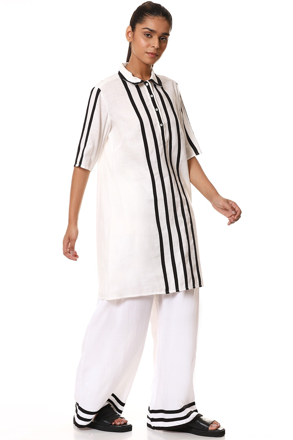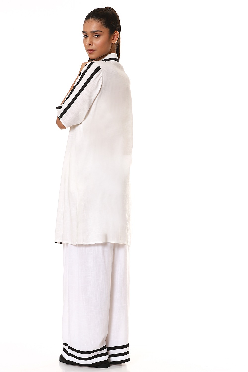 Look super cool and stylish in this ivory button front shirt/dress, crafted from sustainable cellulose blend fabric, detailed with black fabric tapes on the front and sleeves. Specially created for your everyday clothing needs.