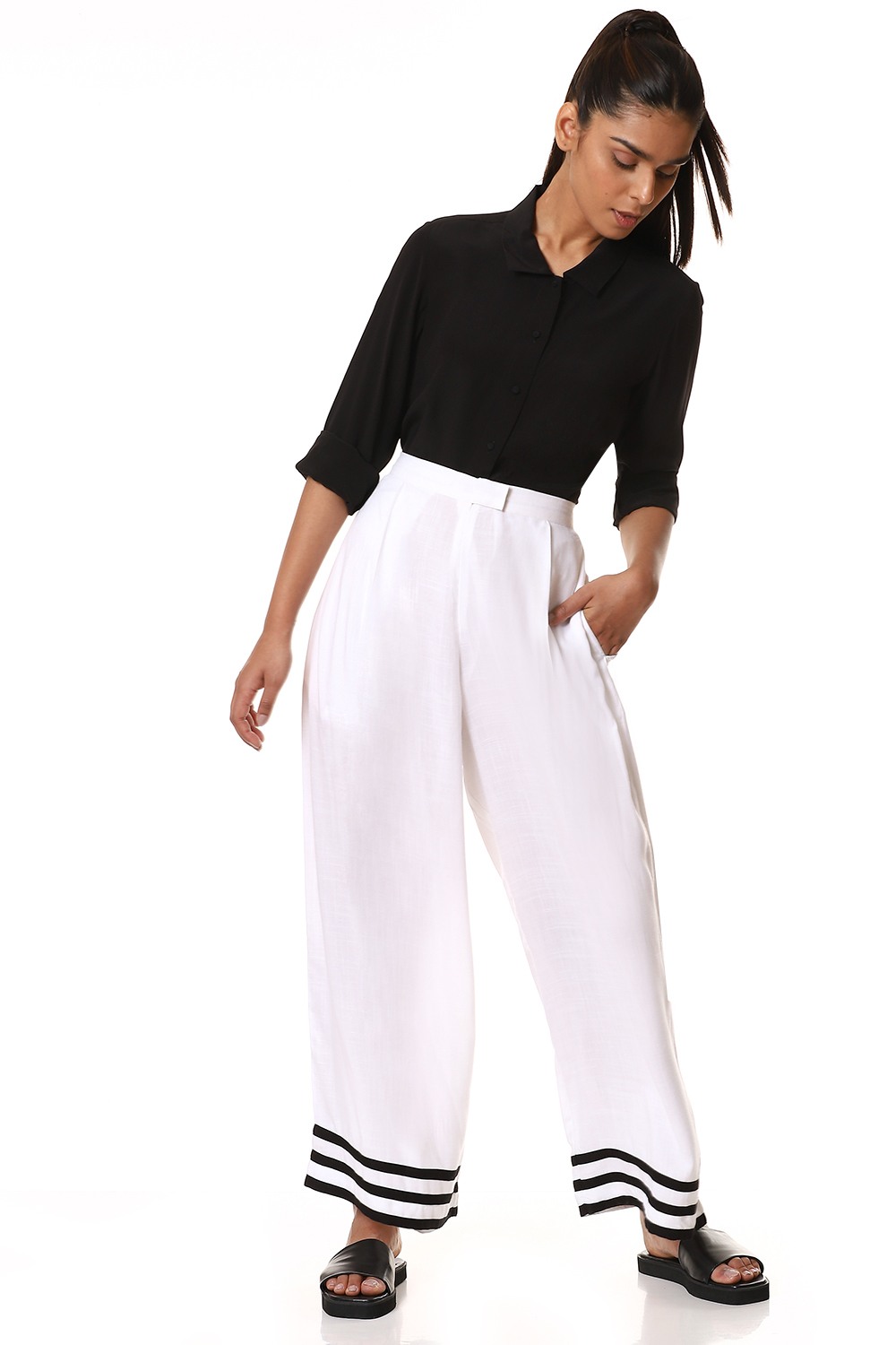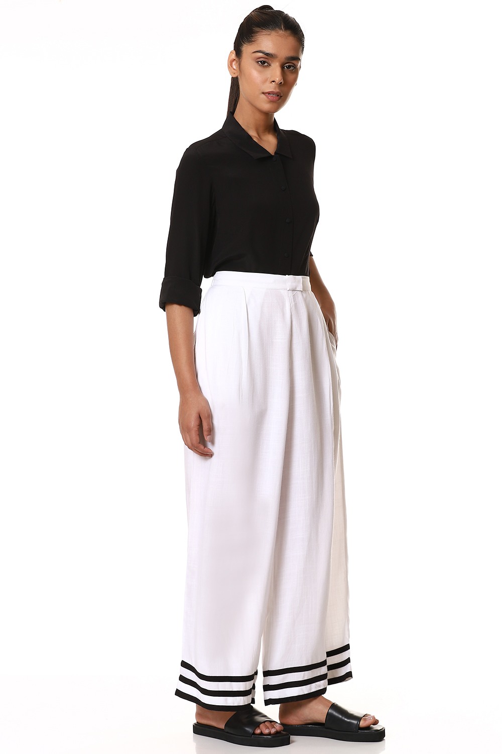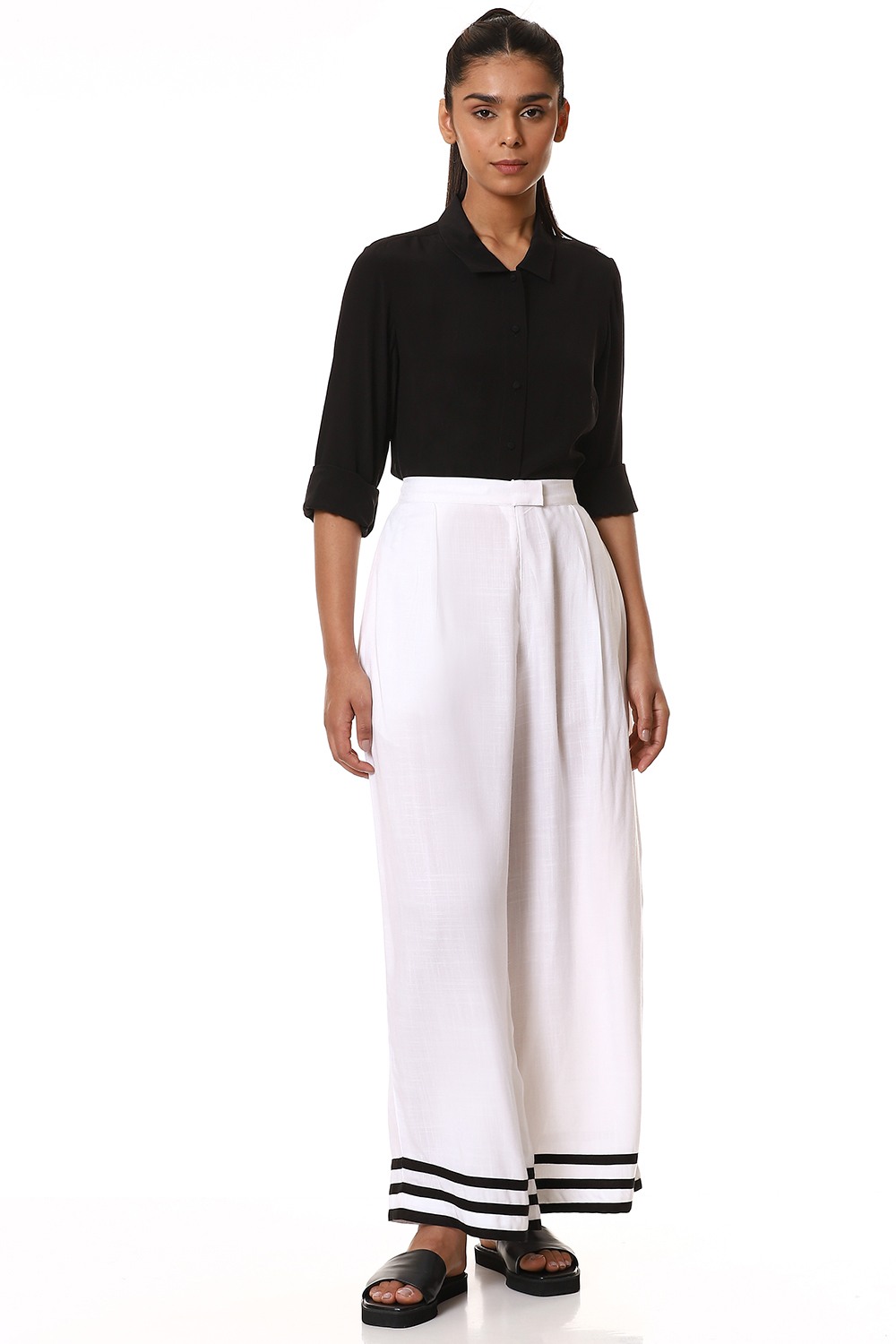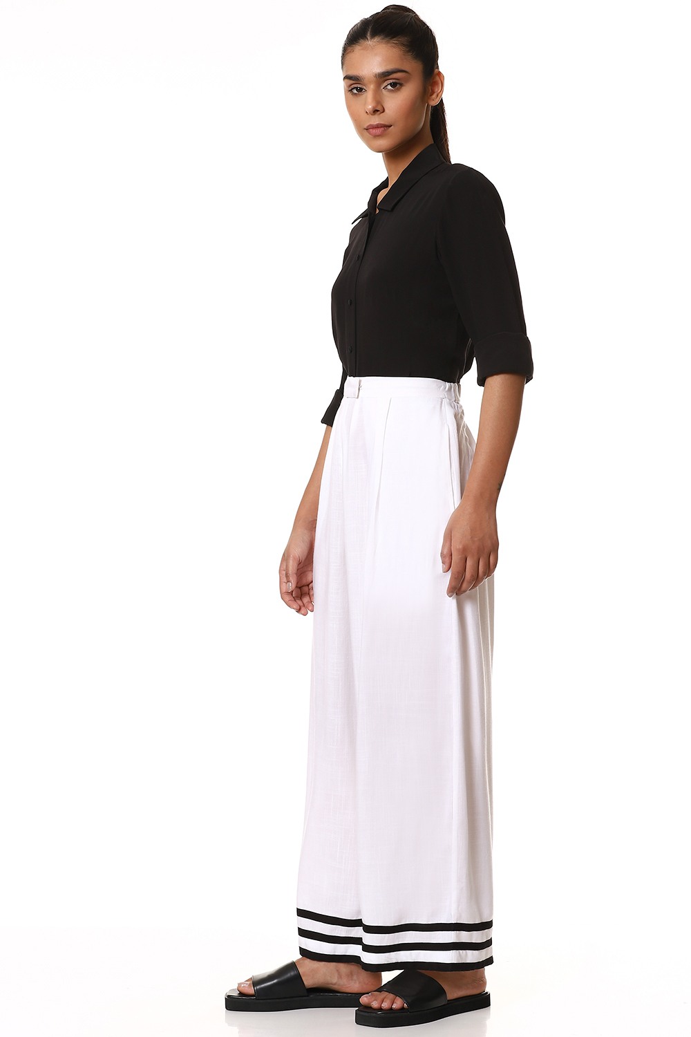 Elegant ivory wide leg pants with black tapes on the hem, crafted from sustainable cellulose blend fabric. Added soft elastic waistband for an easy and comfortable fit which works great for all body types. Specially created for your everyday clothing needs.