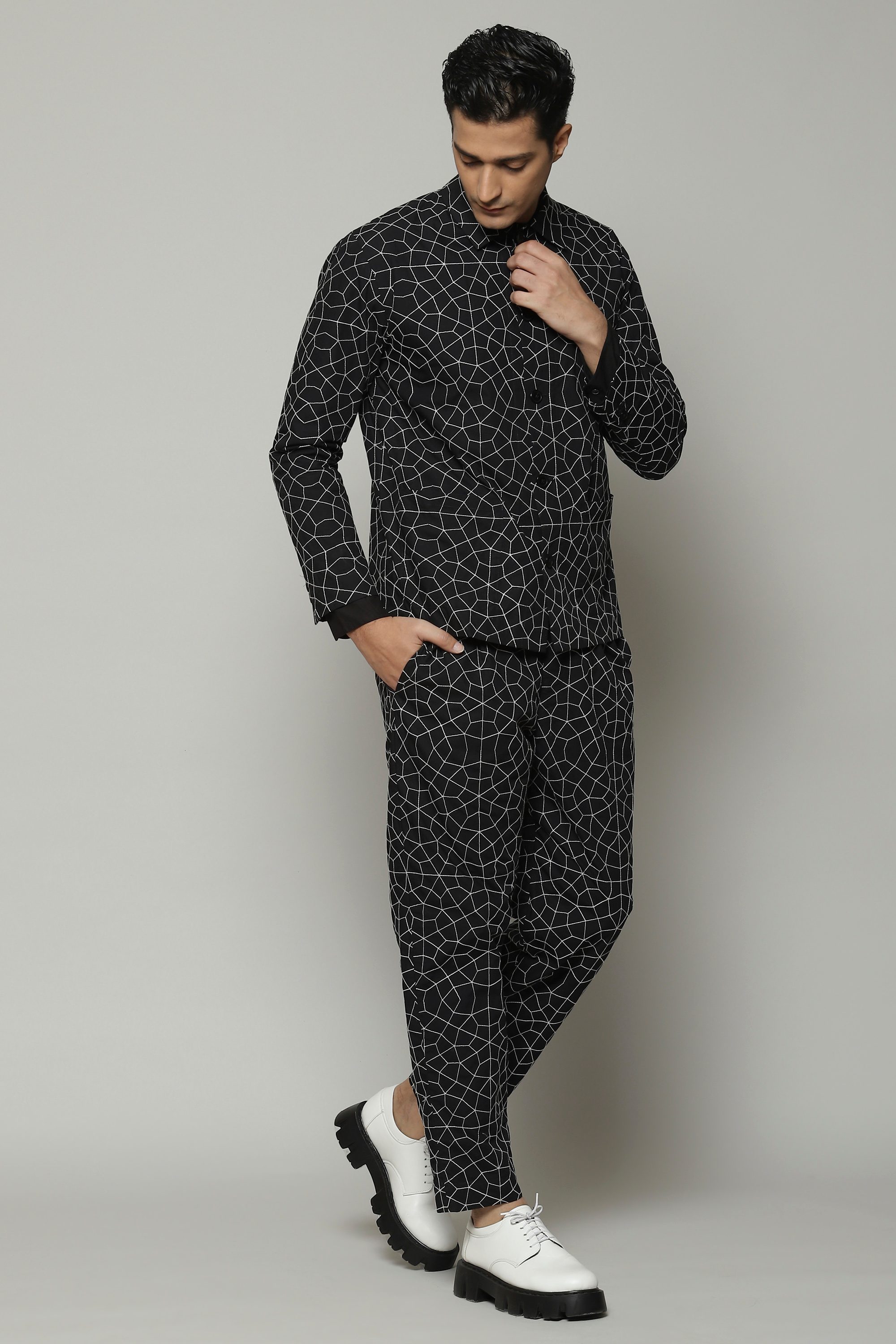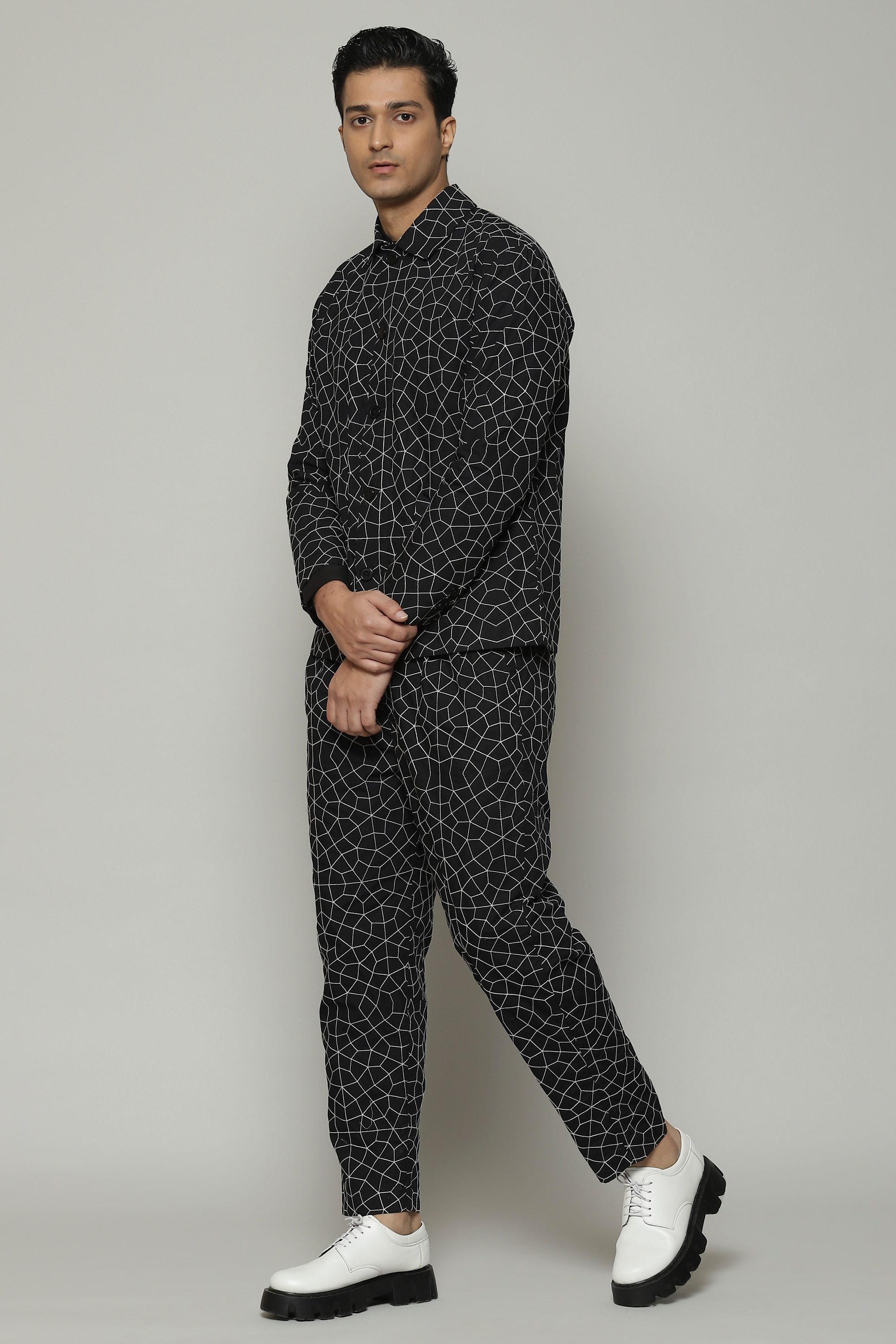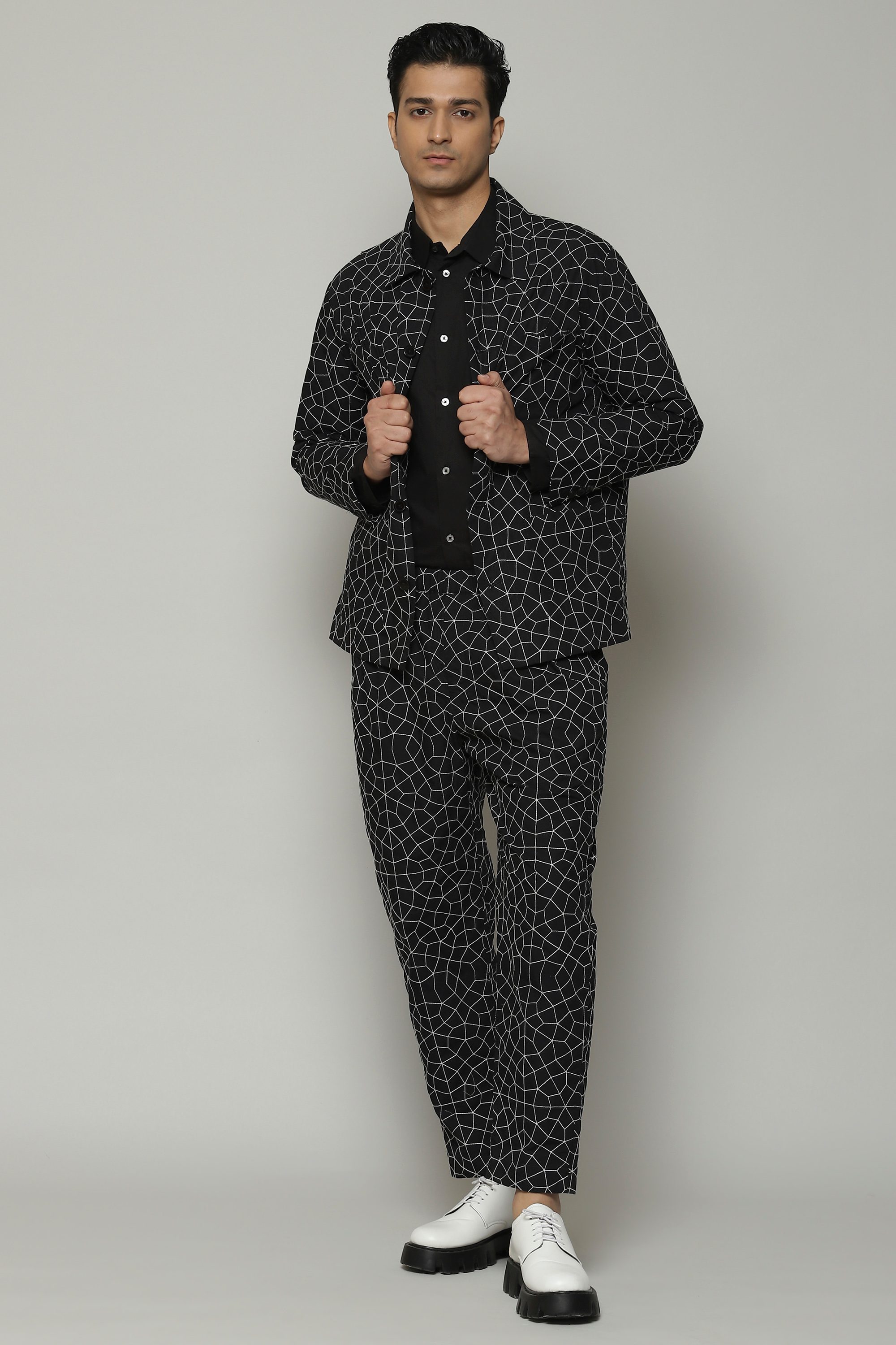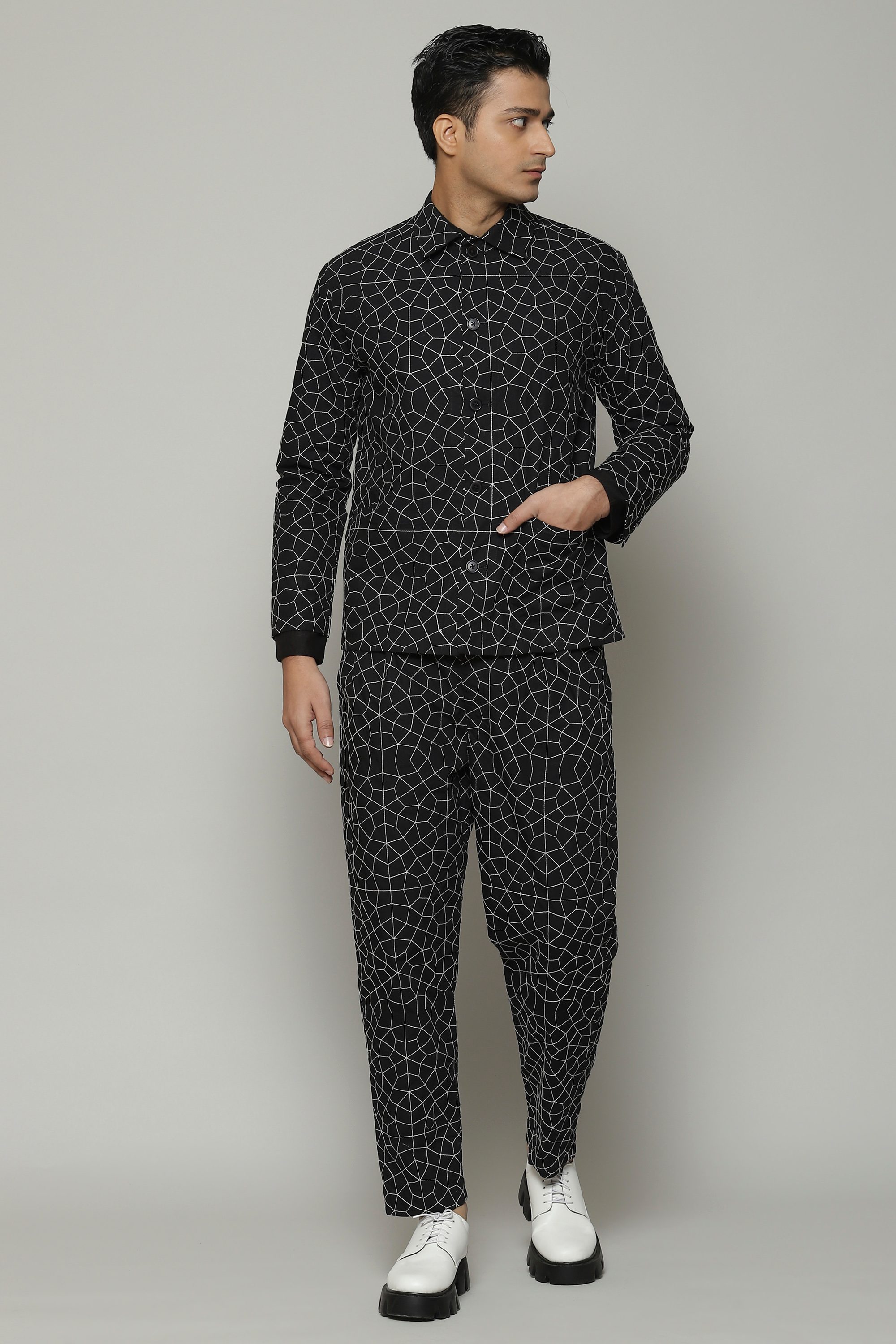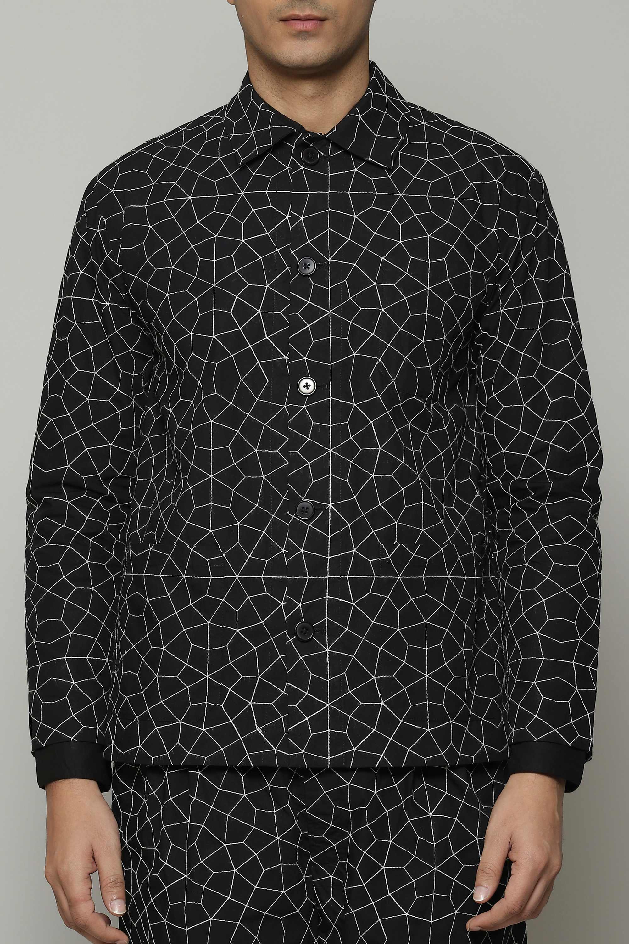 Stylish outerwear that's an ode to the the night sky. Crafted in a soft poplin fabric that is enhanced with silken yarn embroidery. Ideal for an evening under the stars.