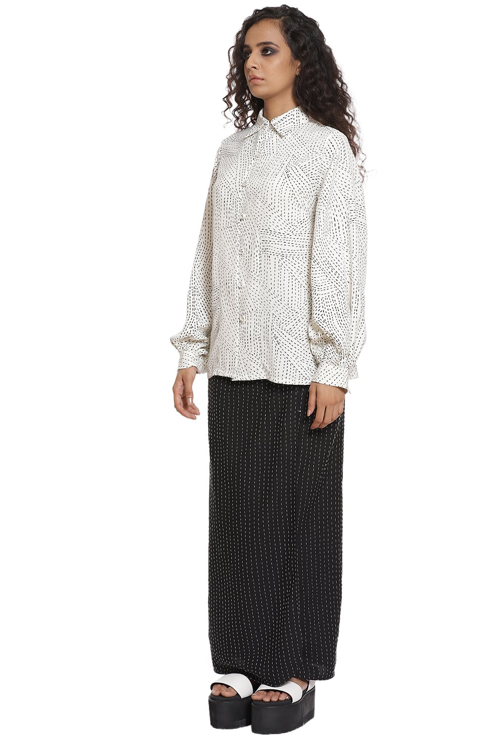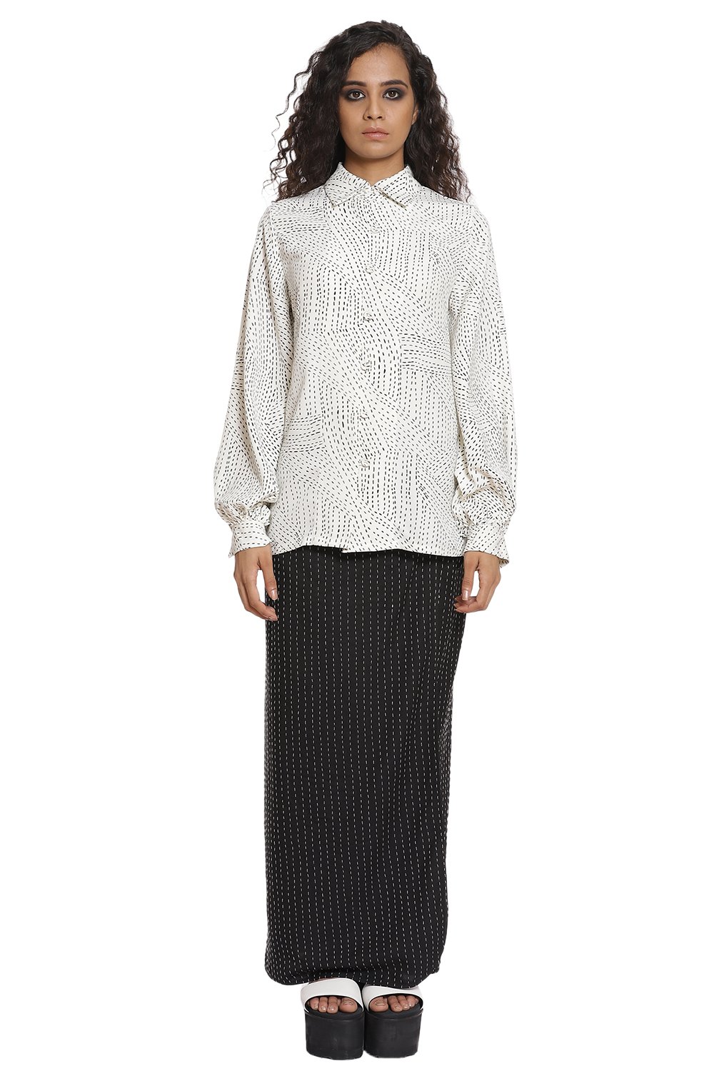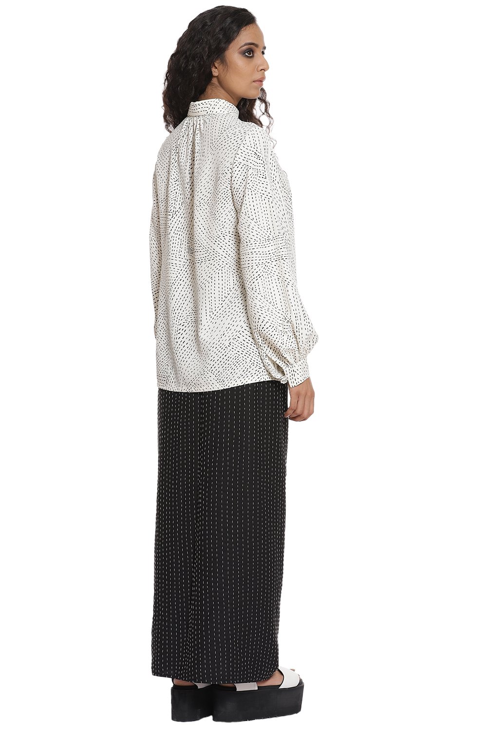Kantha print Shirt with baloon sleeves in ivory and black. Crafted from R-ELAN green gold fabric in a crepe structure.