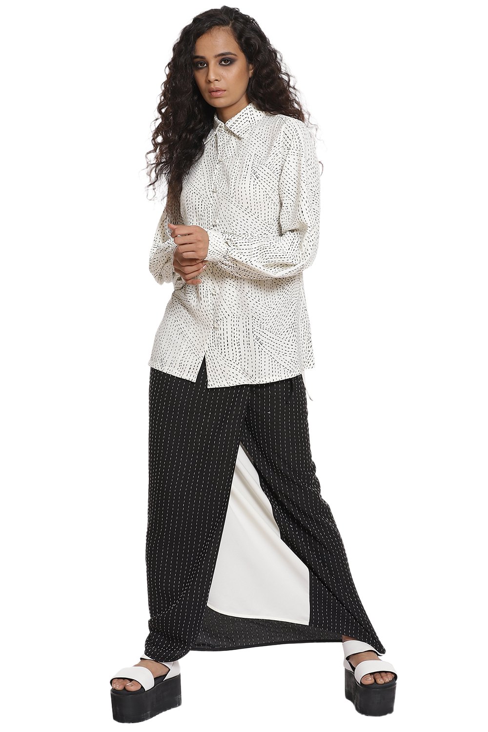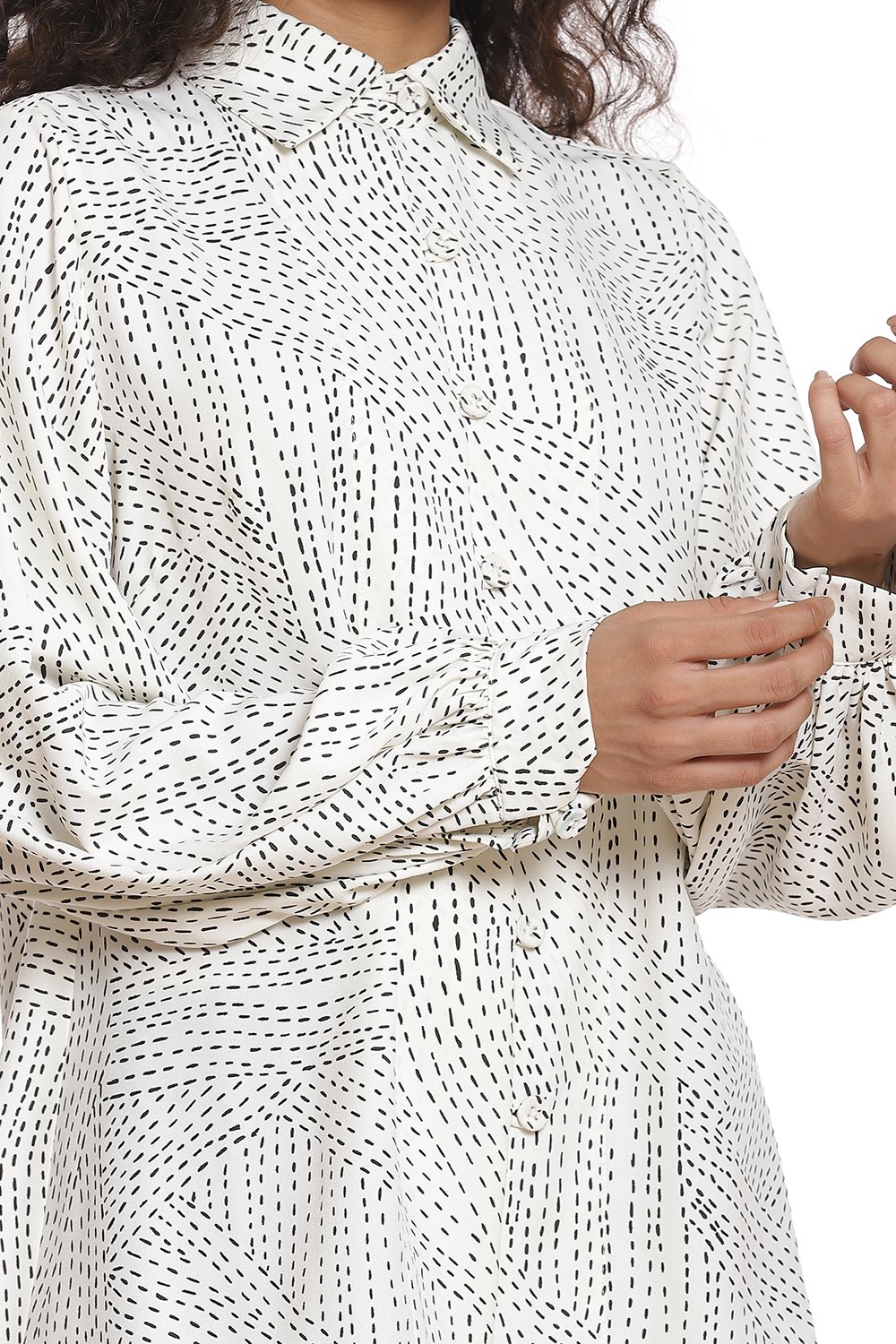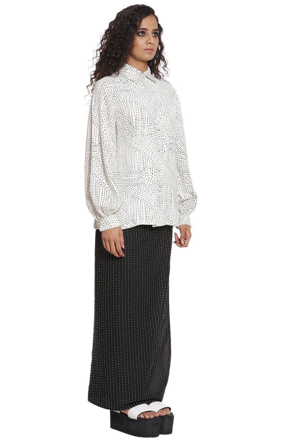 Kantha print Shirt with baloon sleeves in ivory and black. Crafted from R-ELAN green gold fabric in a crepe structure.