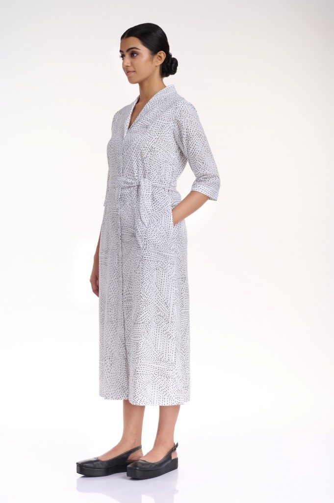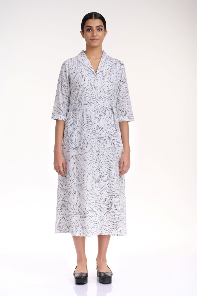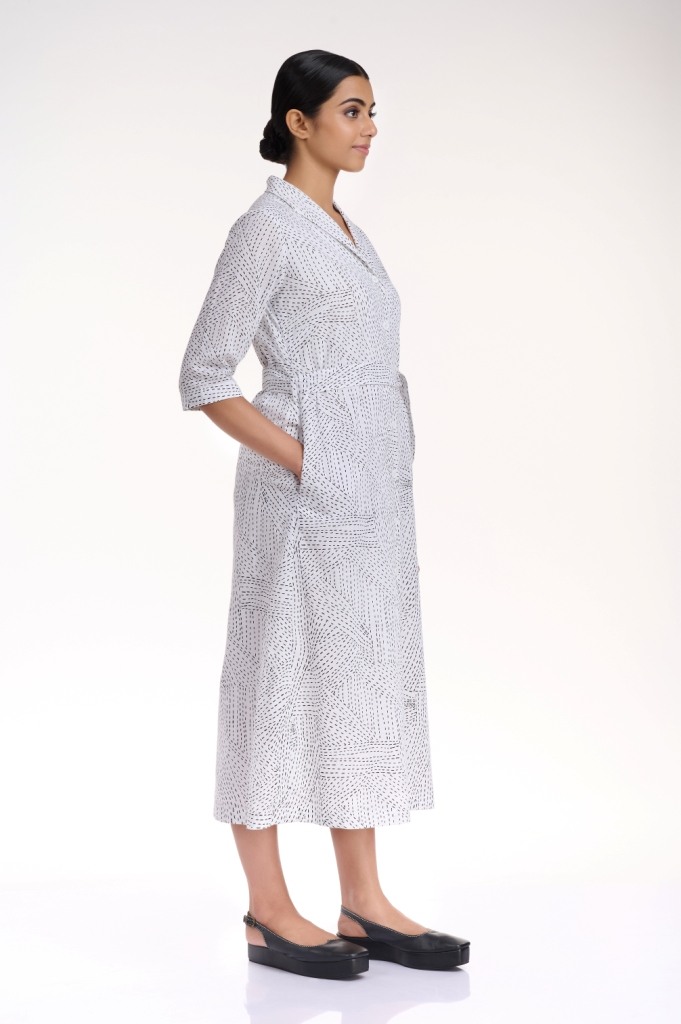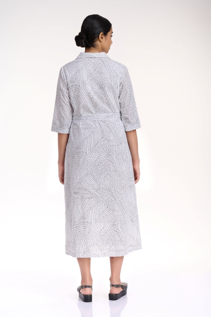 An ultimate wardrobe stable, the button front shirt dress in a relaxed and comfortable silhoutte, with an allover kantha stitch print in black on white, cut from cotton. Button details with fabric belt and loops on the side seams. This dress has buttons all the way down so it can be worn open with jeans and a t-shirt.