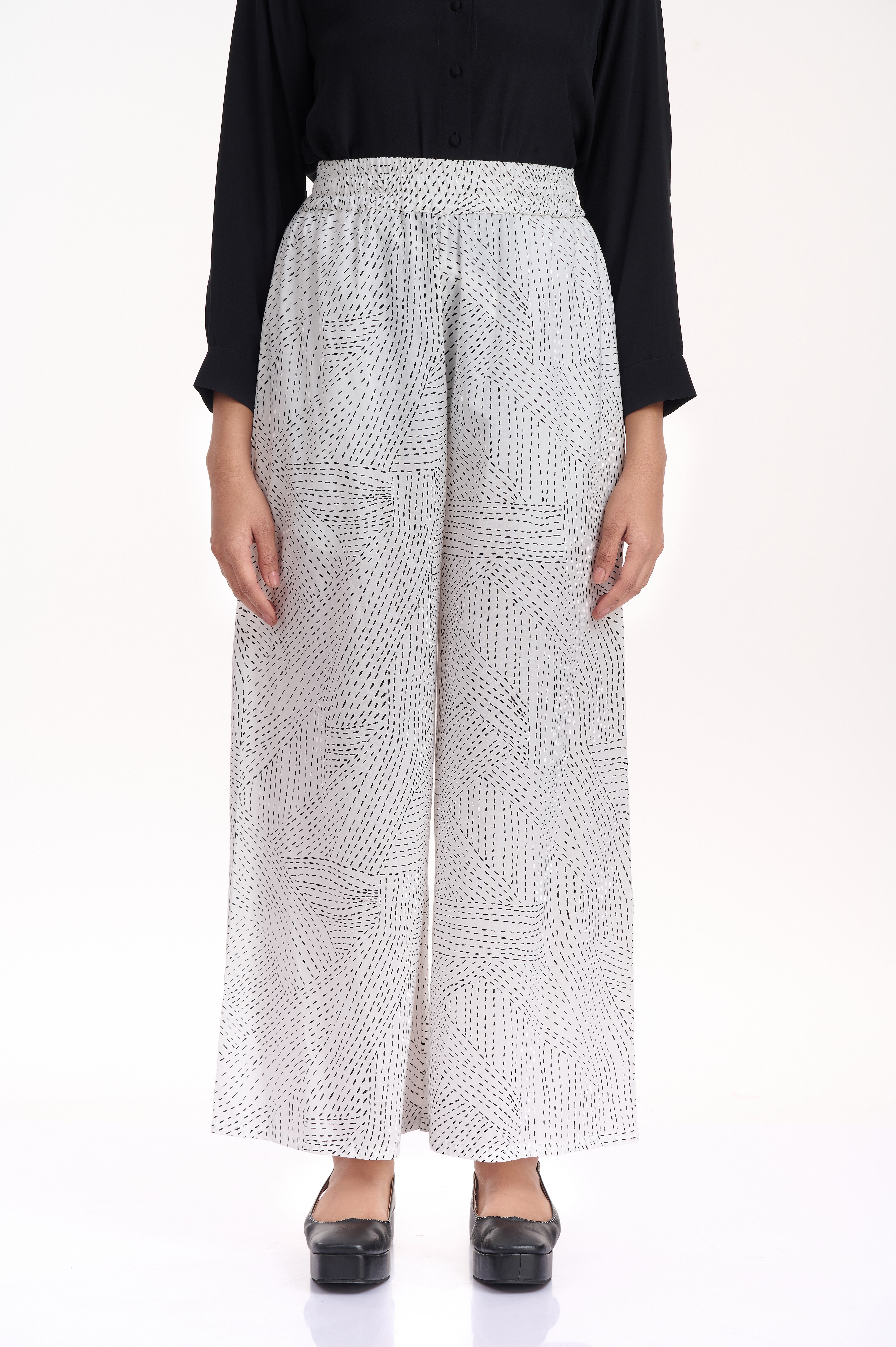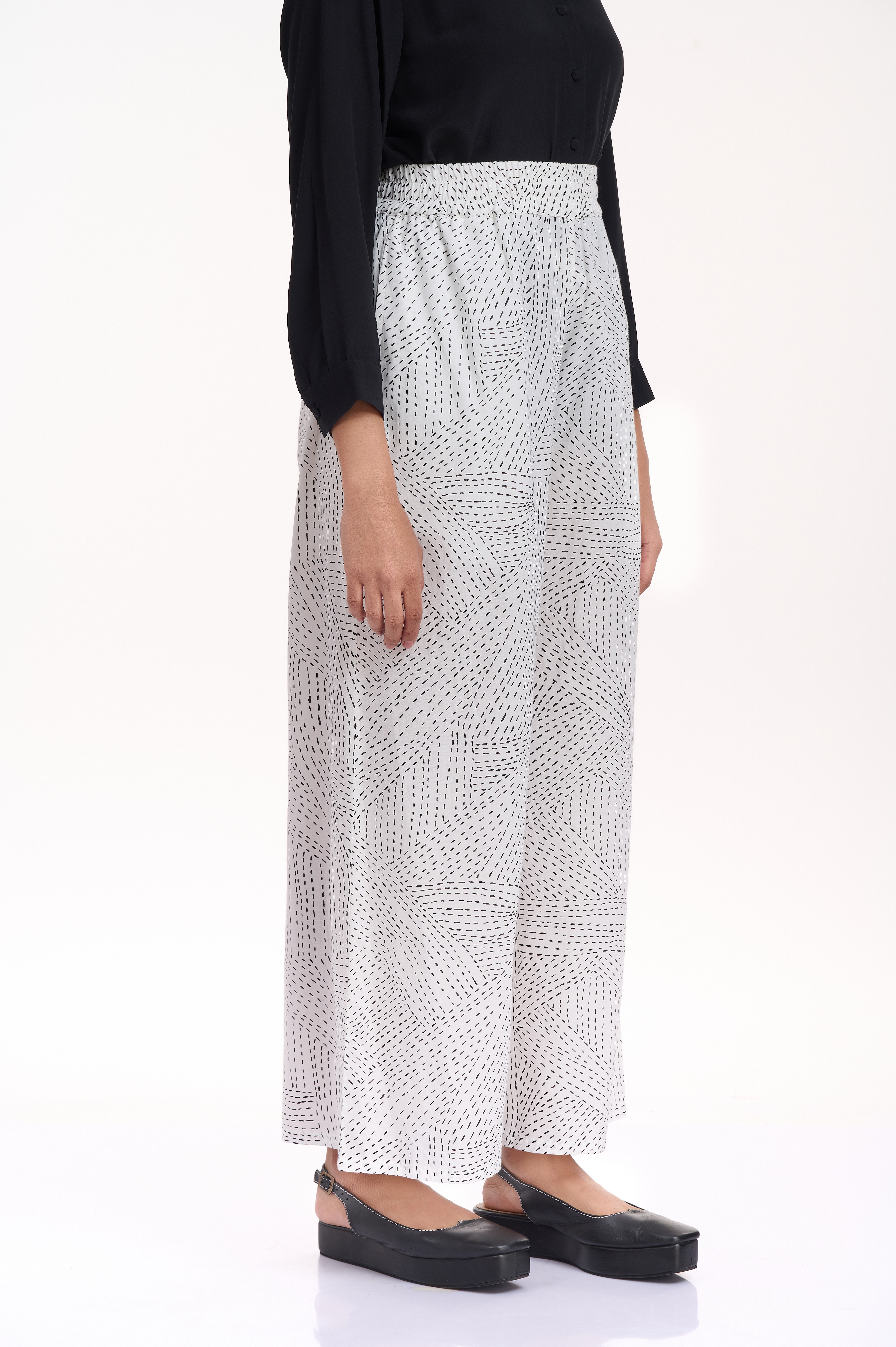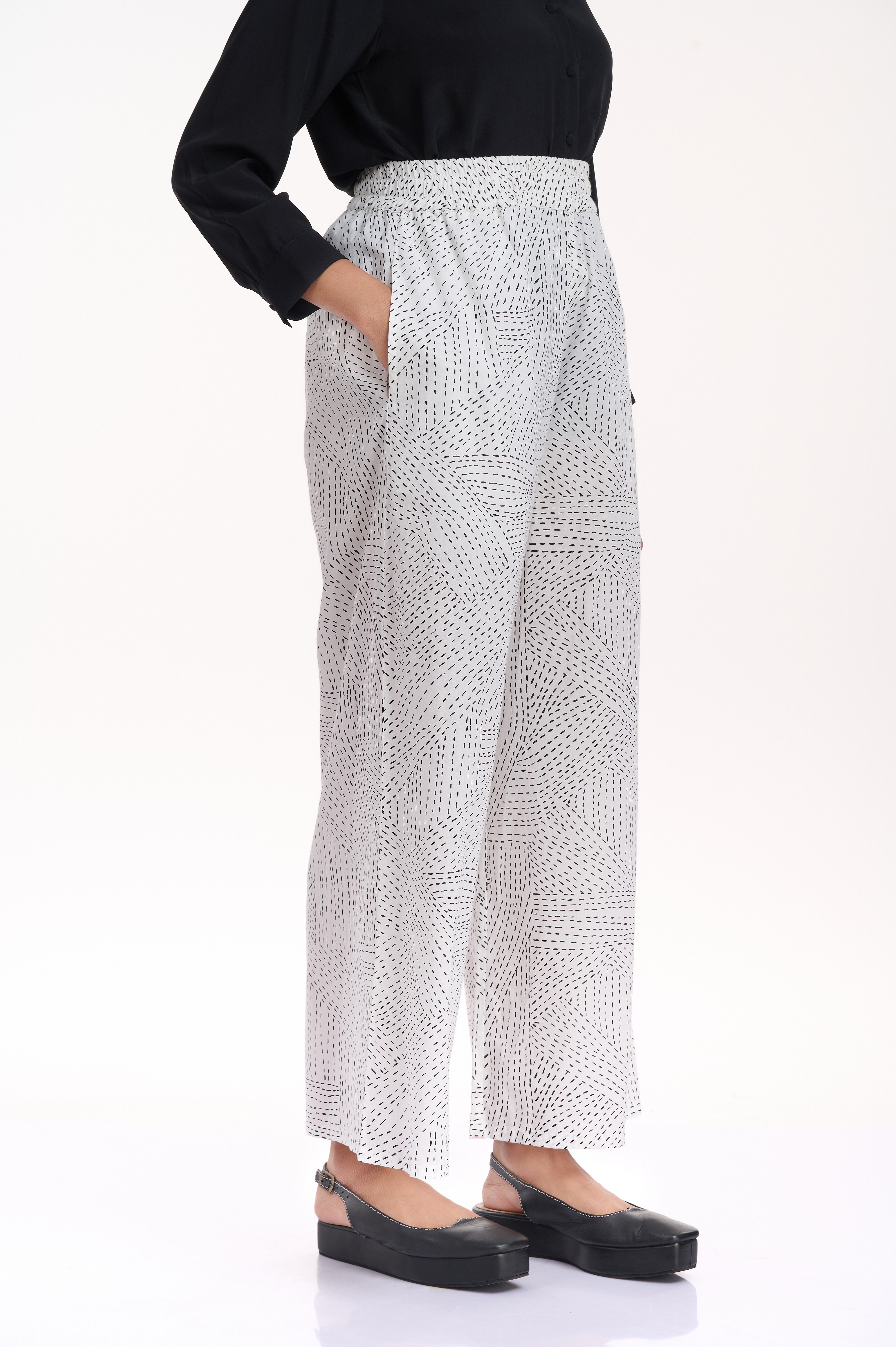 A relaxed and comfortable wide leg pants, with an elasticated waistband, cut in cotton, with an allover kantha print in black on white cotton. Added side seam pockets.