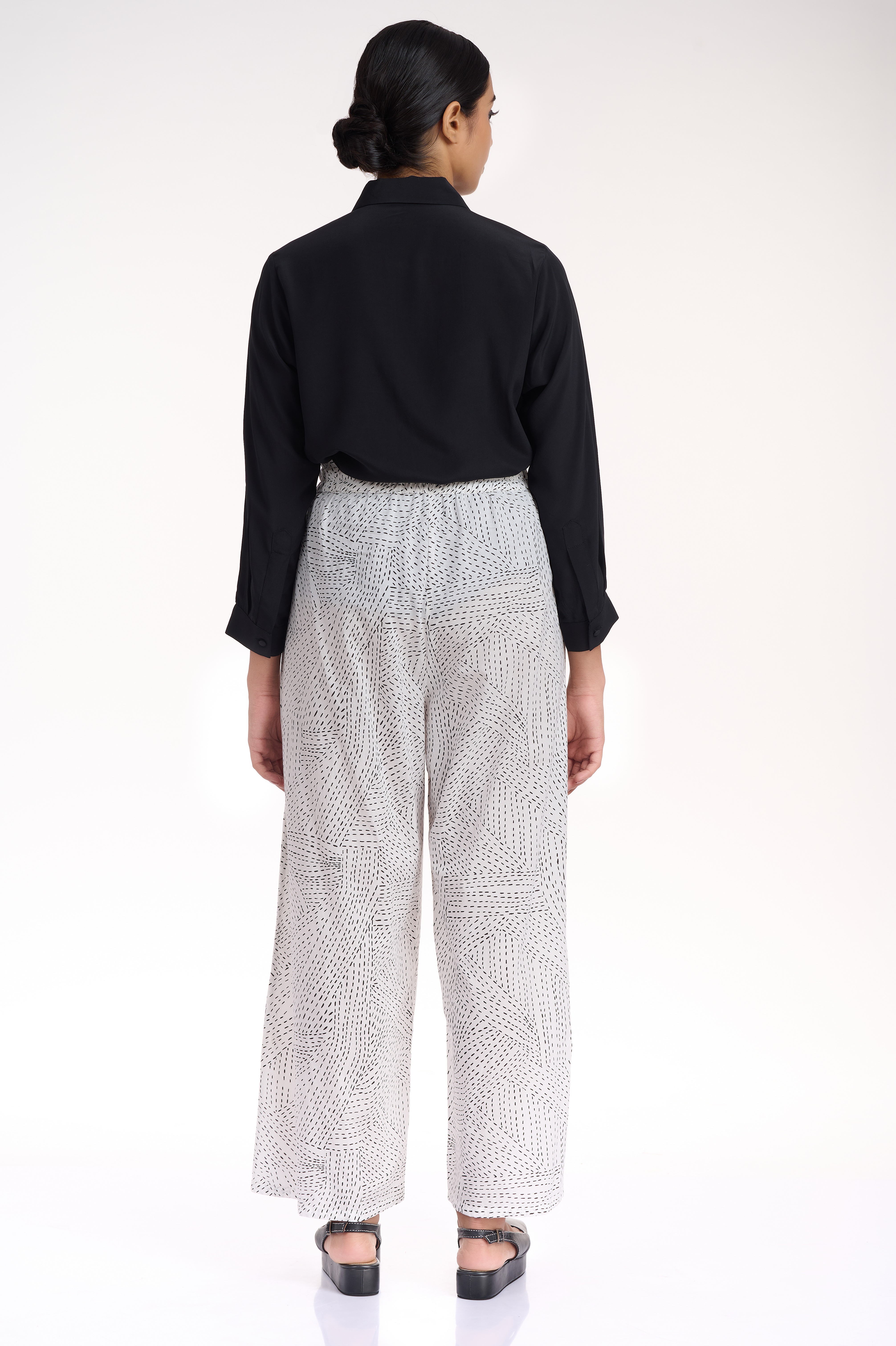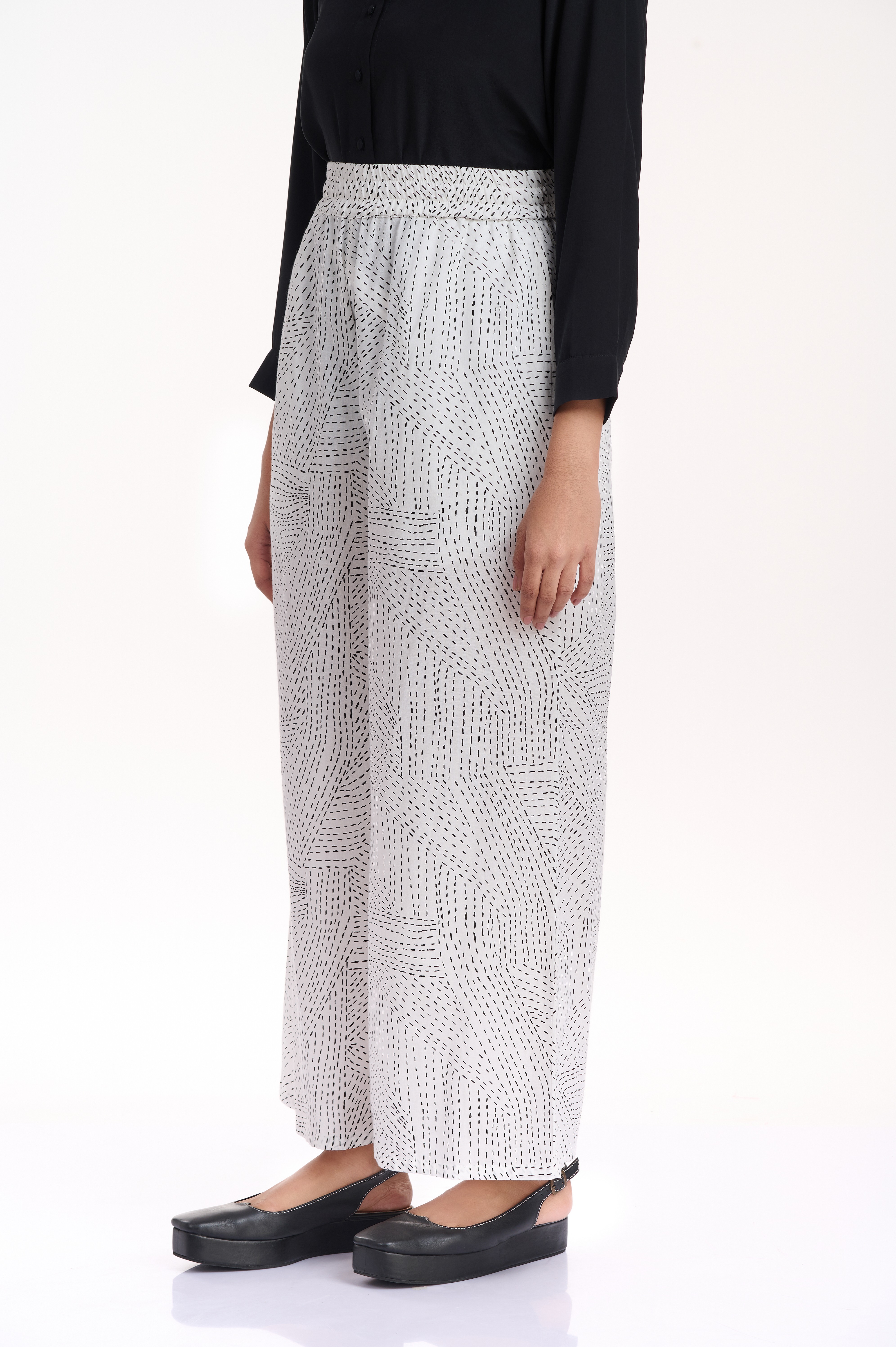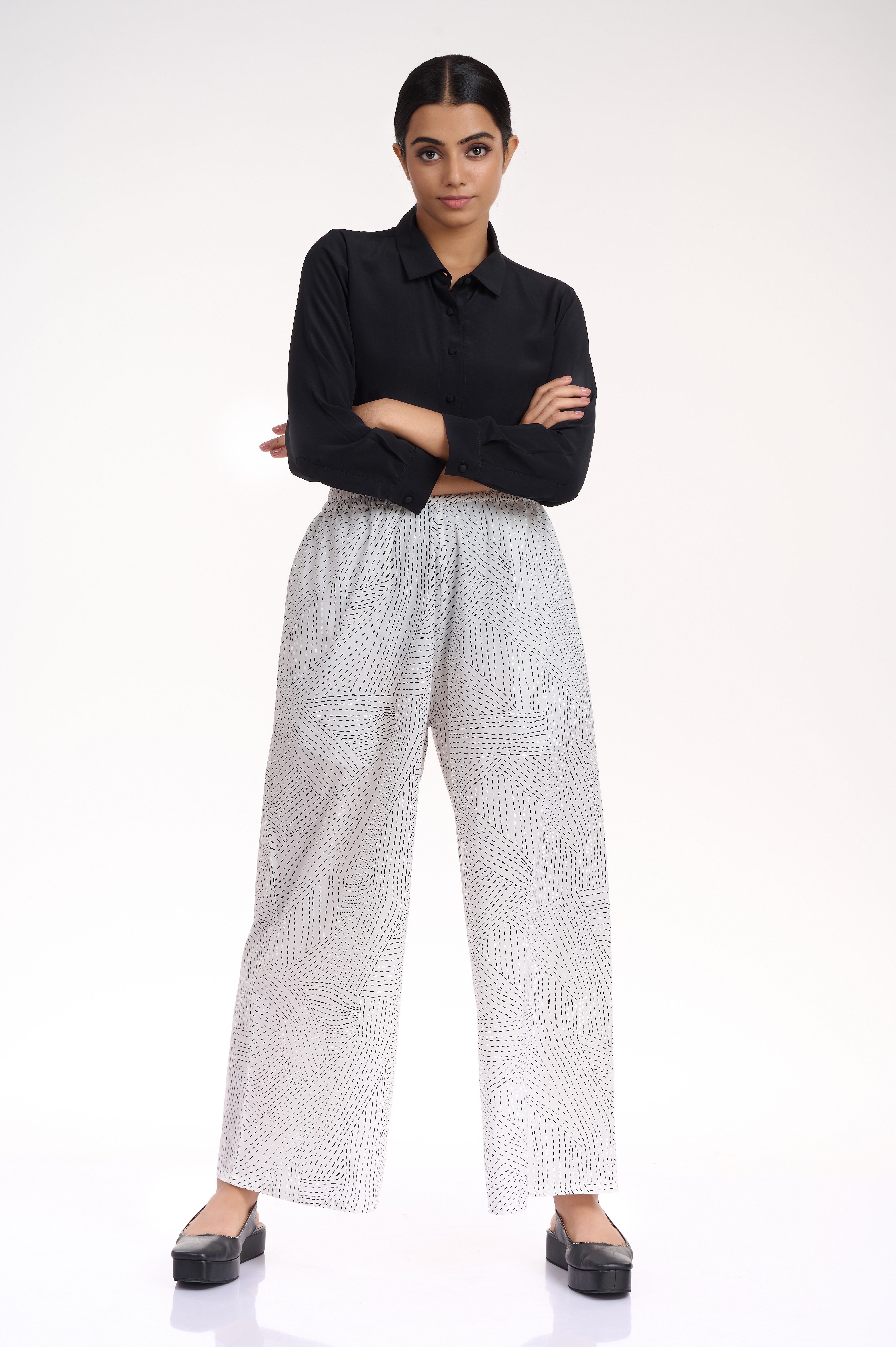A relaxed and comfortable wide leg pants, with an elasticated waistband, cut in cotton, with an allover kantha print in black on white cotton. Added side seam pockets.