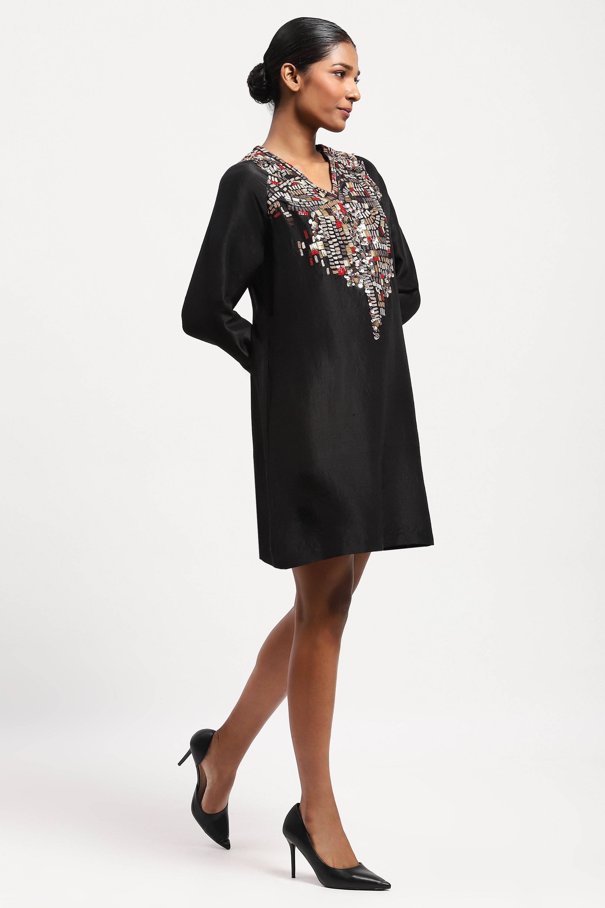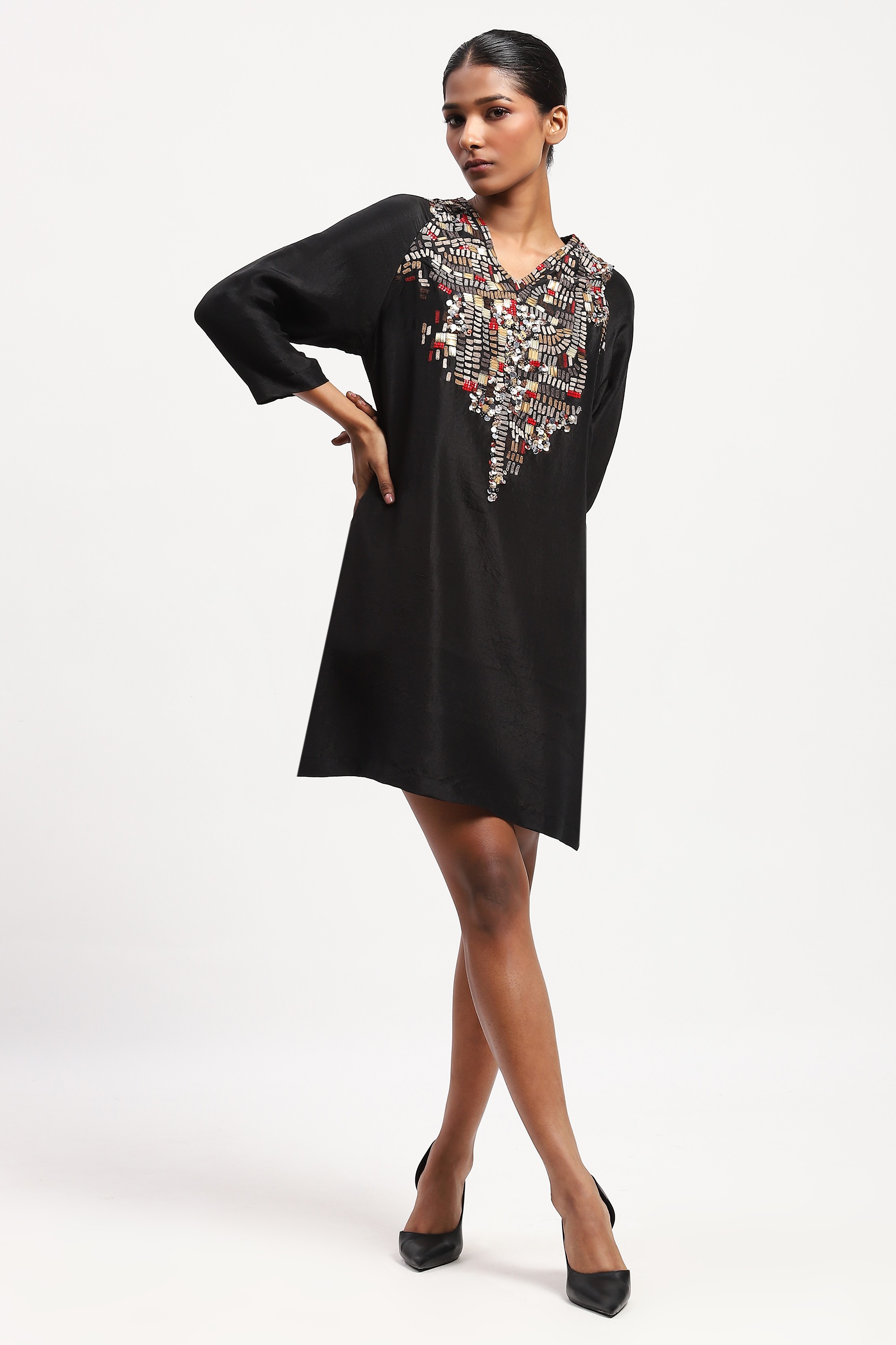 This limited edition piece has been made using pure silk shantung and embellished with mixed beading inspired from tribal patterns to create a rich mosaic of materials.