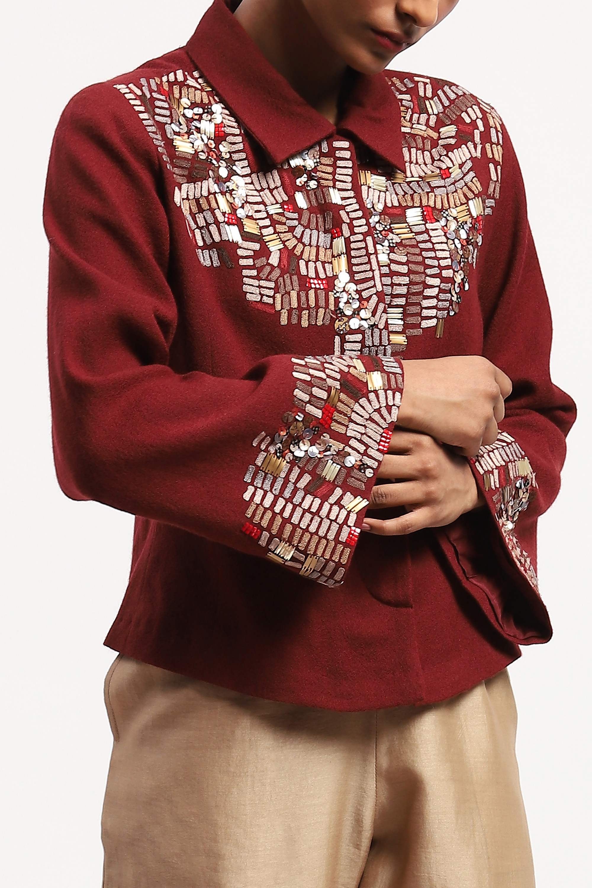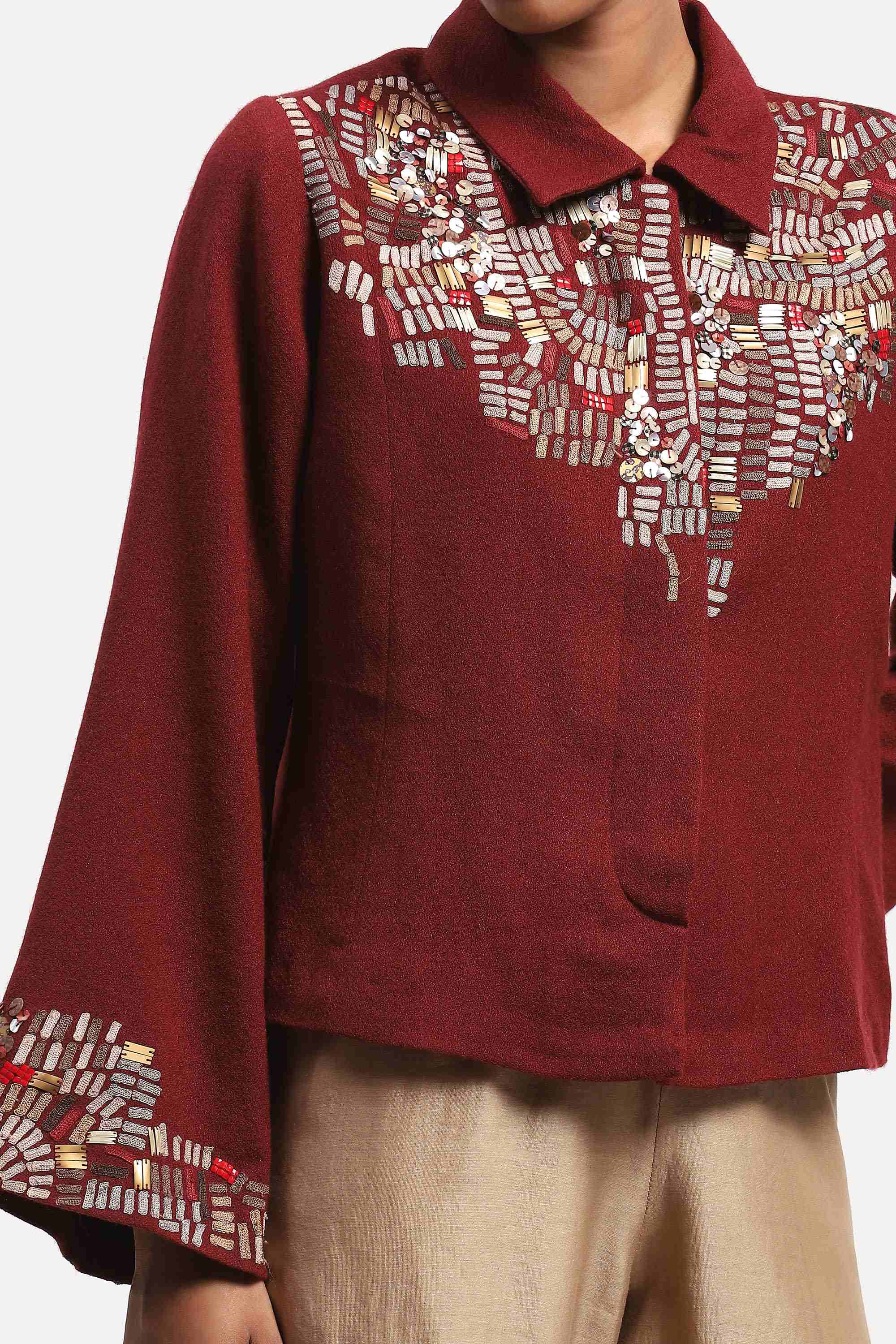 This limited edition piece has been made using crepe fabric and embellished with mixed beading inspired from tribal patterns to create a rich mosaic of materials.