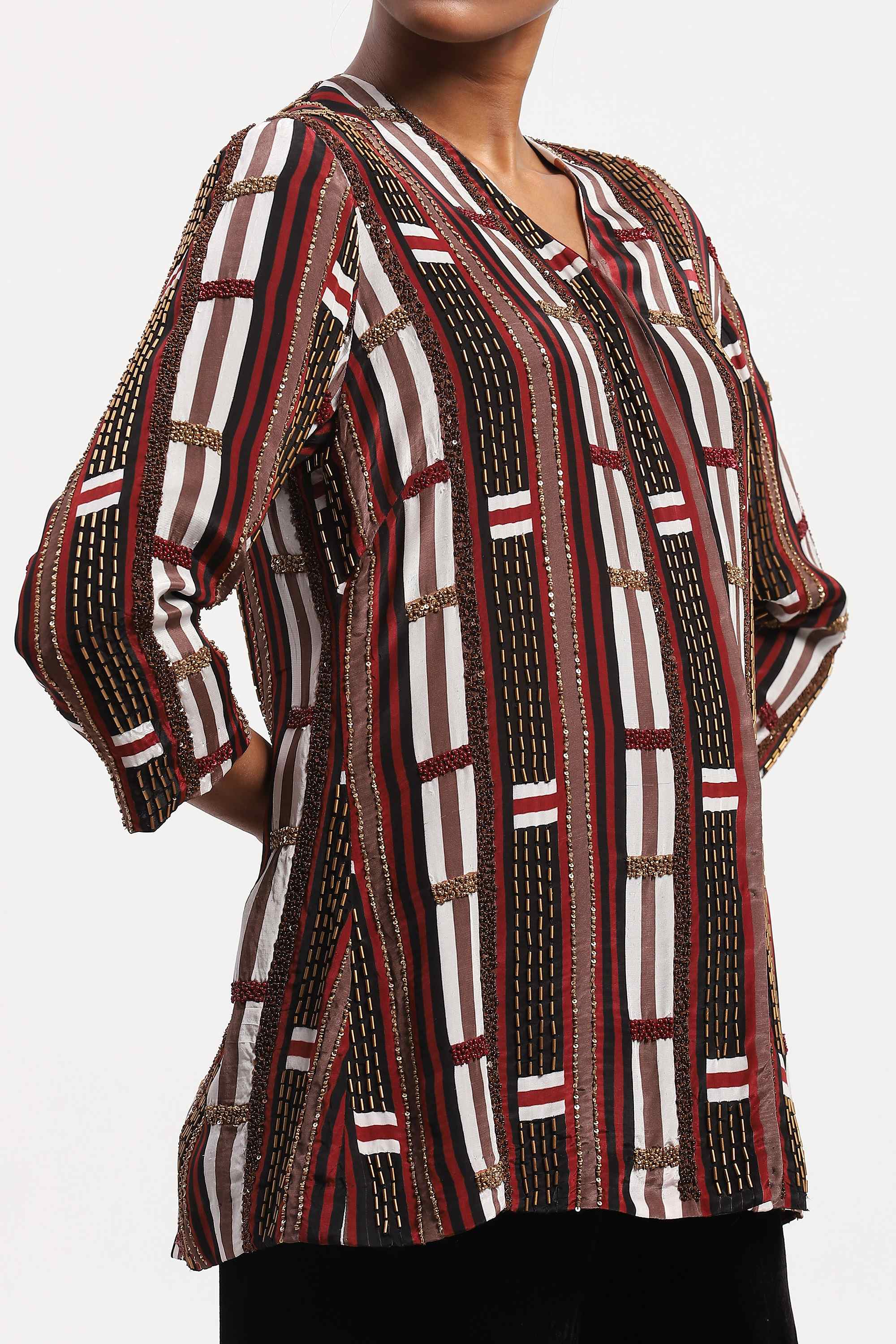 This limited edition piece has been made using a printed base inspired from the kente cloth of Africa and re-embroidered in areas with beads and sequins for subtle evening glamour.