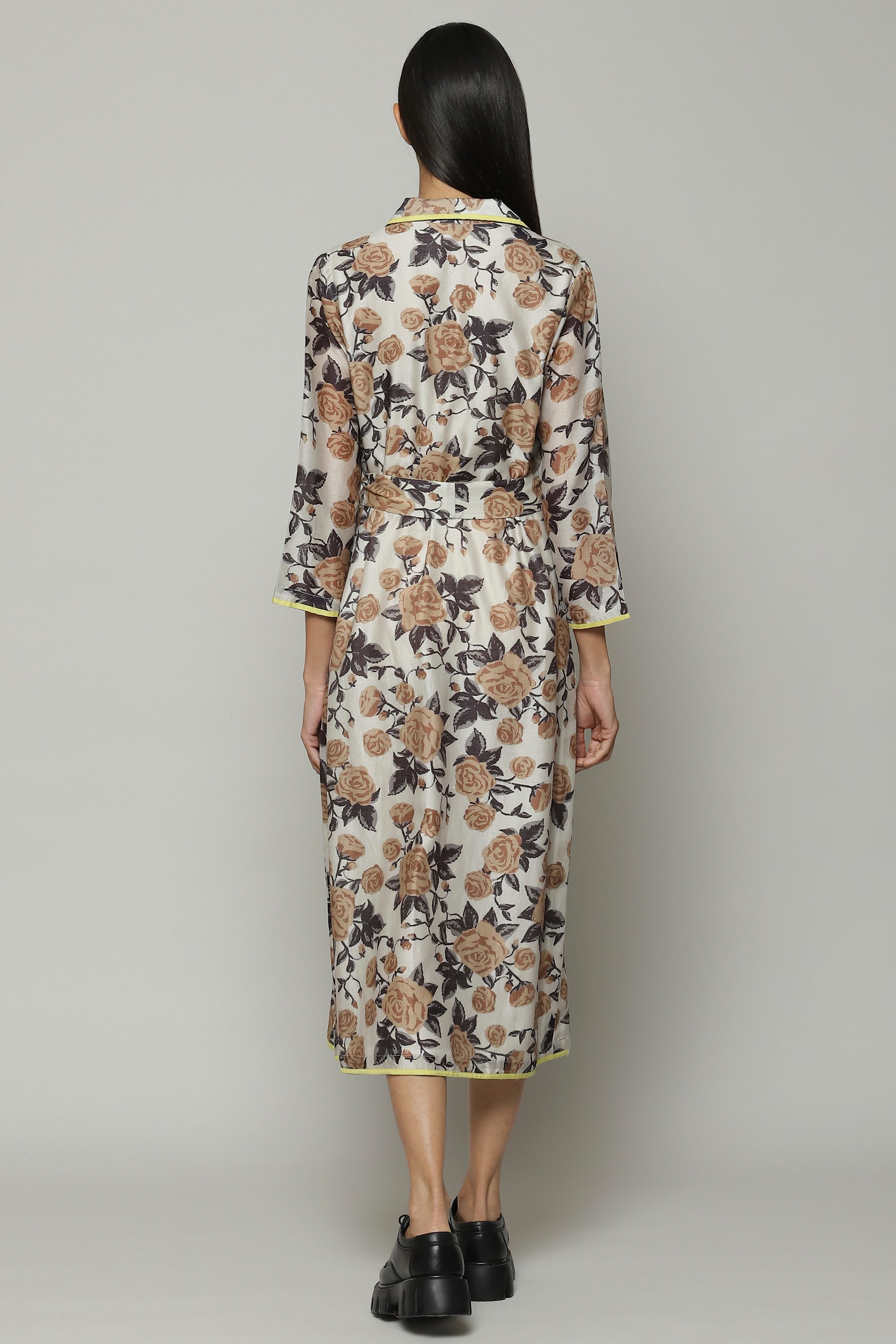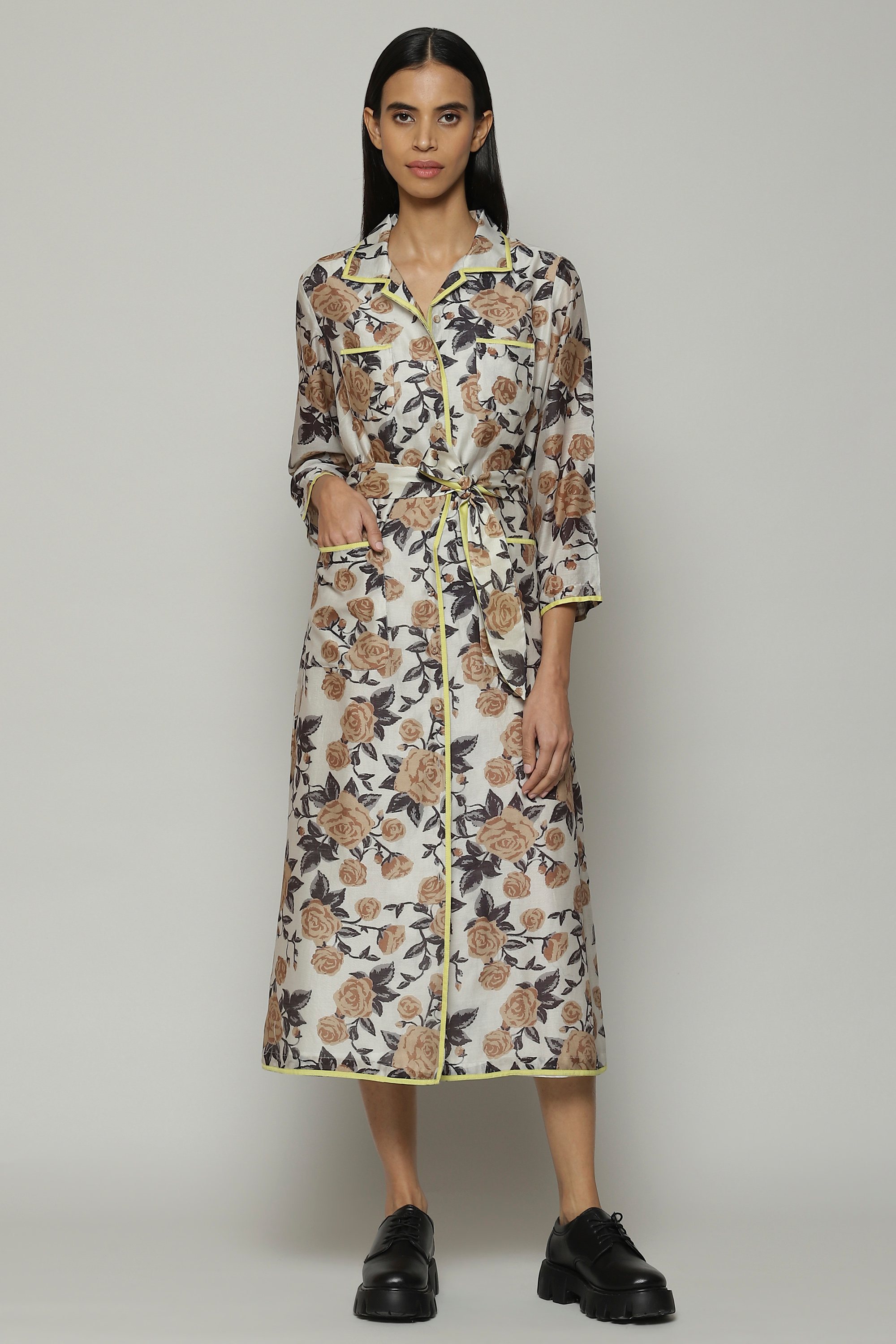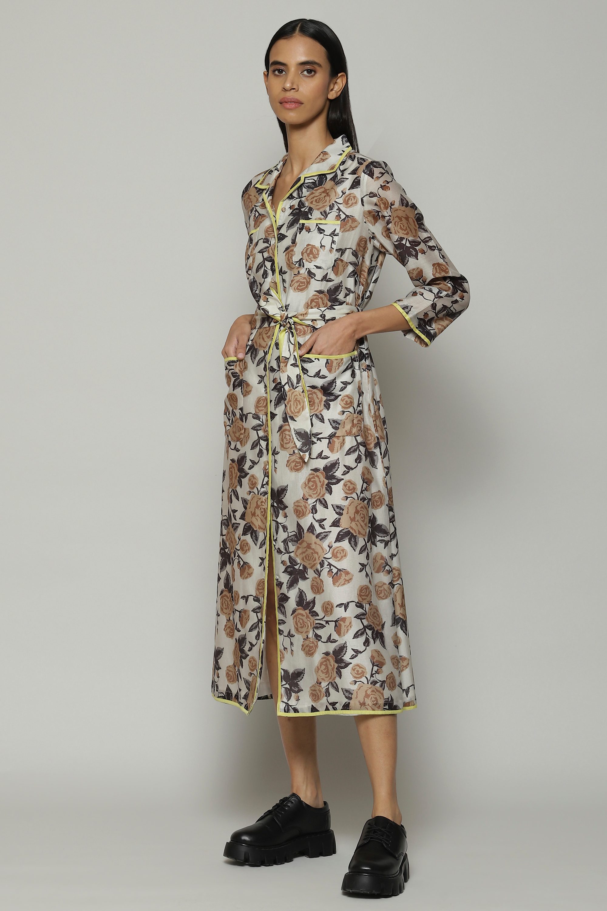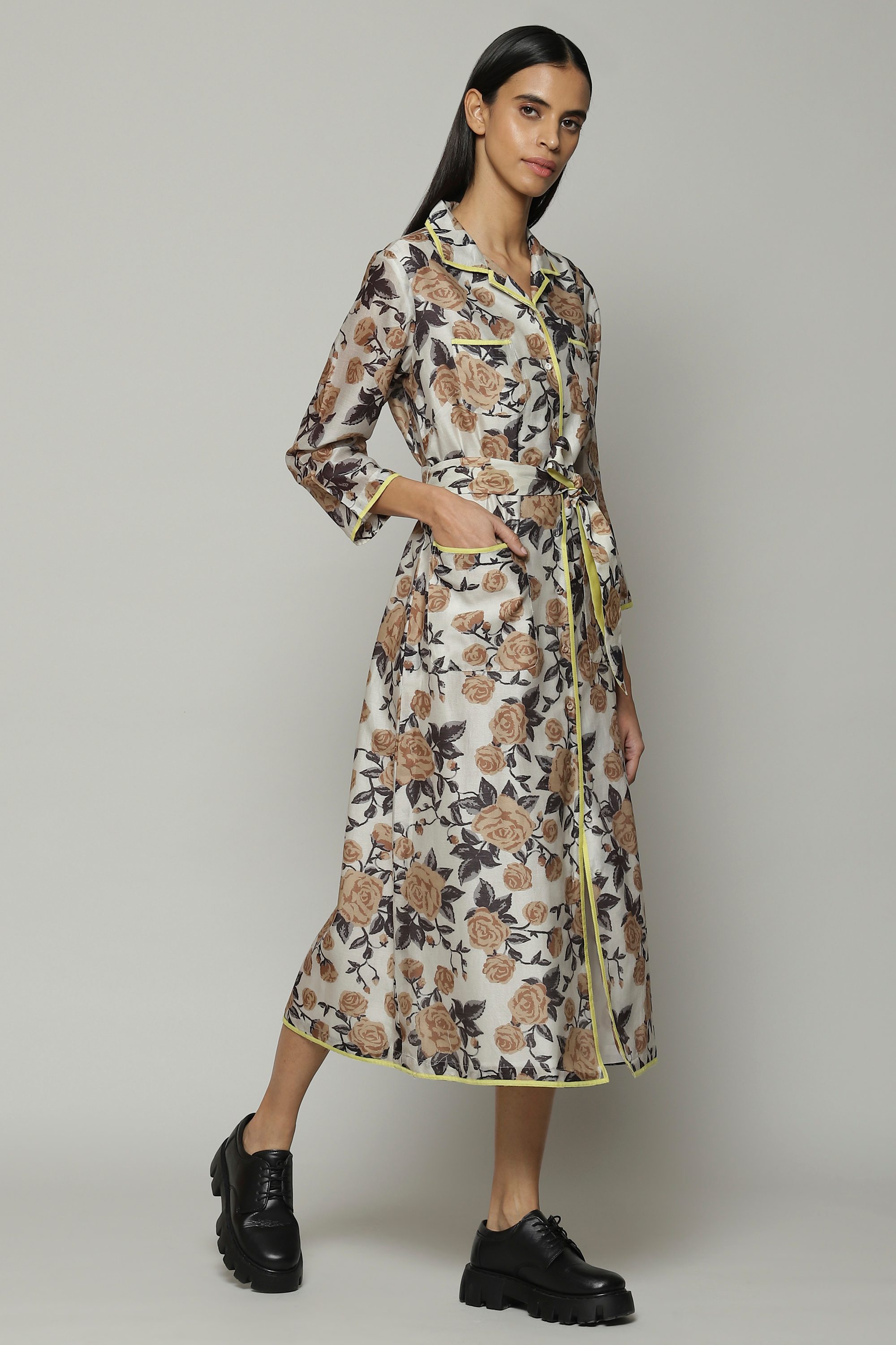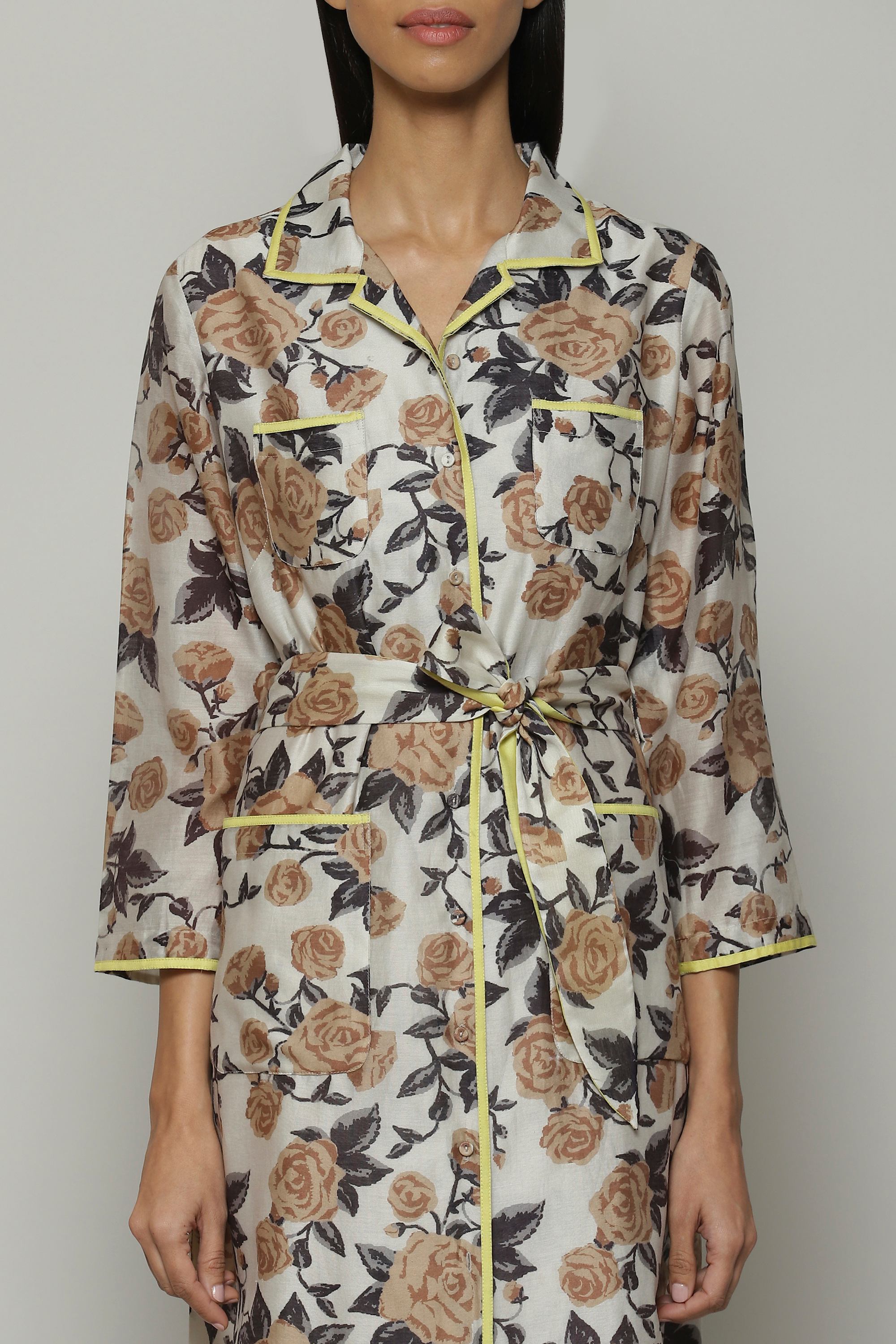 A bold and colorful shirt dress. Printed floral motifs bloom on this sheer chanderi fabric. A fine example of playful luxury, this piece can be styled on its own or worn as an outer layer.