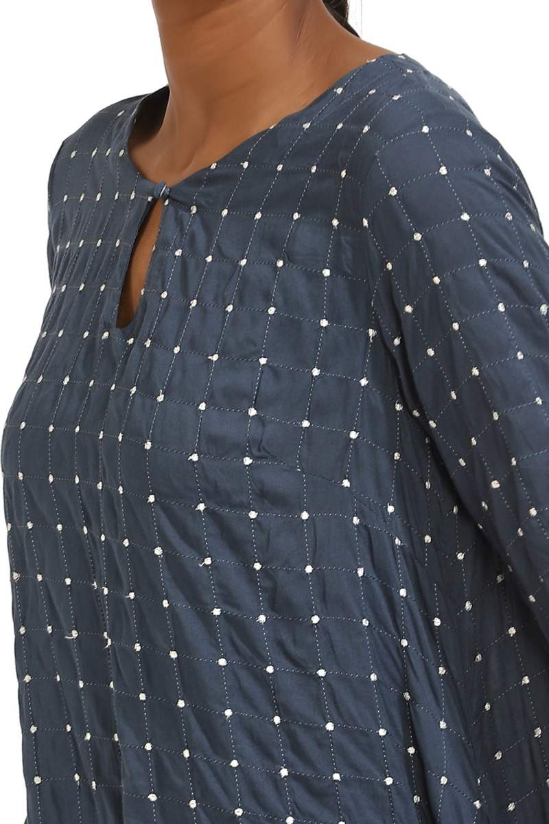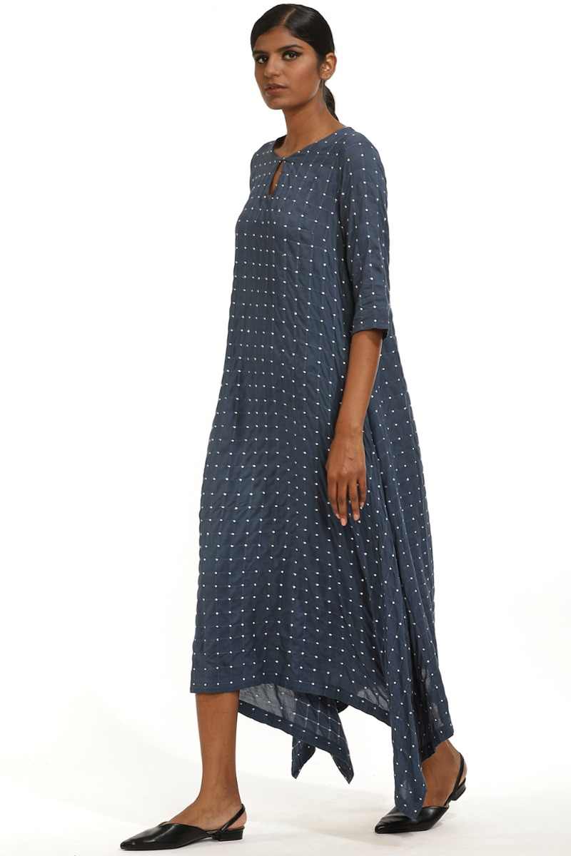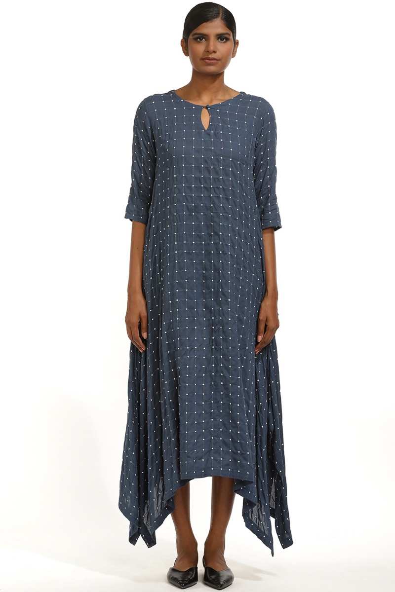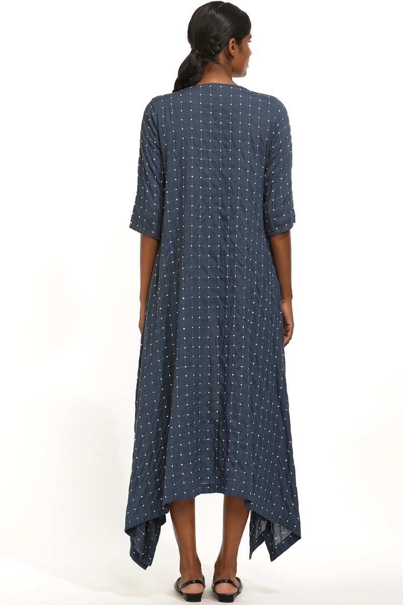 Indigo Sustainable Quilted Dot Kite Dress. Cut From Viscose With Quilted Dot Checks.