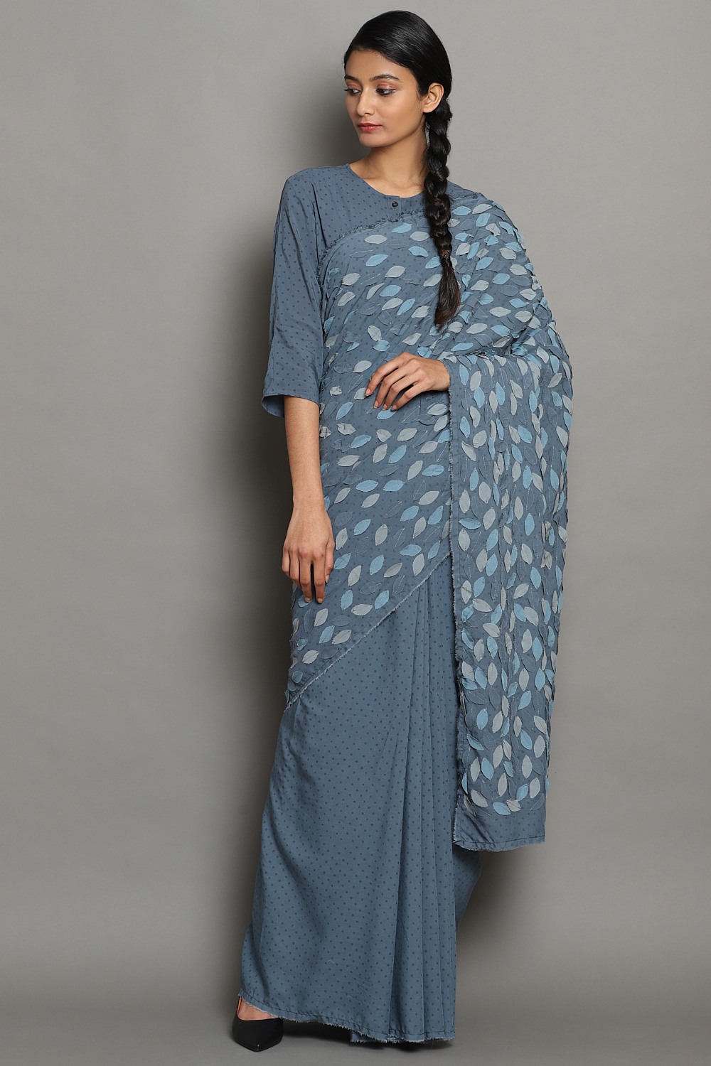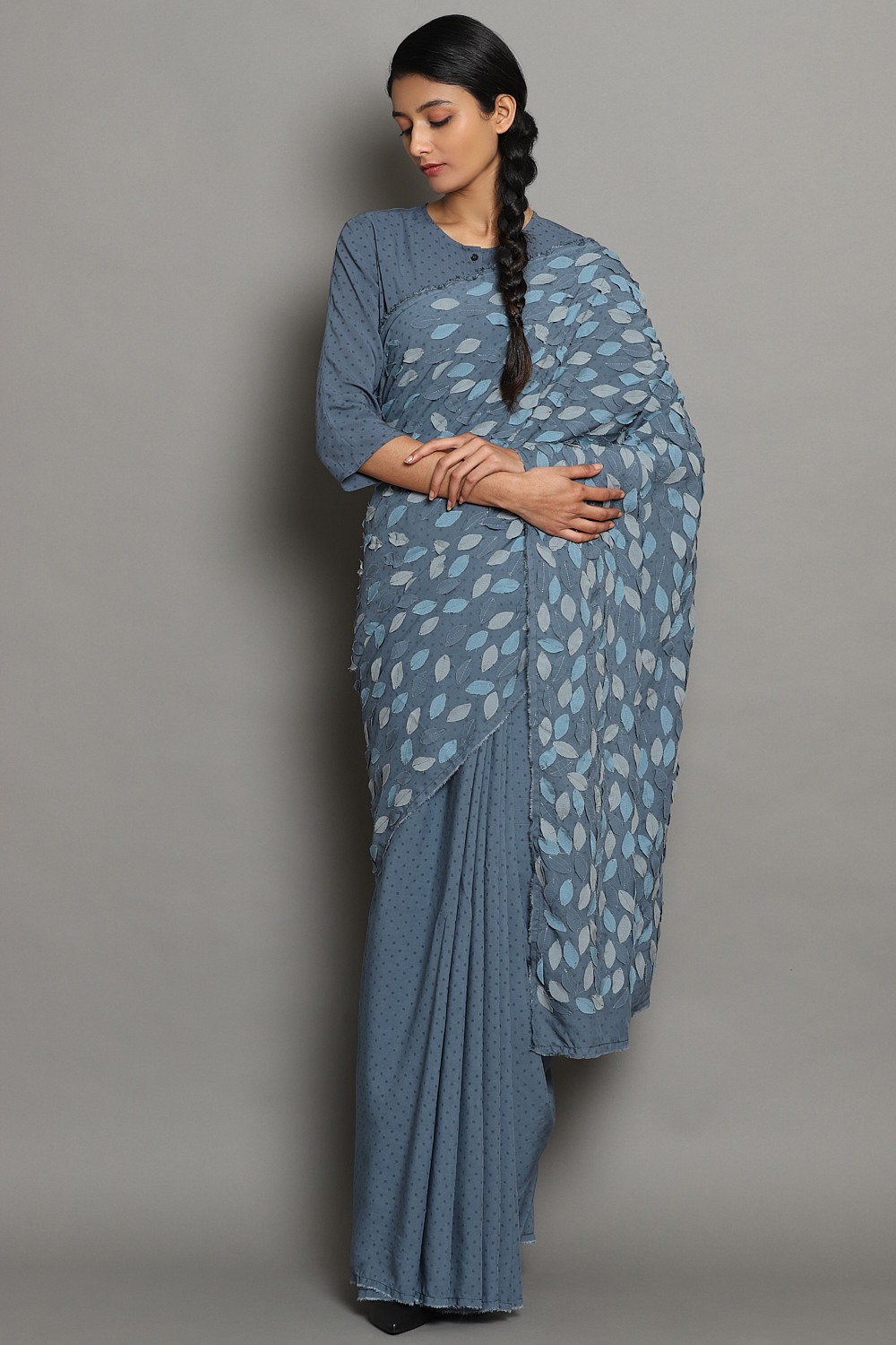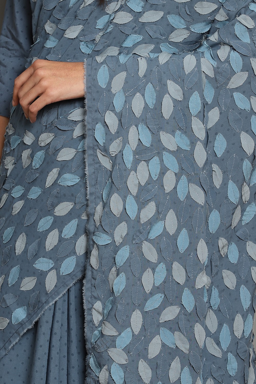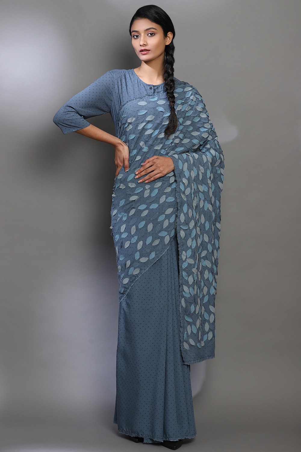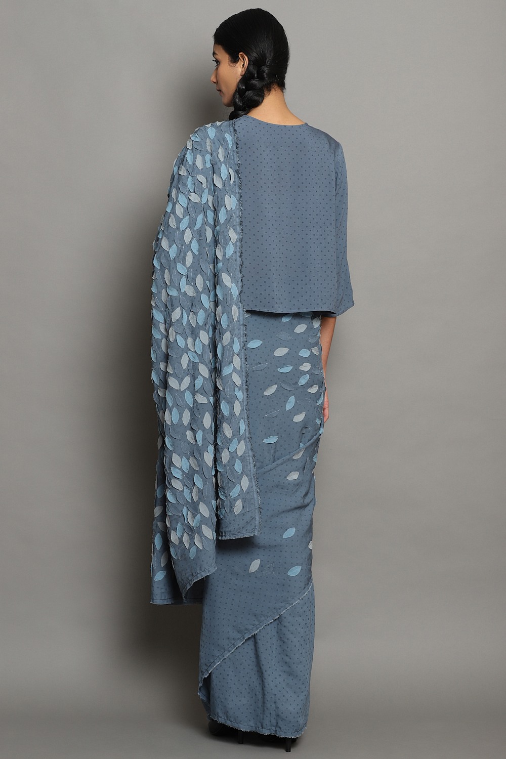 Hand Block Printed Fine Dots On Cornflower With Leaf Applique In An Engineered Layout. Our Leaf Applique Saree Is From Limited Catwalk Collection Showcased In August 2019 At Lakme Fashion Week In Mumbai. This Saree Is Exclusively Handcrafted Using An Cellulose Blend, Sustainable And Renewableâ Fabric, With Hand Appliqued Leaves.