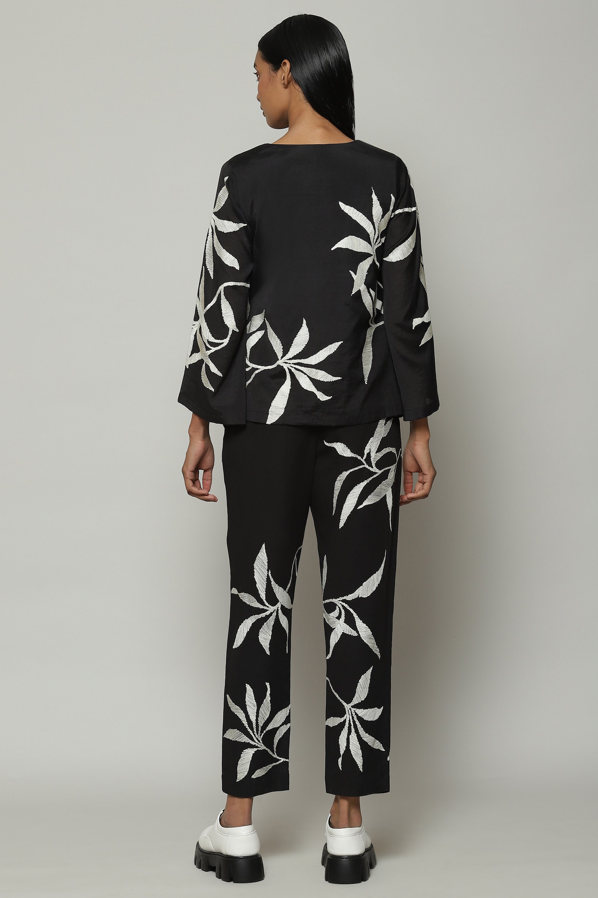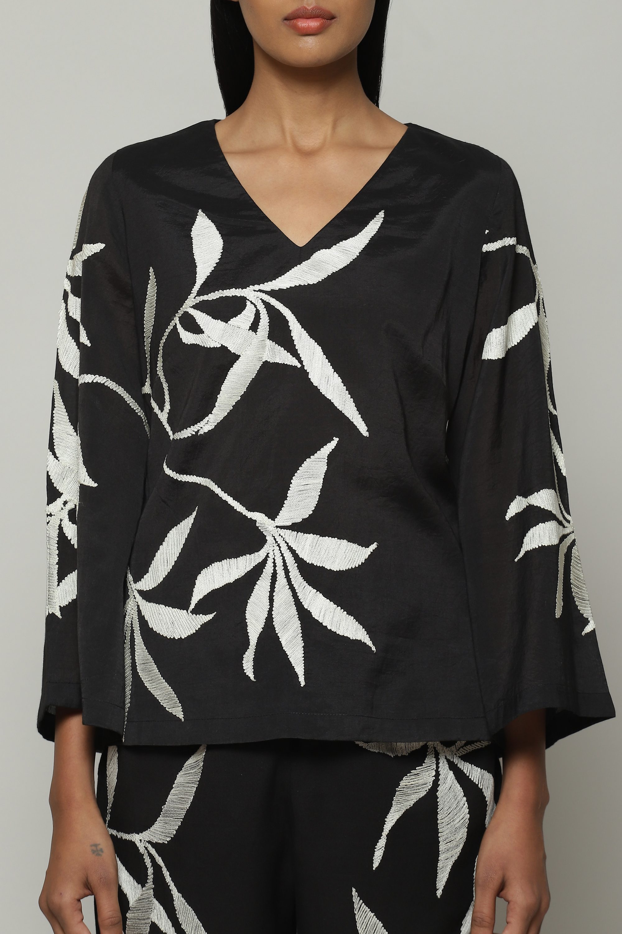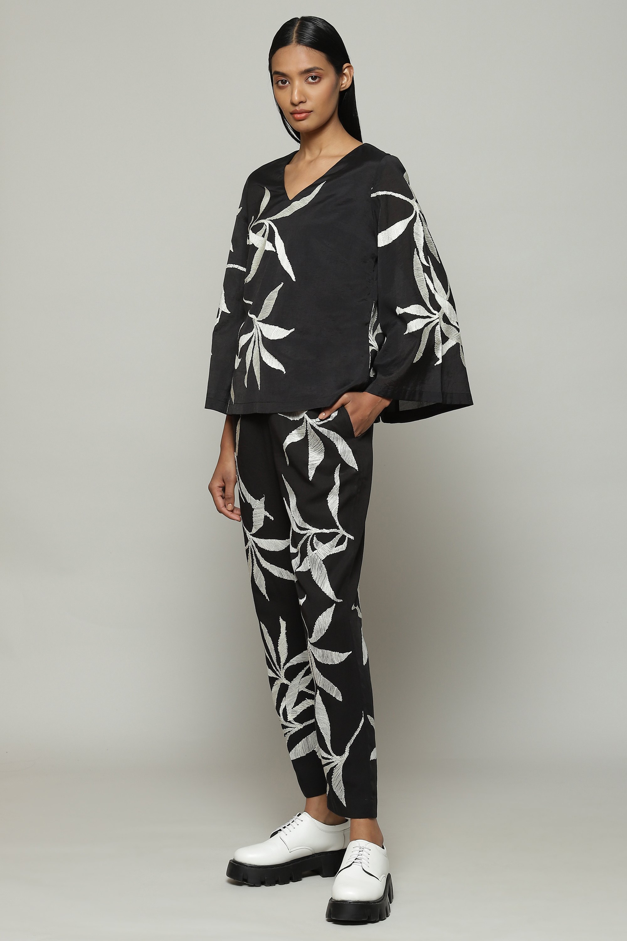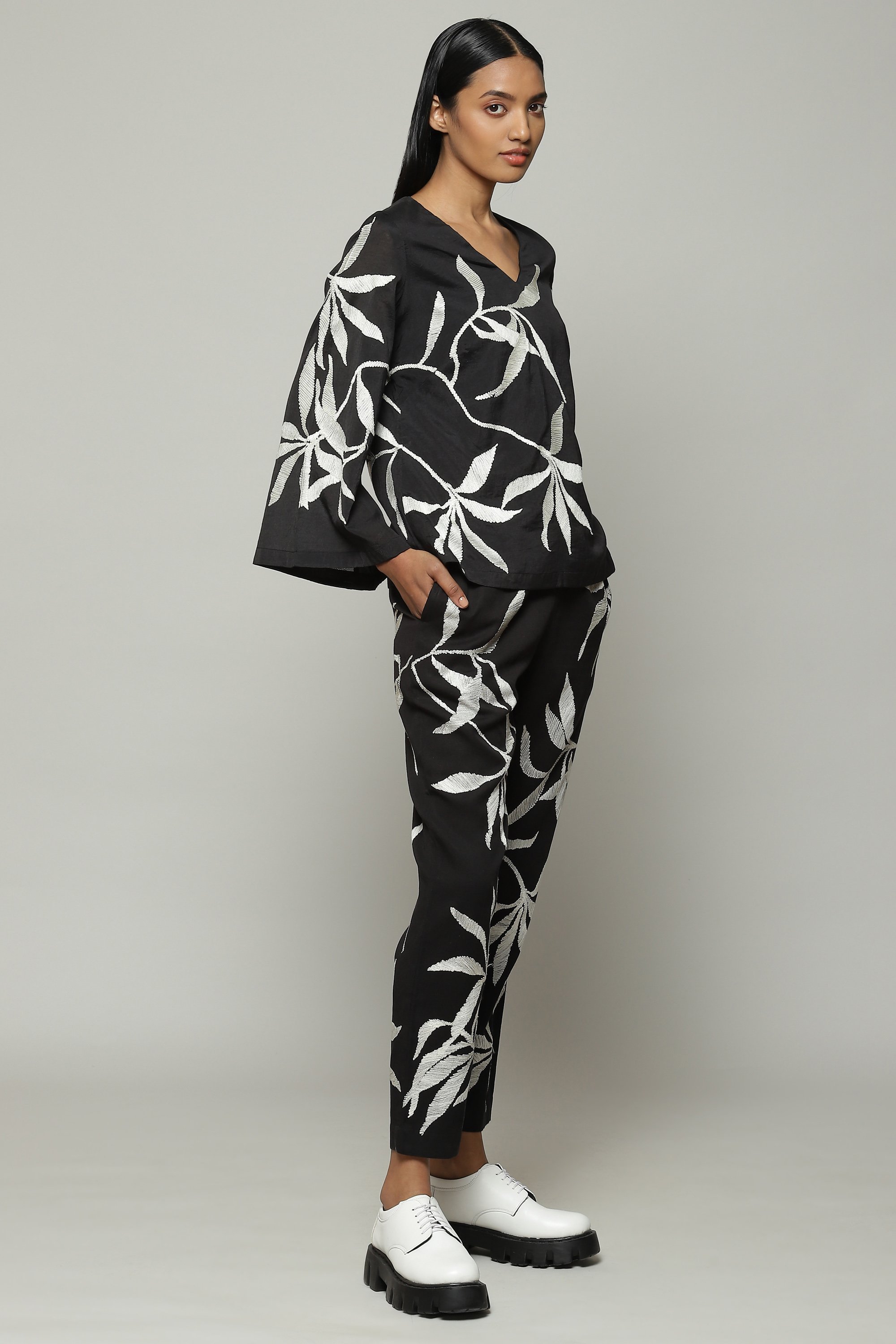A zen top, featuring the thousand year old art of crewel embroidery. Black and white, this piece embodies the brand's DNA. Goes with a variety of tops, especially the matching co-ord bottoms.