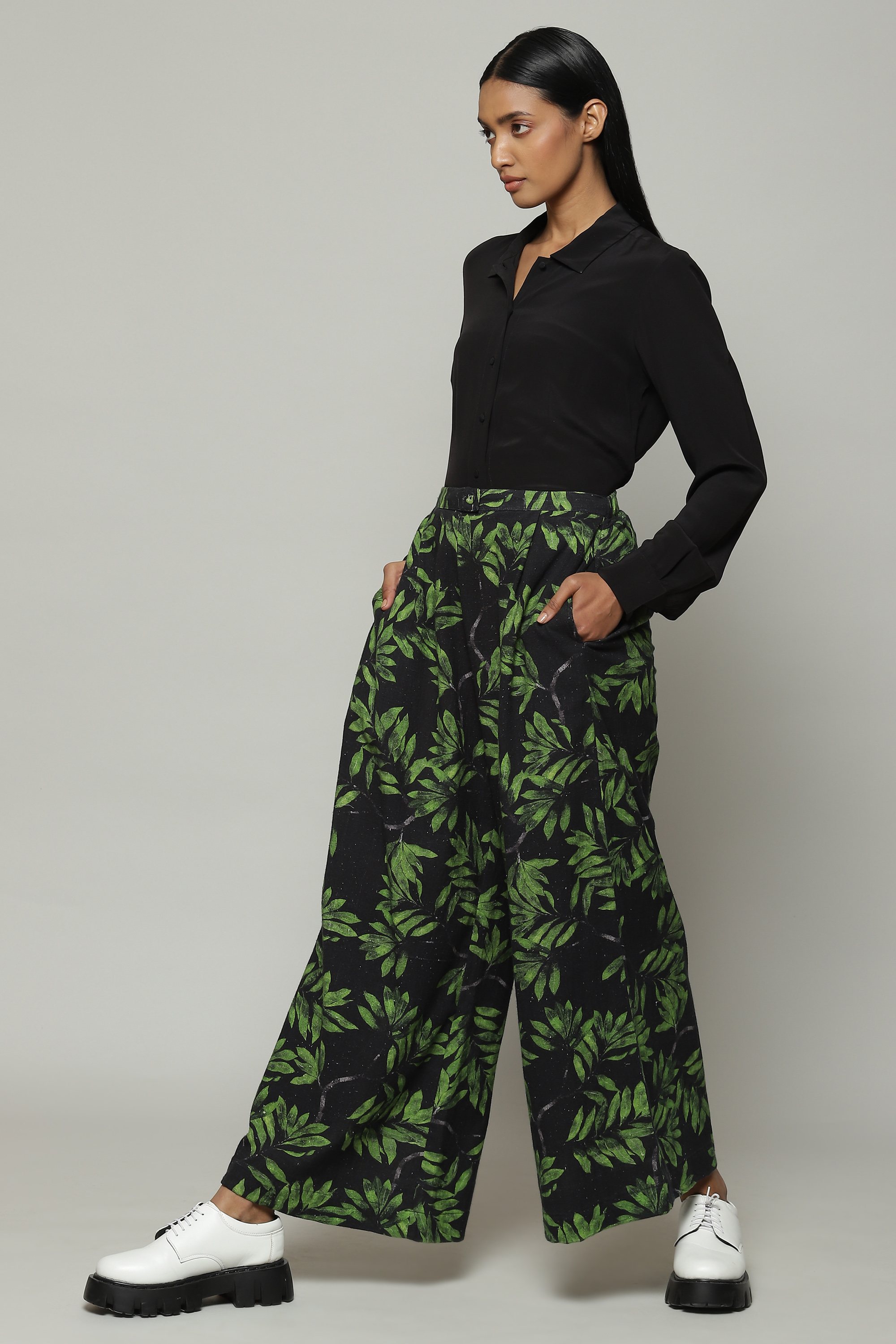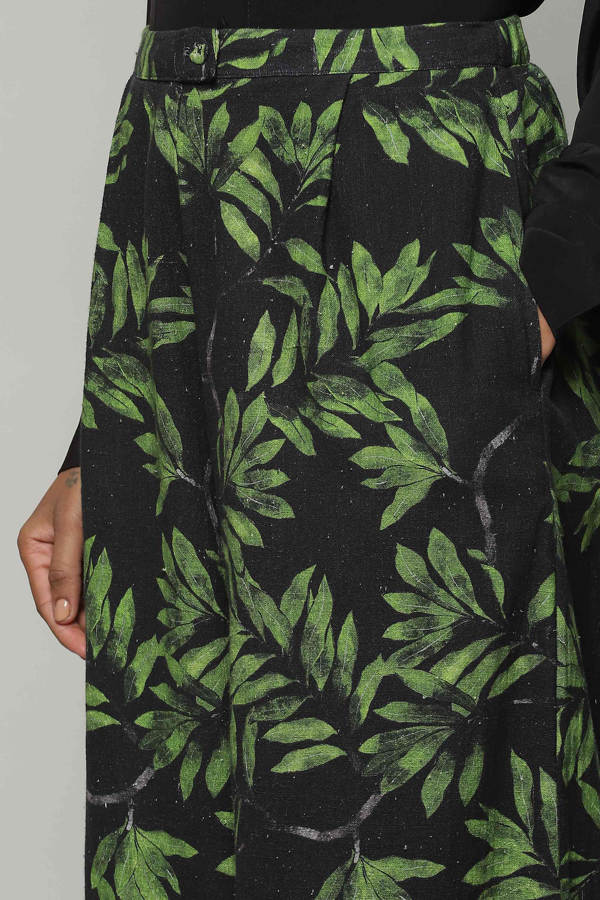 Leaf-printed pants that mimic the wondrous undergrowth of the forest. Crafted in a delicate cotton, that plays with what we call the 'spike of life' -- a leaf motif. Perfect for a spring celebration.