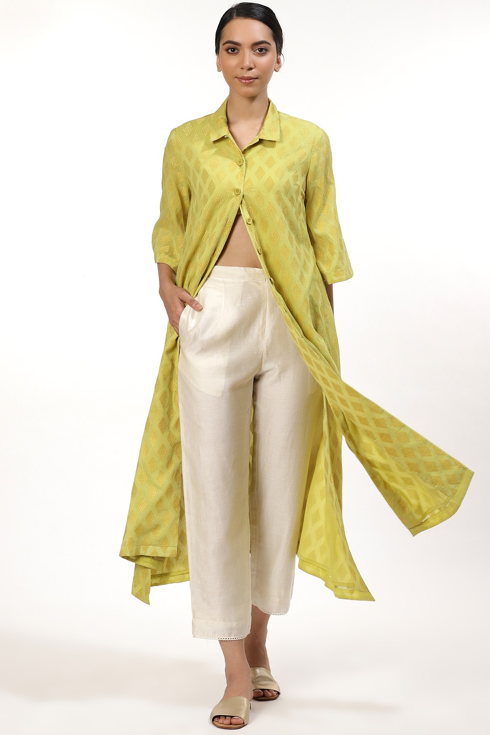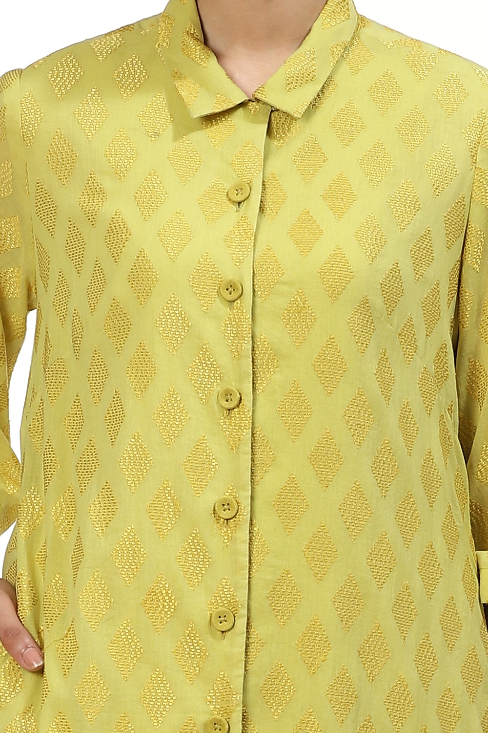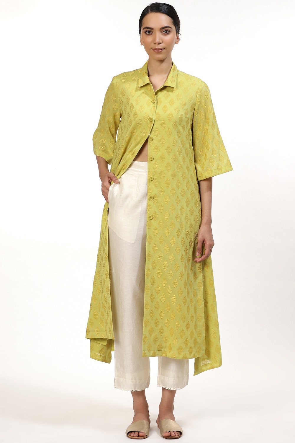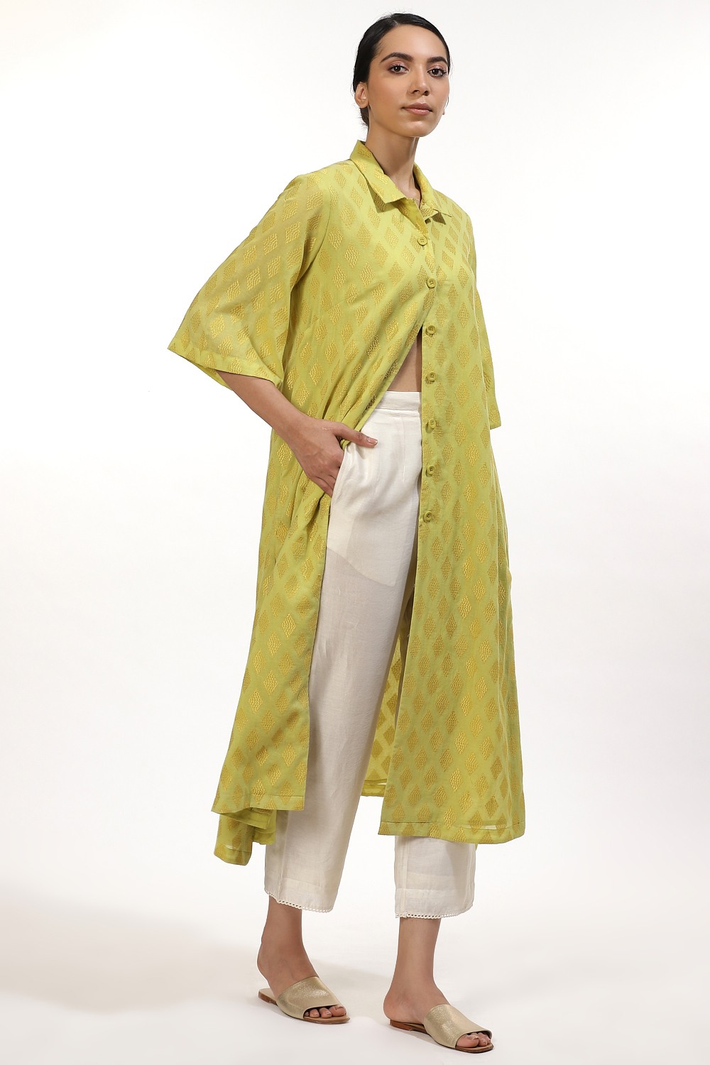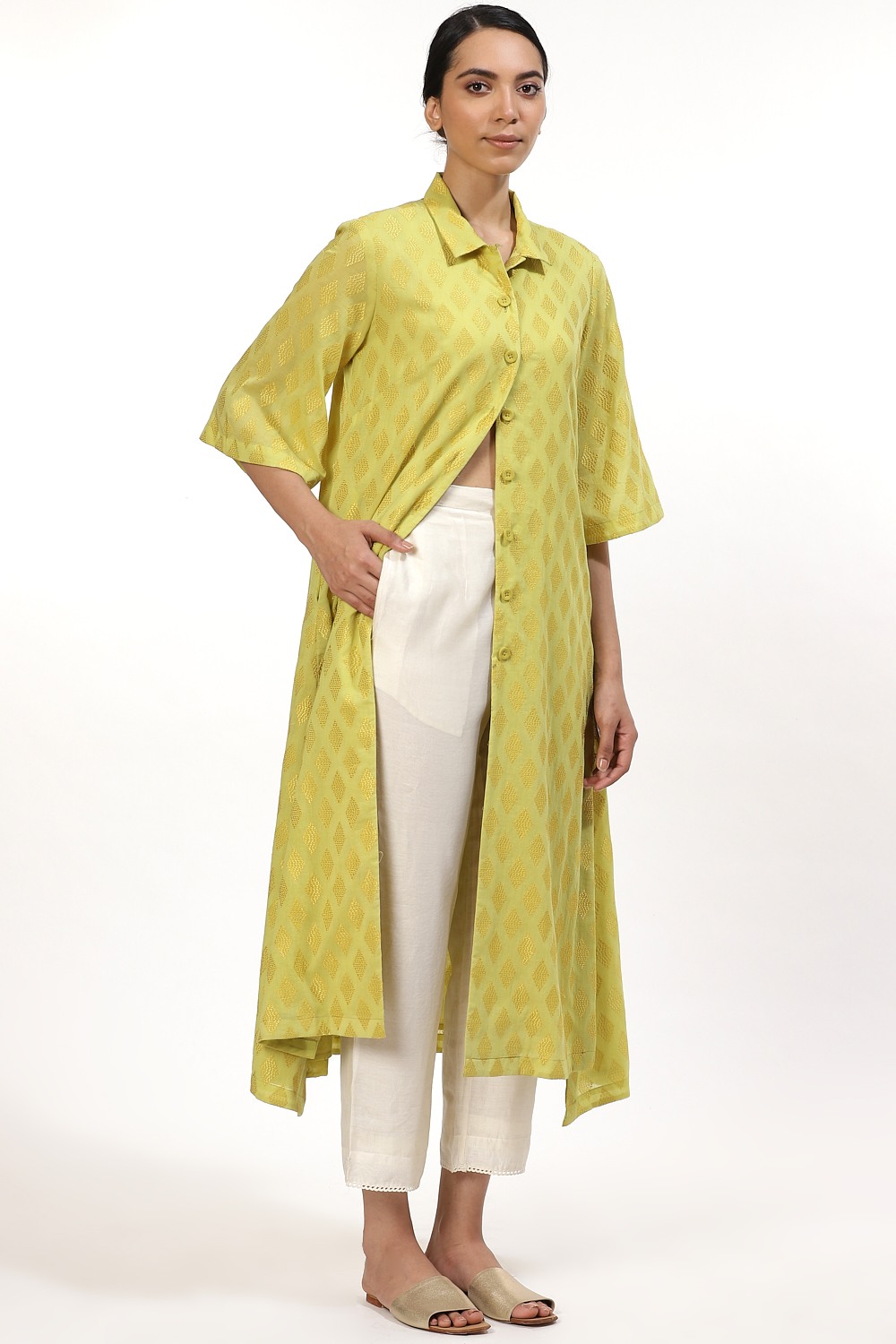 The Tonal Allover Diamond Embroidery In Lime And Yellow, Crafted From Cotton Voile, Has Slits To Accentuate The Loose Fit. The Dress Falls To A Midi Length. Style Yours With Straight Cropped Pants And Slides. Wear It To A Business Meeting Or To The Movies.
