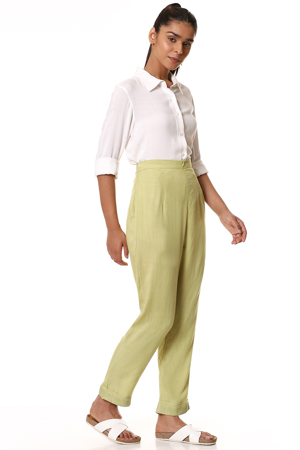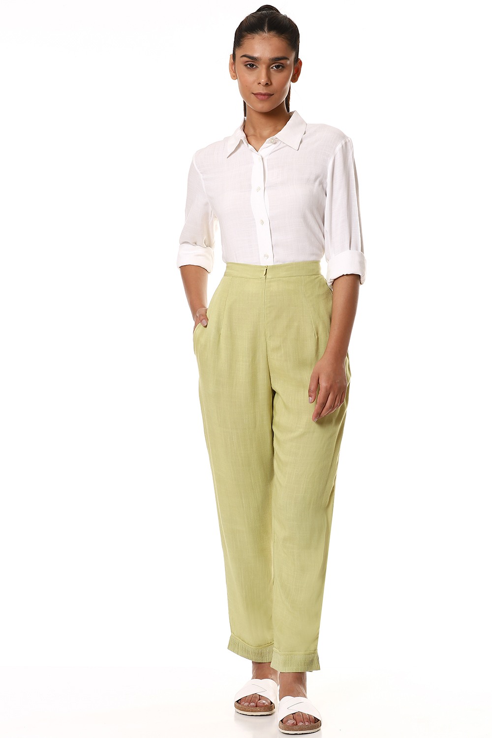An all time favourite pair of straight pants in lime, cut from soft ecovero fabric, added soft elastic waistband for an easy and comfortable fit which works great for all body types. detailed with fine pintucks and raw edge on the bottom and Pockets on the side seams. Specially crafted for your everyday clothing needs.