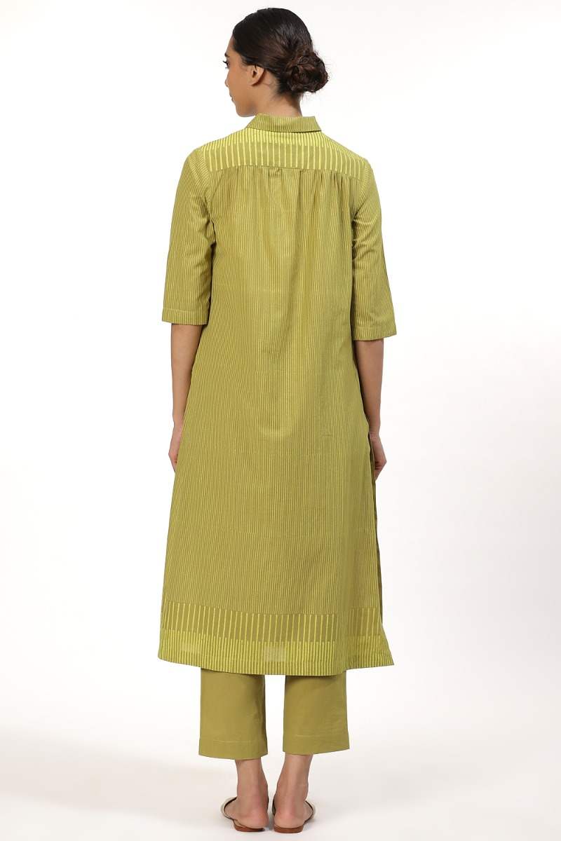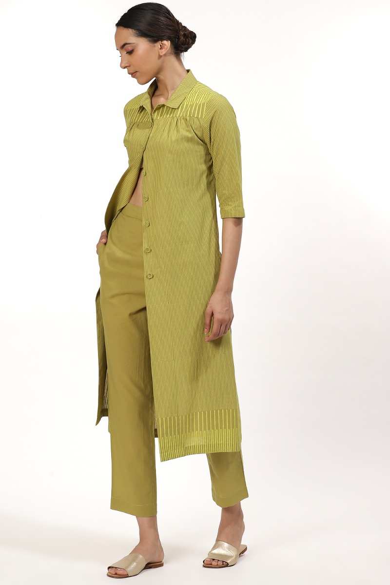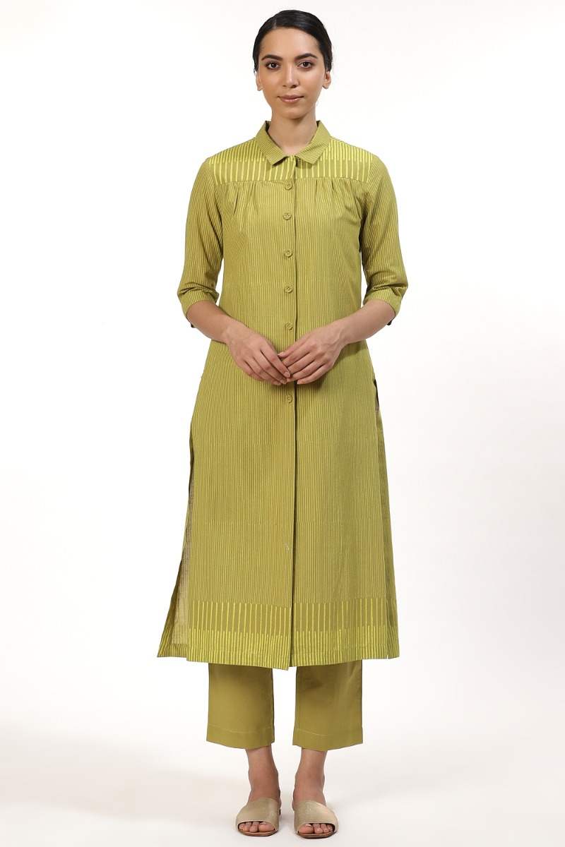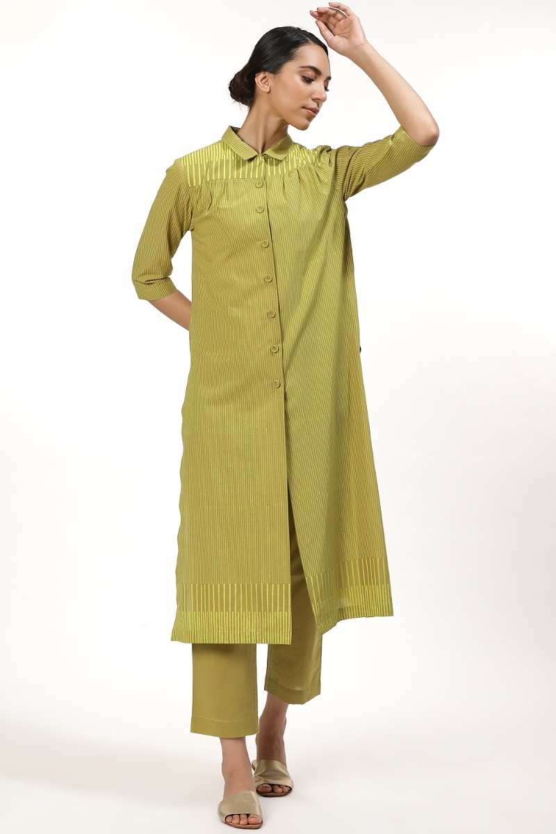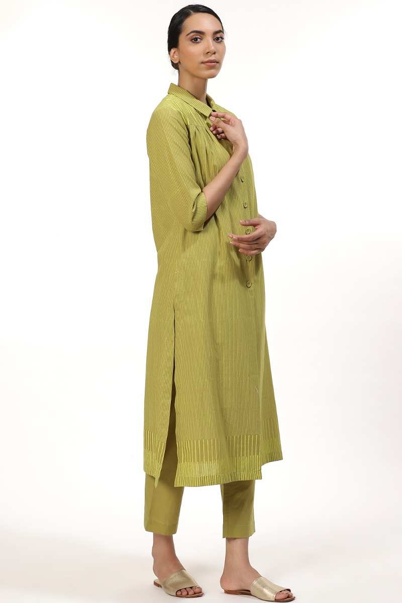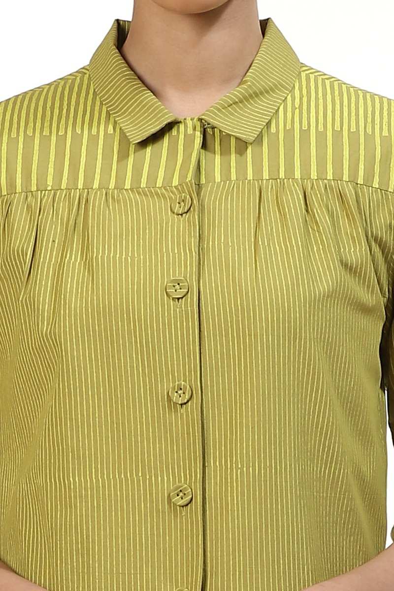 An Elegant Button Front Shirt Dress, Crafted From Cotton Cambric, With Fine Block Printed Stripes In Lime On Amla. Dress It Up With A Pair Of Pants And Flat Sandals To Work. Unfasten A Few Buttons From The Bottom For A Cool Look When Out On Vacation.