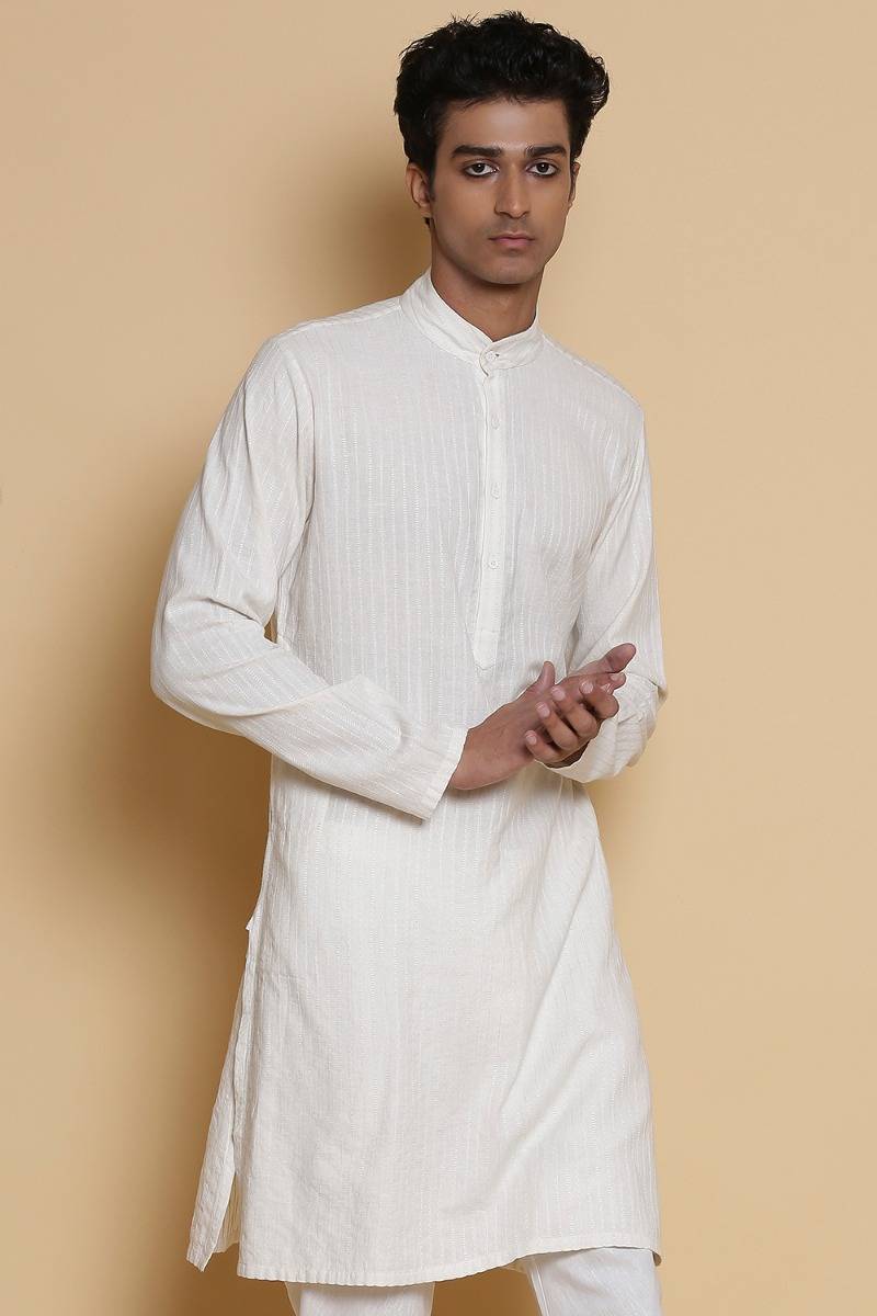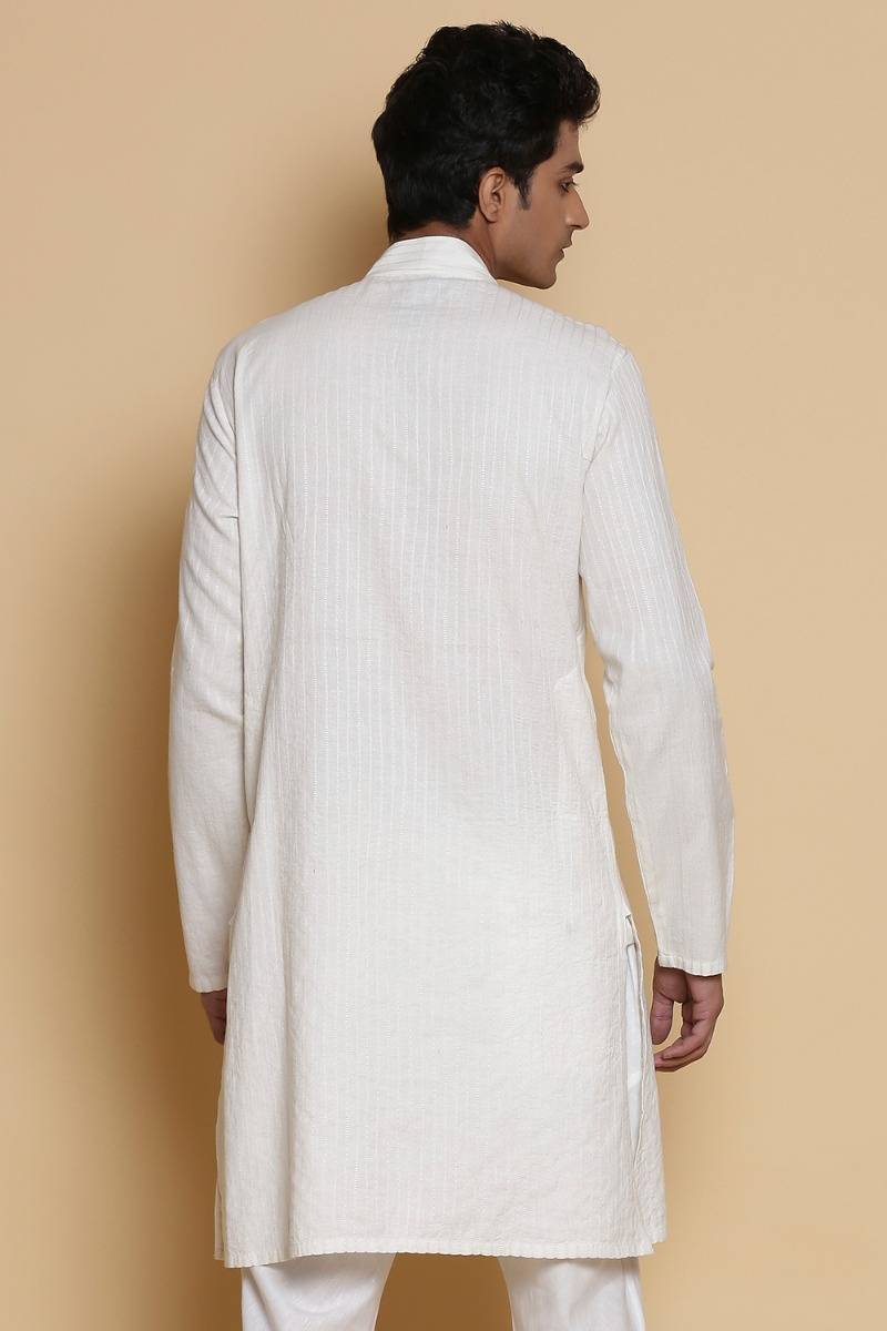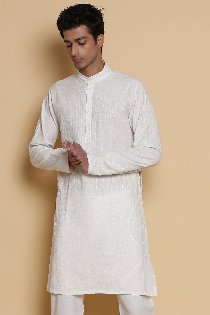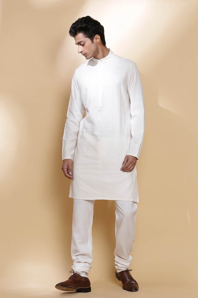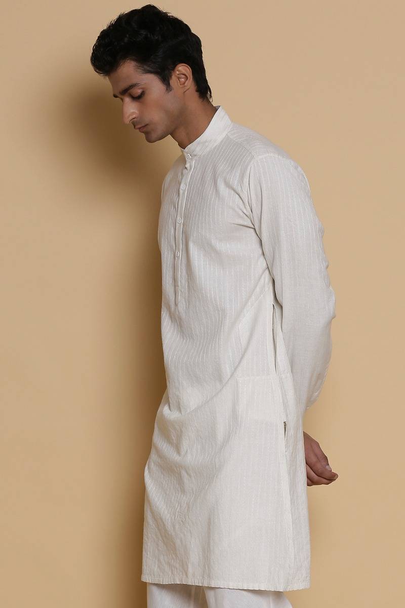 Long Kurta. Crafted In Hand Woven Cotton. Features Nehru Collar And Bespoke Scratchy Pinstripes, Offering A Pattern Unique To Each Piece With Our Signature Regular Fit