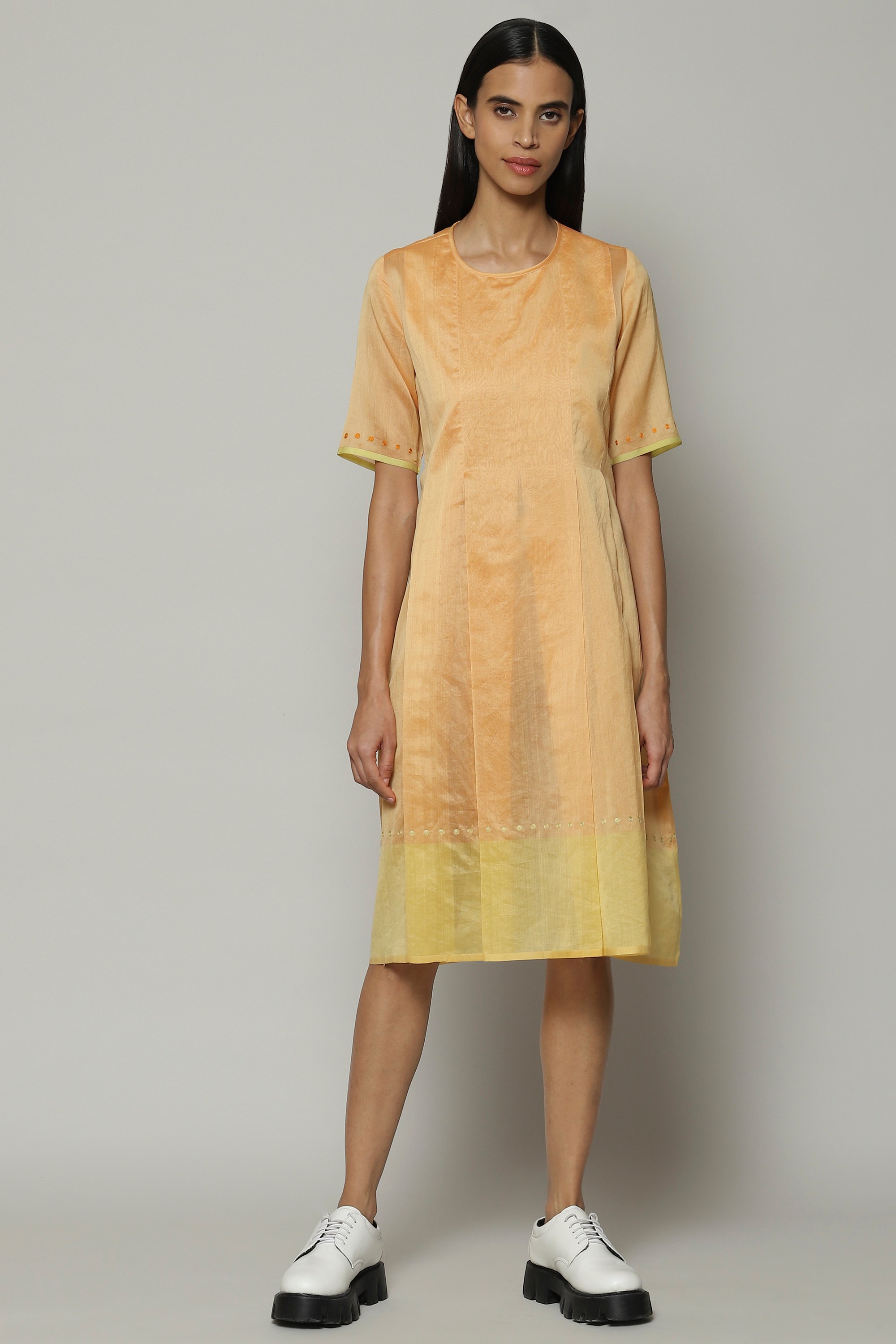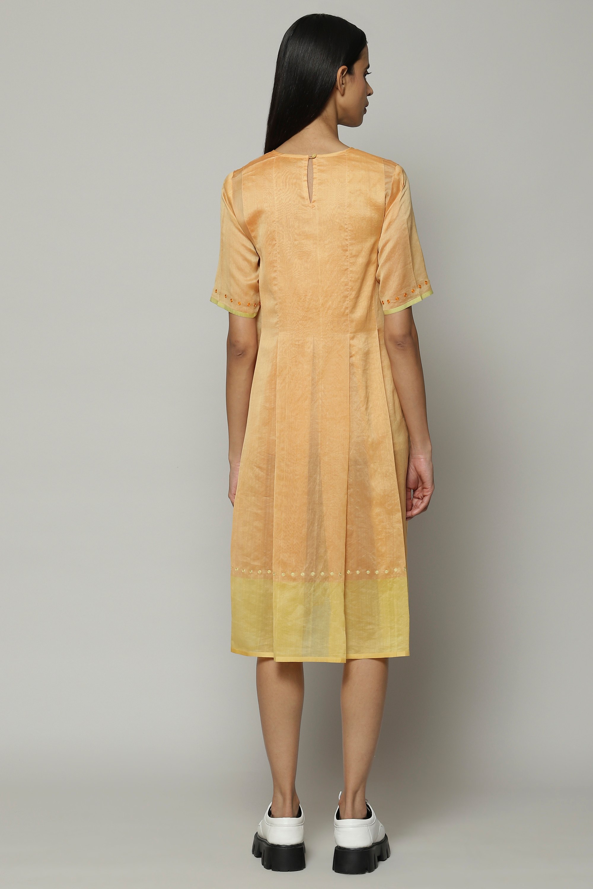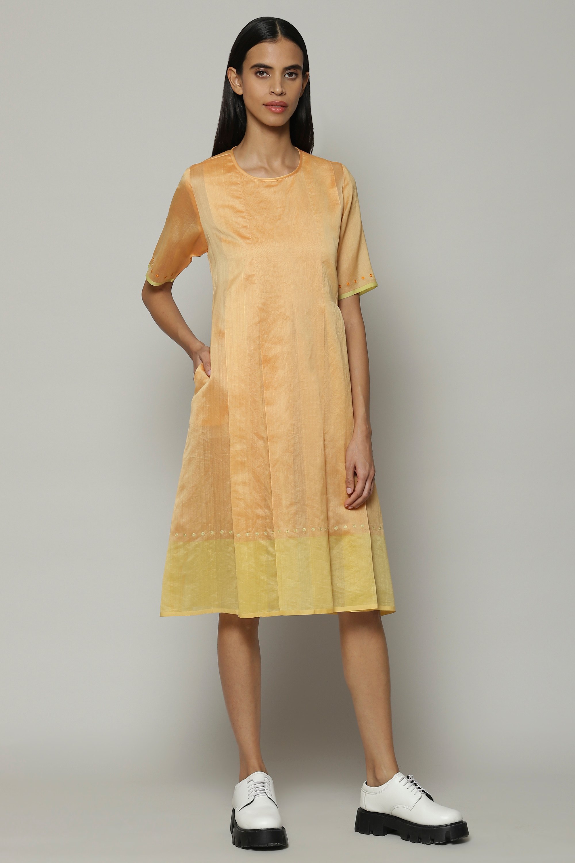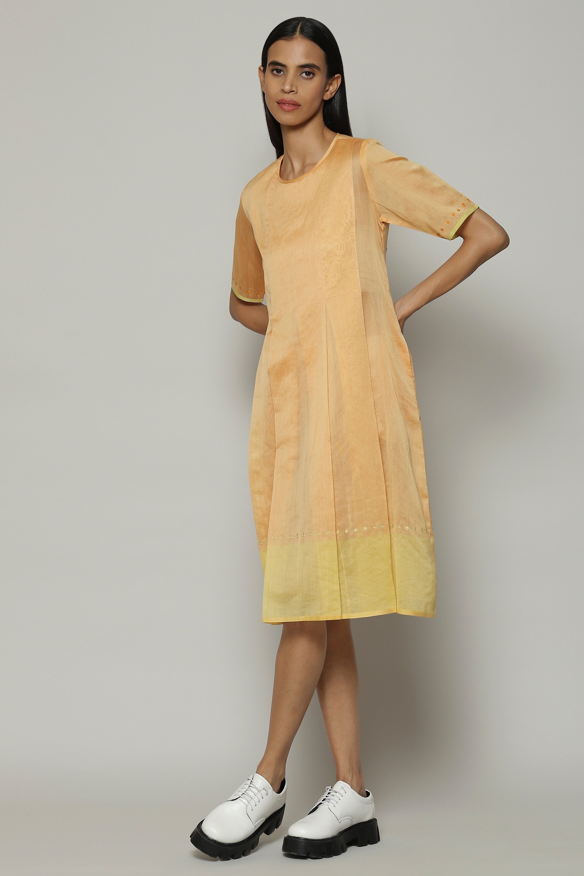 An apricot kurta, crafted from Maheshwar silk and cotton. This fabric is the perfect textile for warm weather. Best paired with chai and Carnatic music.