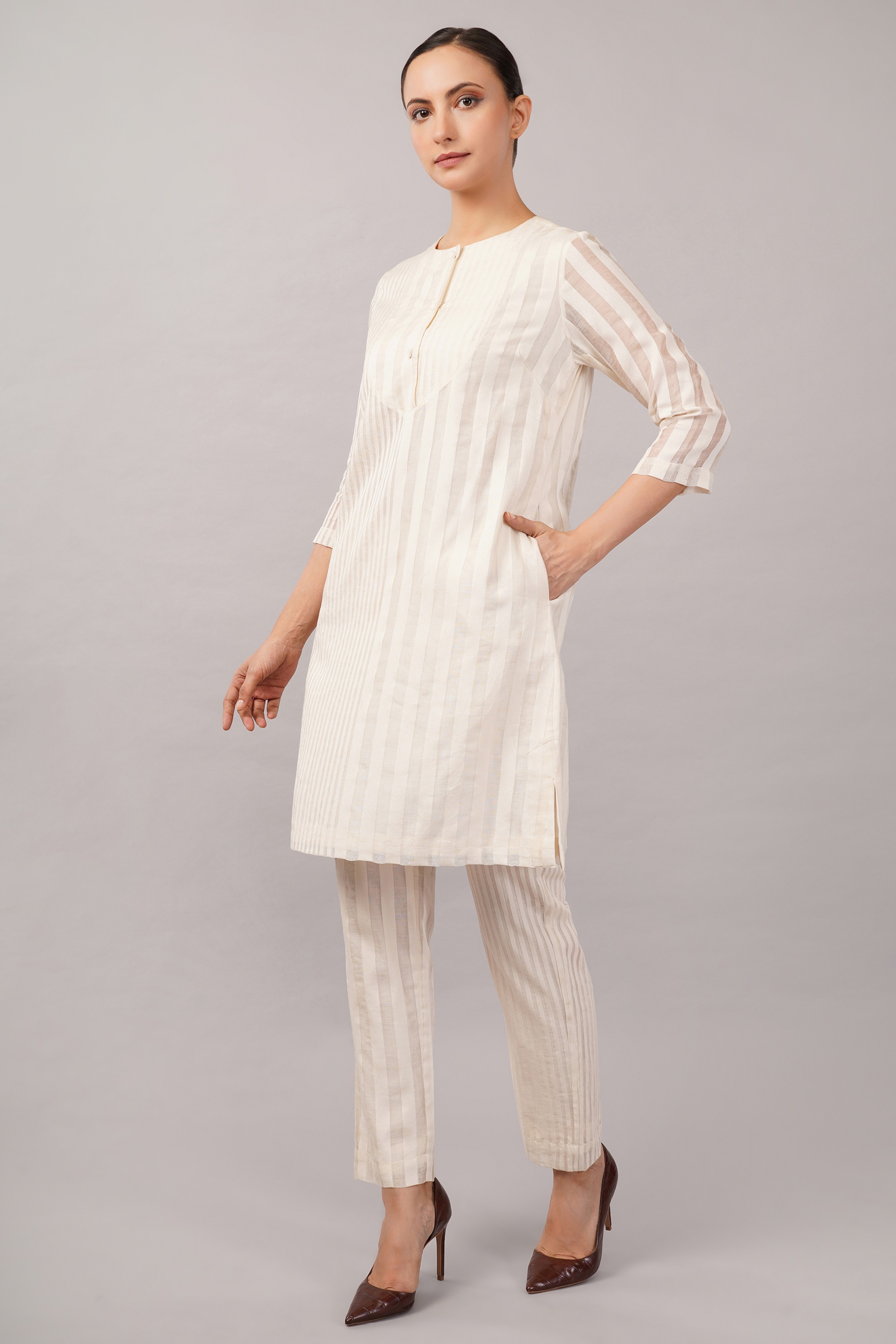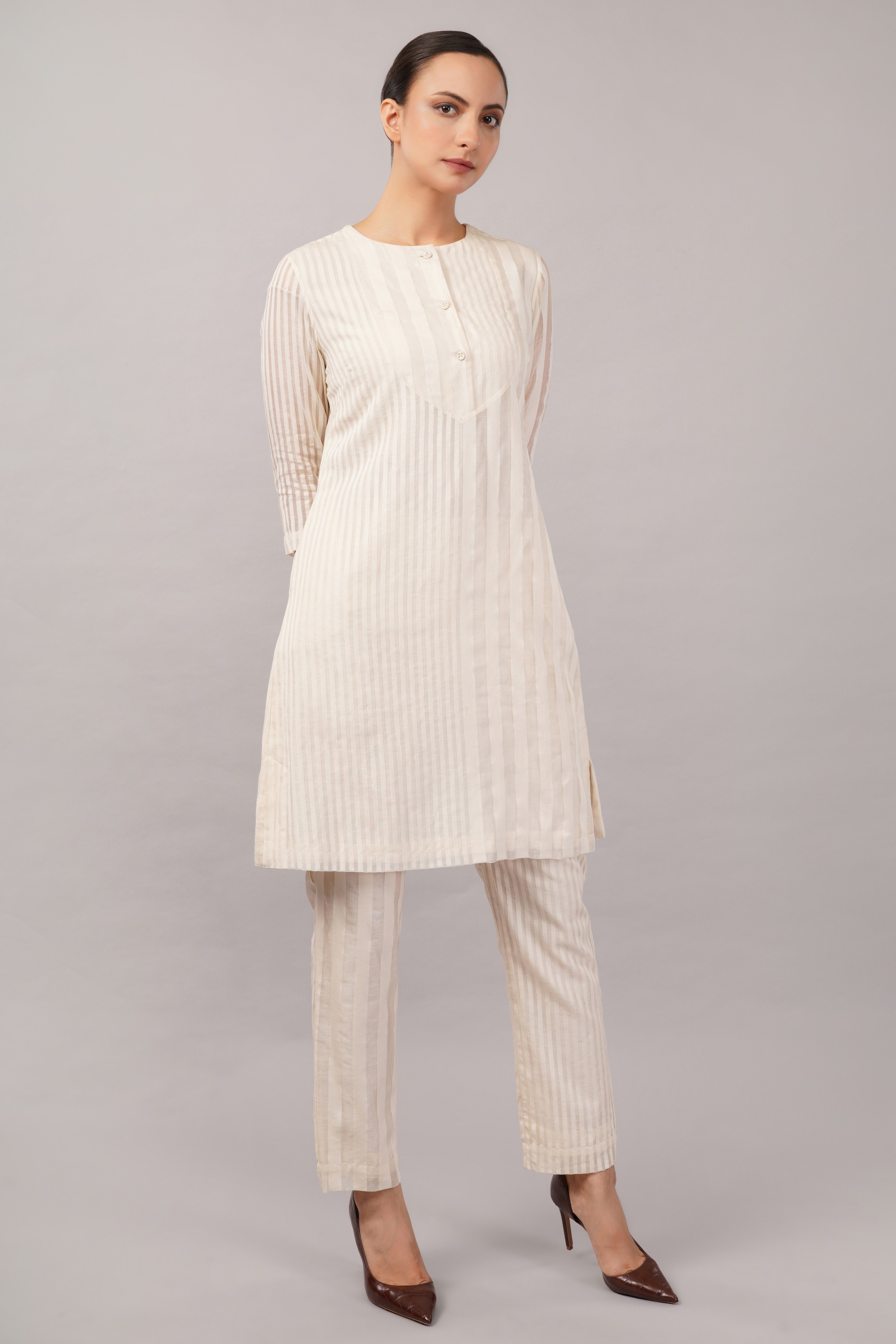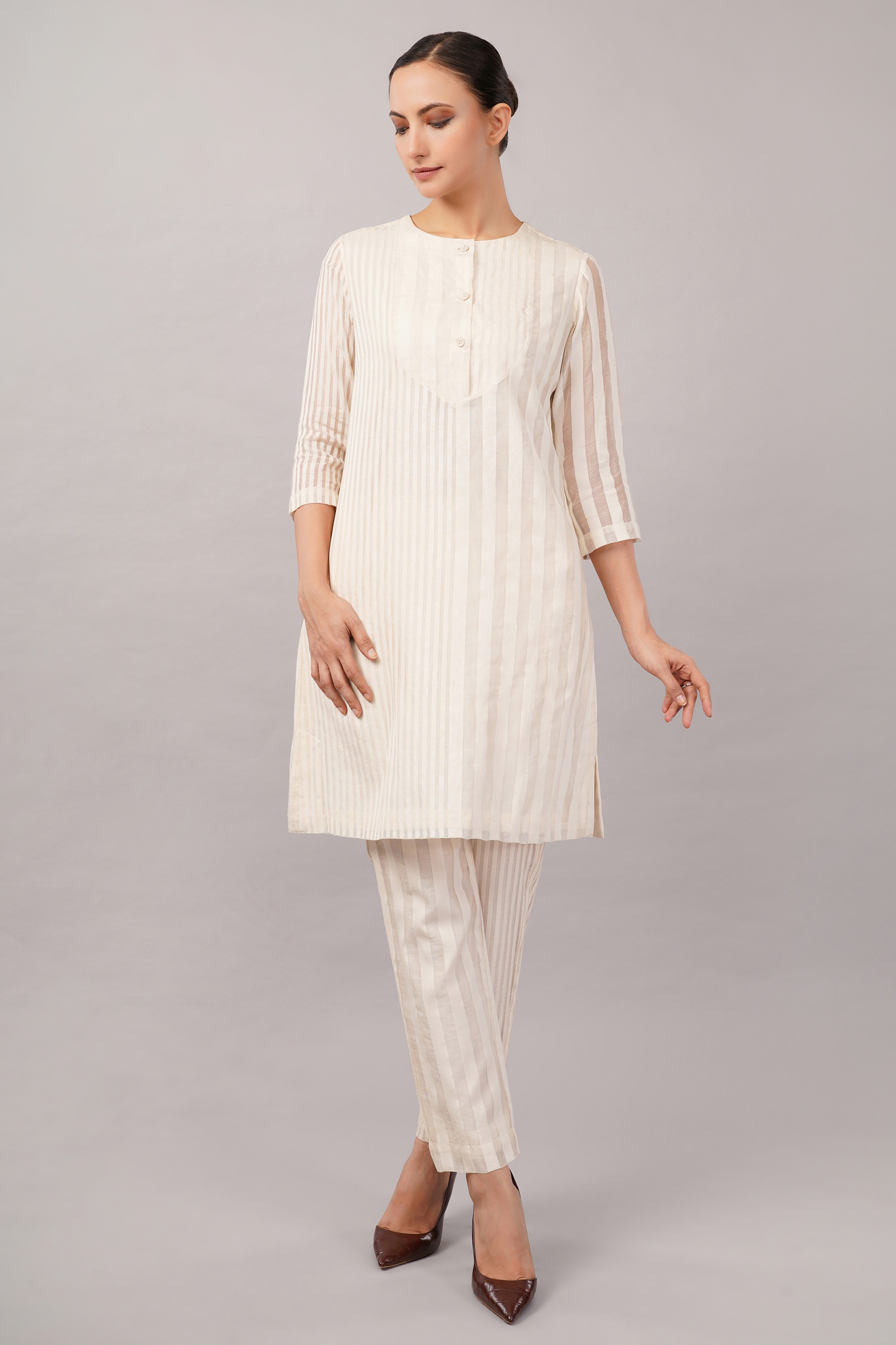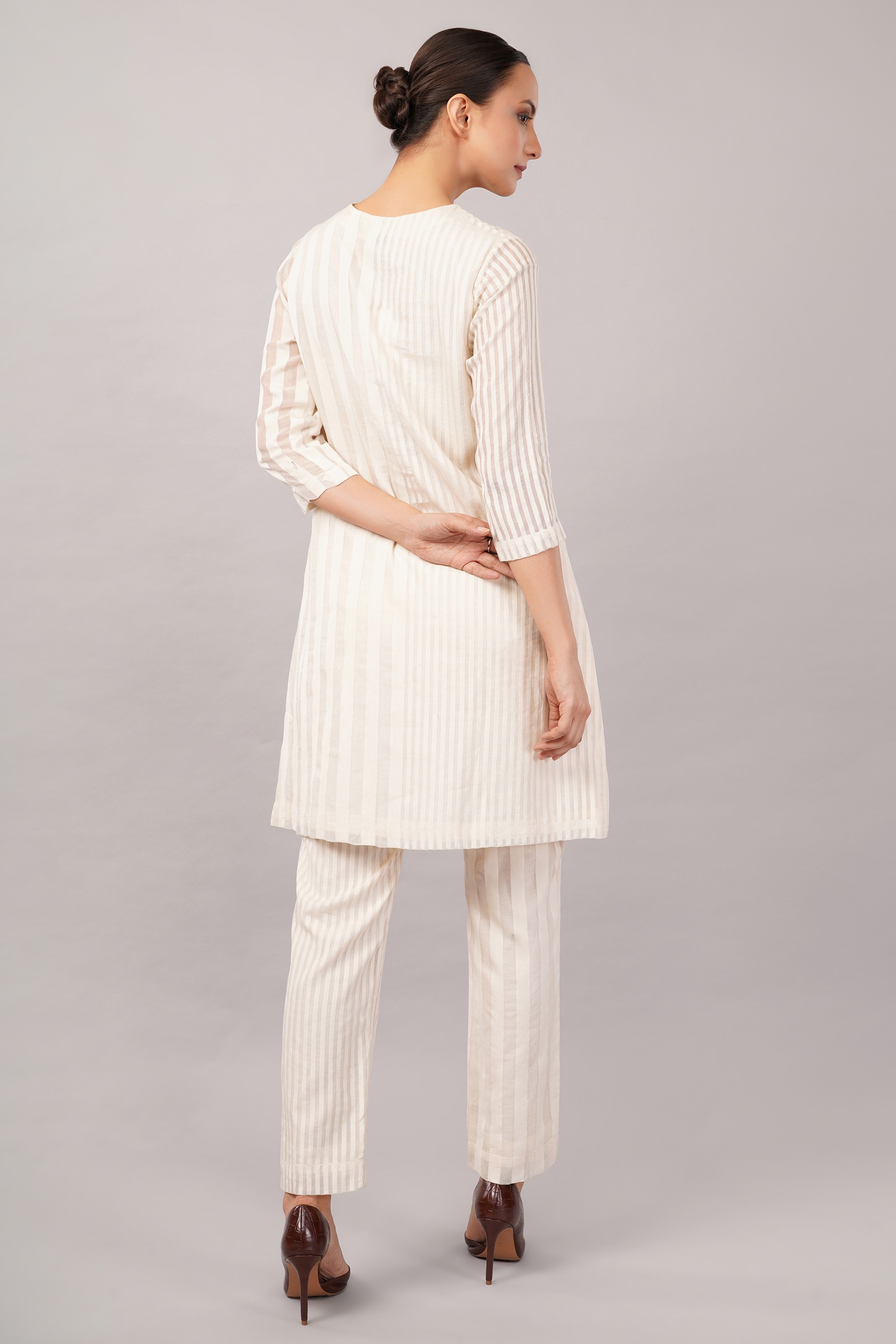 This limited edition piece has been made using a specially designed handwoven Silk x Cotton fabric with tone on tone striping. The play of solid and sheer make it perfect for casual yet elegant summer dressing.