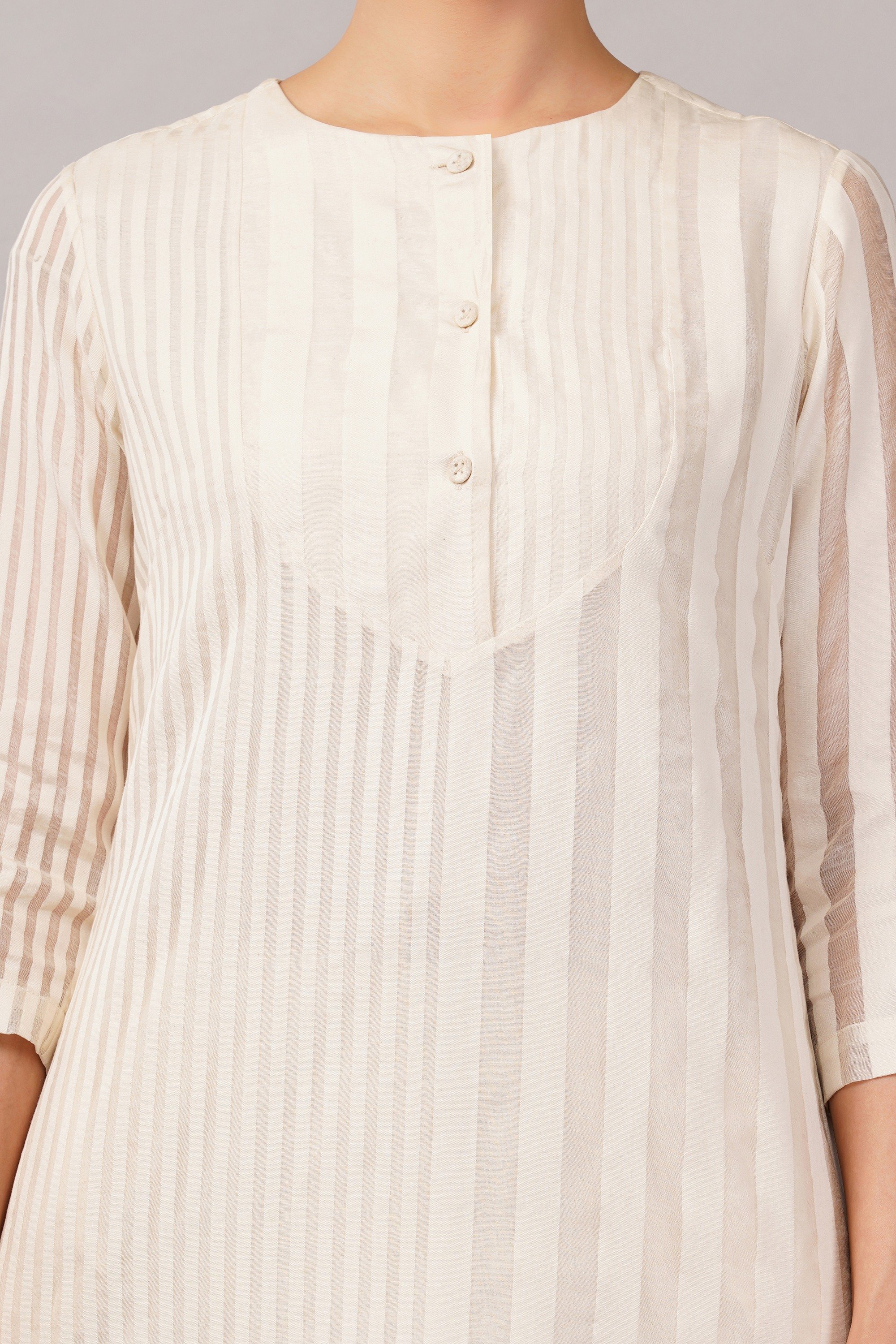This limited edition piece has been made using a specially designed handwoven Silk x Cotton fabric with tone on tone striping. The play of solid and sheer make it perfect for casual yet elegant summer dressing.