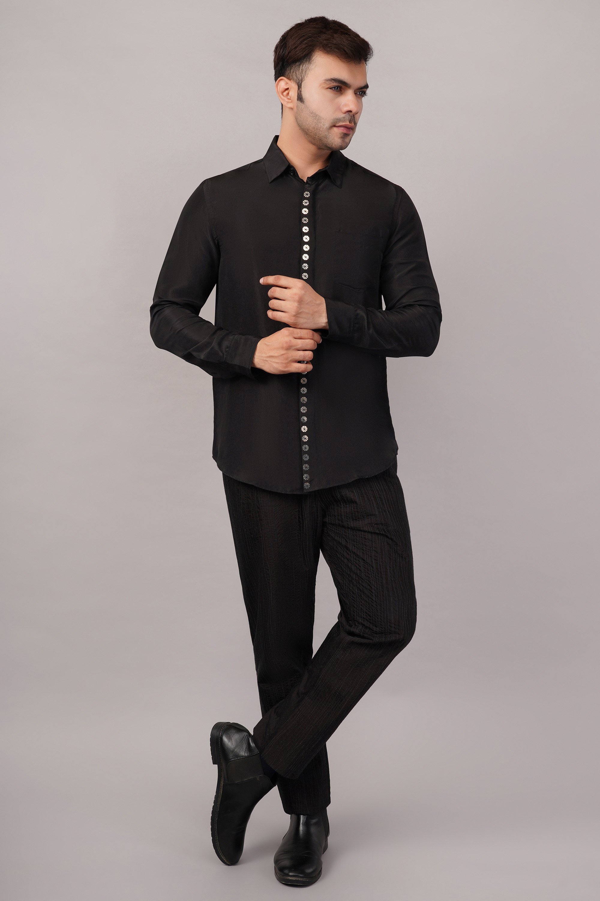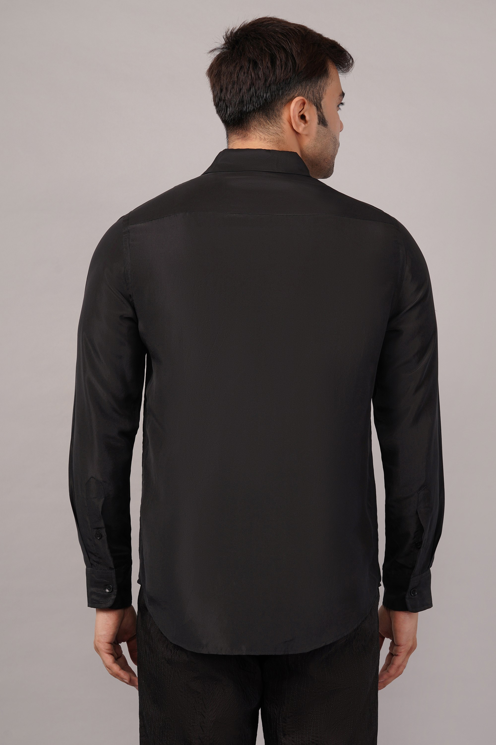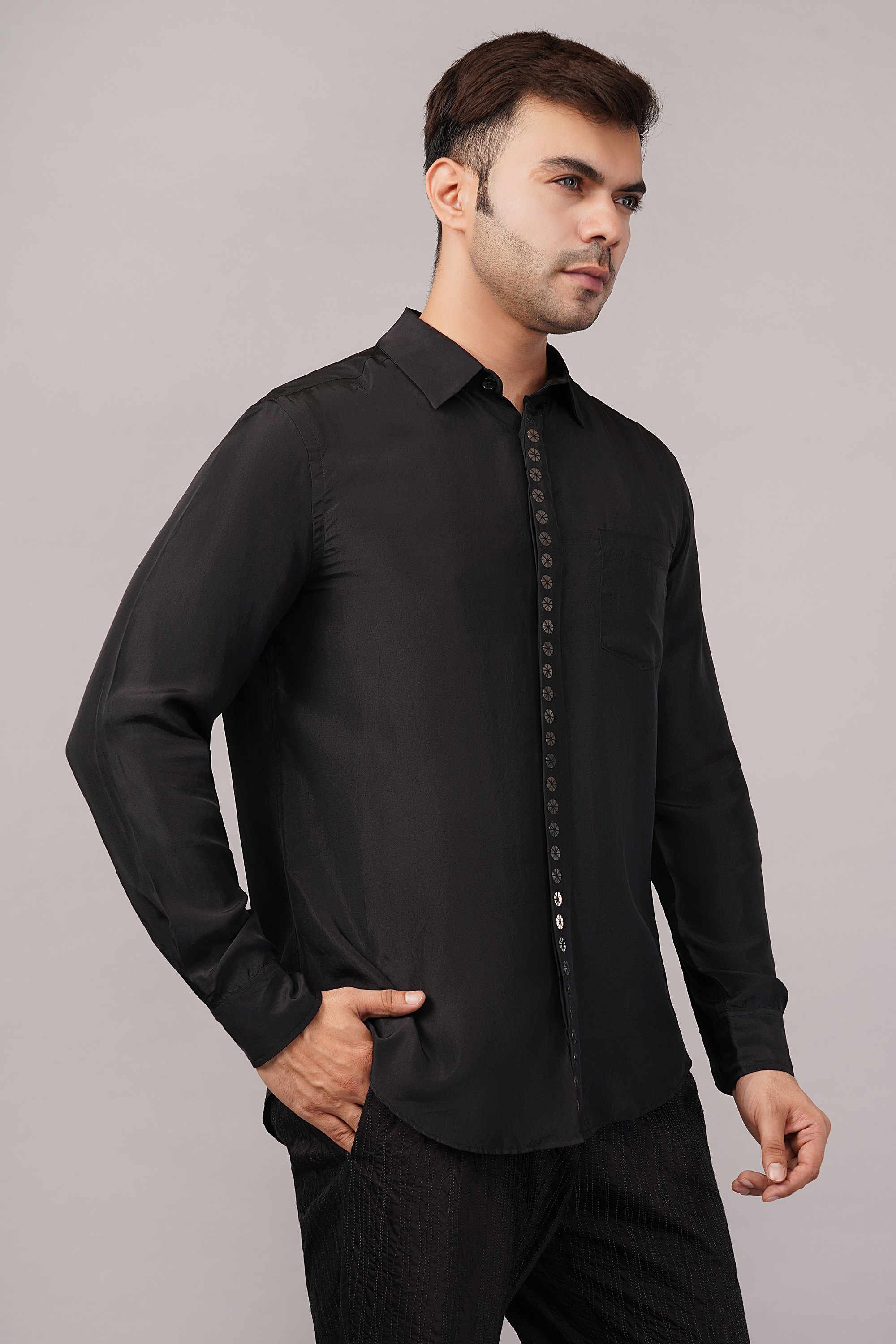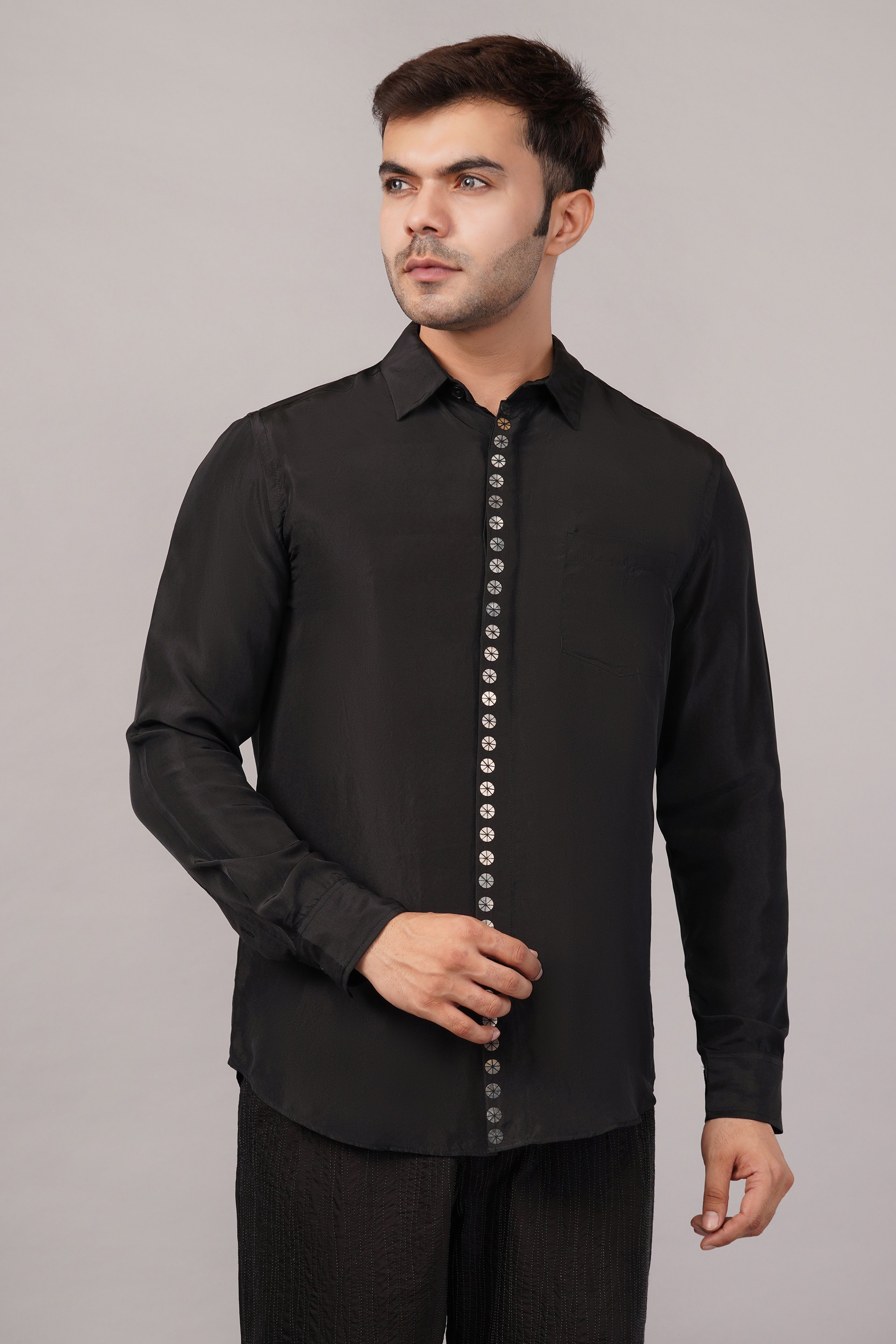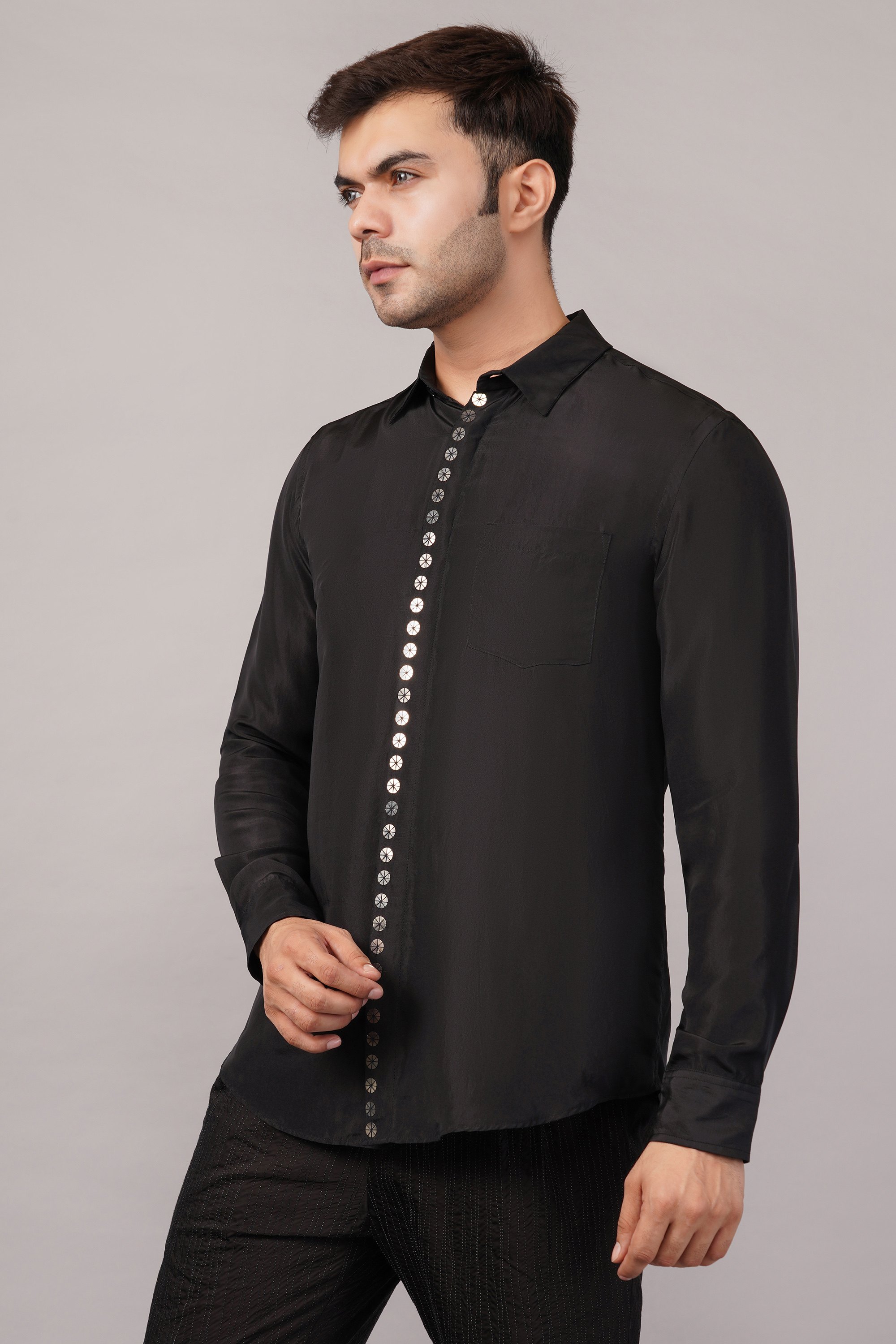 This limited edition piece has been made using a pure silk fabric and embellished with a single line hand embroidered metallic sequins.