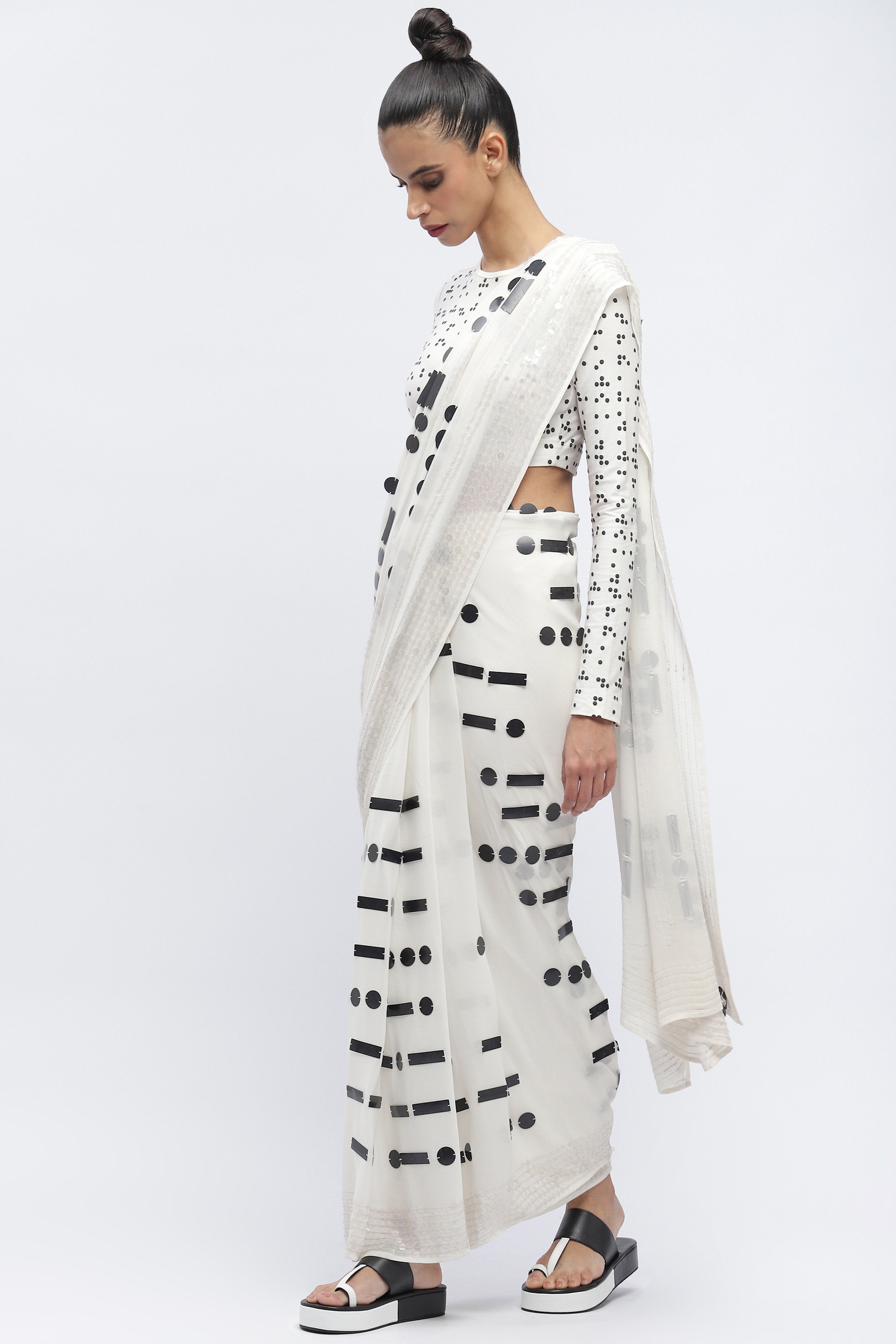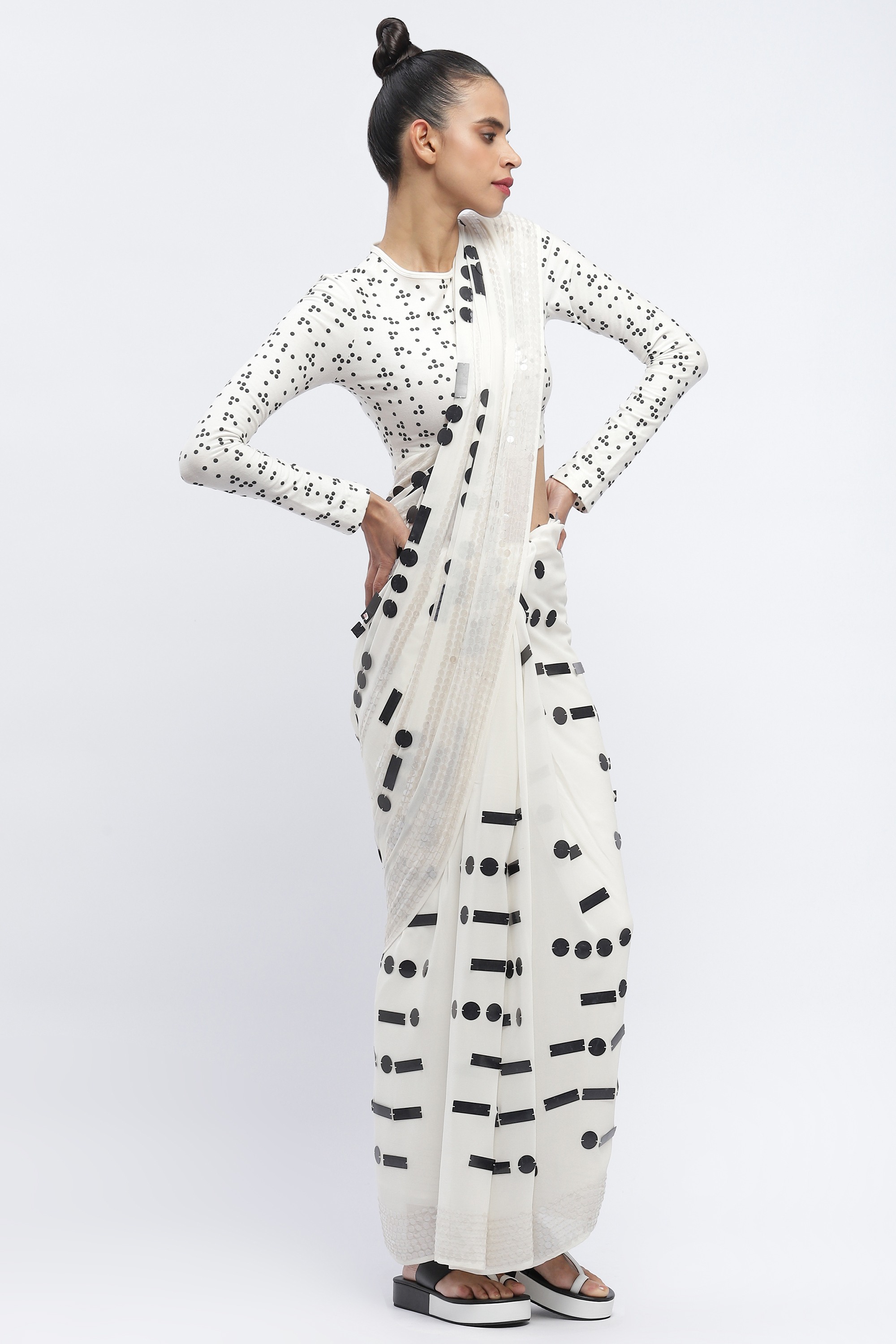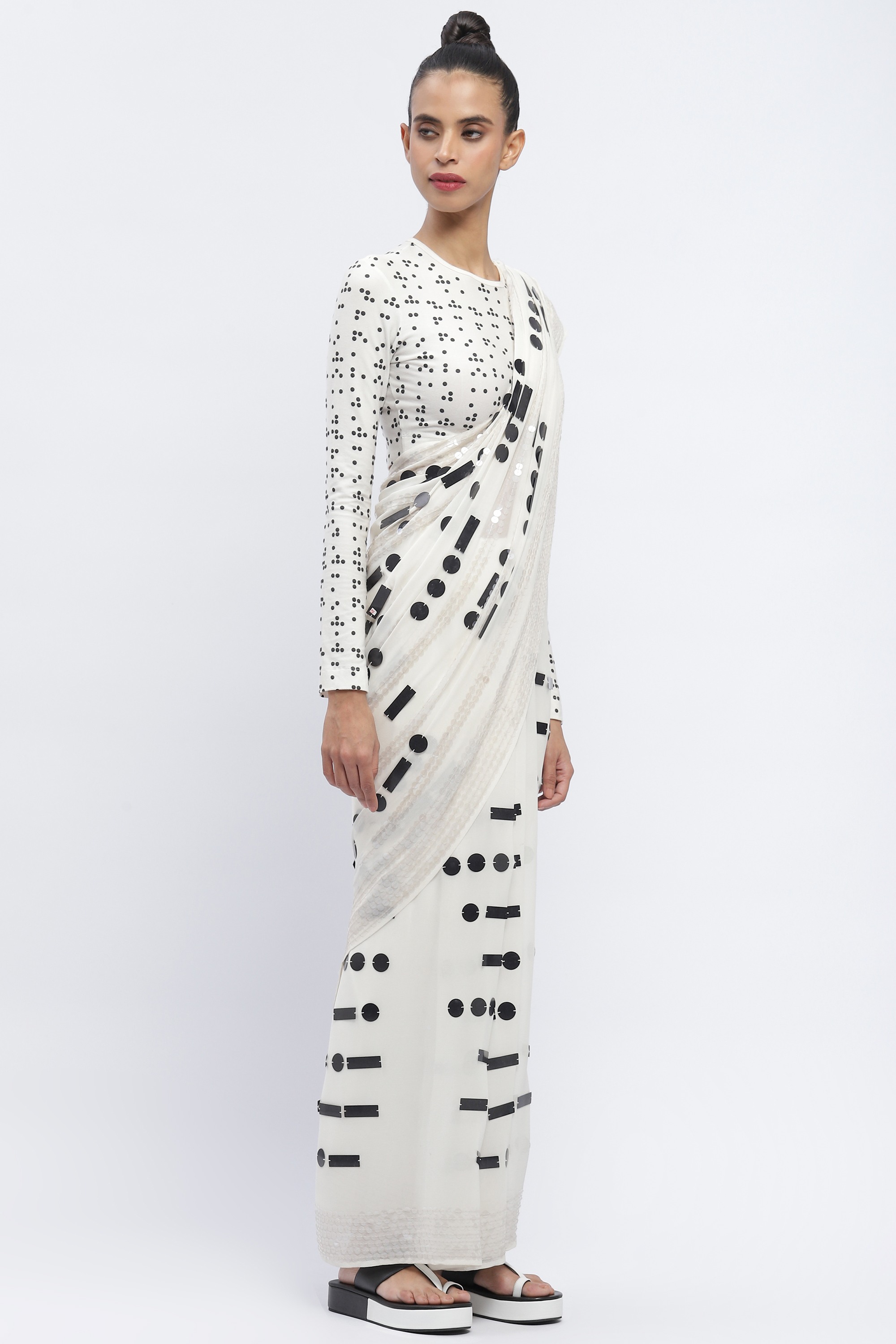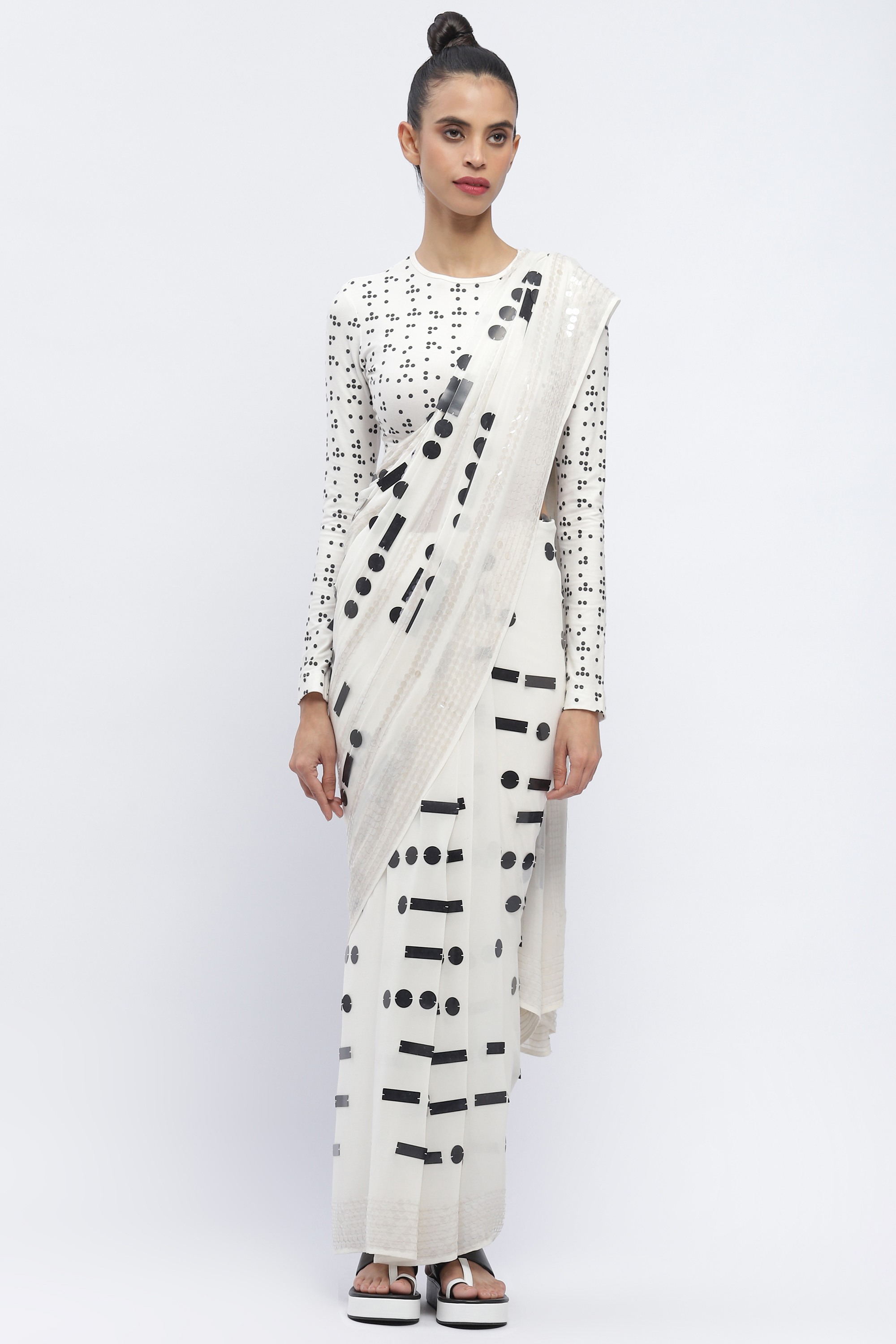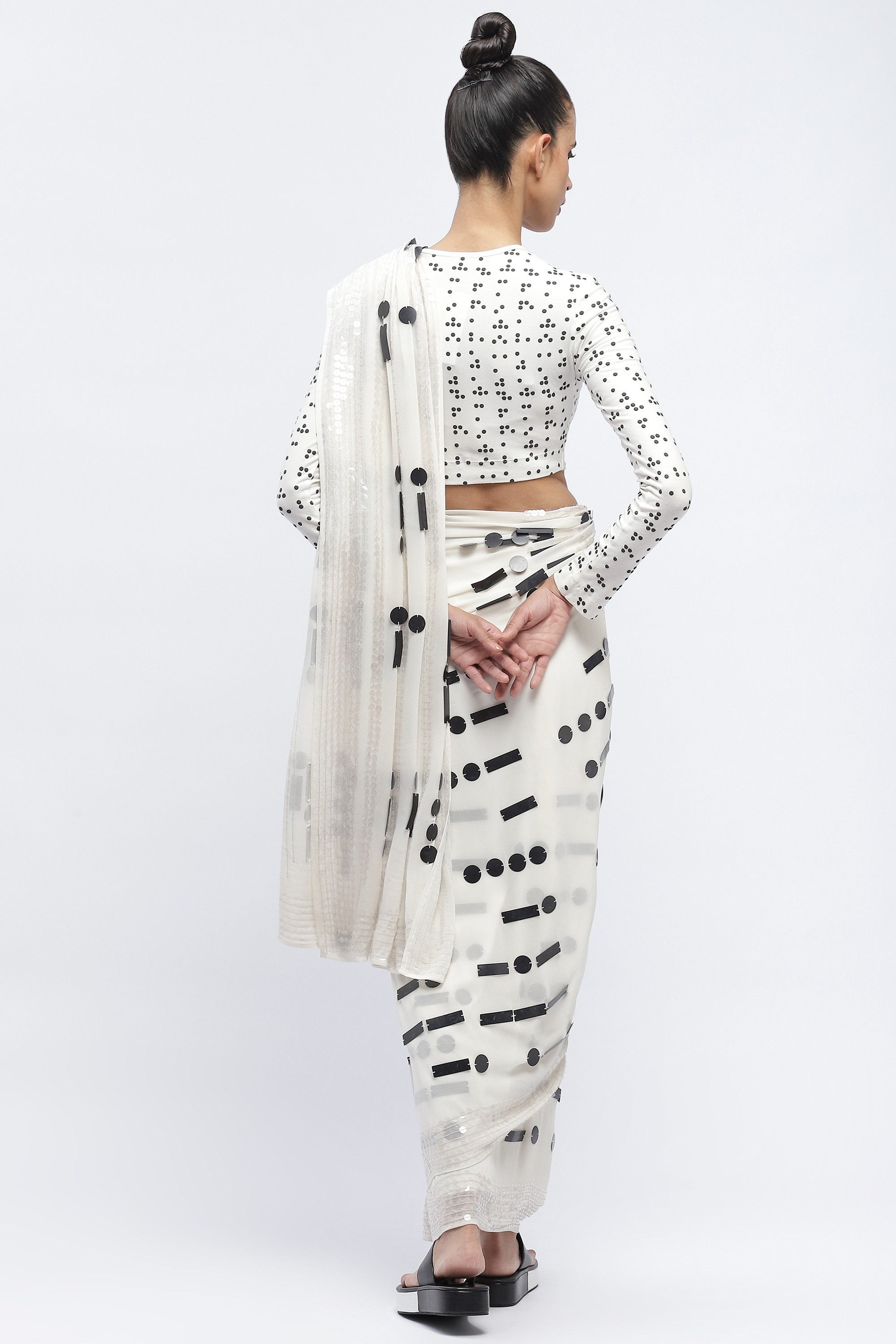 A breakdown in communication, sequined in morse on a white saree.