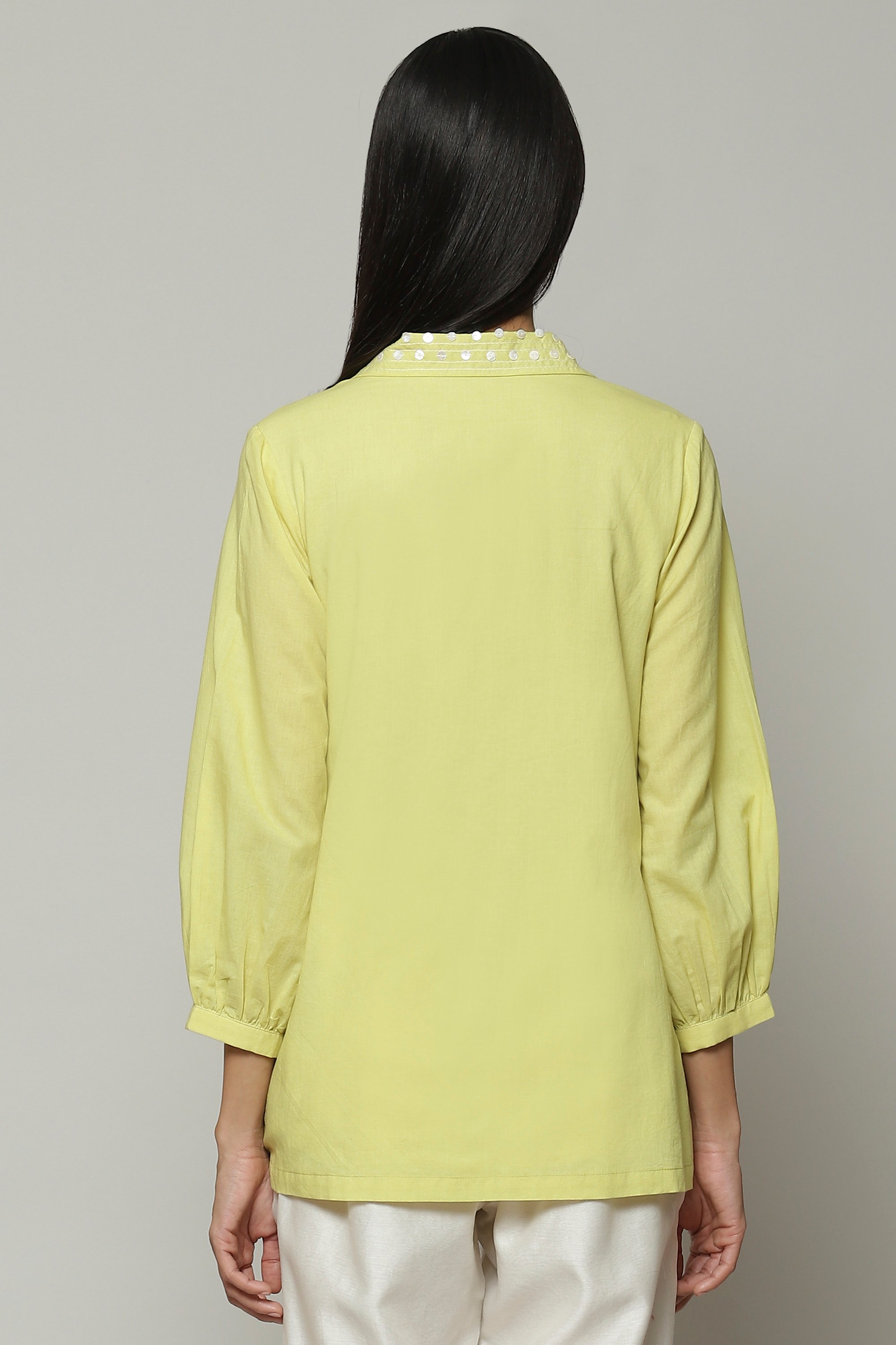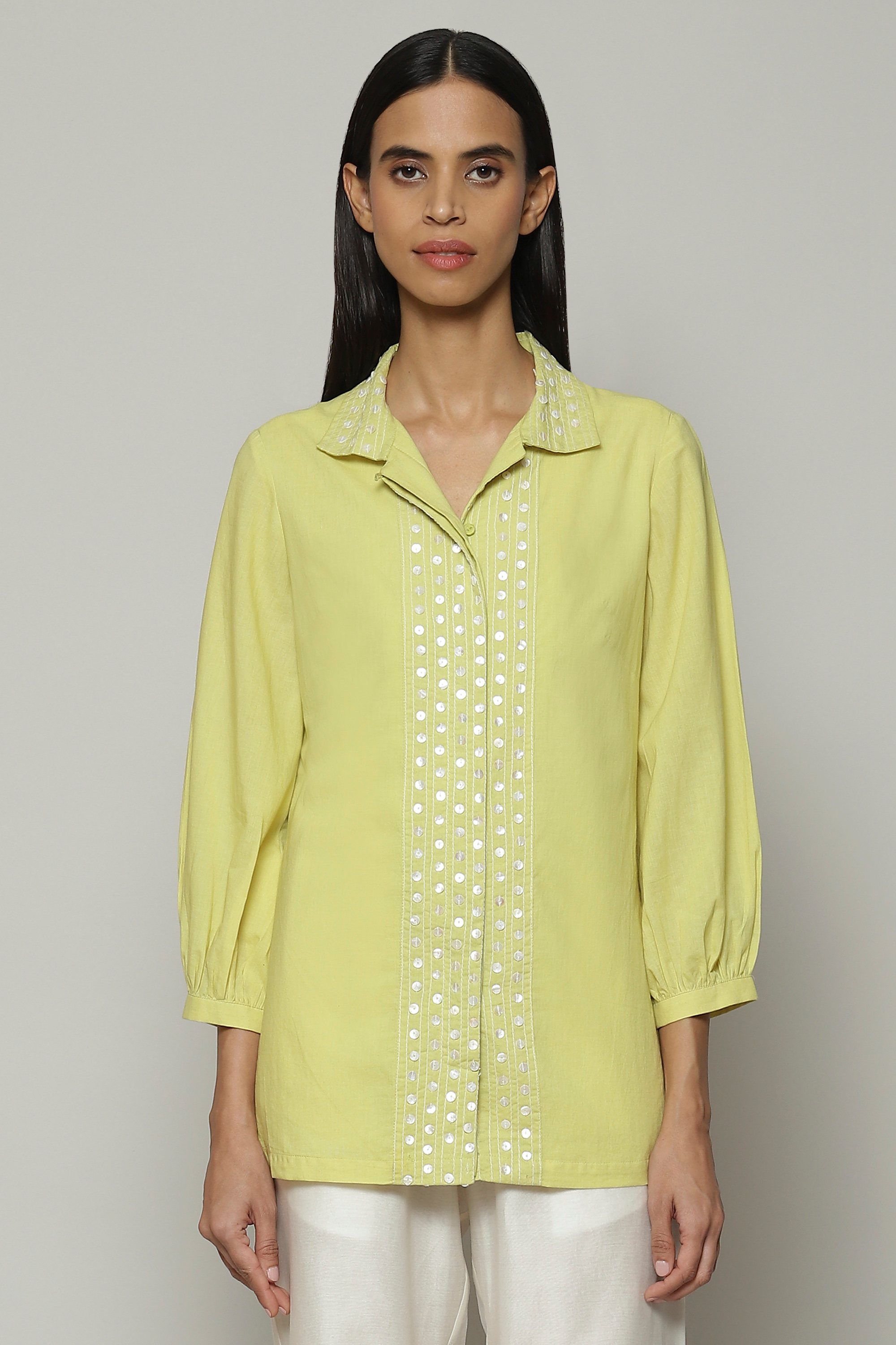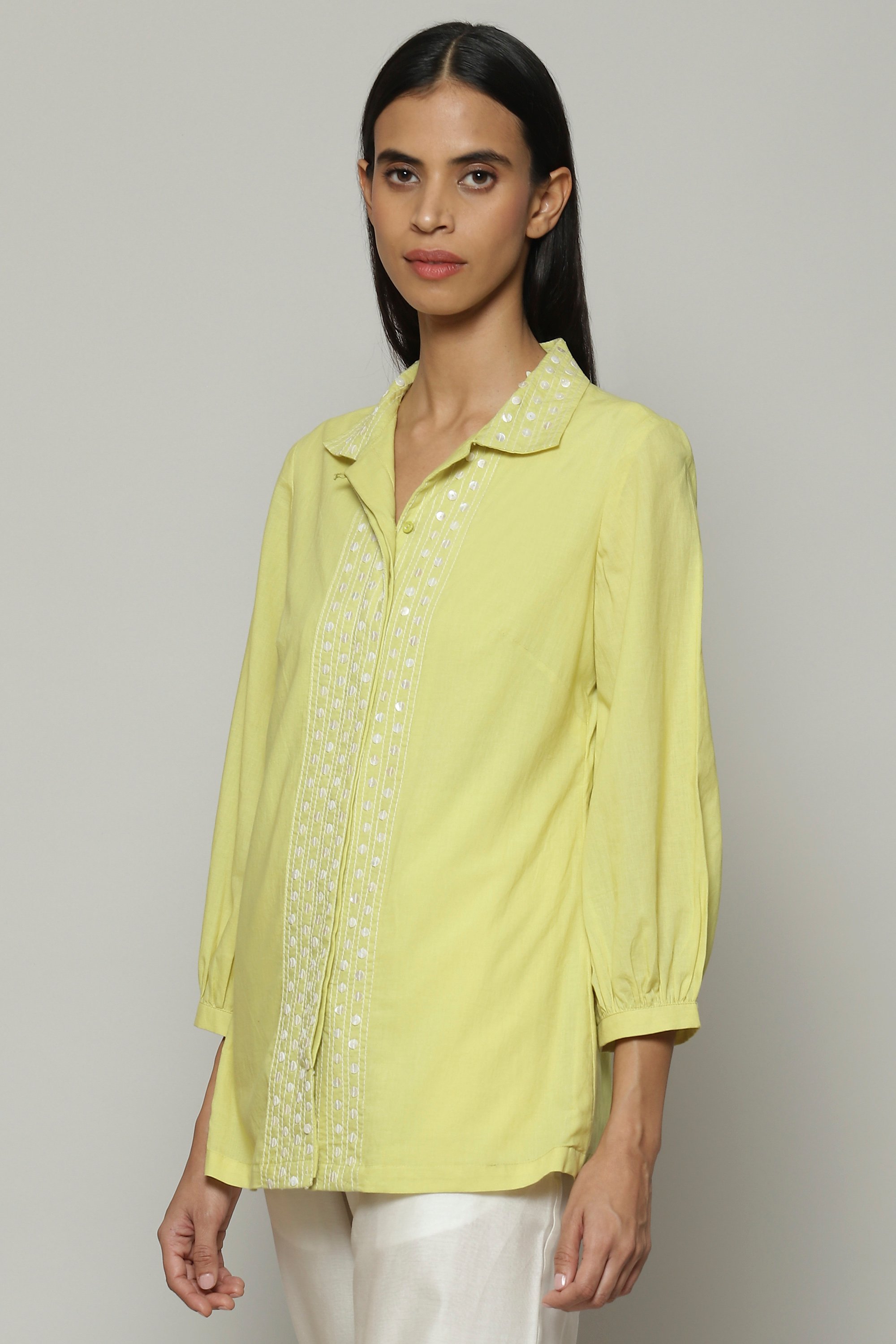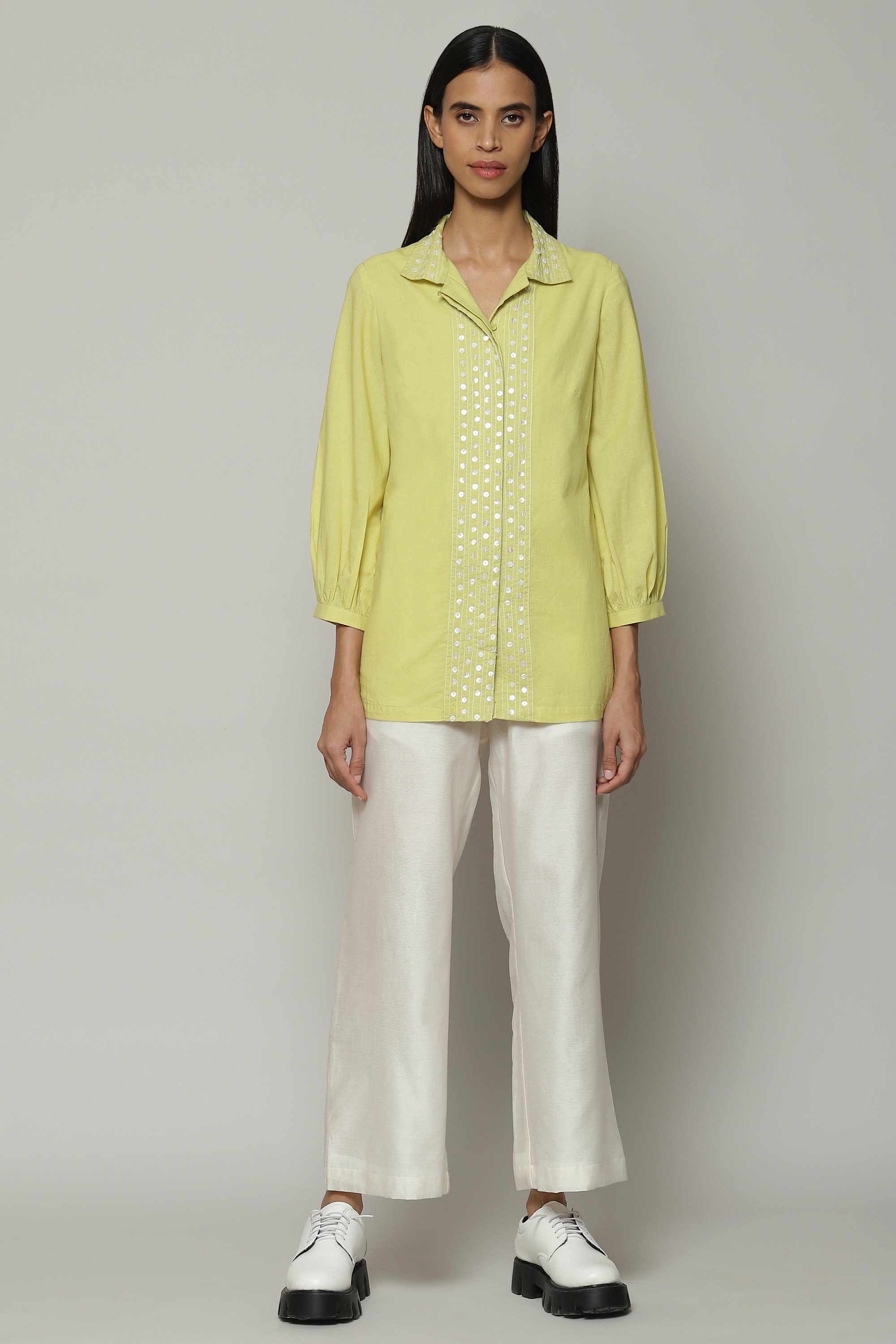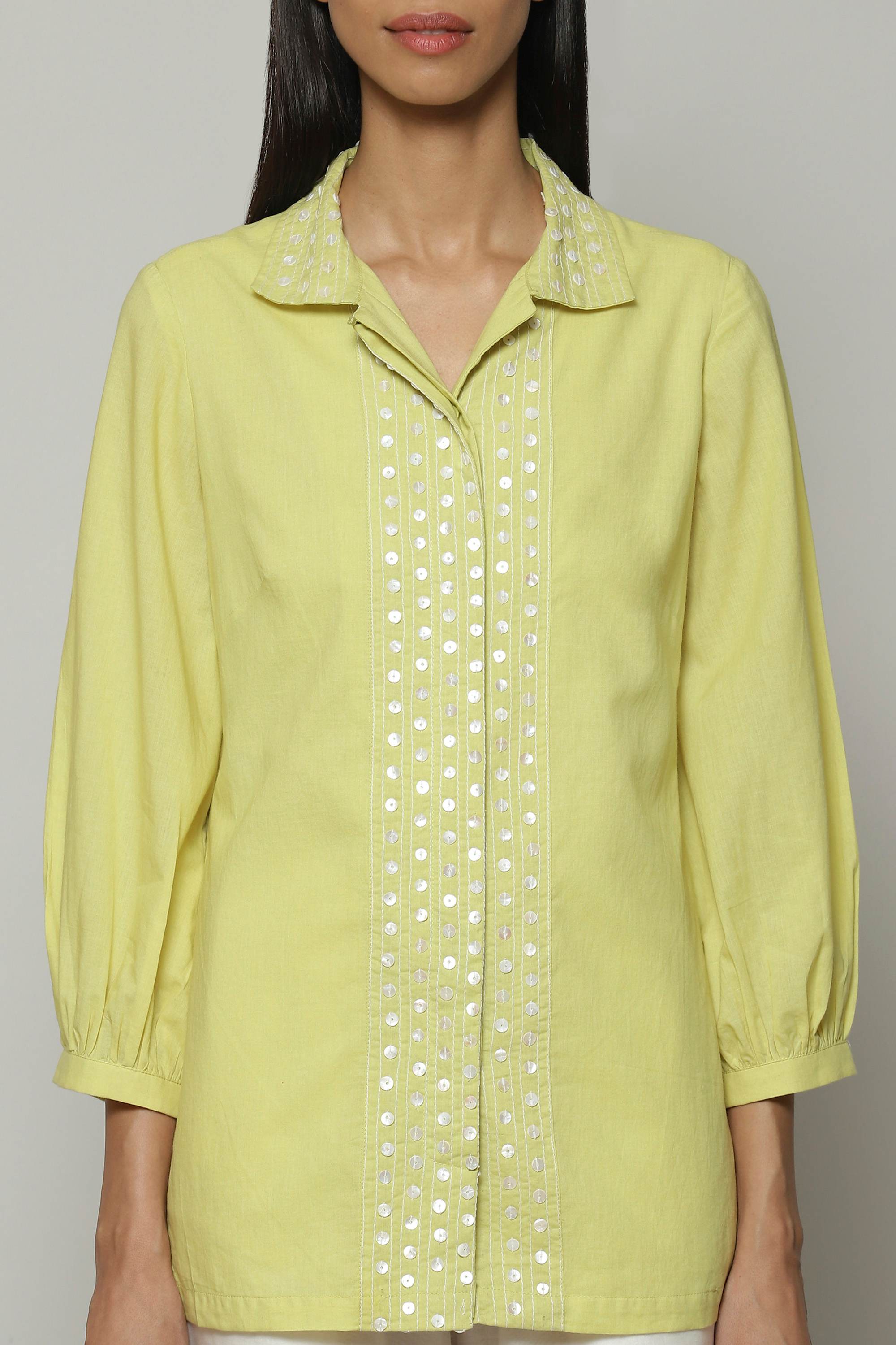 A lime shirt, embroidered with mother of pearl sequins. Crafted in lightweight cotton cambric, this piece features the intricate art form of hand adda embellishment. A glass of fresh lemonade, in shirt form.