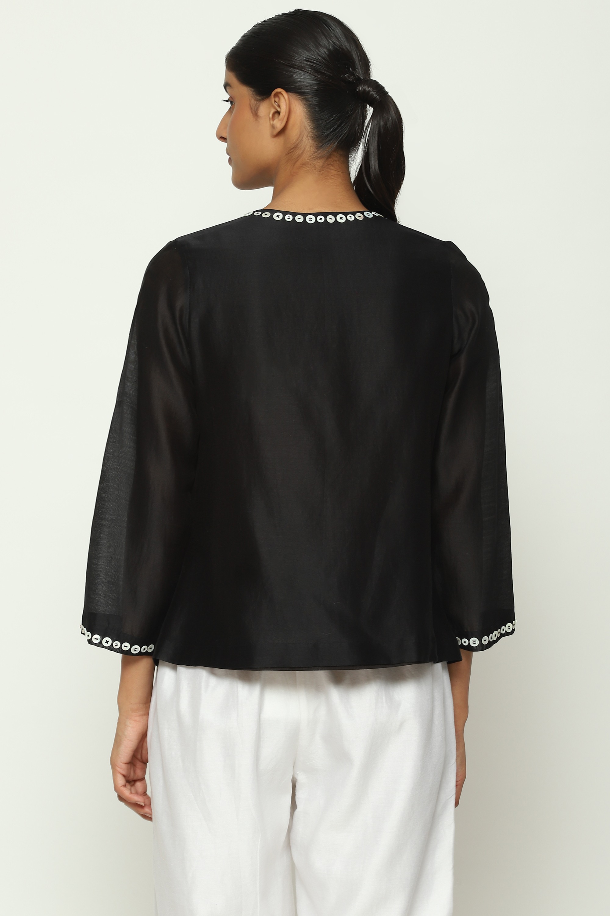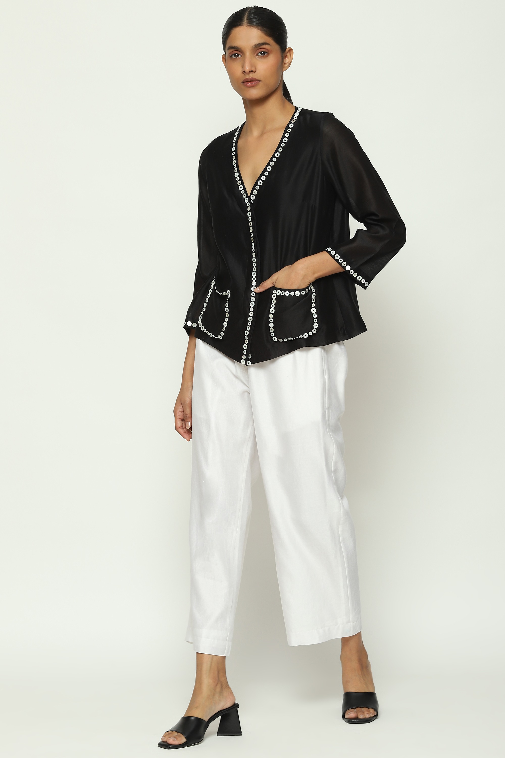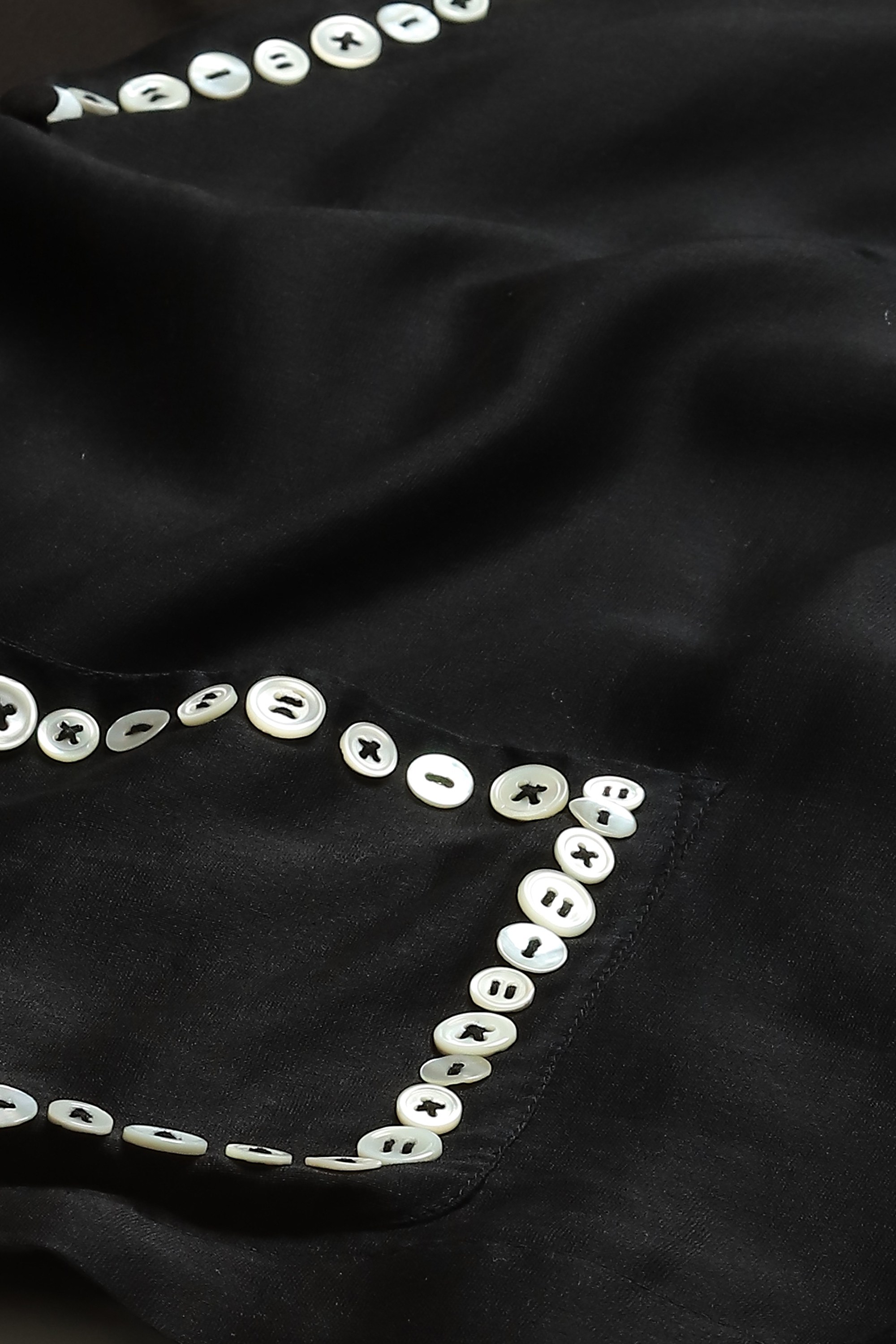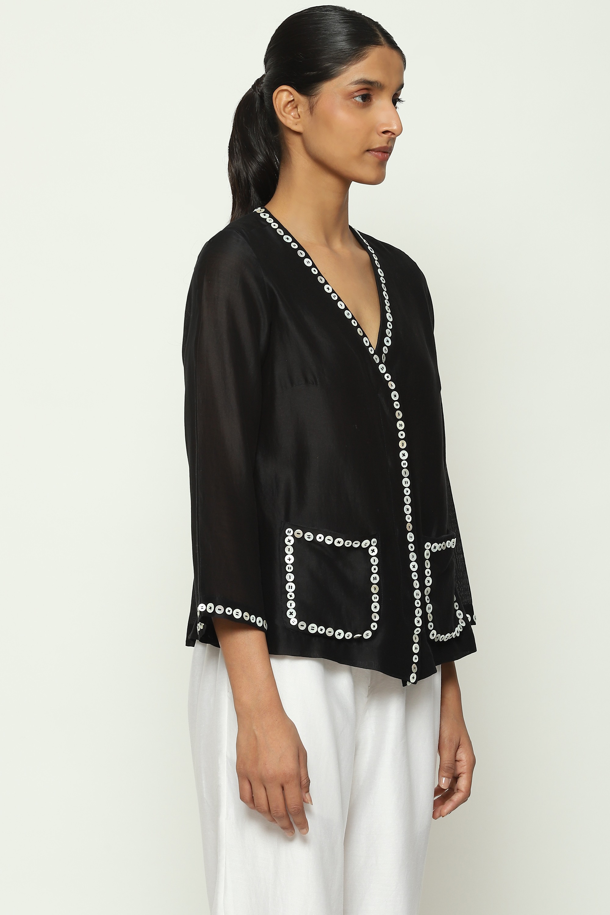 An exploration of boundaries, laid with pearls on a black jacket top.