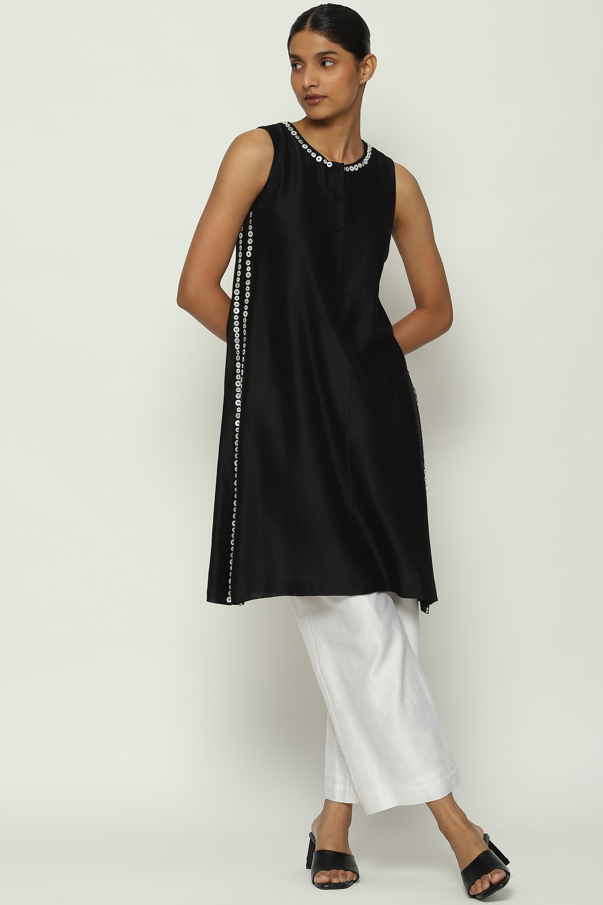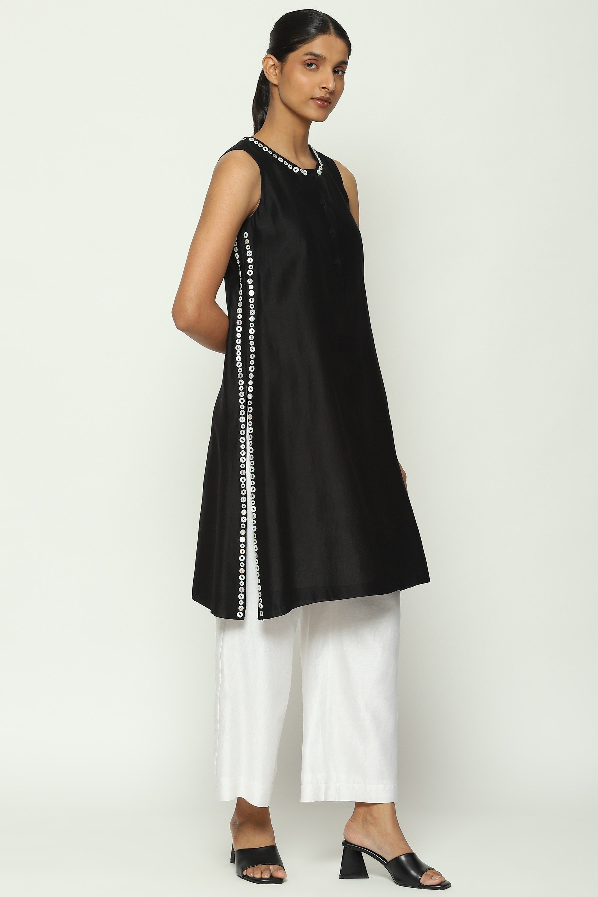 An exploration of boundaries, laid with pearls on a black kurta.