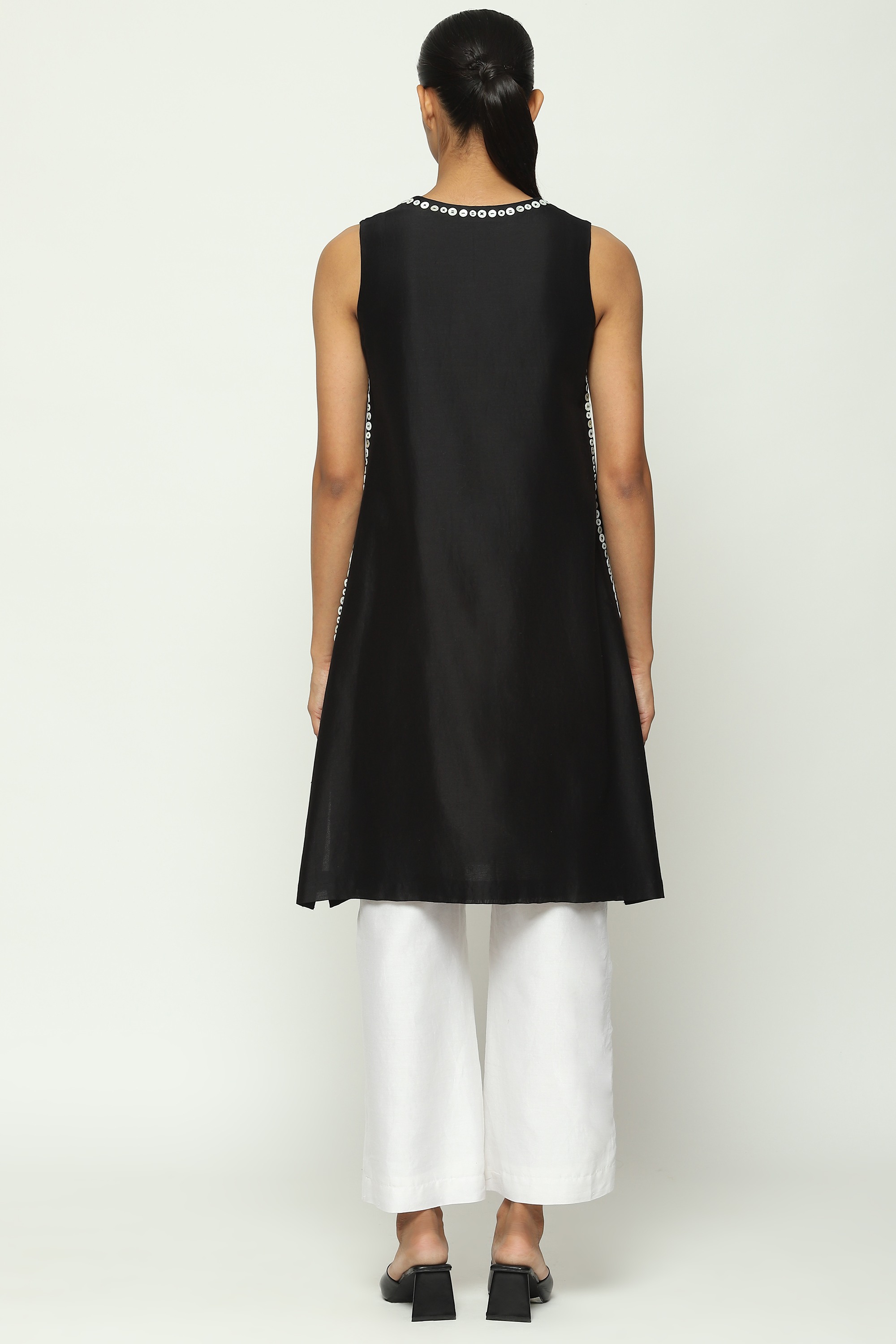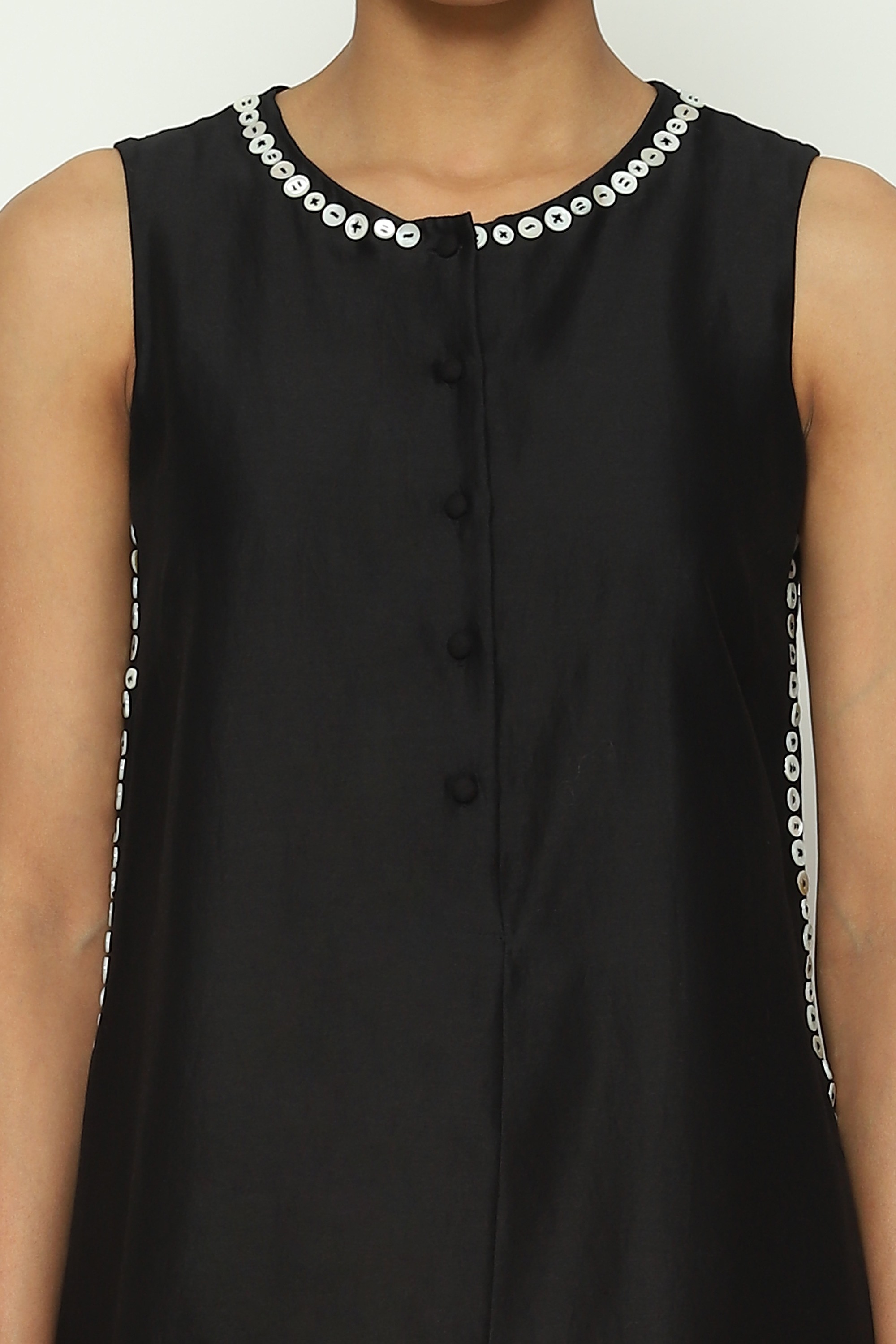 Body Language, from Abraham & Thakore, plays with the nuances of human connection in fabric. Crafted in Chanderi and embroidered with mother of pearl buttons using the ancient hand adda technique.