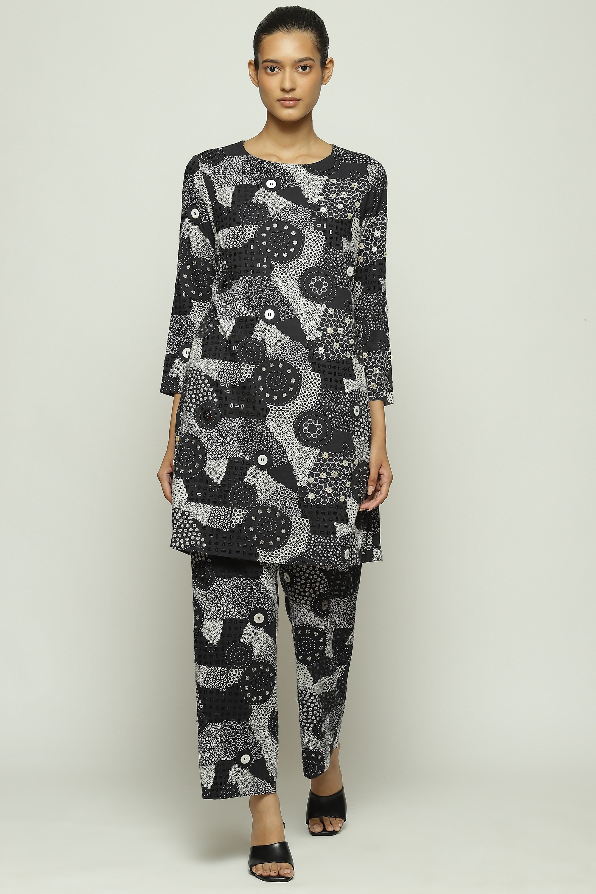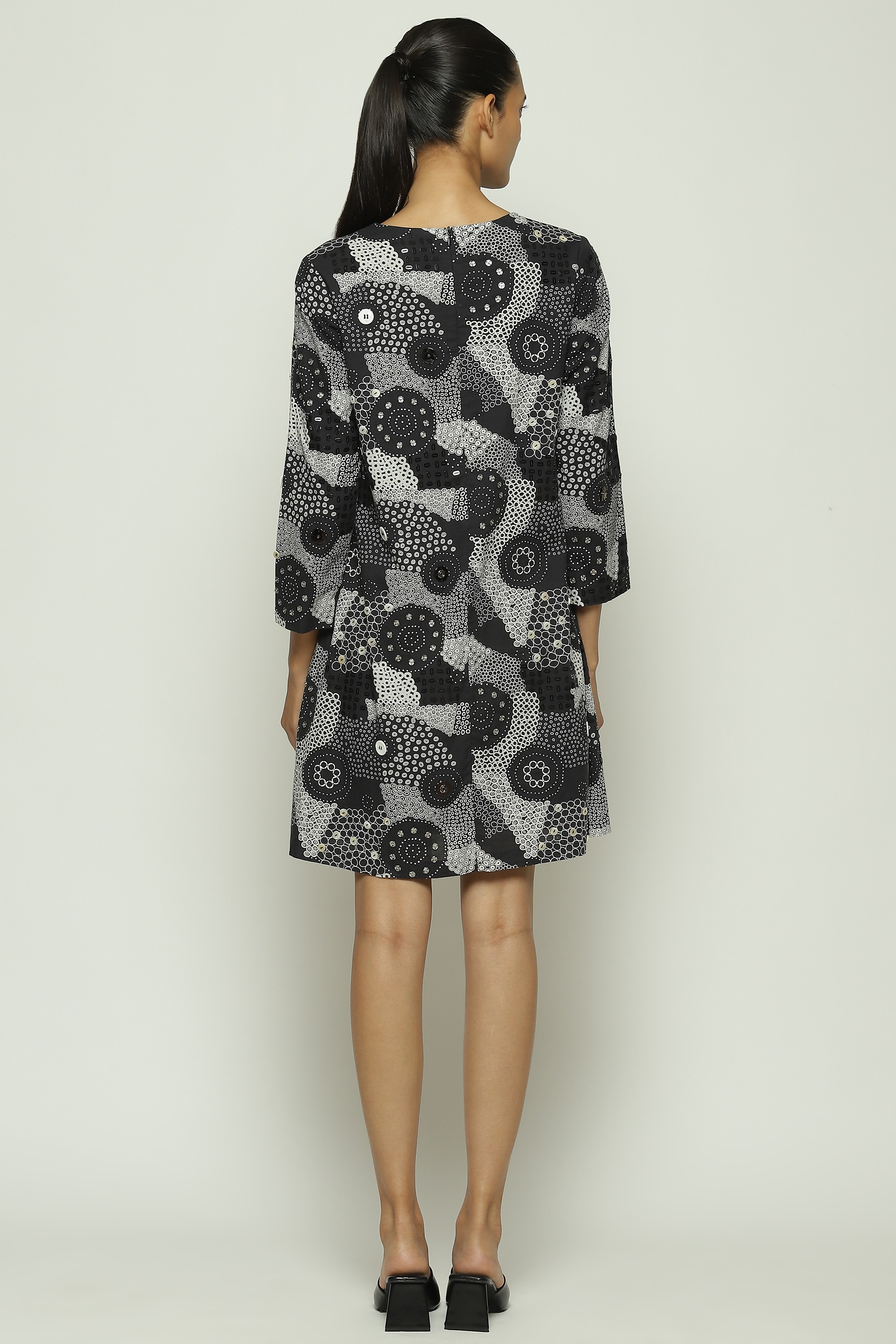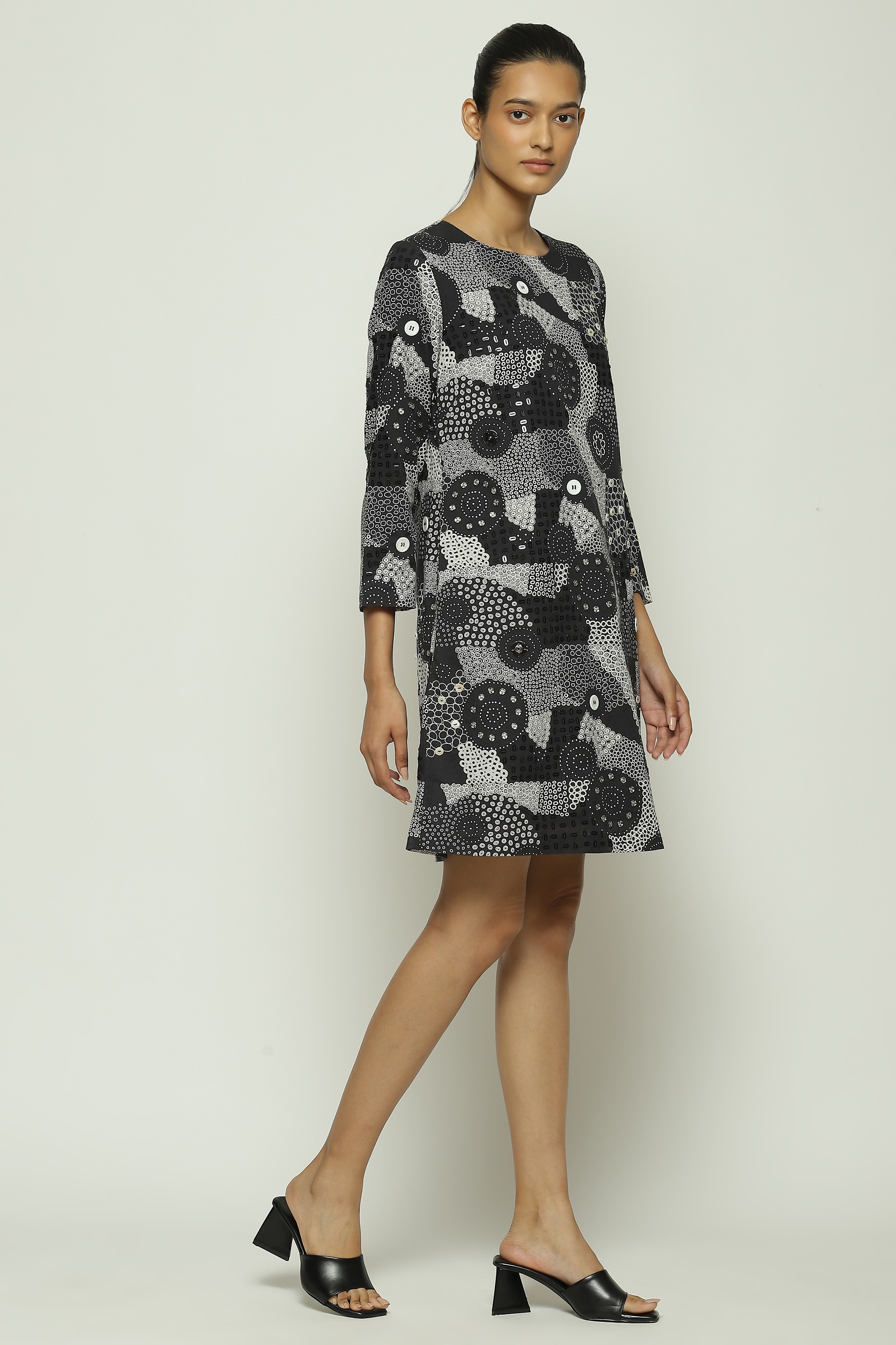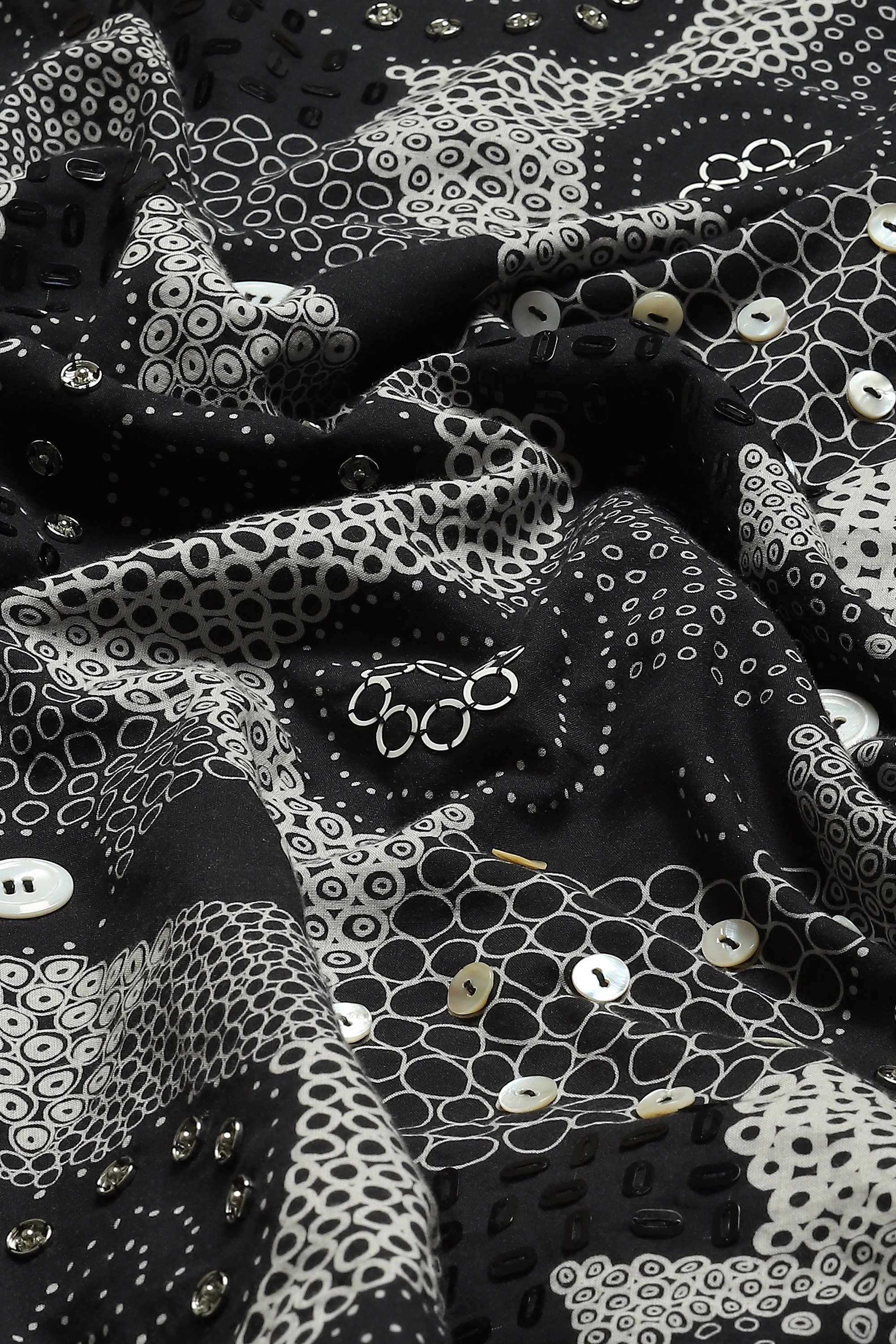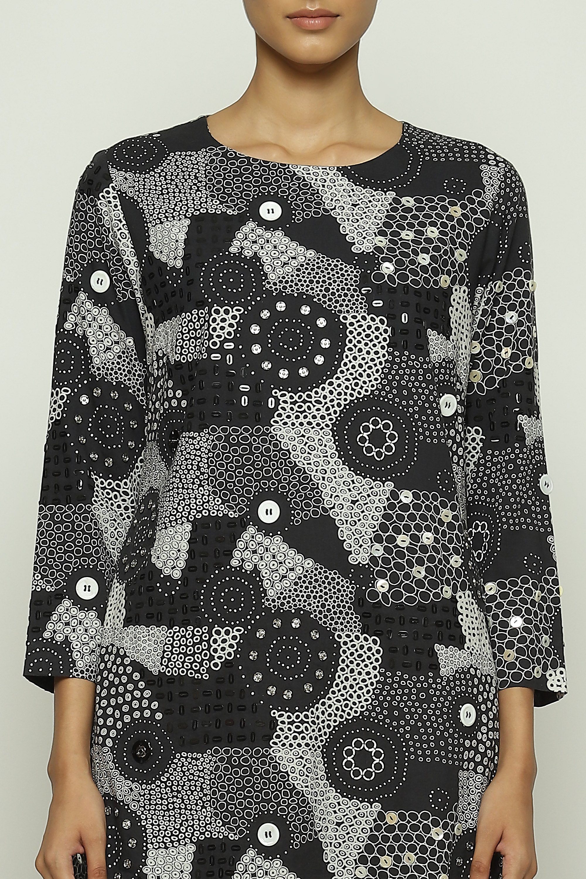 Part of Body Language — a collection that explores the nuances of human connection on fabric — this piece is crafted in compact cotton voile. Printed with an array of dots, this creation is hand adda embroidered with sequins and buttons.