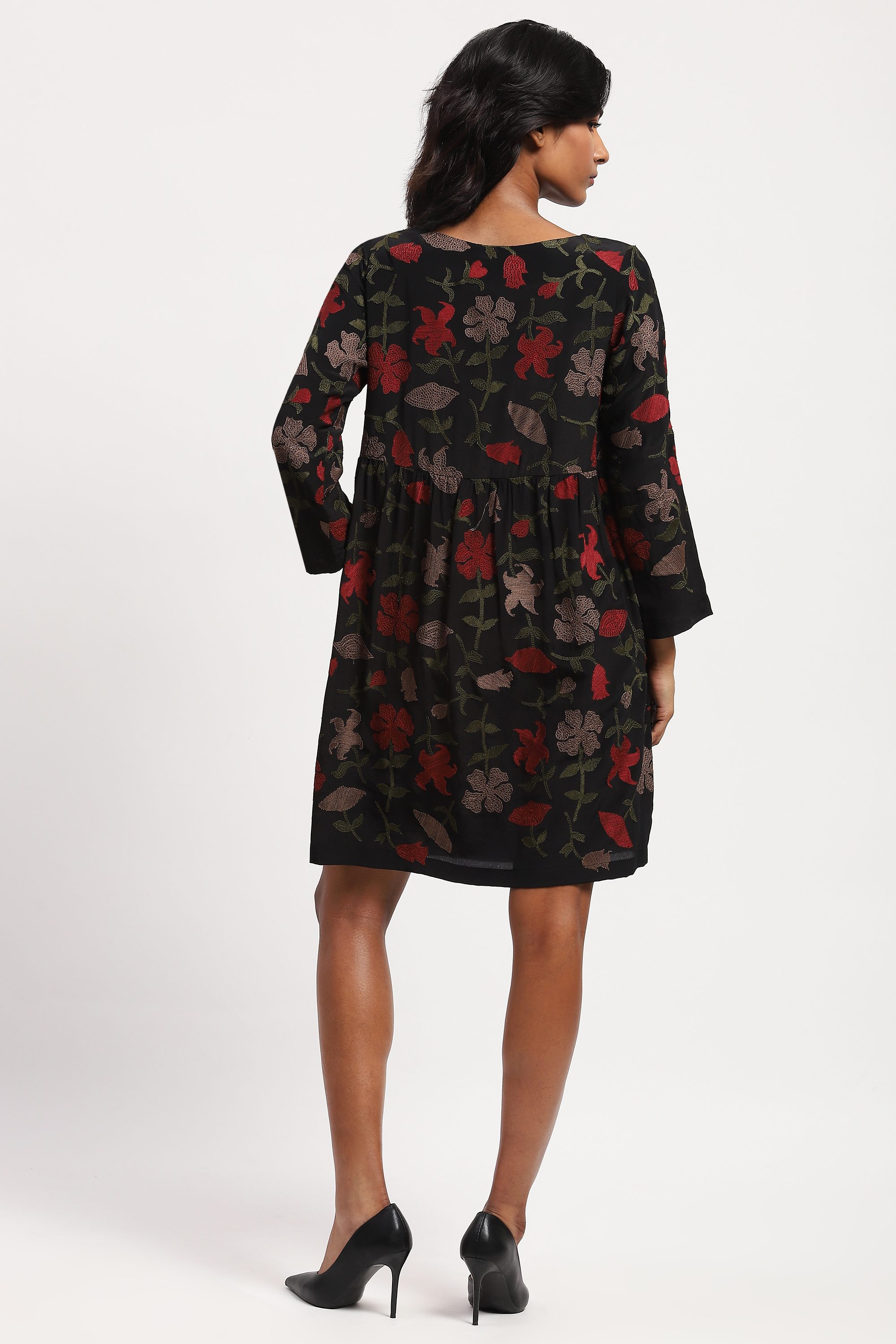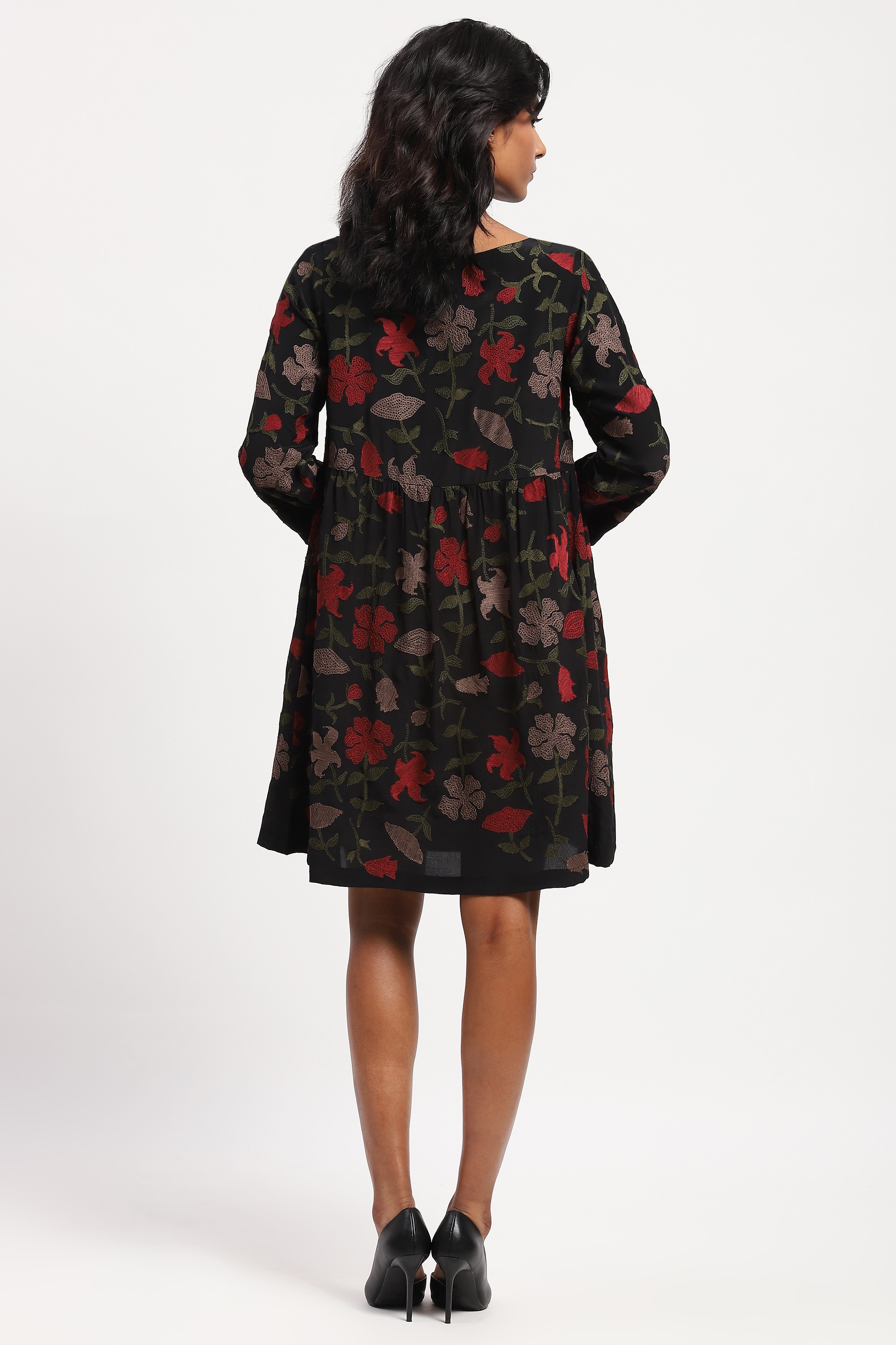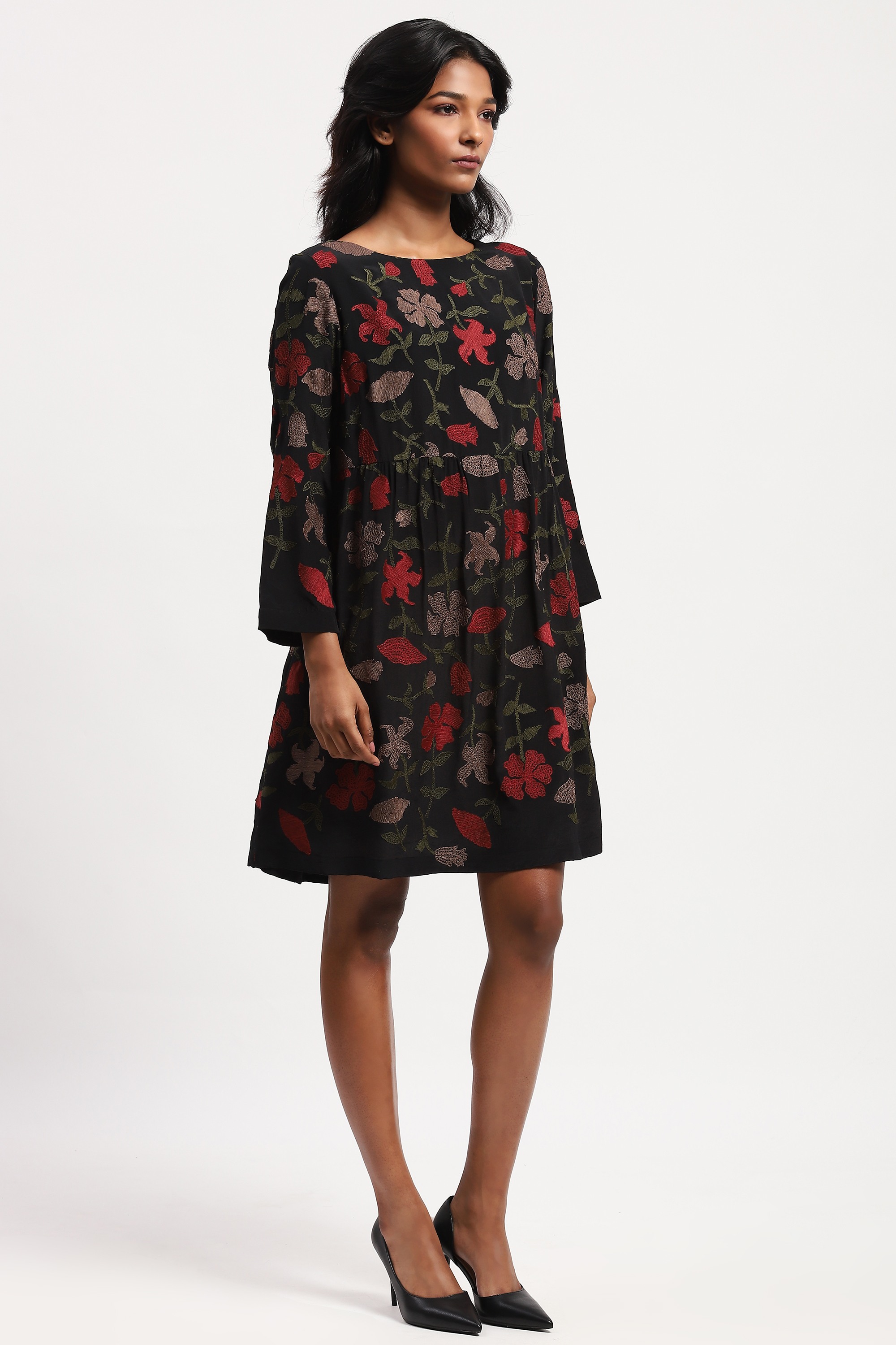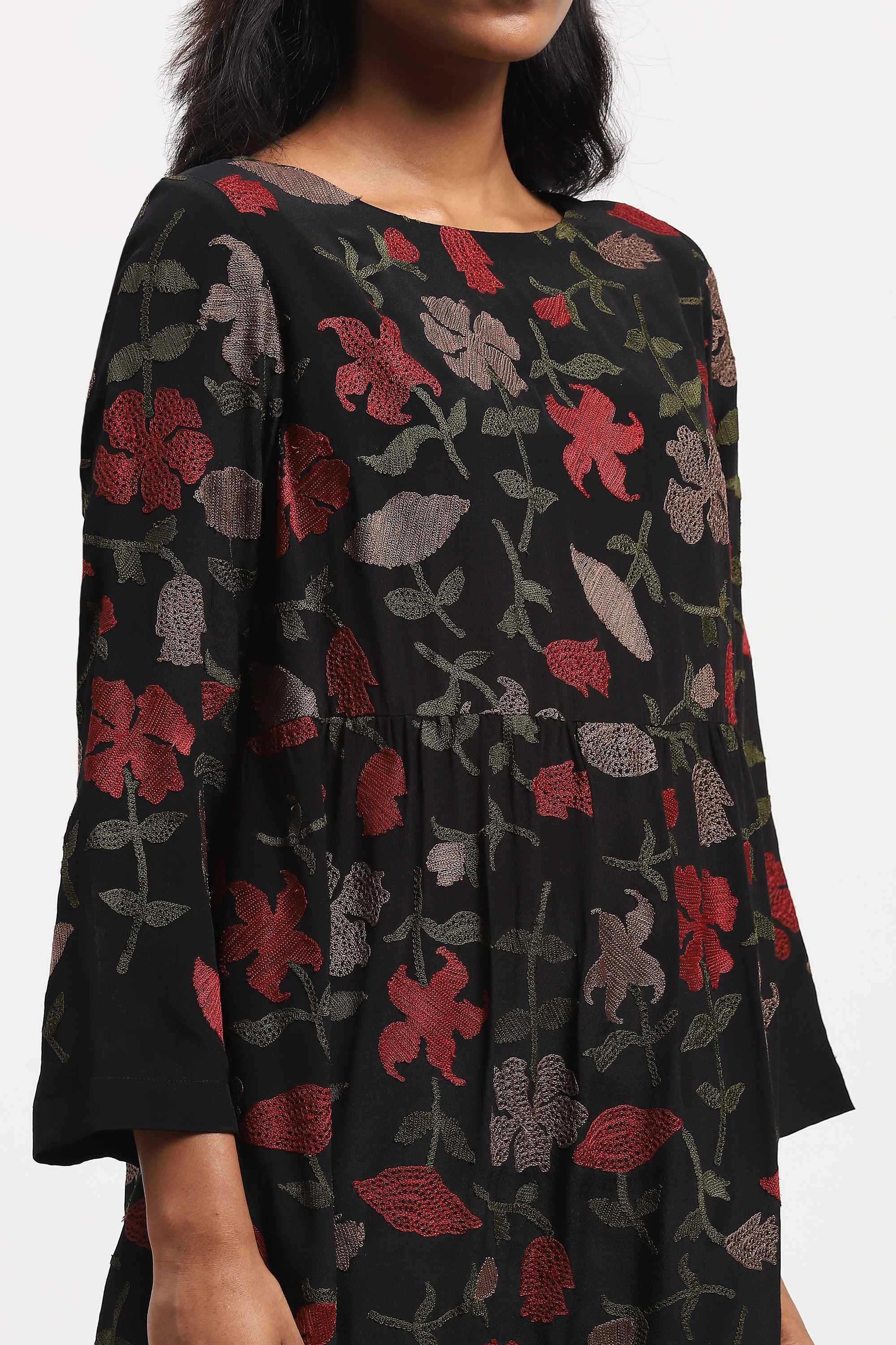 Best paired with whispers and murmurs, this black dress is crafted in georgette. Its floral motifs are crewel embroidered with silk yarn.