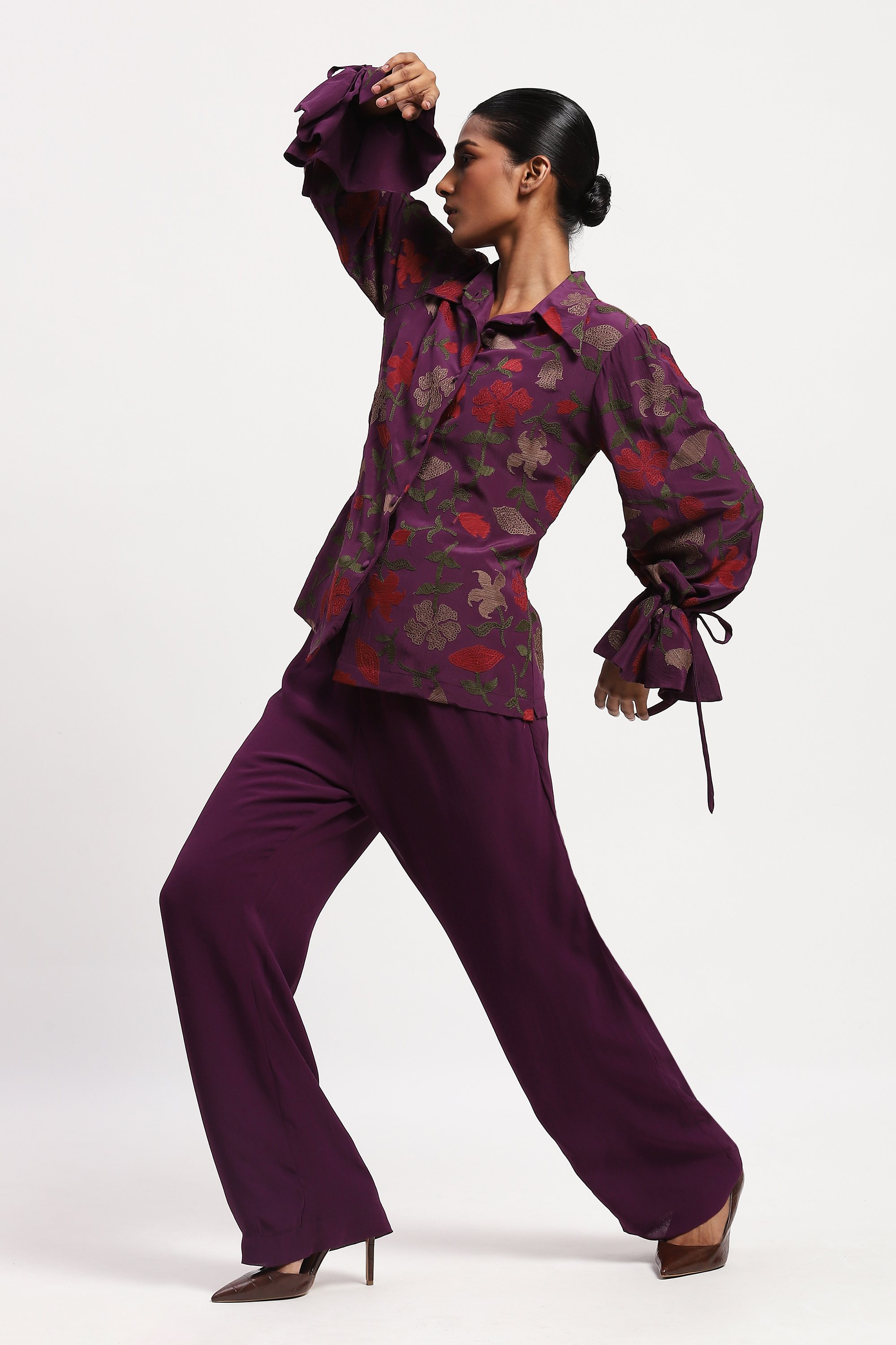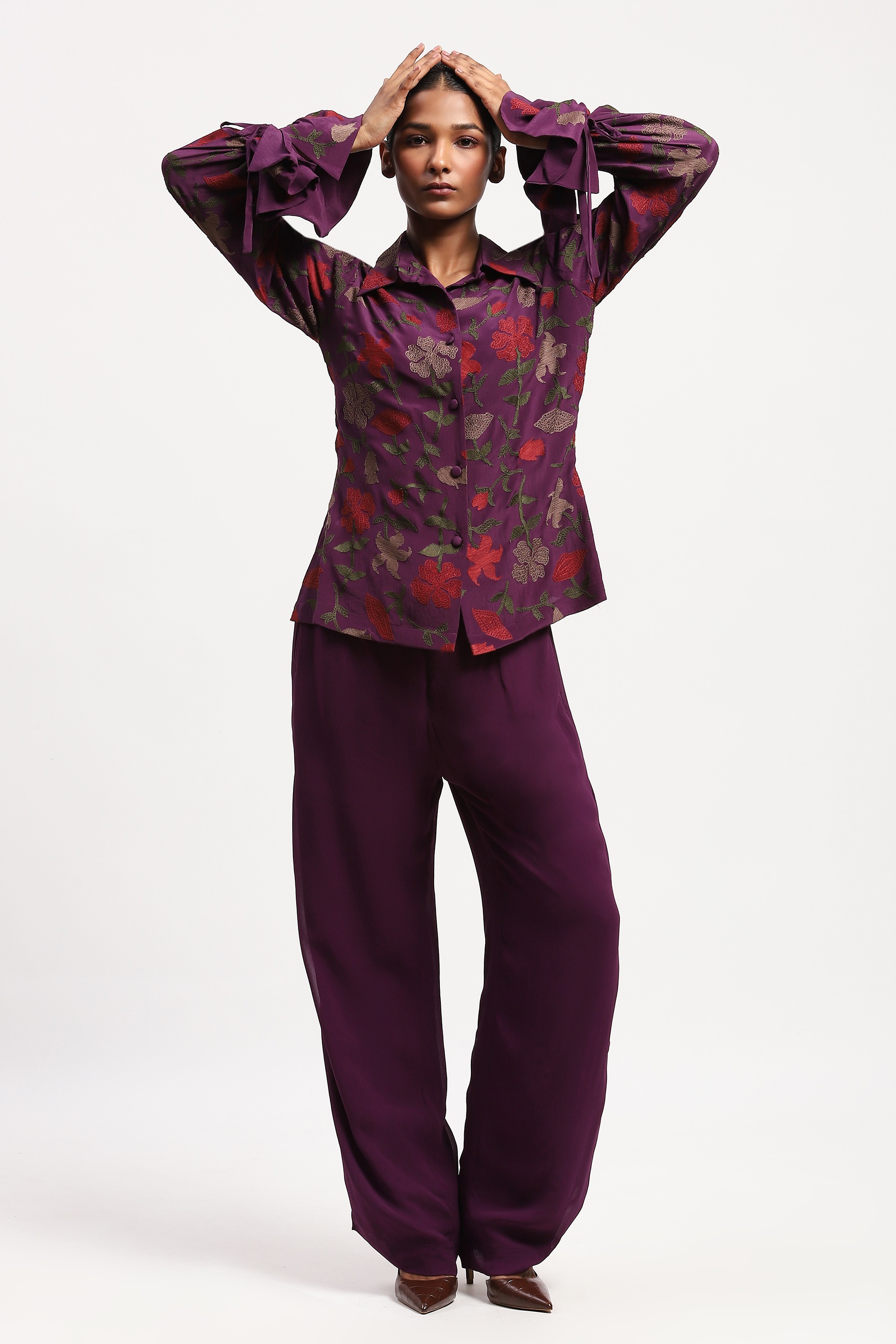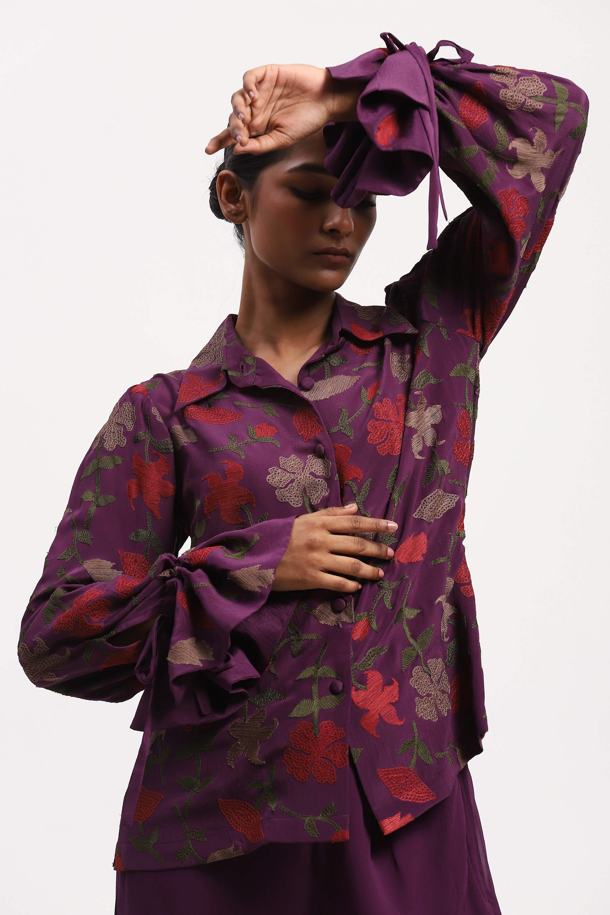 Best paired with whispers and murmurs, this aubergine shirt is crafted in georgette. Its floral motifs are crewel embroidered with silk yarn.