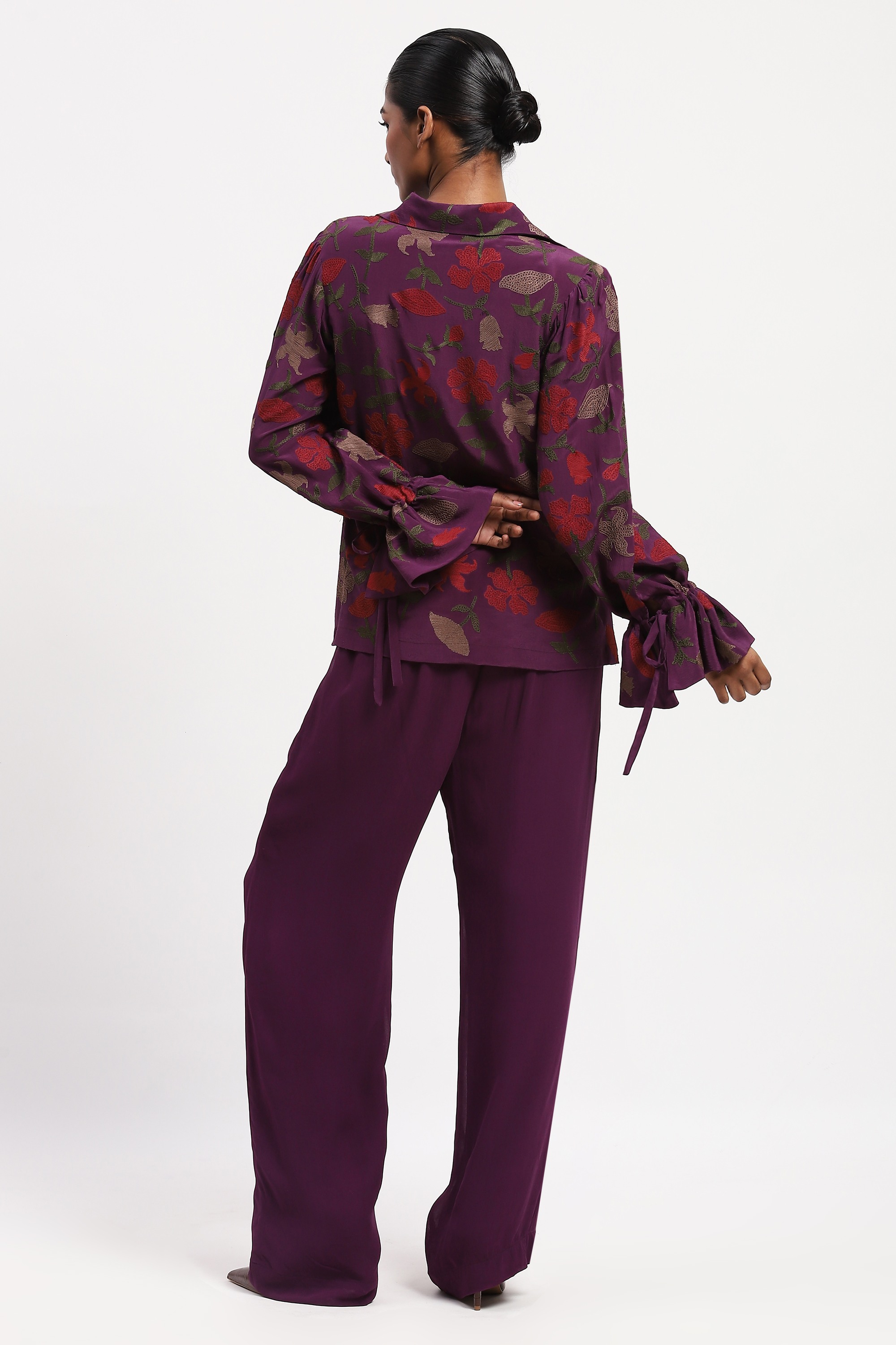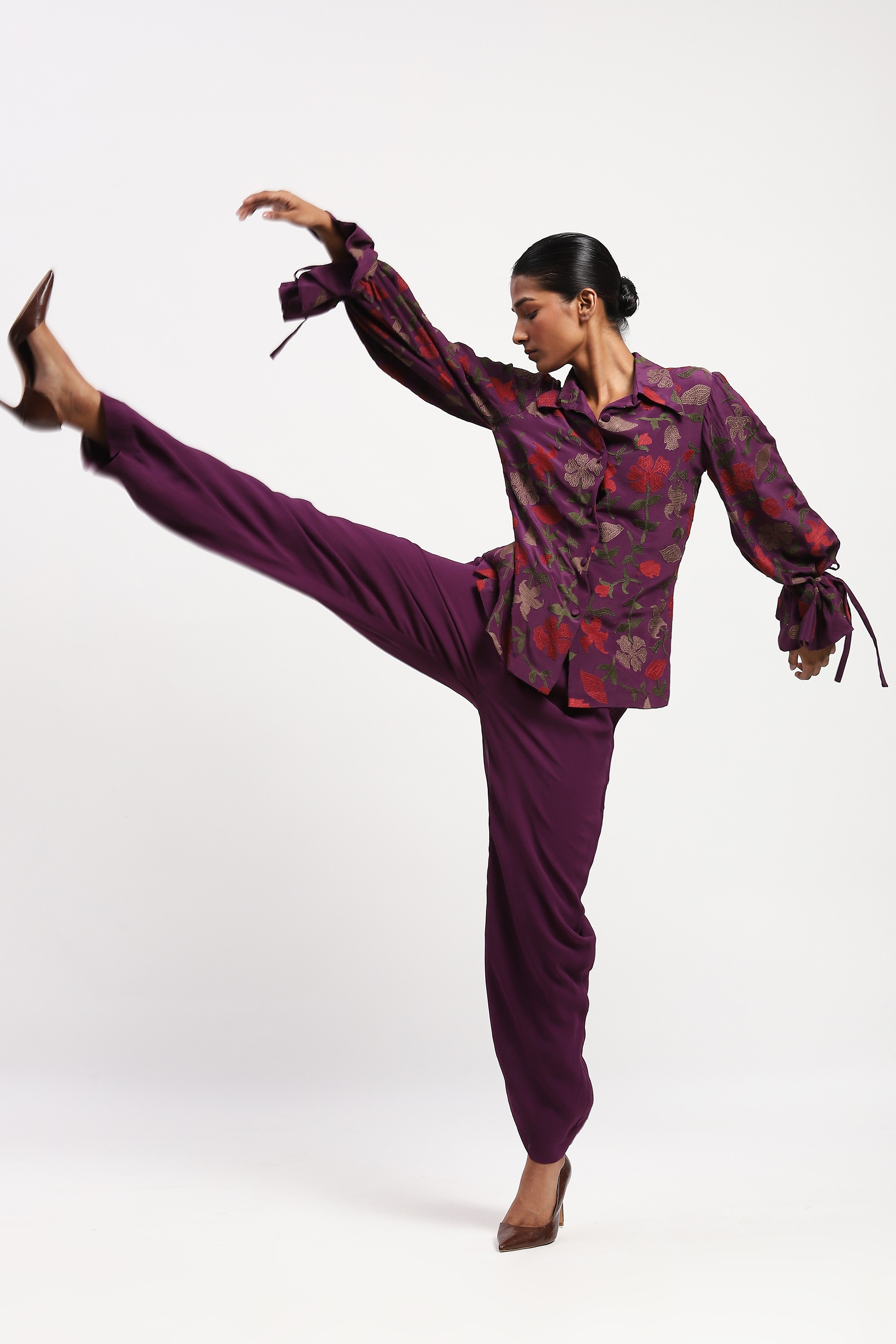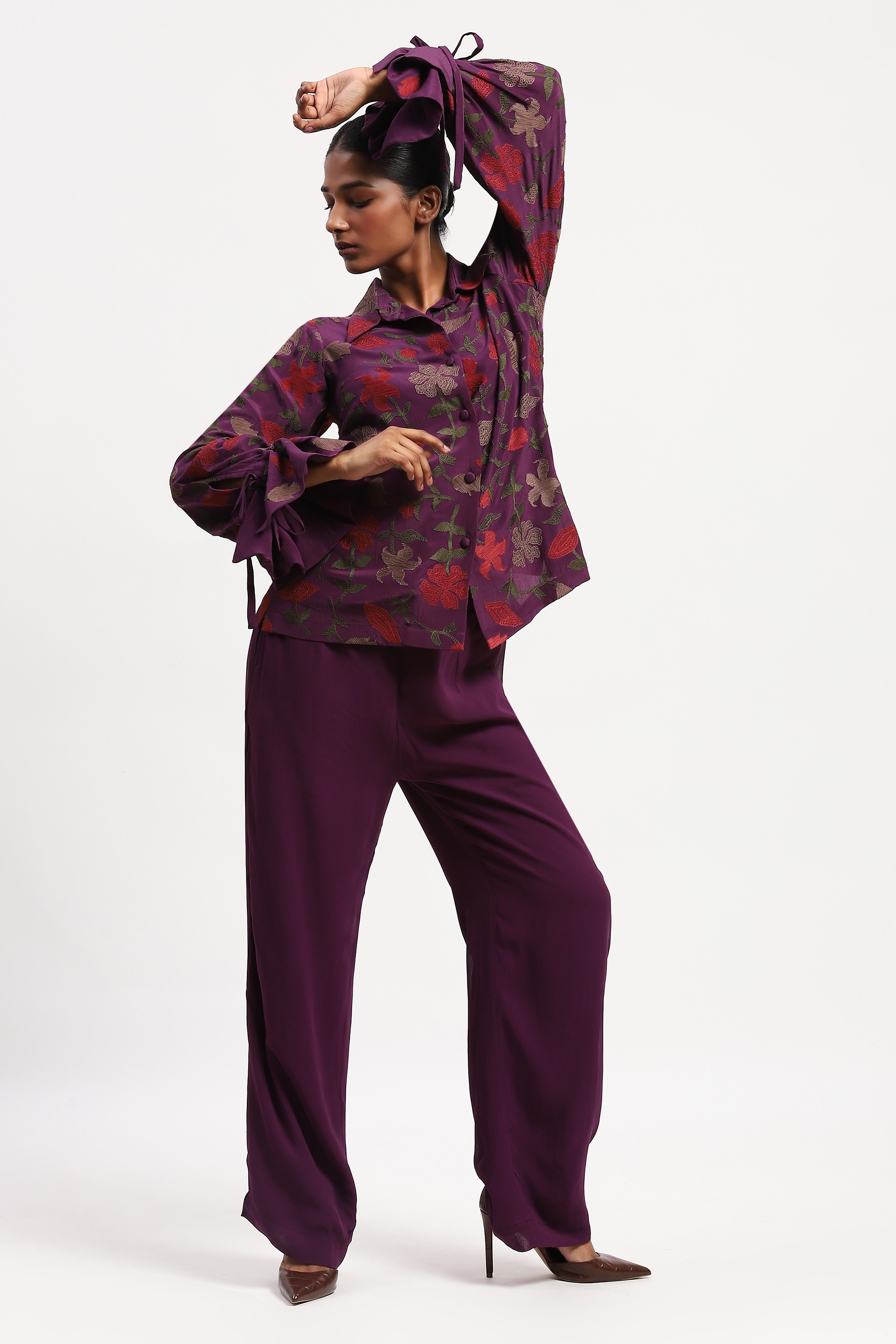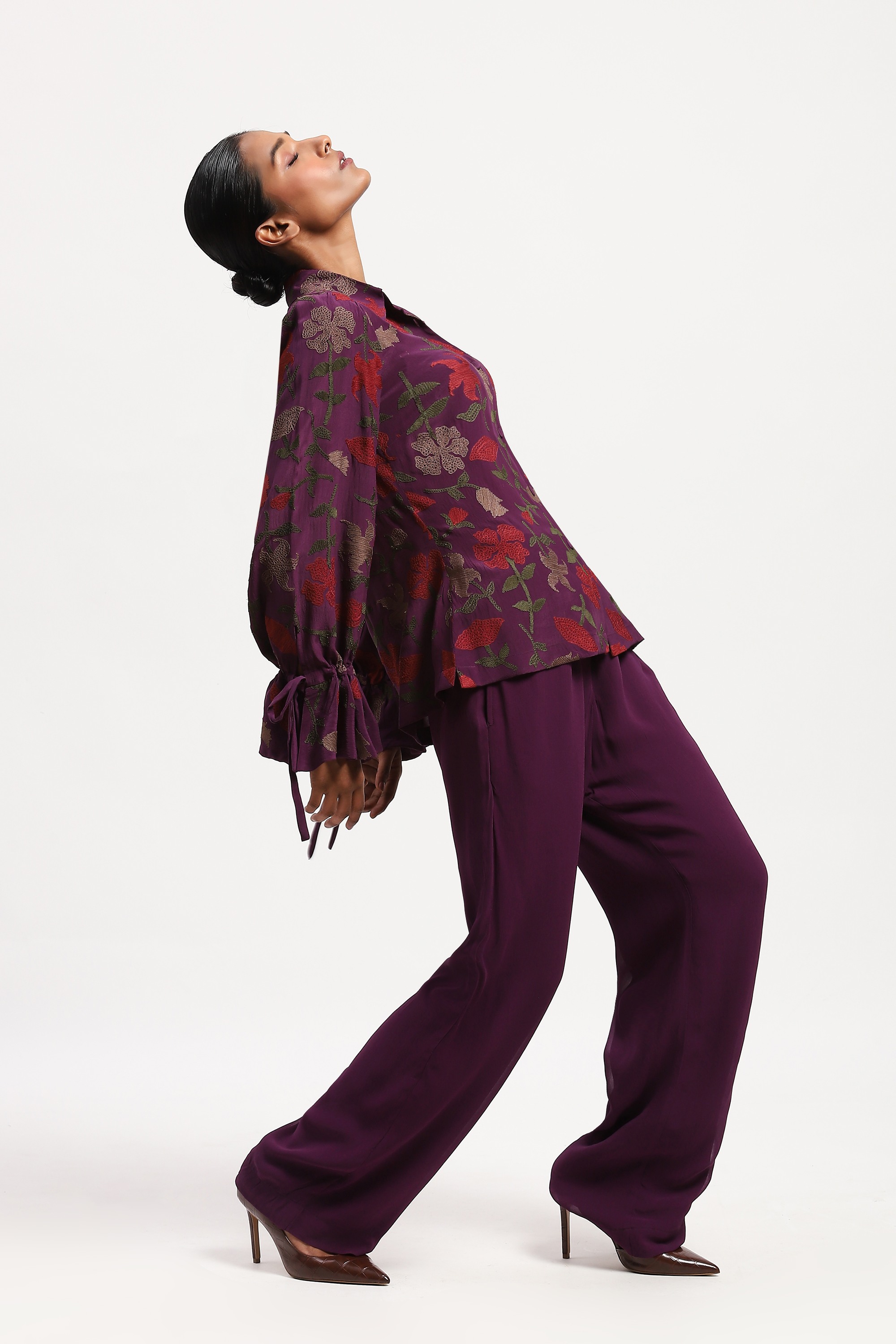 Best paired with whispers and murmurs, this aubergine shirt is crafted in georgette. Its floral motifs are crewel embroidered with silk yarn.