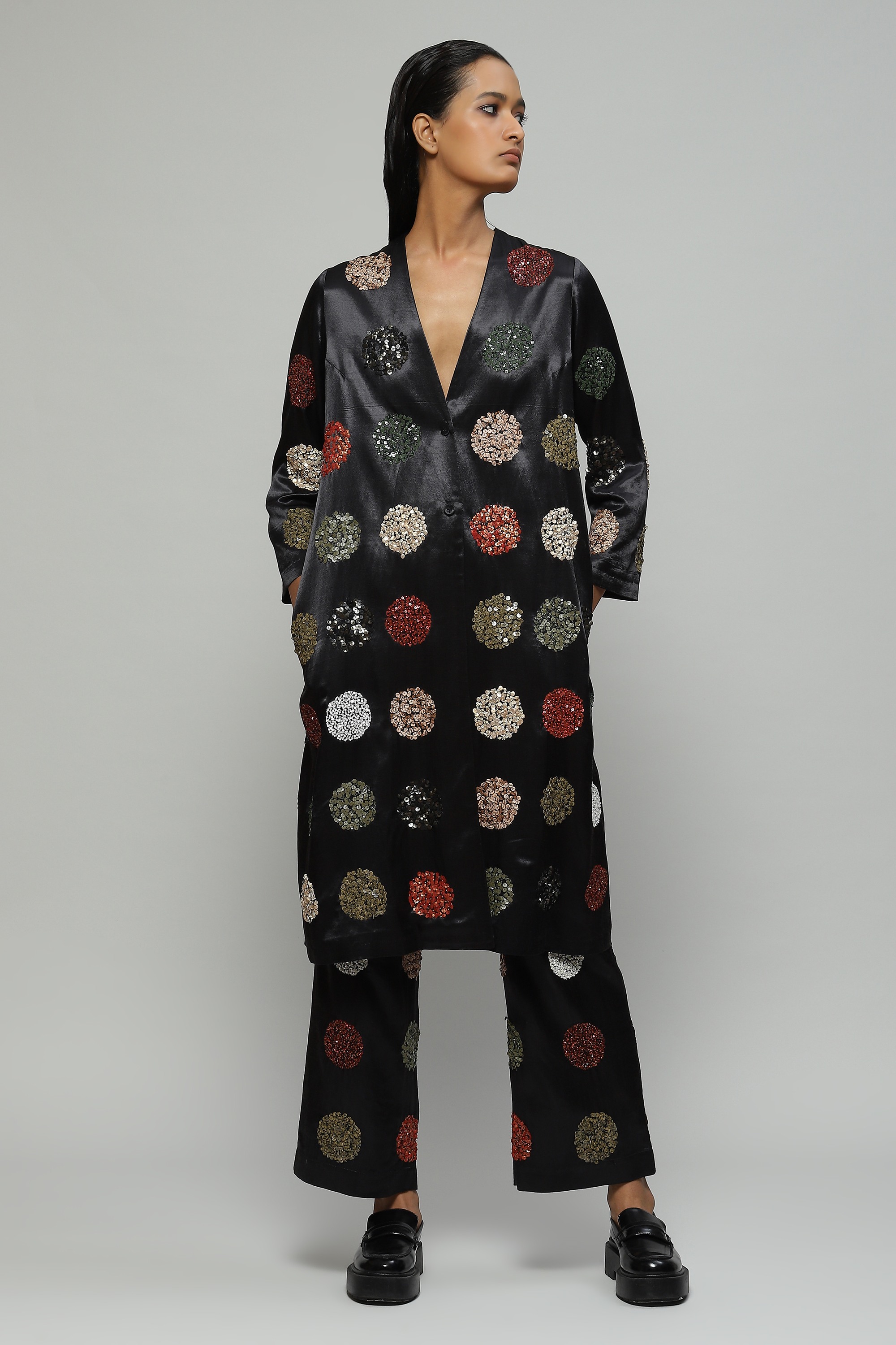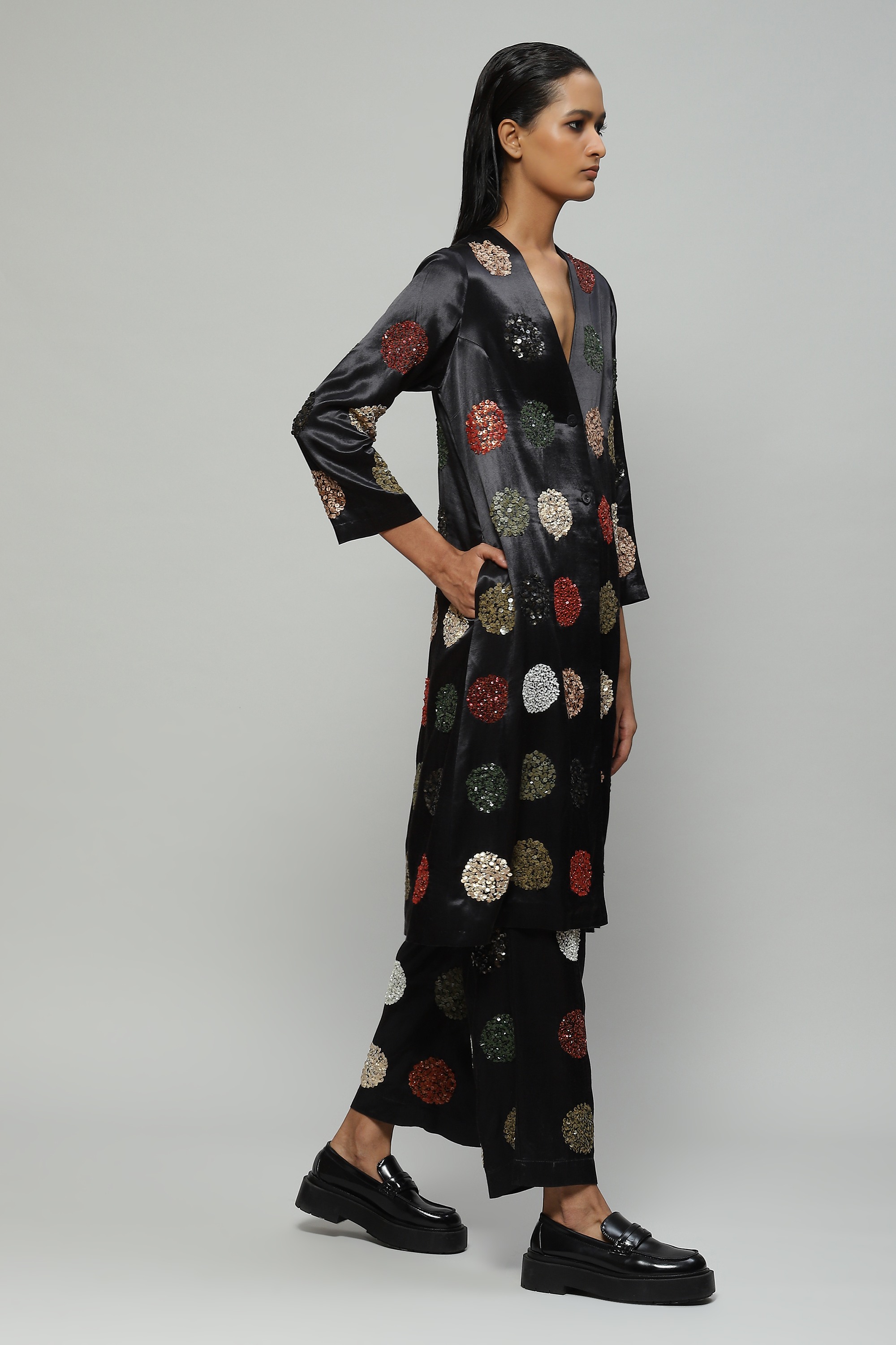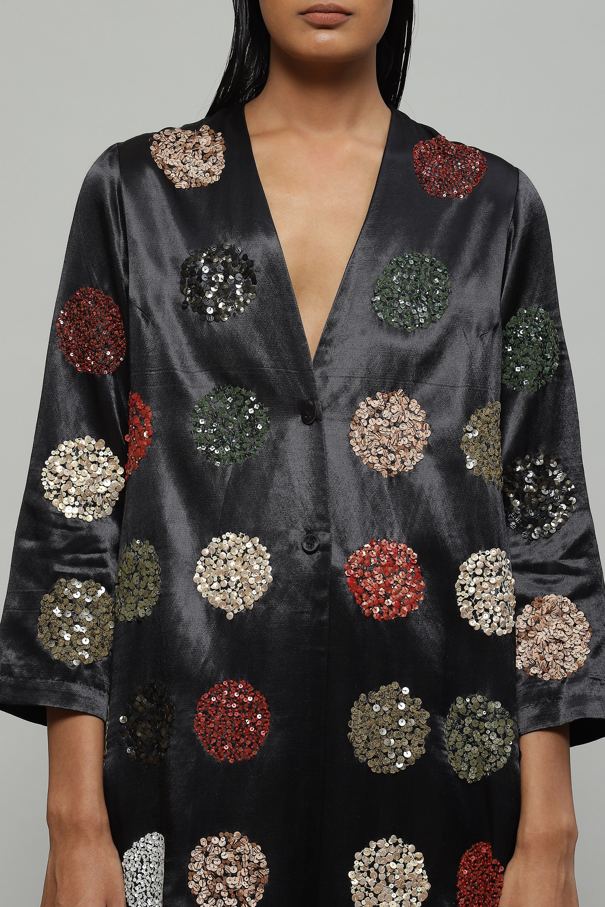 Created in Mashru silk and hand embellished with multi-coloured sequin dots, this understated black jacket features side pockets and can instantly dress up any monochromatic evening outfit