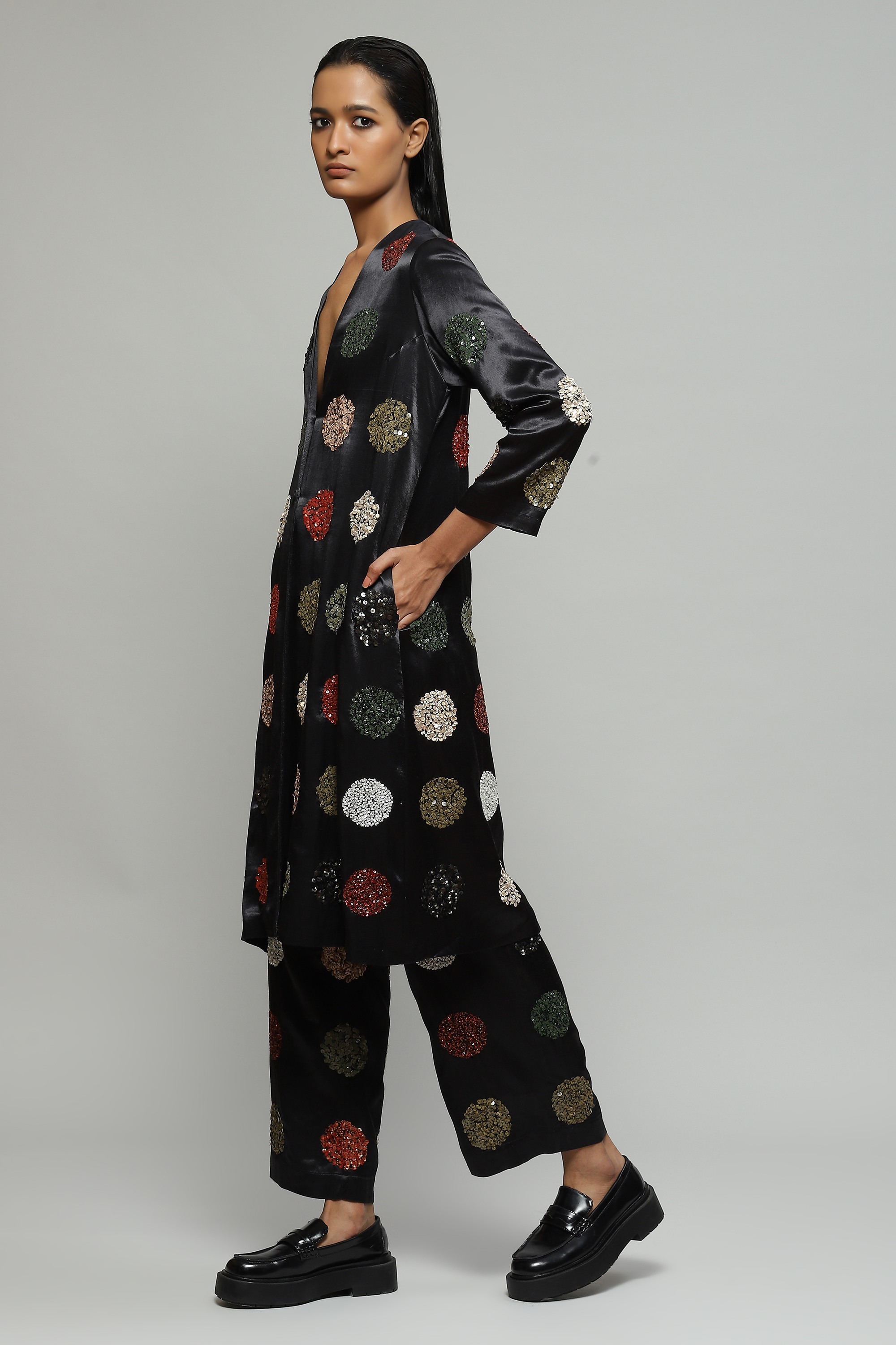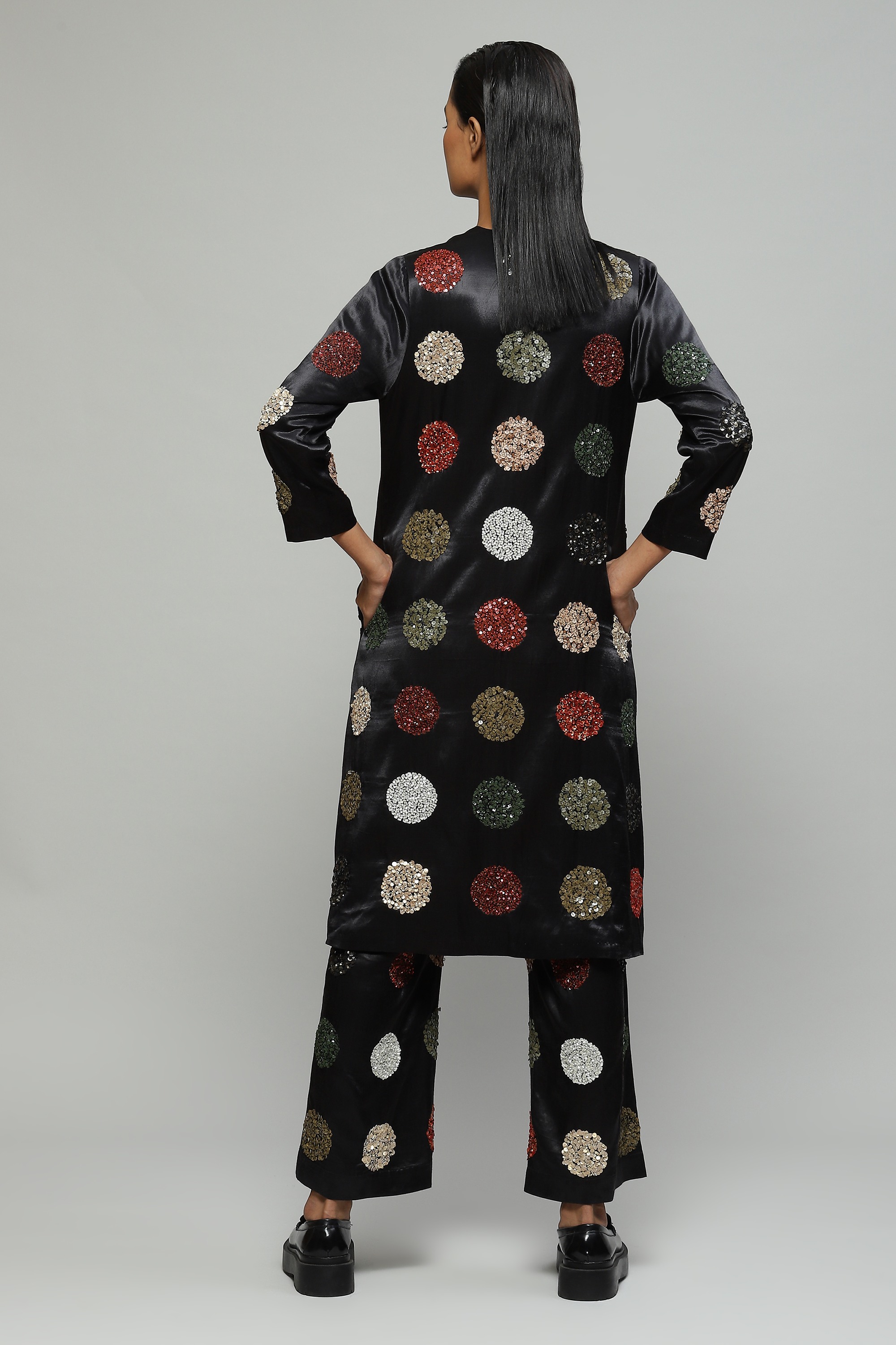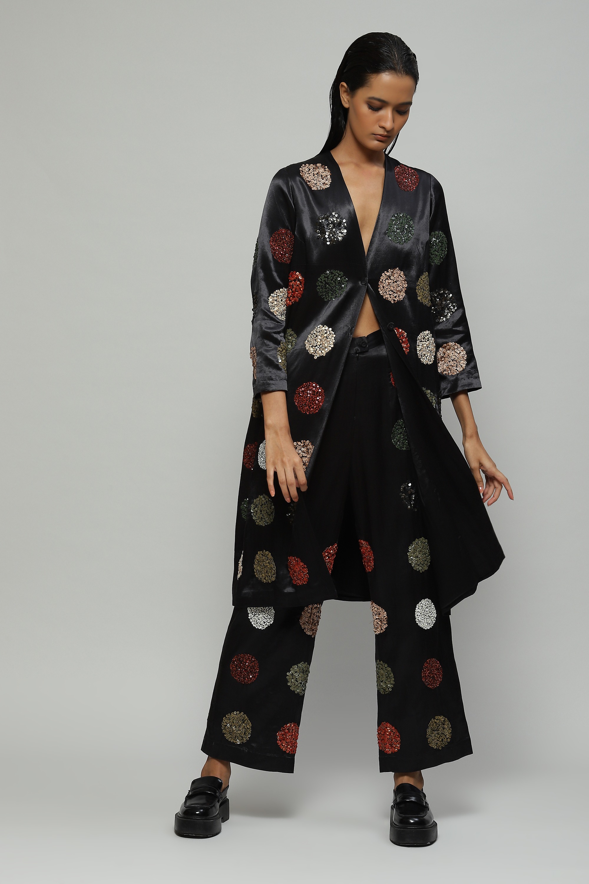 Created in Mashru silk and hand embellished with multi-coloured sequin dots, this understated black jacket features side pockets and can instantly dress up any monochromatic evening outfit