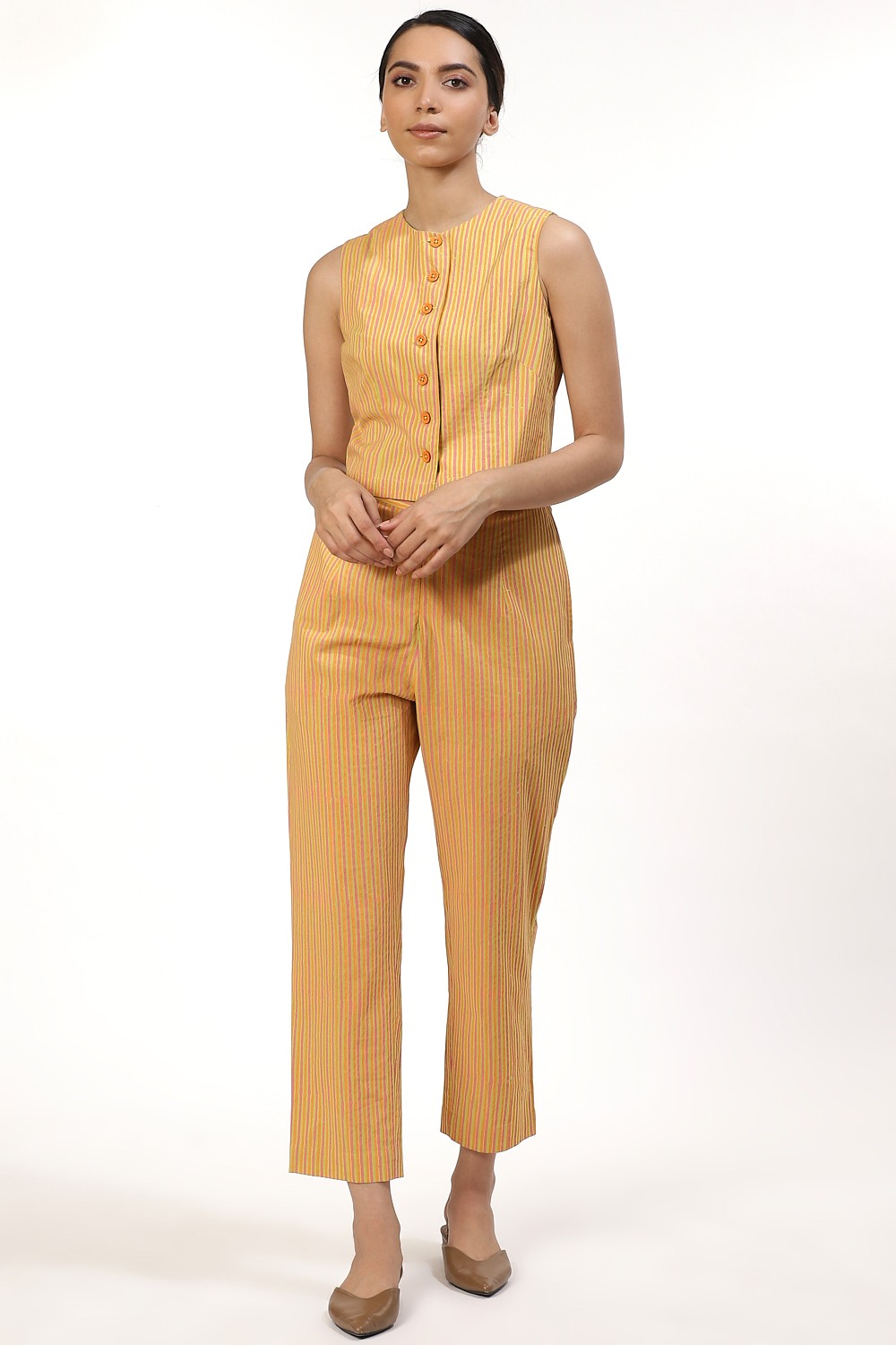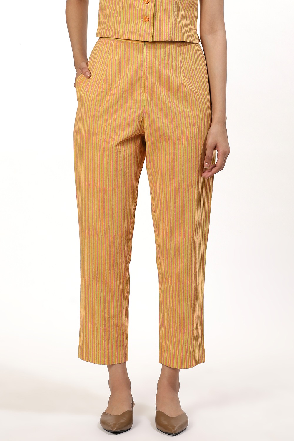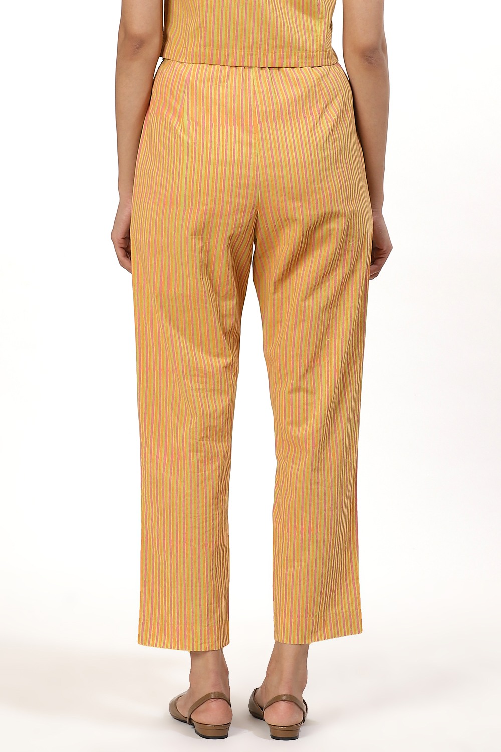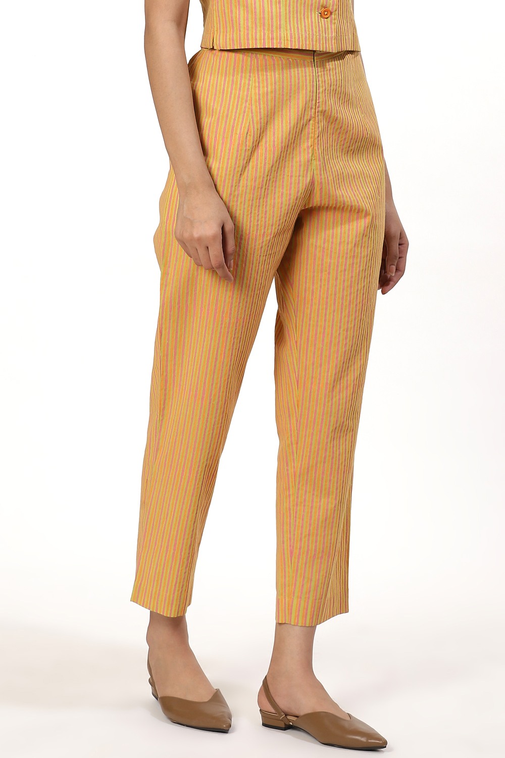 Multicoloured striped block printed cropped pants in lime orange and pink. Cut from cotton cambric in a slim and easy fit. Try yours with a coordinated sleeveless top and point toe flats when out shopping or an oversized plain white shirt to the movies.