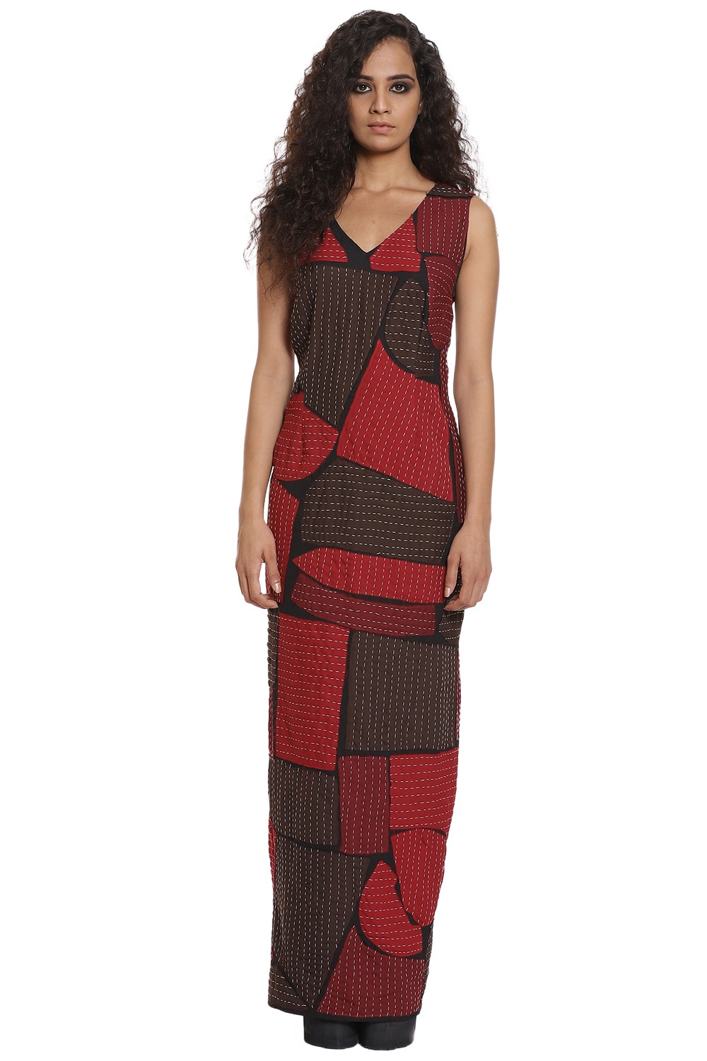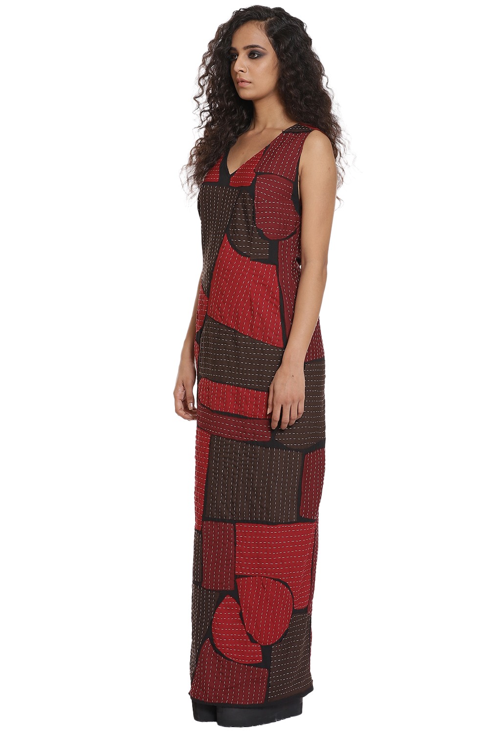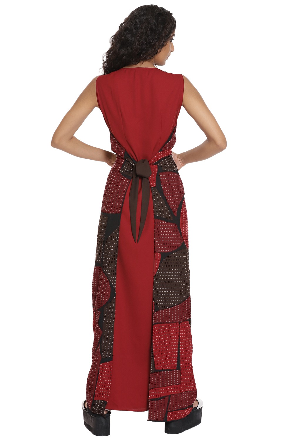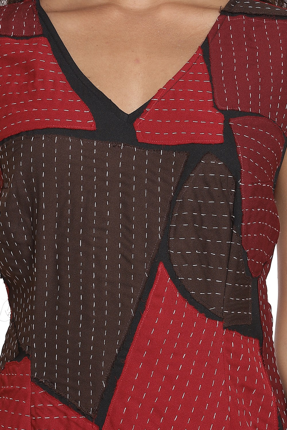 Abstract Patchwork kantha stitch and quilted wrap dress in black, burgundy, wine and coffee. Crafted from R-ELAN green gold in a crepe structure.