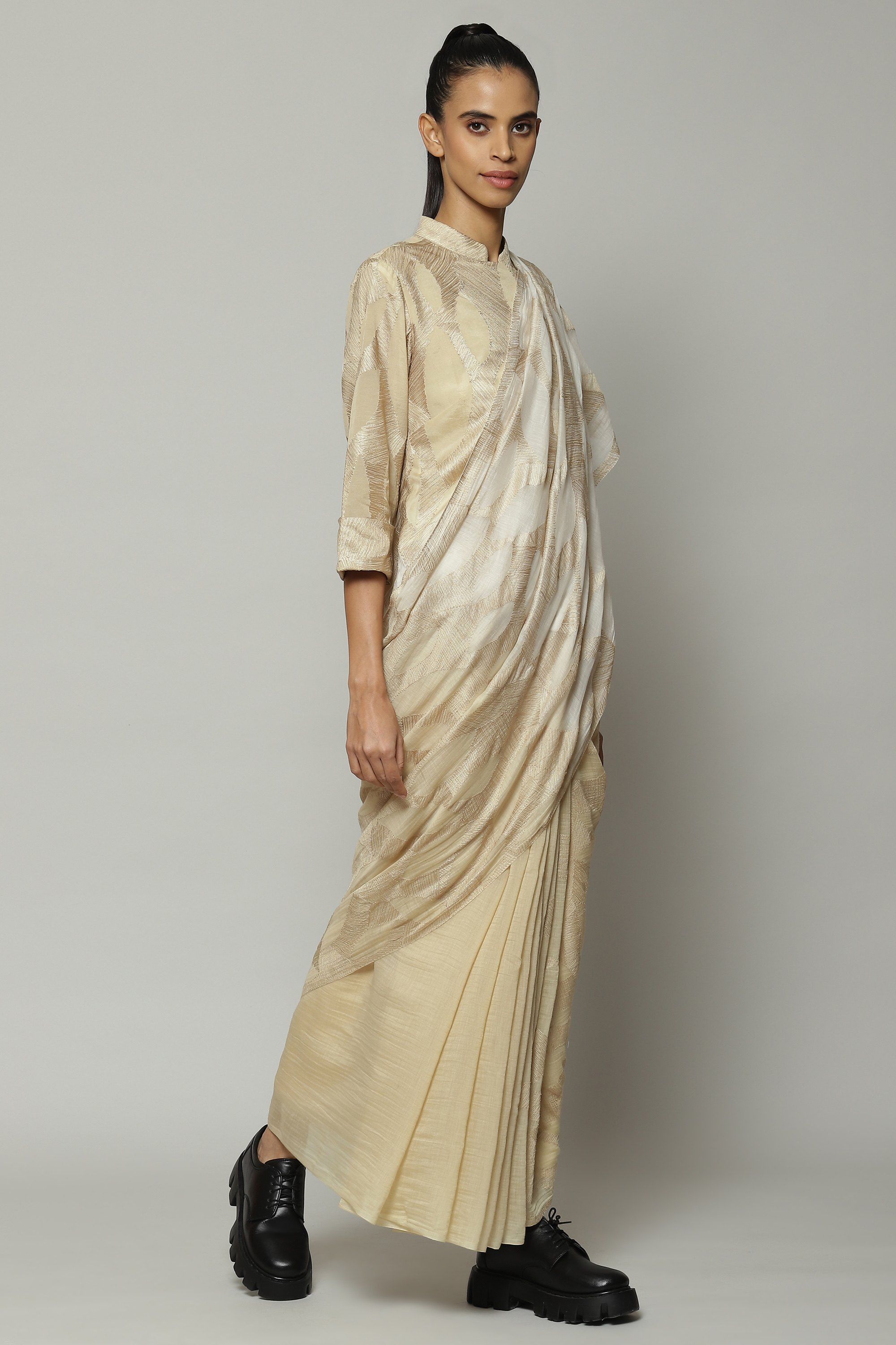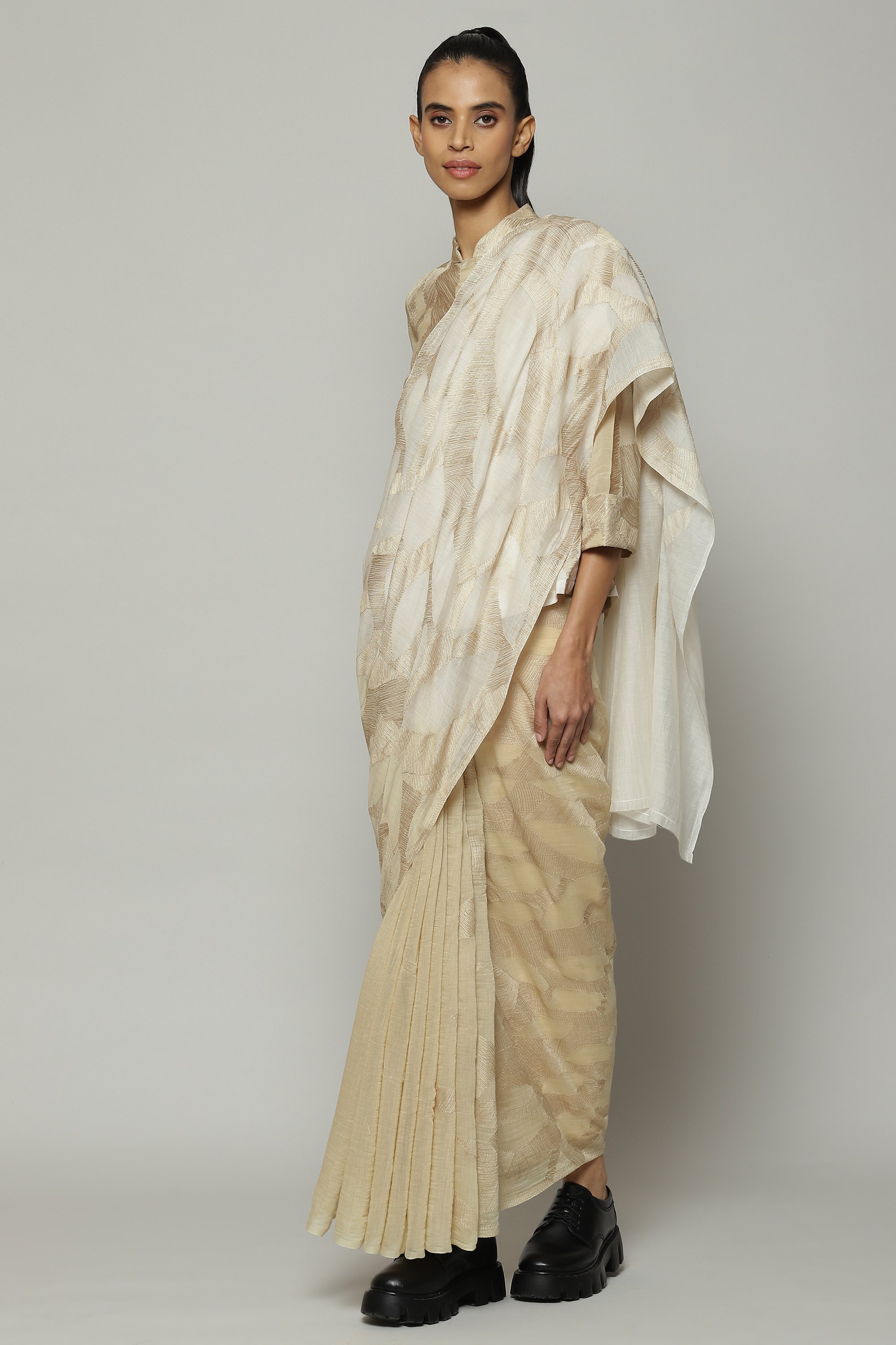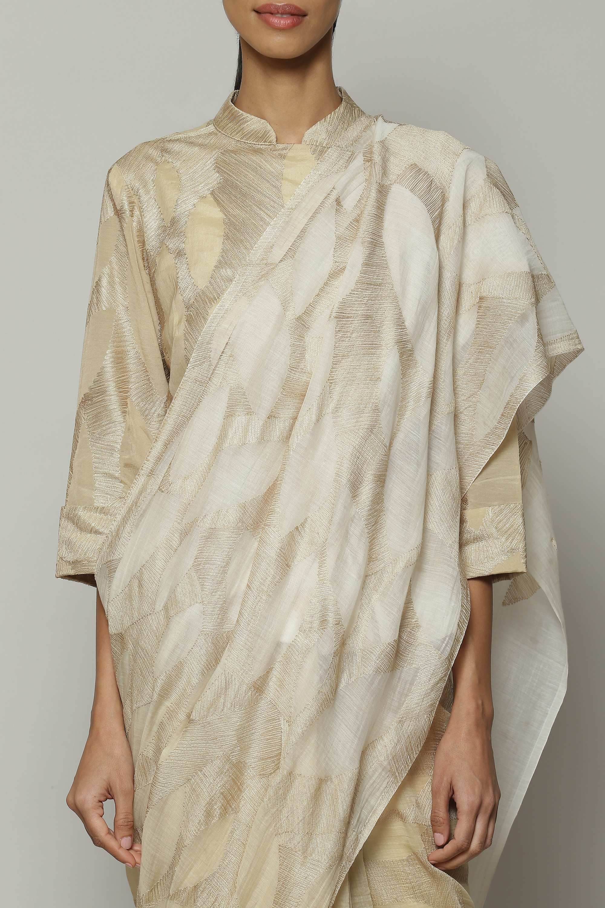 A refreshing summer saree in an ombre of ivory and parchment. The Chanderi fabric makes it light and breathable. Silken yarn is used to embroider its motifs. Ideal with a lunch that involves fresh mangoes.